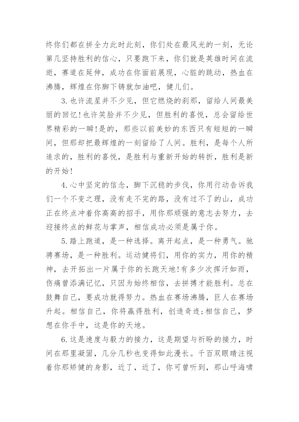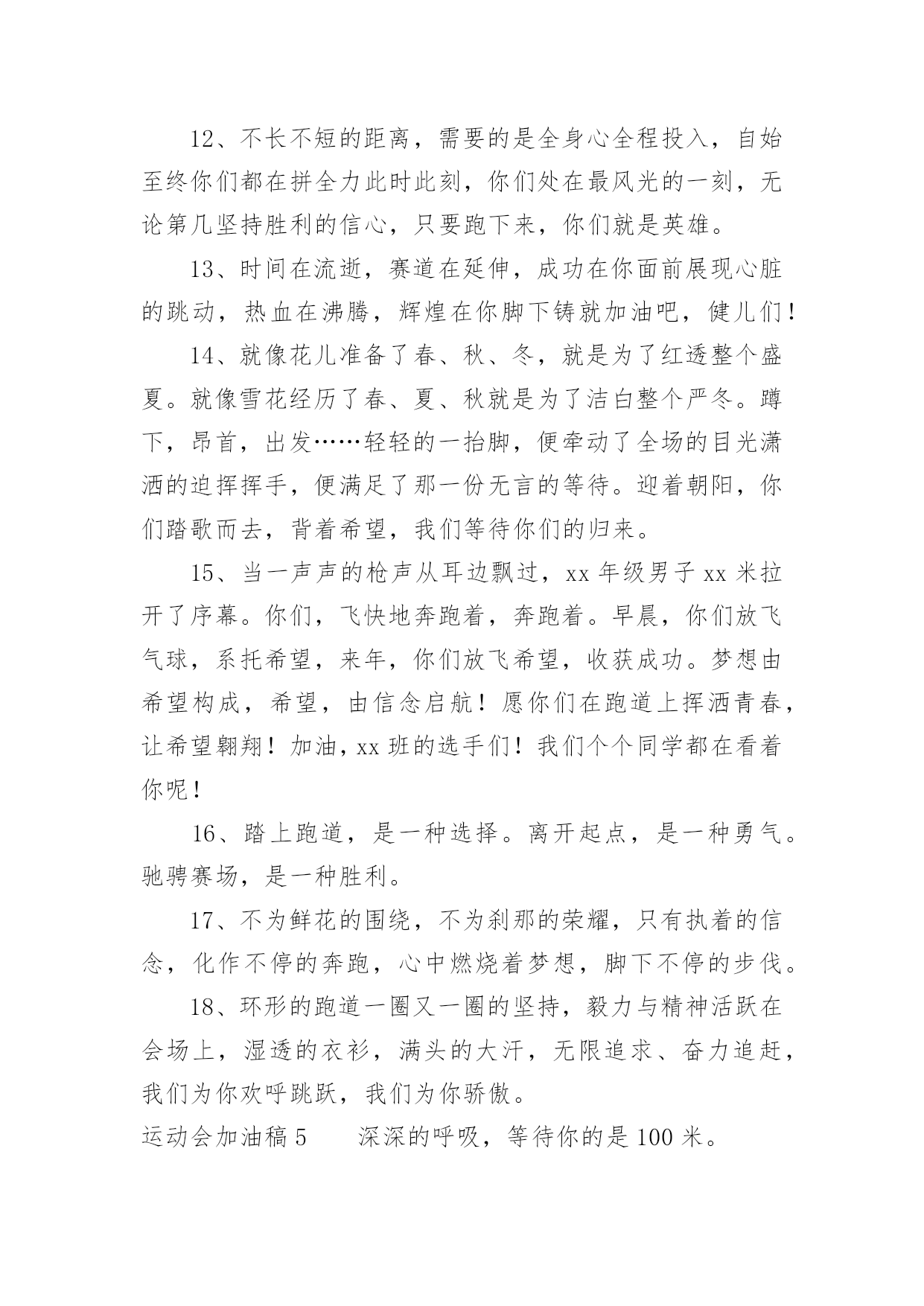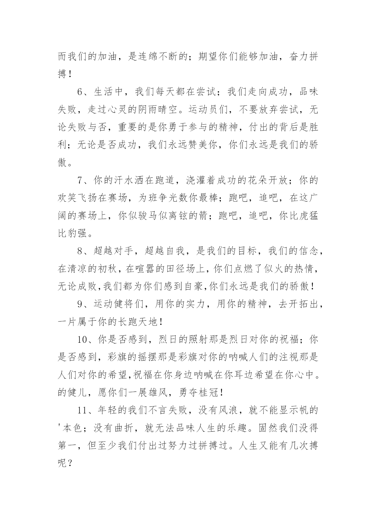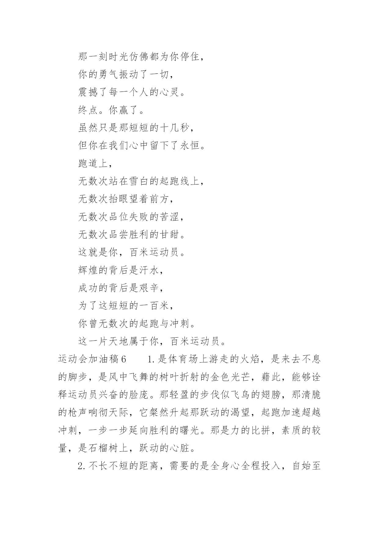 运动会加油稿(优)运动会加油稿15篇在社会发展不断提速的今天,我们都可能会用到加油稿,适当使用加油稿可以给对方打气加油。相信写加油稿是一个让许多人都头痛的问题,以下是小编为大家收集的运动会加油稿,仅供参考,大家一起来看看吧。运动会加油稿1在起跑线上胡华港连续支付歌曲,攻击和铆钉你健美肌肉蕴含爆发力自信的眼神充满自信枪走火了你开始了一段短暂的'旅程在笔直的跑道上有你稳定的脚印离终点不远冲刺时会给你留下一个锋利的背部开始掌声将为你响起开始胜利和鲜花终将属于你运动会加油稿2青春写下我们的召唤,青春编织我们的诺言。我们有无穷的活力,我们有无边的幻想我们时刻准备着去创造无限的可能。绿荫场上,我们勇往直前,因为我们坚信勇者无惧!终点线上,我们放声高呼,因为我们知道来之不易!领奖台上,我们心潮澎湃,因为我们懂得人定胜天!踏上跑道,是一种选择。离弄起点,是一种勇气。驰骋赛场,是一种胜利。朋友,用你的实力,用你的精神,去开拓出一片属于你的短跑天地。枪声伴你踏上征程,你昂着自信的头,带着必胜的信念,冲去,奔去。那一刻时光仿佛都为你停住,你的`勇气振动了一切,震撼了每一个人的心灵。终点,你赢了。虽然只是那短短的十几秒,但你在我们心中留下了永恒。百米跑道虽不长,运动健儿志高扬。摸拳擦掌跃欲试,分秒必争勇夺魁。今日赛场有勇女,巾帼岂将须眉让。古有木兰冲杀场,今有郎萍跑百米。立志创新校记录,勇夺赛跑第一名。运动会加油稿3汗水,泪水;笑声,歌声;我们尽情挥洒。开幕式上,运动场上,我们尽情展现,多少艰辛,多少困苦,我们勇敢承担。因为年轻,因为张扬,因为我们知道:用今天的汗水换来明天的微笑。运动会加油稿41、这是意志的拼搏,这是速度的挑战,胜利在向你们招手,胜利在向你们呼唤!2、不为掌声的注释不为刻意的征服不为失败的痛苦只有辛勤的汗水化作成功的脚步。3、有多少次挥汗如雨,伤痛曾添满记忆,只因为始终相信,去拼搏才能胜利。总在鼓舞自己,要成功就得努力。热血在赛场沸腾,巨人在赛场升起。相信自己,你将赢得胜利,创造奇迹;相信自己,梦想在你手中,这是你的天地。当一切过去,你们将是第一。相信自己,你们将超越极限,超越自己!相信自己,加油吧,健儿们,相信你自己。4、把长长的跑道跑成一段漫漫的征途,听!呼啸的风在为你喝彩,看!猎猎的彩旗在为你加油,加油吧!为了到达终点时那一刻的辉煌!5、光,是温暖的;月,是温馨的;星,是浪漫的;风,是清爽的;鱼,是滋润的;雪,是完美的;冰,是晶莹的;而我们的加油,是连绵不断的;期望你们能够加油,奋力拼搏!6、生活中,我们每天都在尝试;我们走向成功,品味失败,走过心灵的阴雨晴空。运动员们,不要放弃尝试,无论失败与否,重要的是你勇于参与的精神,付出的背后是胜利;无论是否成功,我们永远赞美你,你们永远是我们的骄傲。7、你的汗水洒在跑道,浇灌着成功的花朵开放;你的欢笑飞扬在赛场,为班争光数你最棒;跑吧,追吧,在这广阔的赛场上,你似骏马似离铉的箭;跑吧,追吧,你比虎猛比豹强。8、超越对手,超越自我,是我们的目标,我们的信念,在清凉的初秋,在喧嚣的田径场上,你们点燃了似火的热情,无论成败,我们都为你们感到自豪,你们永远是我们的骄傲!9、运动健将们,用你的实力,用你的精神,去开拓出,一片属于你的长跑天地!10、你是否感到,烈日的照射那是烈日对你的祝福;你是否感到,彩旗的摇摆那是彩旗对你的呐喊人们的注视那是人们对你的希望,祝福在你身边呐喊在你耳边希望在你心中。的健儿,愿你们一展雄风,勇夺桂冠!11、年轻的我们不言失败,没有风浪,就不能显示帆的'本色;没有曲折,就无法品味人生的乐趣。固然我们没得第一,但至少我们付出过努力过拼搏过。人生又能有几次搏呢?12、不长不短的距离,需要的是全身心全程投入,自始至终你们都在拼全力此时此刻,你们处在最风光的一刻,无论第几坚持胜利的信心,只要跑下来,你们就是英雄。13、时间在流逝,赛道在延伸,成功在你面前展现心脏的跳动,热血在沸腾,辉煌在你脚下铸就加油吧,健儿们!14、就像花儿准备了春、秋、冬,就是为了红透整个盛夏。就像雪花经历了春、夏、秋就是为了洁白整个严冬。蹲下,昂首,出发……轻轻的一抬脚,便牵动了全场的目光潇洒的迫挥挥手,便满足了那一份无言的等待。迎着朝阳,你们踏歌而去,背着希望,我们等待你们的归来。15、当一声声的枪声从耳边飘过,xx年级男子xx米拉开了序幕。你们,飞快地奔跑着,奔跑着。早晨,你们放飞气球,系托希望,来年,你们放飞希望,收获成功。梦想由希望构成,希望,由信念启航!愿你们在跑道上挥洒青春,让希望翱翔!加油,xx班的选手们!我们个个同学都在看着你呢!16、踏上跑道,是一种选择。离开起点,是一种勇气。驰骋赛场,是一种胜利。17、不为鲜花的围绕,不为刹那的荣耀,只有执着的信念,化作不停的奔跑,心中燃烧着梦想