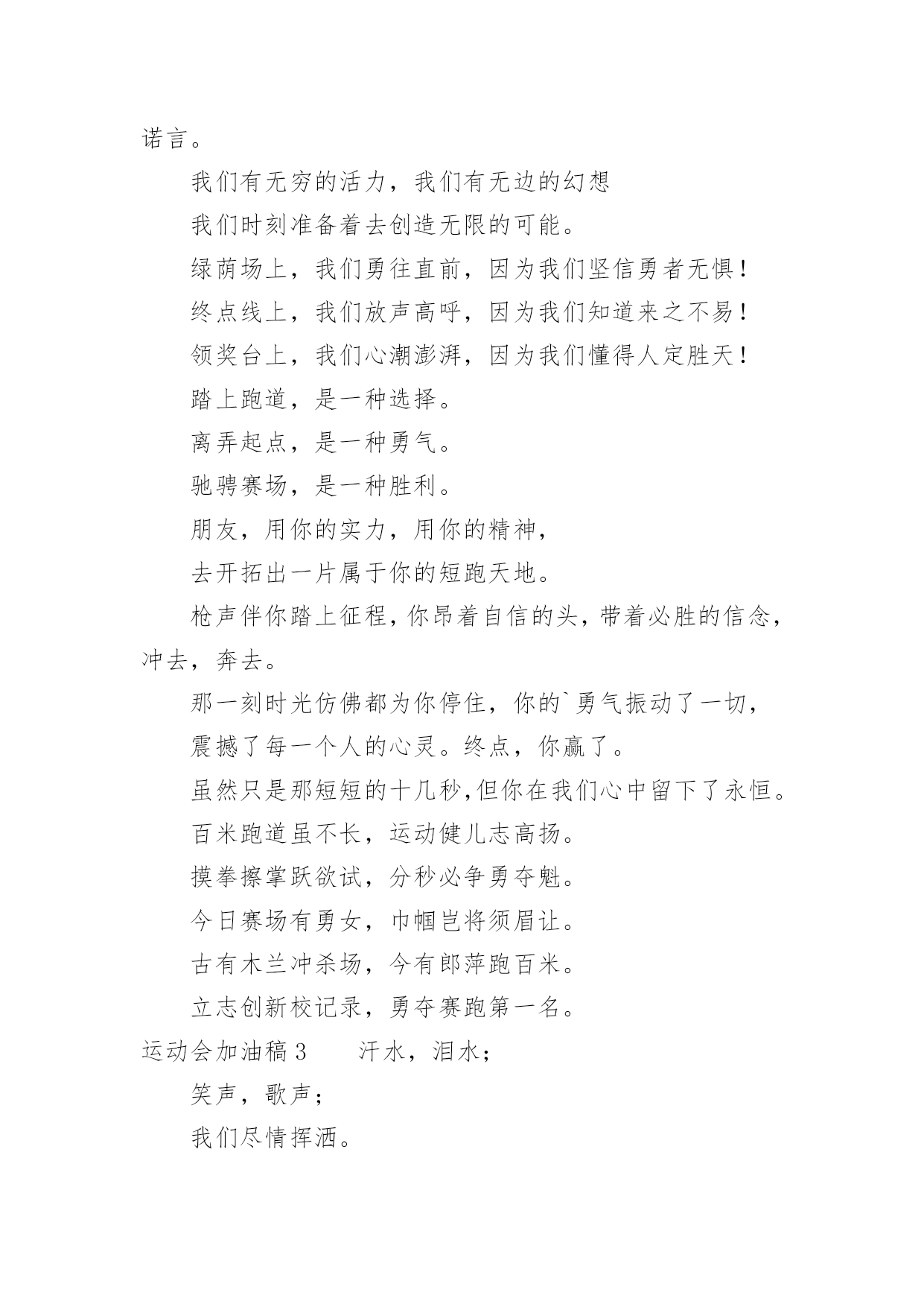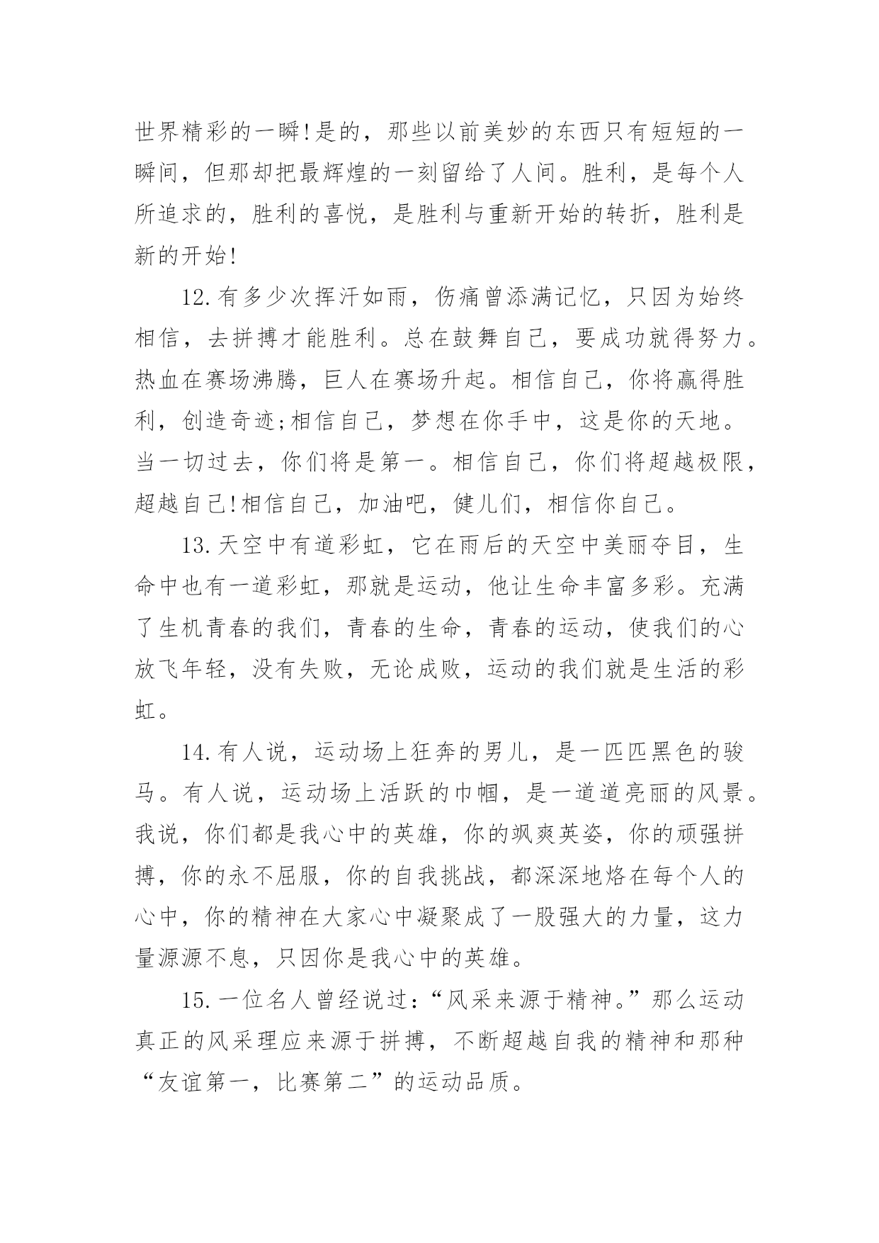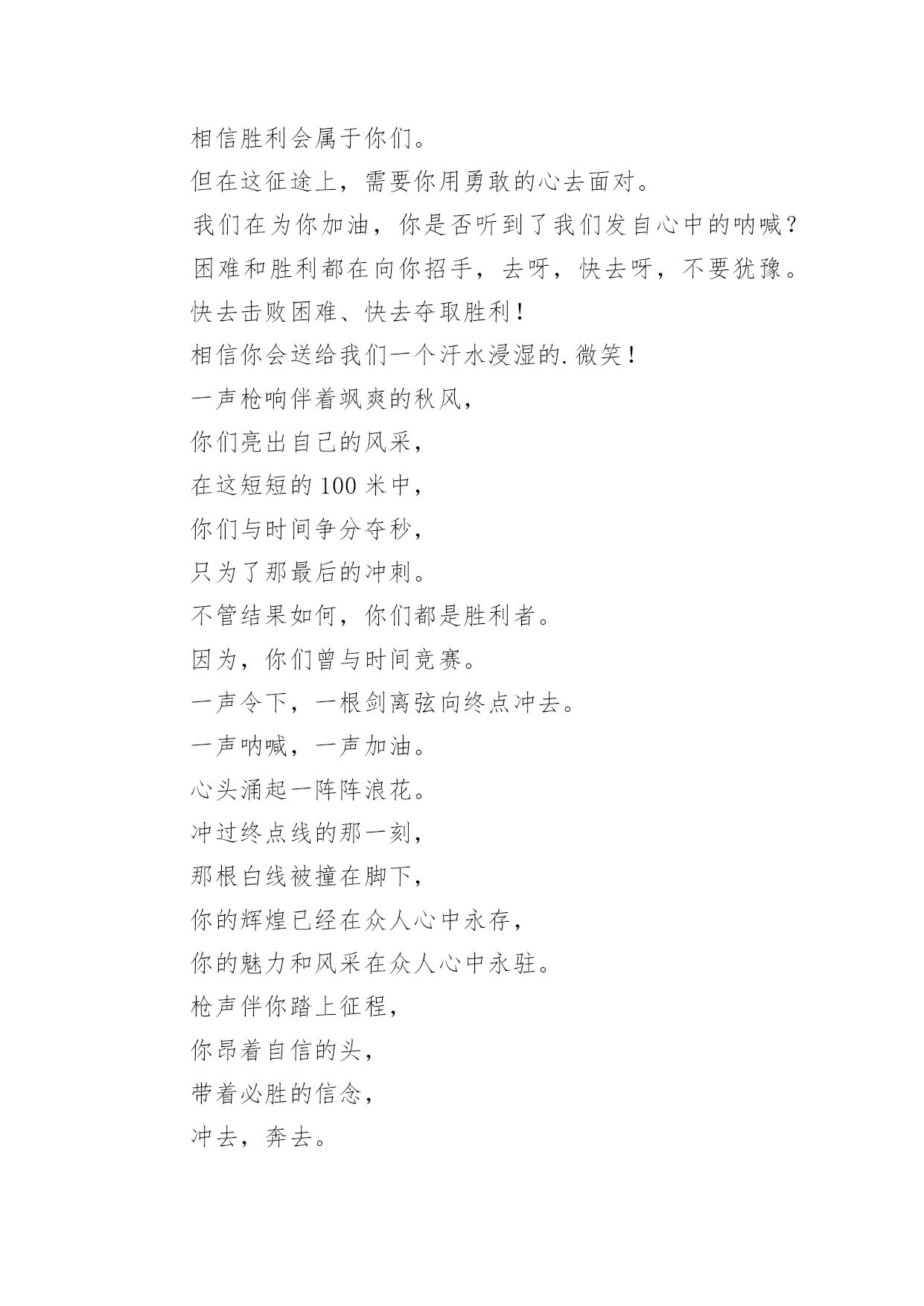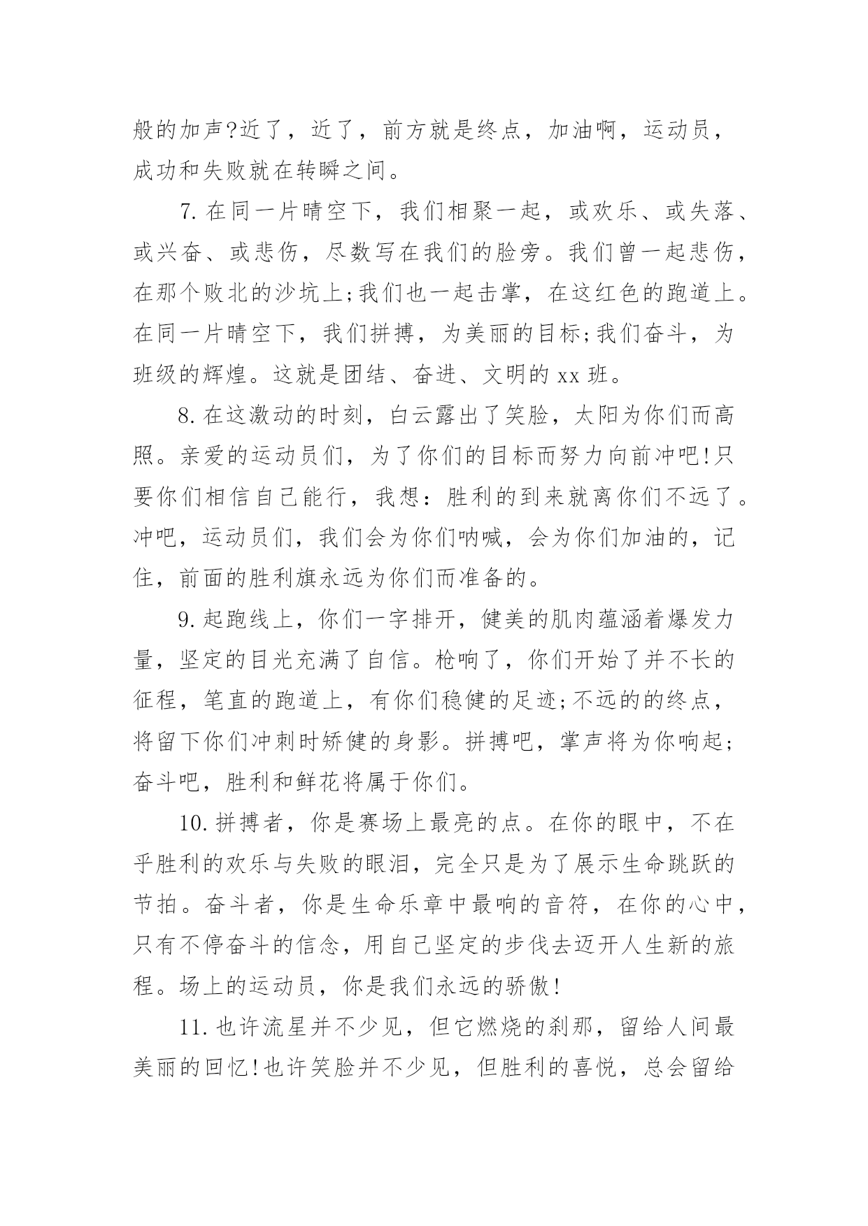 运动会加油稿(优)运动会加油稿15篇在社会发展不断提速的今天,我们都可能会用到加油稿,适当使用加油稿可以给对方打气加油。相信写加油稿是一个让许多人都头痛的问题,以下是小编为大家收集的运动会加油稿,仅供参考,大家一起来看看吧。运动会加油稿1在起跑线上胡华港连续支付歌曲,攻击和铆钉你健美肌肉蕴含爆发力自信的眼神充满自信枪走火了你开始了一段短暂的'旅程在笔直的跑道上有你稳定的脚印离终点不远冲刺时会给你留下一个锋利的背部开始掌声将为你响起开始胜利和鲜花终将属于你运动会加油稿2青春写下我们的召唤,青春编织我们的诺言。我们有无穷的活力,我们有无边的幻想我们时刻准备着去创造无限的可能。绿荫场上,我们勇往直前,因为我们坚信勇者无惧!终点线上,我们放声高呼,因为我们知道来之不易!领奖台上,我们心潮澎湃,因为我们懂得人定胜天!踏上跑道,是一种选择。离弄起点,是一种勇气。驰骋赛场,是一种胜利。朋友,用你的实力,用你的精神,去开拓出一片属于你的短跑天地。枪声伴你踏上征程,你昂着自信的头,带着必胜的信念,冲去,奔去。那一刻时光仿佛都为你停住,你的`勇气振动了一切,震撼了每一个人的心灵。终点,你赢了。虽然只是那短短的十几秒,但你在我们心中留下了永恒。百米跑道虽不长,运动健儿志高扬。摸拳擦掌跃欲试,分秒必争勇夺魁。今日赛场有勇女,巾帼岂将须眉让。古有木兰冲杀场,今有郎萍跑百米。立志创新校记录,勇夺赛跑第一名。运动会加油稿3汗水,泪水;笑声,歌声;我们尽情挥洒。开幕式上,运动场上,我们尽情展现,多少艰辛,多少困苦,我们勇敢承担。因为年轻,因为张扬,因为我们知道:用今天的汗水换来明天的微笑。运动会加油稿41、这是意志的拼搏,这是速度的挑战,胜利在向你们招手,胜利在向你们呼唤!2、不为掌声的注释不为刻意的征服不为失败的痛苦只有辛勤的汗水化作成功的脚步。3、有多少次挥汗如雨,伤痛曾添满记忆,只因为始终相信,去拼搏才能胜利。总在鼓舞自己,要成功就得努力。热血在赛场沸腾,巨人在赛场升起。相信自己,你将赢得胜利,创造奇迹;相信自己,梦想在你手中,这是你的天地。当一切过去,你们将是第一。相信自己,你们将超越极限,超越自己!相信自己,加油吧,健儿们,相信你自己。4、把长长的跑道跑成一段漫漫的征途,听!呼啸的风在为你喝彩,看!猎猎的彩旗在为你加油,加油吧!为了到达终点时那一刻的辉煌!5、光,是温暖的;月,是温馨的;星,是浪漫的;风,是清爽的;鱼,是滋润的;雪,是完美的;冰,是晶莹的;而我们的加油,是连绵不断的;期望你们能够加油,奋力拼搏!6、生活中,我们每天都在尝试;我们走向成功,品味失败,走过心灵的阴雨晴空。运动员们,不要放弃尝试,无论失败与否,重要的是你勇于参与的精神,付出的背后是胜利;无论是否成功,我们永远赞美你,你们永远是我们的骄傲。7、你的汗水洒在跑道,浇灌着成功的花朵开放;你的欢笑飞扬在赛场,为班争光数你最棒;跑吧,追吧,在这广阔的赛场上,你似骏马似离铉的箭;跑吧,追吧,你比虎猛比豹强。8、超越对手,超越自我,是我们的目标,我们的信念,在清凉的初秋,在喧嚣的田径场上,你们点燃了似火的热情,无论成败,我们都为你们感到自豪,你们永远是我们的骄傲!9、运动健将们,用你的实力,用你的精神,去开拓出,一片属于你的长跑天地!10、你是否感到,烈日的照射那是烈日对你的祝福;你是否感到,彩旗的摇摆那是彩旗对你的呐喊人们的注视那是人们对你的希望,祝福在你身边呐喊在你耳边希望在你心中。的健儿,愿你们一展雄风,勇夺桂冠!11、年轻的我们不言失败,没有风浪,就不能显示帆的'本色;没有曲折,就无法品味人生的乐趣。固然我们没得第一,但至少我们付出过努力过拼搏过。人生又能有几次搏呢?12、不长不短的距离,需要的是全身心全程投入,自始至终你们都在拼全力此时此刻,你们处在最风光的一刻,无论第几坚持胜利的信心,只要跑下来,你们就是英雄。13、时间在流逝,赛道在延伸,成功在你面前展现心脏的跳动,热血在沸腾,辉煌在你脚下铸就加油吧,健儿们!14、就像花儿准备了春、秋、冬,就是为了红透整个盛夏。就像雪花经历了春、夏、秋就是为了洁白整个严冬。蹲下,昂首,出发……轻轻的一抬脚,便牵动了全场的目光潇洒的迫挥挥手,便满足了那一份无言的等待。迎着朝阳,你们踏歌而去,背着希望,我们等待你们的归来。15、当一声声的枪声从耳边飘过,xx年级男子xx米拉开了序幕。你们,飞快地奔跑着,奔跑着。早晨,你们放飞气球,系托希望,来年,你们放飞希望,收获成功。梦想由希望构成,希望,由信念启航!愿你们在跑道上挥洒青春,让希望翱翔!加油,xx班的选手们!我们个个同学都在看着你呢!16、踏上跑道,是一种选择。离开起点,是一种勇气。驰骋赛场,是一种胜利。17、不为鲜花的围绕,不为刹那的荣耀,只有执着的信念,化作不停的奔跑,心中燃烧着梦想