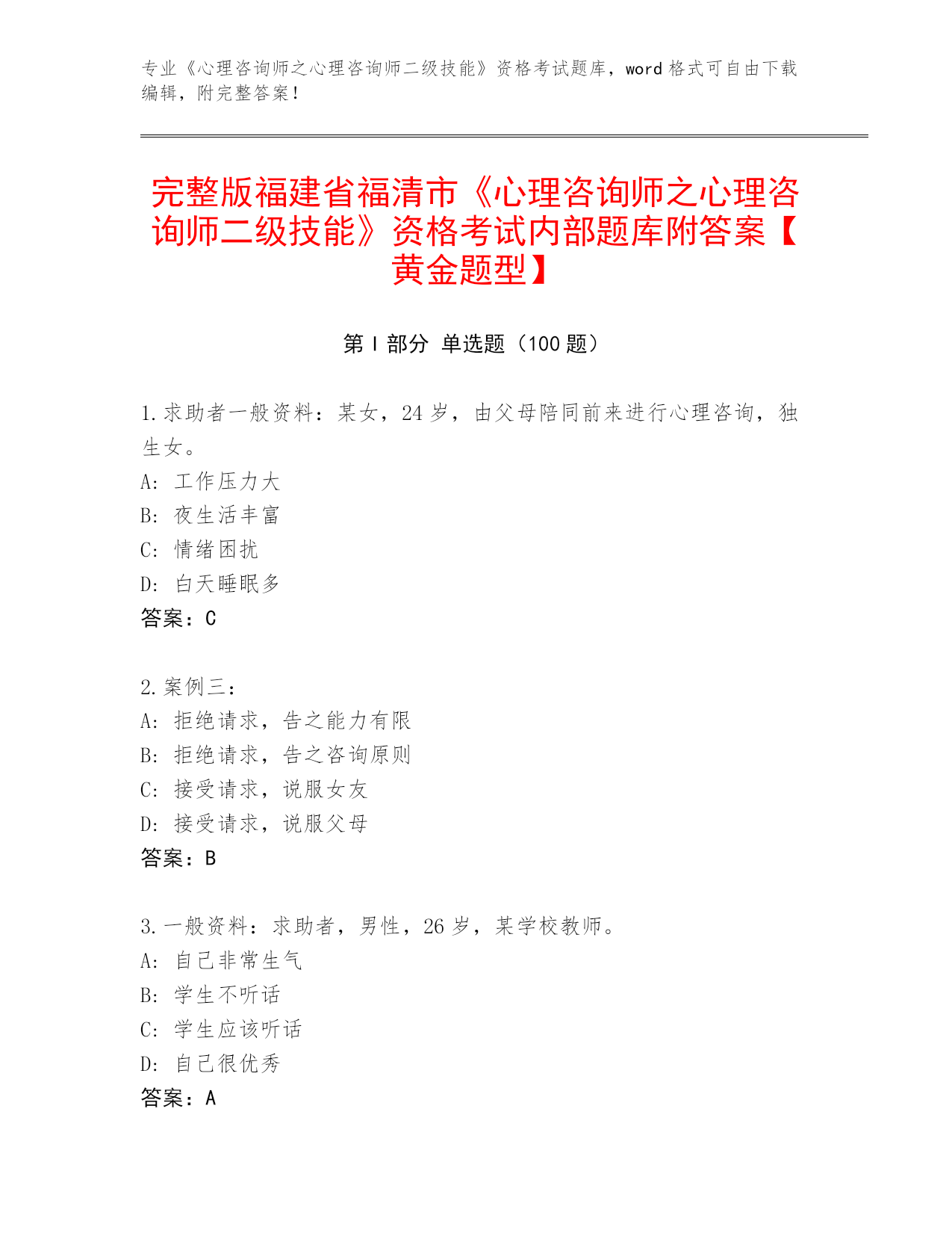完整版福建省福清市《心理咨询师之心理咨询师二级技能》资格考试内部题库附答案【黄金题型】