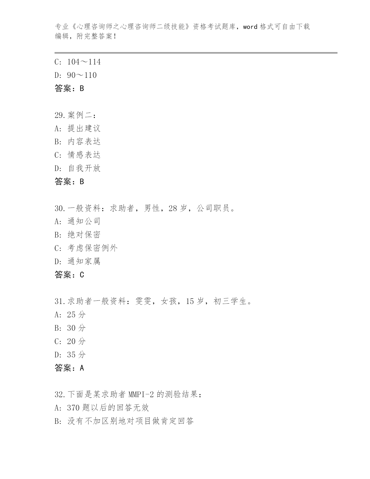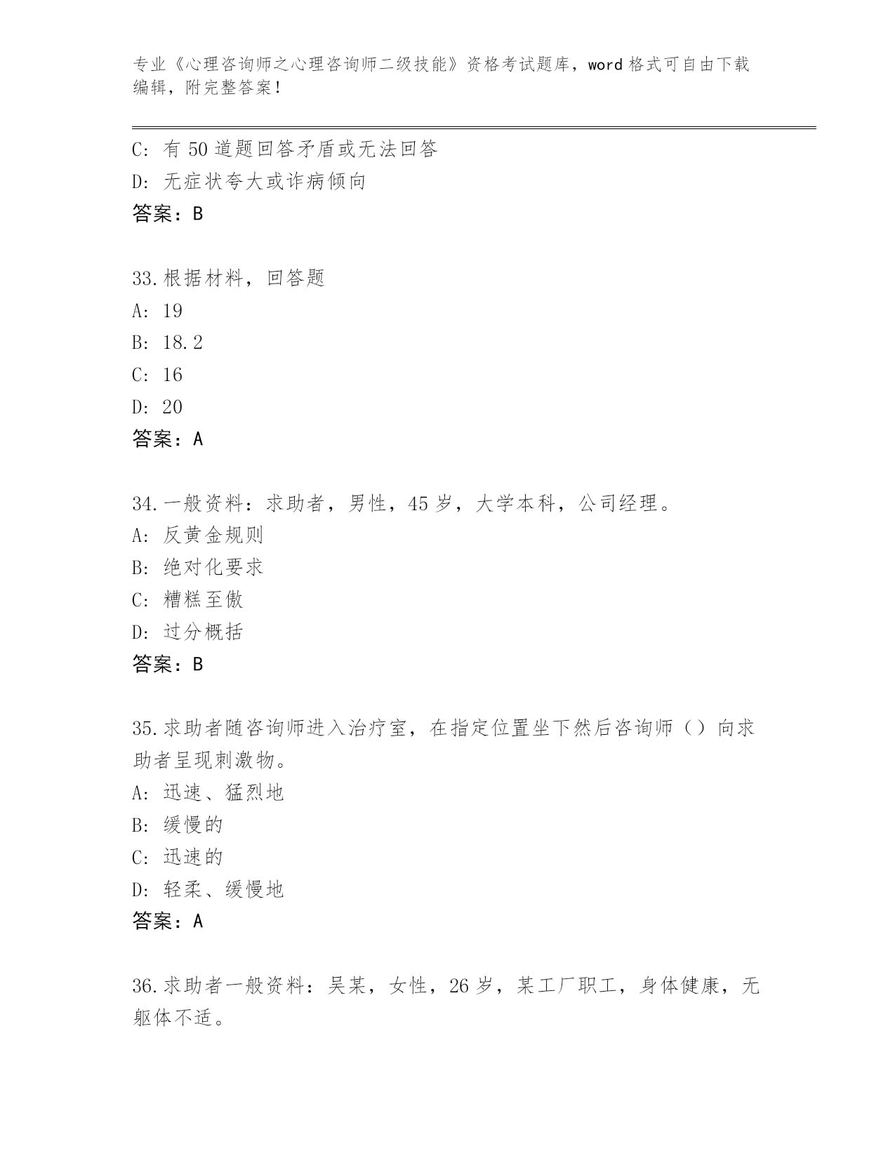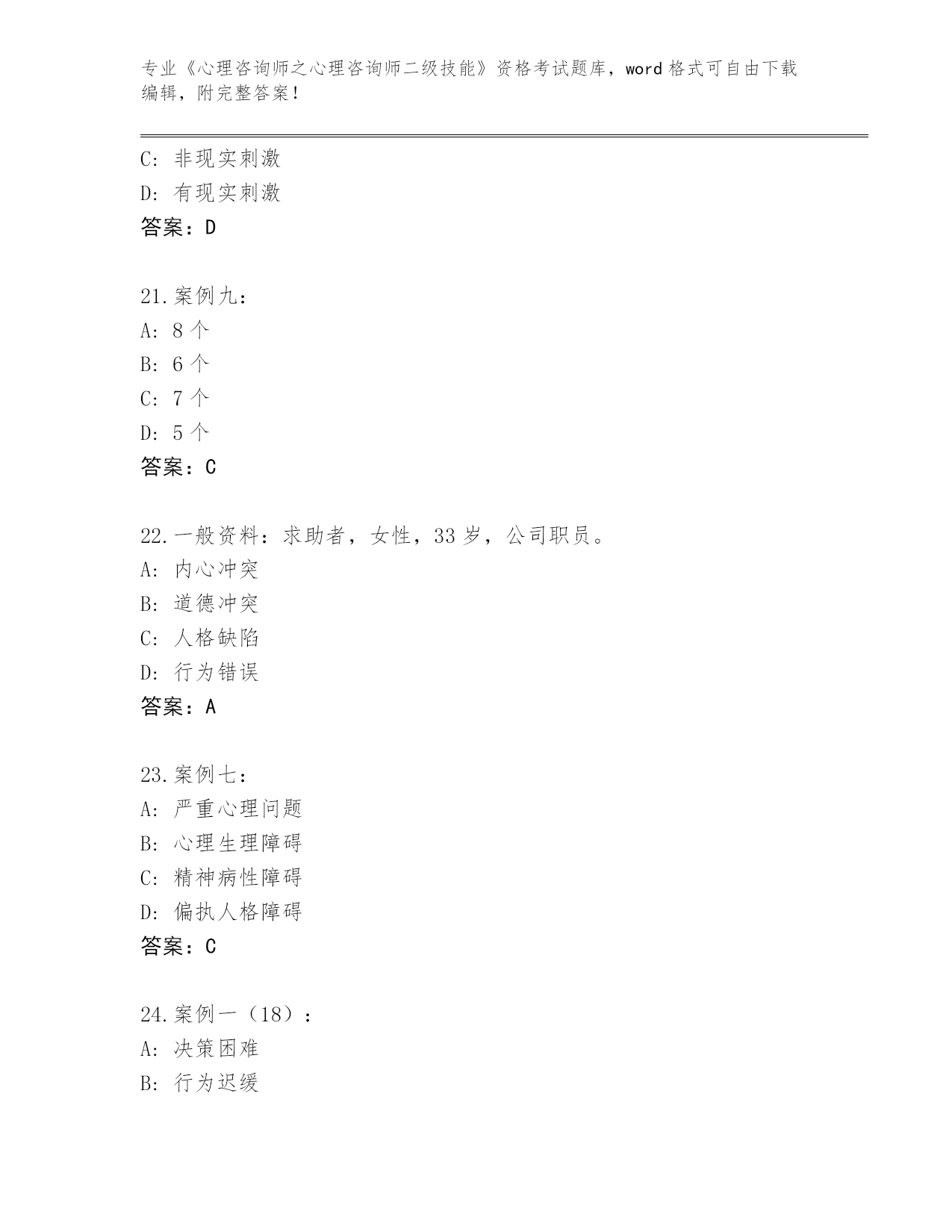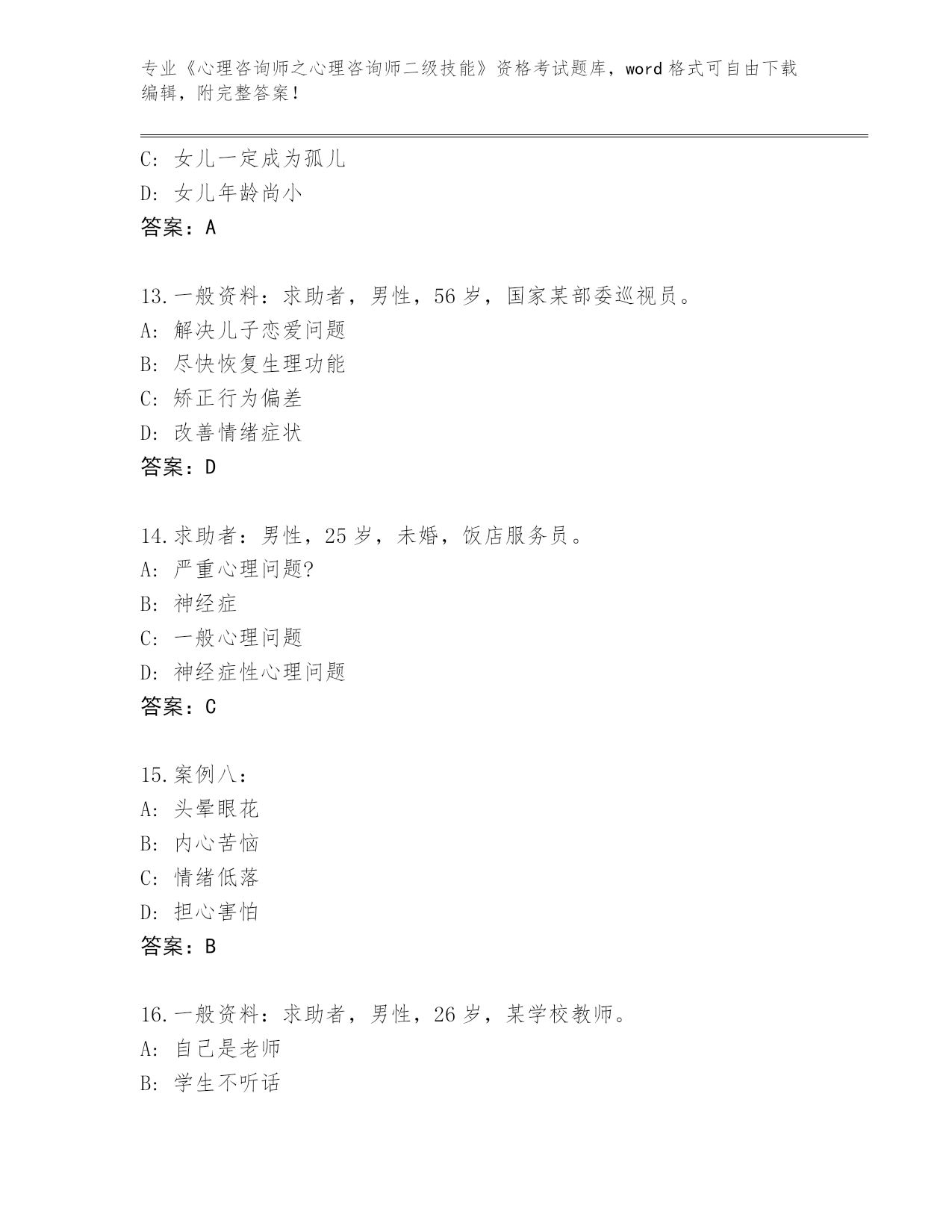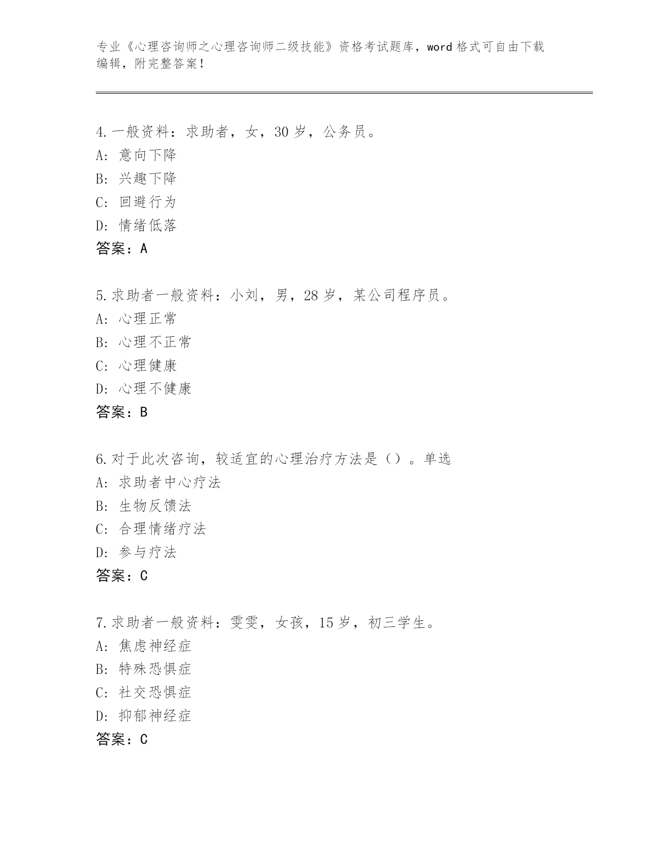 内部使用甘肃省文县《心理咨询师之心理咨询师二级技能》资格考试完整版【黄金题型】