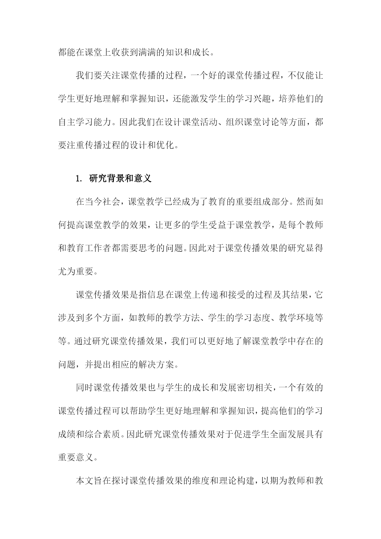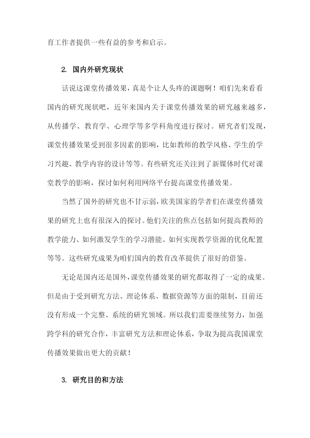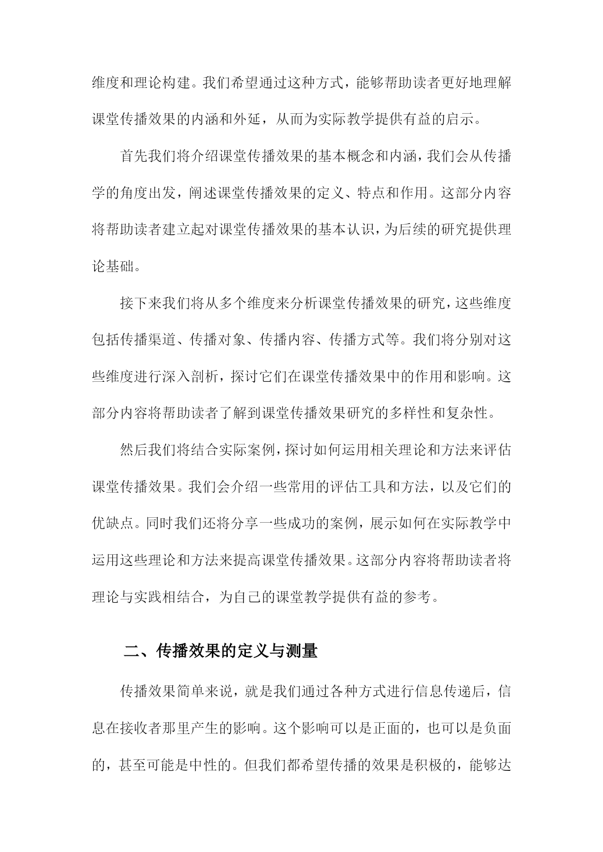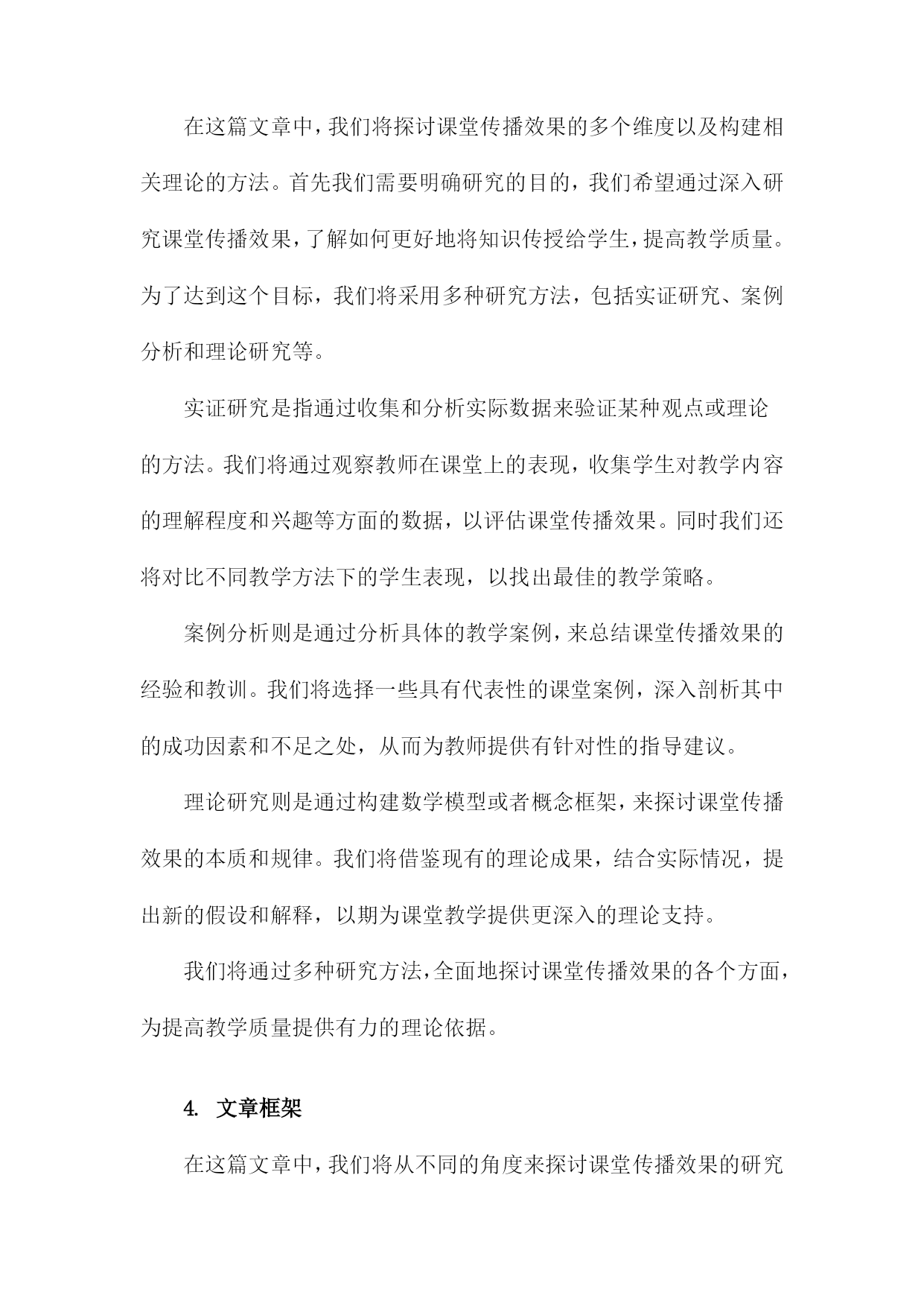 课堂传播效果:研究的维度与理论的构建一、内容概述课堂传播效果这个话题,其实咱们大家都不陌生。从古至今老师和学生就是在这样的课堂里,一点一滴地传递知识,传承文化。那么什么样的课堂传播效果才是最好的呢?这就需要我们从多个维度去研究和探讨。首先我们要明确课堂传播的目的,传播的目的是什么?是为了让学生掌握知识,还是为了让学生喜欢上这个学科?或者是为了培养学生的思维能力?不同的传播目的,可能会导致不同的传播效果。所以我们在研究课堂传播效果的时候,首先要明确我们的传播目标。其次我们要关注课堂传播的方法,传统的课堂教学方法,如讲授法、讨论法、案例法等,都是有效的传播方式。而现代教育技术的发展,也为我们提供了更多的传播途径,如网络课程、在线教学等。这些新的传播方式,既能提高课堂传播的效果,又能拓宽学生的学习渠道。再者我们要关注课堂传播的对象,每个学生的成长环境、兴趣爱好、认知水平都不尽相同,因此我们在进行课堂传播的时候,要因材施教,针对不同学生制定个性化的传播策略。这样才能让每一个学生都能在课堂上收获到满满的知识和成长。我们要关注课堂传播的过程,一个好的课堂传播过程,不仅能让学生更好地理解和掌握知识,还能激发学生的学习兴趣,培养他们的自主学习能力。因此我们在设计课堂活动、组织课堂讨论等方面,都要注重传播过程的设计和优化。1.研究背景和意义在当今社会,课堂教学已经成为了教育的重要组成部分。然而如何提高课堂教学的效果,让更多的学生受益于课堂教学,是每个教师和教育工作者都需要思考的问题。因此对于课堂传播效果的研究显得尤为重要。课堂传播效果是指信息在课堂上传递和接受的过程及其结果,它涉及到多个方面,如教师的教学方法、学生的学习态度、教学环境等等。通过研究课堂传播效果,我们可以更好地了解课堂教学中存在的问题,并提出相应的解决方案。同时课堂传播效果也与学生的成长和发展密切相关,一个有效的课堂传播过程可以帮助学生更好地理解和掌握知识,提高他们的学习成绩和综合素质。因此研究课堂传播效果对于促进学生全面发展具有重要意义。本文旨在探讨课堂传播效果的维度和理论构建,以期为教师和教育工作者提供一些有益的参考和启示。2.国内外研究现状话说这课堂传播效果,真是个让人头疼的课题啊!咱们先来看看国内的研究现状吧,近年来国内关于课堂传播效果的研究越来越多,从传播学、教育学、心理学等多学科角度进行探讨。研究者们发现,课堂传播效果受到很多因素的影响,比如教师的教学风格、学生的学习兴趣、教学内容的设计等等。有些研究还关注到了新媒体时代对课堂教学的影响,探讨如何利用网络平台提高课堂传播效果。当然了国外的研究也不甘示弱,欧美国家的学者们在课堂传播效果的研究上也有很深入的探讨。他们关注的焦点包括如何提高教师的教学能力、如何激发学生的学习潜能、如何实现教学资源的优化配置等等。这些研究成果为咱们国内的教育改革提供了很好的借鉴。无论是国内还是国外,课堂传播效果的研究都取得了一定的成果。但是由于受到研究方法、理论体系、数据资源等方面的限制,目前还没有形成一个完整、系统的研究领域。所以我们需要继续努力,加强跨学科的研究合作,丰富研究方法和理论体系,争取为提高我国课堂传播效果做出更大的贡献!3.研究目的和方法在这篇文章中,我们将探讨课堂传播效果的多个维度以及构建相关理论的方法。首先我们需要明确研究的目的,我们希望通过深入研究课堂传播效果,了解如何更好地将知识传授给学生,提高教学质量。为了达到这个目标,我们将采用多种研究方法,包括实证研究、案例分析和理论研究等。实证研究是指通过收集和分析实际数据来验证某种观点或理论的方法。我们将通过观察教师在课堂上的表现,收集学生对教学内容的理解程度和兴趣等方面的数据,以评估课堂传播效果。同时我们还将对比不同教学方法下的学生表现,以找出最佳的教学策略。案例分析则是通过分析具体的教学案例,来总结课堂传播效果的经验和教训。我们将选择一些具有代表性的课堂案例,深入剖析其中的成功因素和不足之处,从而为教师提供有针对性的指导建议。理论研究则是通过构建数学模型或者概念框架,来探讨课堂传播效果的本质和规律。我们将借鉴现有的理论成果,结合实际情况,提出新的假设和解释,以期为课堂教学提供更深入的理论支持。我们将通过多种研究方法,全面地探讨课堂传播效果的各个方面,为提高教学质量提供有力的理论依据。4.文章框架在这篇文章中,我们将从不同的角度来探讨课堂传播效果的研究维度和理论构建。我们希望通过这种方式,能够帮助读者更好地理解课堂传播效果的内涵和外延,从而为实际教学提供有益的启示。首先我们将介绍课堂传播效果的基本概念和内涵,我们会从传播学的角度出发,阐述课堂传播效果的定义、特点和作用。这部分内容将帮助读者建立起对课堂传播效果的基本认识,为后续的