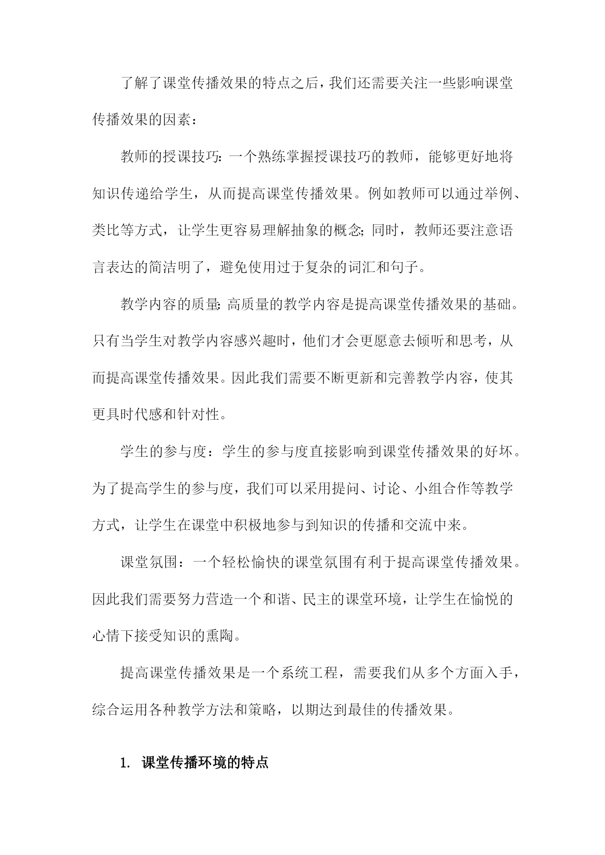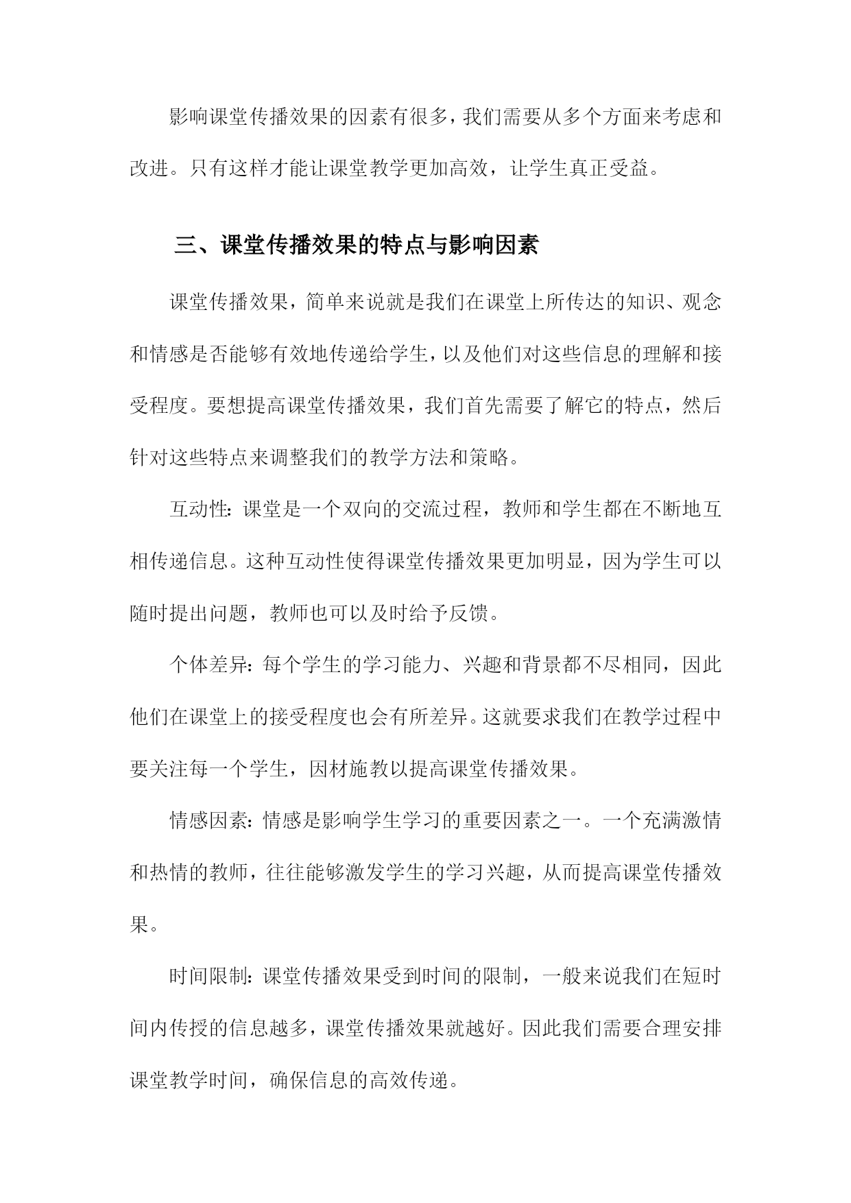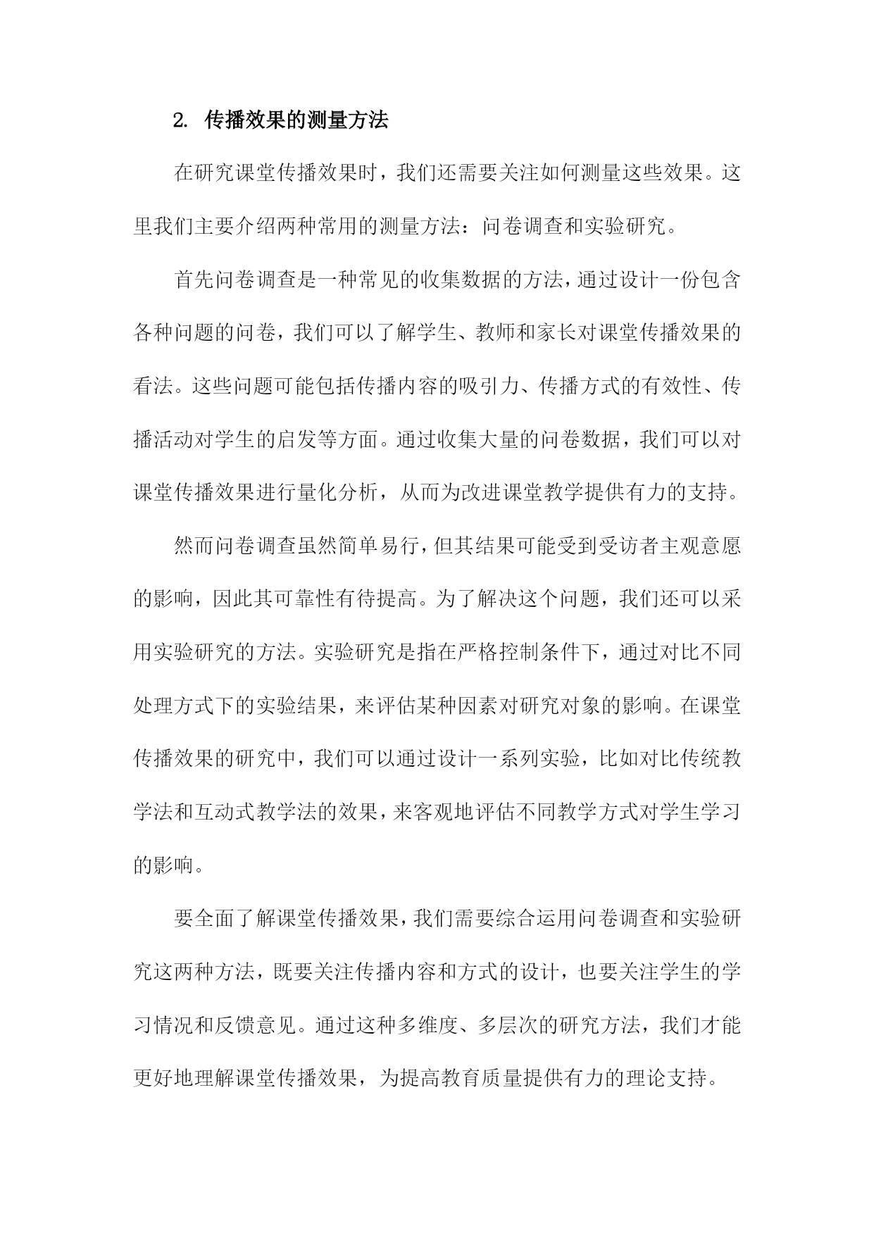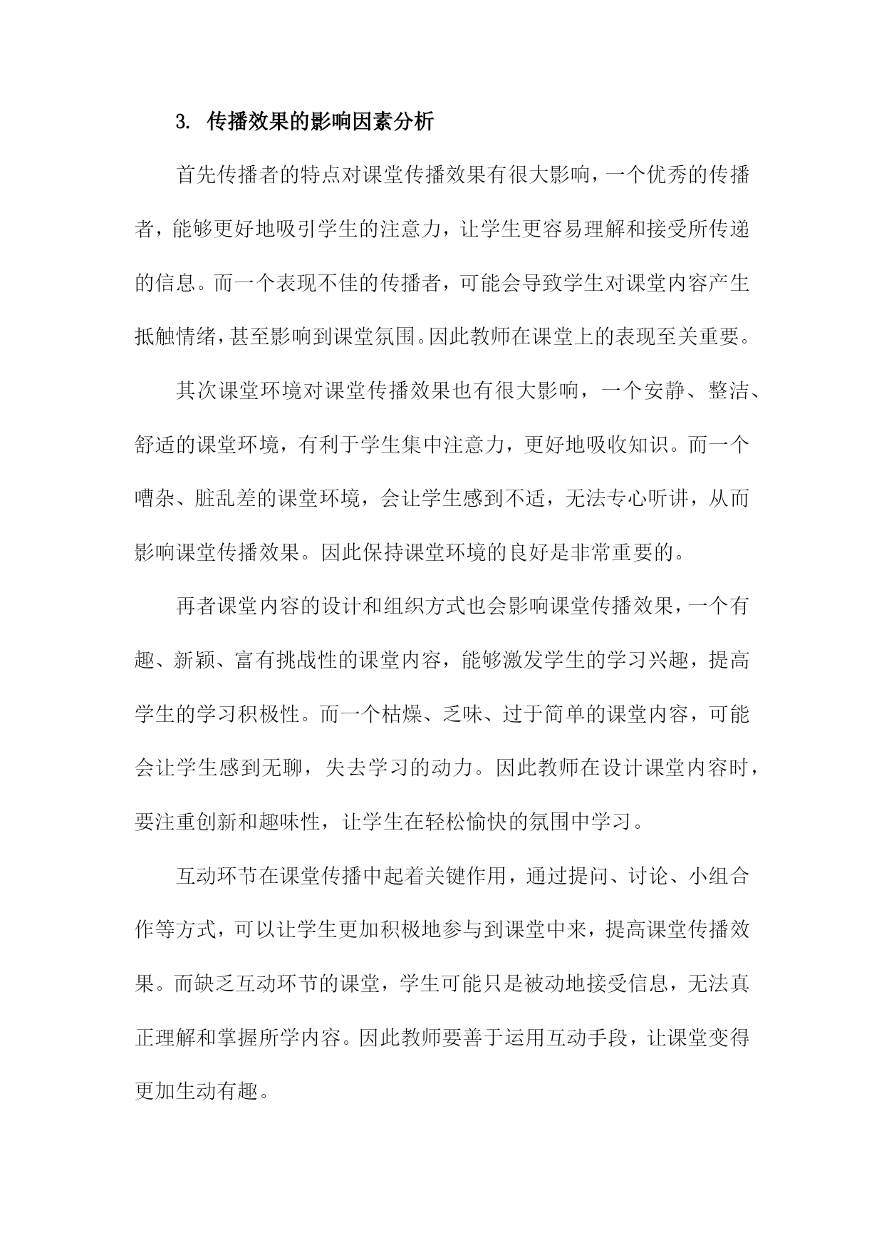课堂传播效果:研究的维度与理论的构建一、内容概述课堂传播效果这个话题,其实咱们大家都不陌生。从古至今老师和学生就是在这样的课堂里,一点一滴地传递知识,传承文化。那么什么样的课堂传播效果才是最好的呢?这就需要我们从多个维度去研究和探讨。首先我们要明确课堂传播的目的,传播的目的是什么?是为了让学生掌握知识,还是为了让学生喜欢上这个学科?或者是为了培养学生的思维能力?不同的传播目的,可能会导致不同的传播效果。所以我们在研究课堂传播效果的时候,首先要明确我们的传播目标。其次我们要关注课堂传播的方法,传统的课堂教学方法,如讲授法、讨论法、案例法等,都是有效的传播方式。而现代教育技术的发展,也为我们提供了更多的传播途径,如网络课程、在线教学等。这些新的传播方式,既能提高课堂传播的效果,又能拓宽学生的学习渠道。再者我们要关注课堂传播的对象,每个学生的成长环境、兴趣爱好、认知水平都不尽相同,因此我们在进行课堂传播的时候,要因材施教,针对不同学生制定个性化的传播策略。这样才能让每一个学生都能在课堂上收获到满满的知识和成长。我们要关注课堂传播的过程,一个好的课堂传播过程,不仅能让学生更好地理解和掌握知识,还能激发学生的学习兴趣,培养他们的自主学习能力。因此我们在设计课堂活动、组织课堂讨论等方面,都要注重传播过程的设计和优化。1.研究背景和意义在当今社会,课堂教学已经成为了教育的重要组成部分。然而如何提高课堂教学的效果,让更多的学生受益于课堂教学,是每个教师和教育工作者都需要思考的问题。因此对于课堂传播效果的研究显得尤为重要。课堂传播效果是指信息在课堂上传递和接受的过程及其结果,它涉及到多个方面,如教师的教学方法、学生的学习态度、教学环境等等。通过研究课堂传播效果,我们可以更好地了解课堂教学中存在的问题,并提出相应的解决方案。同时课堂传播效果也与学生的成长和发展密切相关,一个有效的课堂传播过程可以帮助学生更好地理解和掌握知识,提高他们的学习成绩和综合素质。因此研究课堂传播效果对于促进学生全面发展具有重要意义。本文旨在探讨课堂传播效果的维度和理论构建,以期为教师和教育工作者提供一些有益的参考和启示。2.国内外研究现状话说这课堂传播效果,真是个让人头疼的课题啊!咱们先来看看国内的研究现状吧,近年来国内关于课堂传播效果的研究越来越多,从传播学、教育学、心理学等多学科角度进行探讨。研究者们发现,课堂传播效果受到很多因素的影响,比如教师的教学风格、学生的学习兴趣、教学内容的设计等等。有些研究还关注到了新媒体时代对课堂教学的影响,探讨如何利用网络平台提高课堂传播效果。当然了国外的研究也不甘示弱,欧美国家的学者们在课堂传播效果的研究上也有很深入的探讨。他们关注的焦点包括如何提高教师的教学能力、如何激发学生的学习潜能、如何实现教学资源的优化配置等等。这些研究成果为咱们国内的教育改革提供了很好的借鉴。无论是国内还是国外,课堂传播效果的研究都取得了一定的成果。但是由于受到研究方法、理论体系、数据资源等方面的限制,目前还没有形成一个完整、系统的研究领域。所以我们需要继续努力,加强跨学科的研究合作,丰富研究方法和理论体系,争取为提高我国课堂传播效果做出更大的贡献!3.研究目的和方法在这篇文章中,我们将探讨课堂传播效果的多个维度以及构建相关理论的方法。首先我们需要明确研究的目的,我们希望通过深入研究课堂传播效果,了解如何更好地将知识传授给学生,提高教学质量。为了达到这个目标,我们将采用多种研究方法,包括实证研究、案例分析和理论研究等。实证研究是指通过收集和分析实际数据来验证某种观点或理论的方法。我们将通过观察教师在课堂上的表现,收集学生对教学内容的理解程度和兴趣等方面的数据,以评估课堂传播效果。同时我们还将对比不同教学方法下的学生表现,以找出最佳的教学策略。案例分析则是通过分析具体的教学案例,来总结课堂传播效果的经验和教训。我们将选择一些具有代表性的课堂案例,深入剖析其中的成功因素和不足之处,从而为教师提供有针对性的指导建议。理论研究则是通过构建数学模型或者概念框架,来探讨课堂传播效果的本质和规律。我们将借鉴现有的理论成果,结合实际情况,提出新的假设和解释,以期为课堂教学提供更深入的理论支持。我们将通过多种研究方法,全面地探讨课堂传播效果的各个方面,为提高教学质量提供有力的理论依据。4.文章框架在这篇文章中,我们将从不同的角度来探讨课堂传播效果的研究维度和理论构建。我们希望通过这种方式,能够帮助读者更好地理解课堂传播效果的内涵和外延,从而为实际教学提供有益的启示。首先我们将介绍课堂传播效果的基本概念和内涵,我们会从传播学的角度出发,阐述课堂传播效果的定义、特点和作用。这部分内容将帮助读者建立起对课堂传播效果的基本认识,为后续的