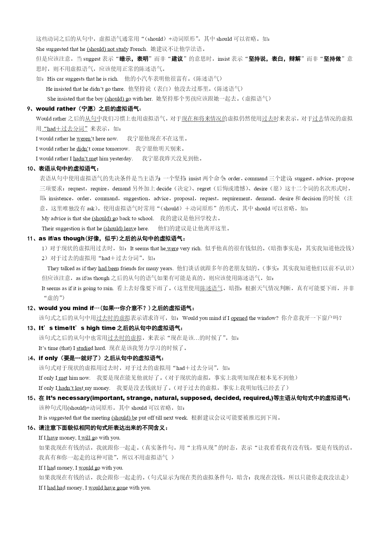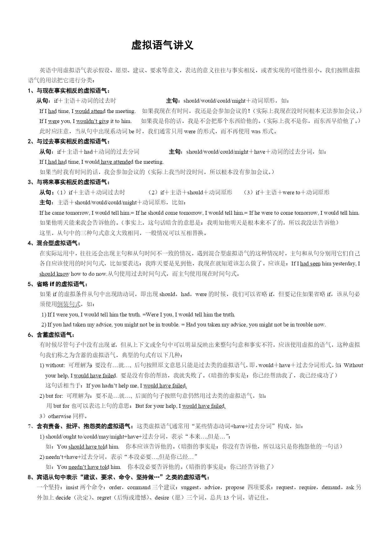 虚拟语气讲义英语中用虚拟语气表示假设、愿望、建议、要求等意义,表达的意义往往与事实相反,或者实现的可能性很小。我们按照虚拟语气的用法把它进行分类:1、与现在事实相反的虚拟语气:从句:if+主语+动词的过去时主句:should/would/could/might+动词原形,如:IfIhadtime,Iwouldattendthemeeting.如果我现在有时间,我还是会参加会议的!(实际上我现在没时间根本无法参加会议。)IfIwereyou,Iwouldn’tgiveittohim.如果我是你的话,我是不会把那个东西给他的。(实际上我不是你,而东西早给他了。)此时应注意,当从句中出现系动词be时,我们通常只用were的形式,而不再使用was形式。2、与过去事实相反的虚拟语气:从句:if+主语+had+动词的过去分词主句:should/would/could/might+have+动词的过去分词,如:IfIhadhadtime,Iwouldhaveattendedthemeeting.如果当时我有时间的话,我会参加会议的(实际上我当时没时间,所以根本没有参加会议。)3、与将来事实相反的虚拟语气:从句:(1)if+主语+动词过去时(2)if+主语+should+动词原形(3)if+主语+wereto+动词原形主句:主语+should/would/could/might+动词原形,比如:Ifhecametomorrow,Iwouldtellhim.=Ifheshouldcometomorrow,Iwouldtellhim.=Ifheweretocometomorrow,Iwouldtellhim.如果他明天能来我会告诉他的。(事实上,这句话暗含的意思是:我明知他明天是根本来不了的,所以我没法告诉他)这里,从句中的三种句式意义大致相同,一般情况可以互相替换。4、混合型虚拟语气:在实际运用中,往往还会出现主句和从句时间不一致的情况,遇到混合型虚拟语气的这种情况时,主句和从句分别用它们自己各自应该使用的时间句式,比如要表达:我昨天要是见到他,我现在就知道该怎么做了。应该是:IfIhadseenhimyesterday,Ishouldknowhowtodonow.从句使用过去时间句式,而主句使用现在时间句式。5、省略if的虚拟语气:如果if的虚拟条件从句中出现助动词,即出现should,had,were的时候,我们可以省略if,但要记住如果省略if,该从句必须使用倒装句式,如:1)IfIwereyou,Iwouldtellhimthetruth.=WereIyou,Iwouldtellhimthetruth.2)Ifyouhadtakenmyadvice,youmightnotbeintrouble.=Hadyoutakenmyadvice,youmightnotbeintroublenow.6、含蓄虚拟语气:有时候尽管句子中没有出现if,但从上下文或全句中可以明显反映出来整句句意和事实不符,应该使用虚拟的语气,这种虚拟句我们称之为含蓄的虚拟语气,典型的句式有以下几种:1)without:可理解为:要没有…就…,后句按照原文意思只能是过去类的虚拟语气,即,would+have+过去分词形式,如:Withoutyourhelp,Iwouldhavefailed.要是没有你的帮助,我就失败了。(暗指的事实是:你已经帮助我了,我已经成功了)这句话相当于:Ifyouhadn’thelpme,Iwouldhavefailed.2)butfor:可理解为:要不是…就…,后面的句子按照句意仍然用过去类的虚拟语气,如:用butfor也可以表达上句的意思:Butforyourhelp,Iwouldhavefailed.3)otherwise同样。7、含有责备、批评、抱怨类的虚拟语气:这类虚拟语气通常用“某些情态动词+have+过去分词”构成,如:1)should/oughtto/could/may/might+have+过去分词,表示“本来…,但是…”:如:Youshouldhavetoldhim.你本应该告诉他的。(暗指的事实是:你没有告诉他,所以这只是你抱怨他的一句话)2)needn’t+have+过去分词,表示“本没必要…,但是你已经…”如:Youneedn’thavetoldhim.你本没必要告诉他的。(暗指的事实是:你已经告诉他了)8、宾语从句中表示“建议、要求、命令、坚持做…”之类的虚拟语气:一个坚持:insist两个命令:order,command三个建议:suggest,advice,propose四项要求:request,require,demand,ask