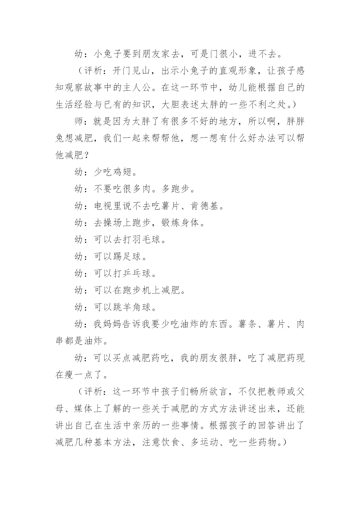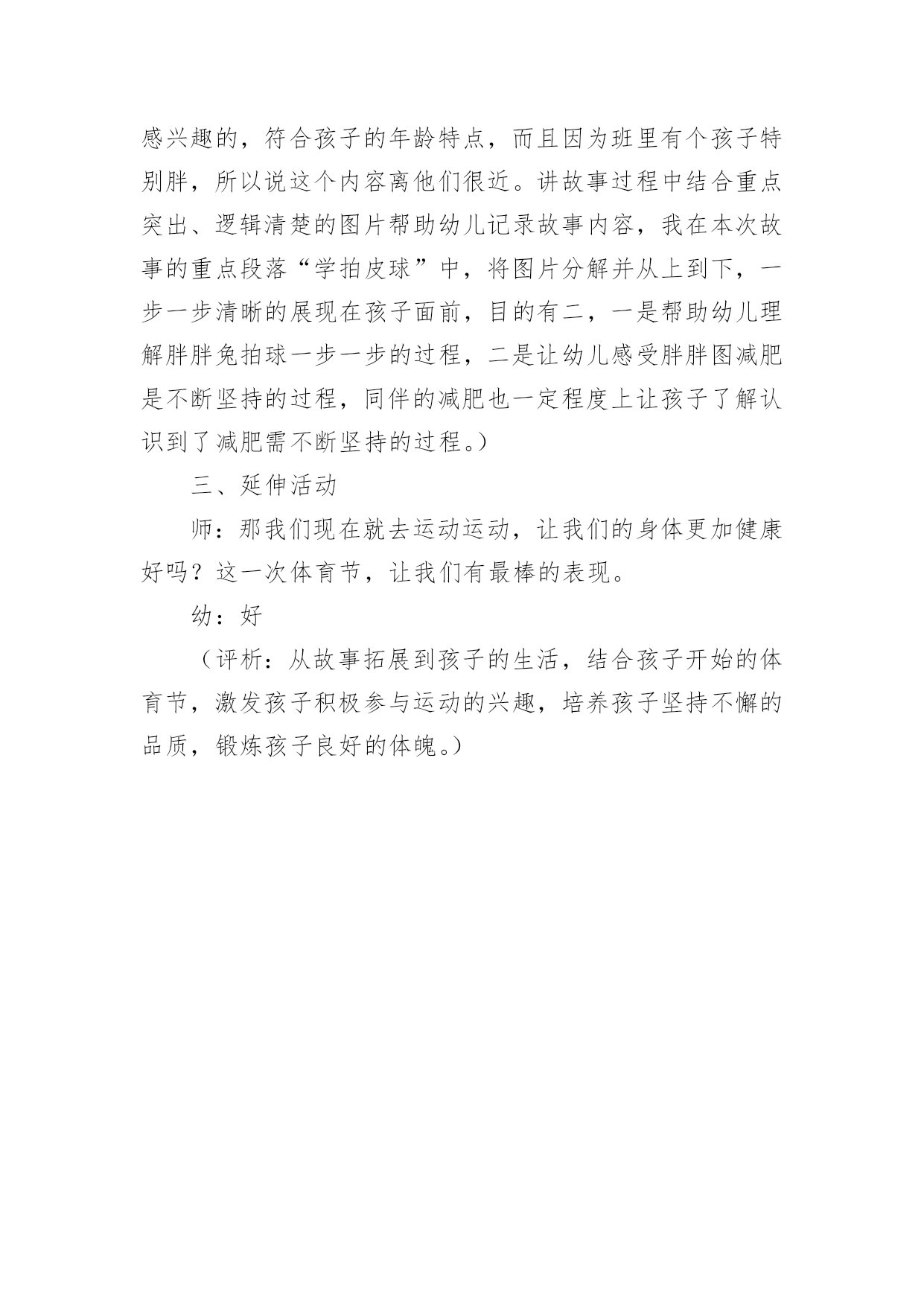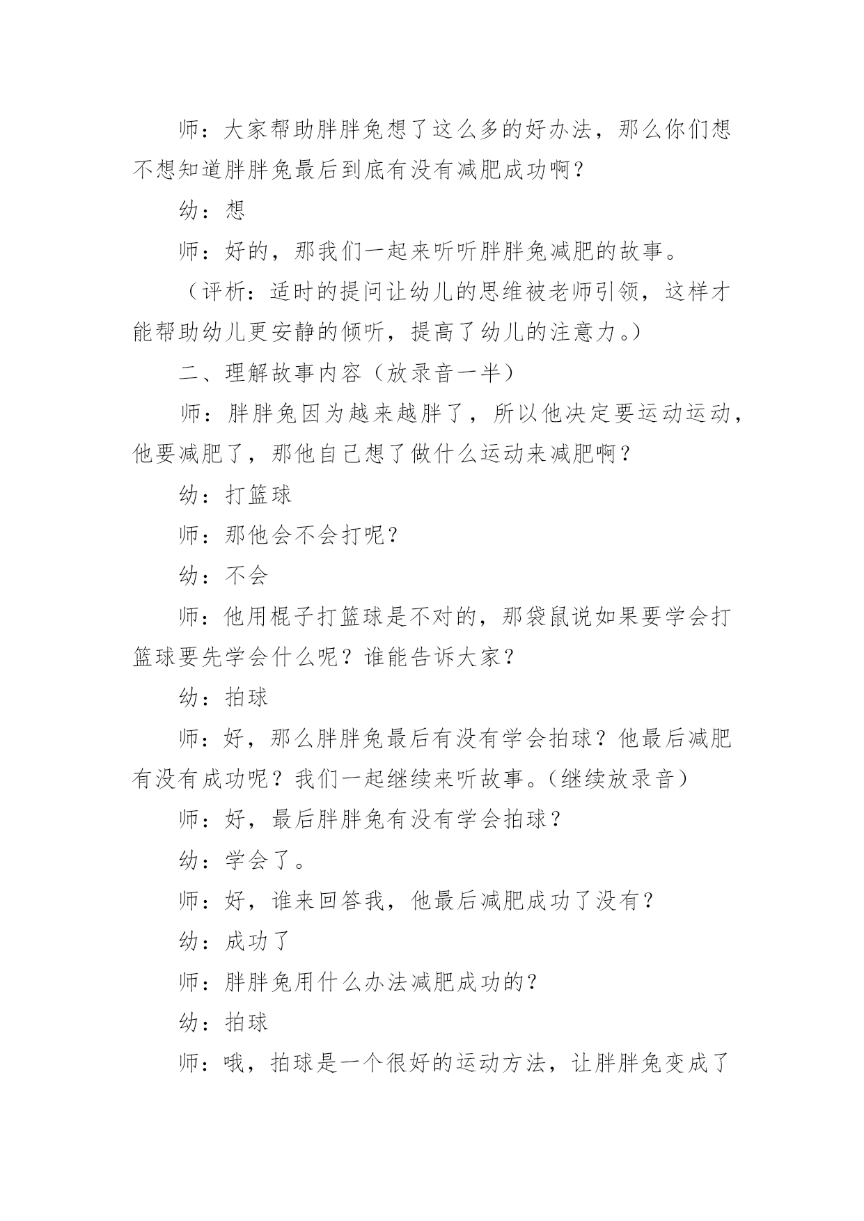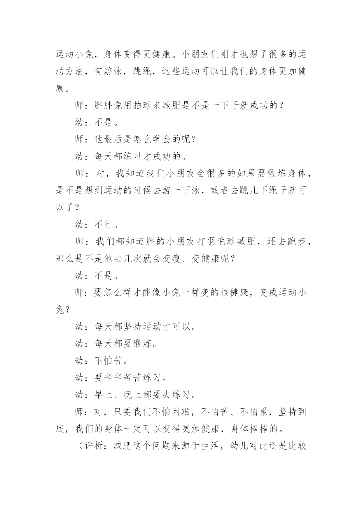 大班语言活动:运动小兔活动目标:1、理解故事内容,知道运动能使身体健康。2、能讲出各种运动的方式。3、培养幼儿热爱运动的习惯,树立积极锻炼的意识。活动准备:挂图若干张,故事磁带活动过程:一、引入胖胖兔,设疑讨论师:今天我们中一班来了一个小客人,大家看它是谁?(出示图片)幼:兔子,小兔子师:对,他看上去怎么样啊?幼:很白,很胖的师:是的,这只小兔很胖的、,所以森林里的小动物们都叫他胖胖兔,那么小朋友知不知道很胖对他来说有什么不方便呢?幼:胖了很难看。幼:走一点路就走不动。幼:太胖了摔了跟头爬不起。幼:太胖了跑步跑不快。幼:太胖了穿不下好看的衣服。幼:小兔子胖了跳不动,很吃力。幼:小兔子要到朋友家去,可是门很小,进不去。(评析:开门见山,出示小兔子的直观形象,让孩子感知观察故事中的主人公。在这一环节中,幼儿能根据自己的生活经验与已有的知识,大胆表述太胖的一些不利之处。)师:就是因为太胖了有很多不好的地方,所以啊,胖胖兔想减肥,我们一起来帮帮他,想一想有什么好办法可以帮他减肥?幼:少吃鸡翅。幼:不要吃很多肉。多跑步。幼:电视里说不去吃薯片、肯德基。幼:去操场上跑步,锻炼身体。幼:可以去打羽毛球。幼:可以踢足球。幼:可以打乒乓球。幼:可以在跑步机上减肥。幼:可以跳羊角球。幼:我妈妈告诉我要少吃油炸的东西。薯条、薯片、肉串都是油炸。幼:可以买点减肥药吃,我的朋友很胖,吃了减肥药现在瘦一点了。(评析:这一环节中孩子们畅所欲言,不仅把教师或父母、媒体上了解的一些关于减肥的方式方法讲述出来,还能讲出自己在生活中亲历的一些事情。根据孩子的回答讲出了减肥几种基本方法,注意饮食、多运动、吃一些药物。)师:大家帮助胖胖兔想了这么多的好办法,那么你们想不想知道胖胖兔最后到底有没有减肥成功啊?幼:想师:好的,那我们一起来听听胖胖兔减肥的故事。(评析:适时的提问让幼儿的思维被老师引领,这样才能帮助幼儿更安静的倾听,提高了幼儿的注意力。)二、理解故事内容(放录音一半)师:胖胖兔因为越来越胖了,所以他决定要运动运动,他要减肥了,那他自己想了做什么运动来减肥啊?幼:打篮球师:那他会不会打呢?幼:不会师:他用棍子打篮球是不对的,那袋鼠说如果要学会打篮球要先学会什么呢?谁能告诉大家?幼:拍球师:好,那么胖胖兔最后有没有学会拍球?他最后减肥有没有成功呢?我们一起继续来听故事。(继续放录音)师:好,最后胖胖兔有没有学会拍球?幼:学会了。师:好,谁来回答我,他最后减肥成功了没有?幼:成功了师:胖胖兔用什么办法减肥成功的?幼:拍球师:哦,拍球是一个很好的运动方法,让胖胖兔变成了运动小兔,身体变得更健康。小朋友们刚才也想了很多的运动方法,有游泳,跳绳,这些运动可以让我们的身体更加健康。师:胖胖兔用拍球来减肥是不是一下子就成功的?幼:不是。师:他最后是怎么学会的呢?幼:每天都练习才成功的。师:对,我知道我们小朋友会很多的如果要锻炼身体,是不是想到运动的时候去游一下泳,或者去跳几下绳子就可以了?幼:不行。师:我们都知道胖的小朋友打羽毛球减肥,还去跑步,那么是不是他去几次就会变瘦、变健康呢?幼:不是。师:要怎么样才能像小兔一样变的很健康,变成运动小兔?幼:每天都坚持运动才可以。幼:每天都要锻炼。幼:不怕苦。幼:要辛辛苦苦练习。幼:早上、晚上都要去练习。师:对,只要我们不怕困难,不怕苦、不怕累,坚持到底,我们的身体一定可以变得更加健康,身体棒棒的。(评析:减肥这个问题来源于生活,幼儿对此还是比较感兴趣的,符合孩子的年龄特点,而且因为班里有个孩子特别胖,所以说这个内容离他们很近。讲故事过程中结合重点突出、逻辑清楚的图片帮助幼儿记录故事内容,我在本次故事的重点段落“学拍皮球”中,将图片分解并从上到下,一步一步清晰的展现在孩子面前,目的有二,一是帮助幼儿理解胖胖兔拍球一步一步的过程,二是让幼儿感受胖胖图减肥是不断坚持的过程,同伴的减肥也一定程度上让孩子了解认识到了减肥需不断坚持的过程。)三、延伸活动师:那我们现在就去运动运动,让我们的身体更加健康好吗?这一次体育节,让我们有最棒的表现。幼:好(评析:从故事拓展到孩子的生活,结合孩子开始的体育节,激发孩子积极参与运动的兴趣,培养孩子坚持不懈的品质,锻炼孩子良好的体魄。)