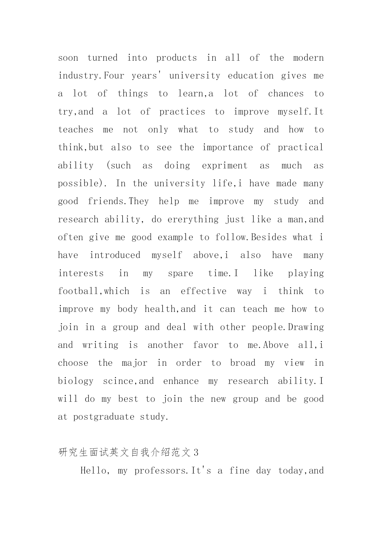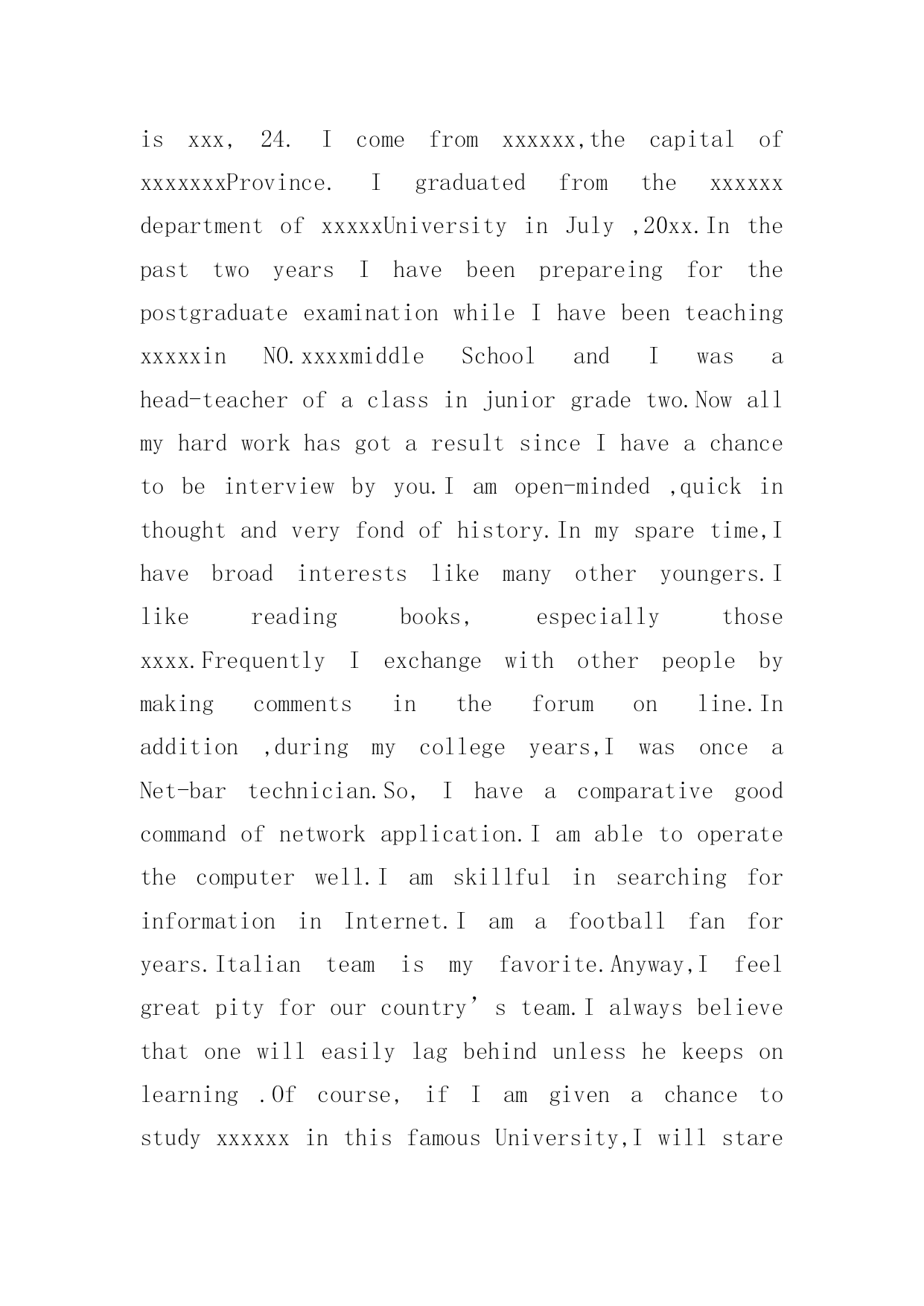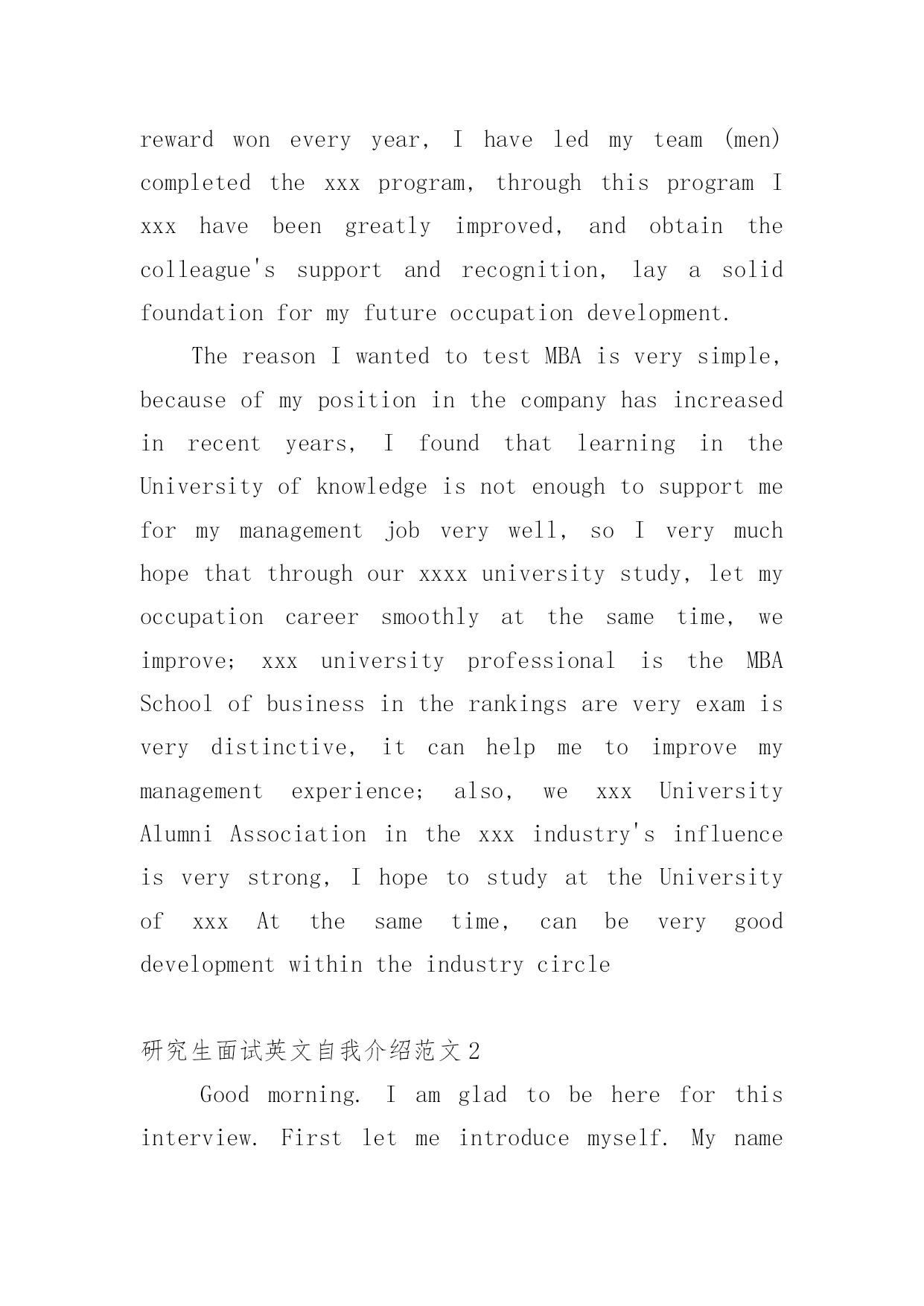 研究生面试英文自我介绍范文1研究生面试英文自我介绍范文来到一个完全陌生的环境,我们时常会需要作自我介绍,自我介绍是我们重新认识自己的'开始。到底应如何写自我介绍呢?下面是小编帮大家整理的研究生面试英文自我介绍范文,欢迎大家借鉴与参考,希望对大家有所帮助。研究生面试英文自我介绍范文1Dearteachers,goodmorning.Firstletmeintroducemyself.Mynameisxxx,xxyearsoldthisyear,fromxxx,20xxIgraduatedfromxxxUniversity,majoringinprofessionalxxx,thefirstcompanyaftergraduationIenteredthexxxxxxxcompany,myjobisxxxx,Iaminchargeofthiscompanyinxxxxx.InafewyearsIwonthexxxxupgrade,thesecondcompaniesinmyxxxxxxxcompany,myjobisxxxx,Iaminchargeofxxxxx,Ireachedthexxxxprojectinthecompanywithinafewyears,tohelpenterprisestoobtainxxxmillionThecompanyproducesthexxxforprofitorlong-termimpact.AlsoIinthecompanyduringthexxxmedal/rewardwoneveryyear,Ihaveledmyteam(men)completedthexxxprogram,throughthisprogramIxxxhavebeengreatlyimproved,andobtainthecolleague'ssupportandrecognition,layasolidfoundationformyfutureoccupationdevelopment.ThereasonIwantedtotestMBAisverysimple,becauseofmypositioninthecompanyhasincreasedinrecentyears,IfoundthatlearningintheUniversityofknowledgeisnotenoughtosupportmeformymanagementjobverywell,soIverymuchhopethatthroughourxxxxuniversitystudy,letmyoccupationcareersmoothlyatthesametime,weimprove;xxxuniversityprofessionalistheMBASchoolofbusinessintherankingsareveryexamisverydistinctive,itcanhelpmetoimprovemymanagementexperience;also,wexxxUniversityAlumniAssociationinthexxxindustry'sinfluenceisverystrong,IhopetostudyattheUniversityofxxxAtthesametime,canbeverygooddevelopmentwithintheindustrycircle研究生面试英文自我介绍范文2Goodmorning.Iamgladtobehereforthisinterview.Firstletmeintroducemyself.Mynameisxxx,24.Icomefromxxxxxx,thecapitalofxxxxxxxProvince.IgraduatedfromthexxxxxxdepartmentofxxxxxUniversityinJuly,20xx.InthepasttwoyearsIhavebeenprepareingforthepostgraduateexaminationwhileIhavebeenteachingxxxxxinNO.xxxxmiddleSchoolandIwasahead-teacherofaclassinjuniorgradetwo.NowallmyhardworkhasgotaresultsinceIhaveachancetobeinterviewbyyou.Iamopen-minded,quickinthoughtandveryfondofhistory.Inmysparetime,Ihavebroadinterestslikemanyotheryoungers.Ilikeread