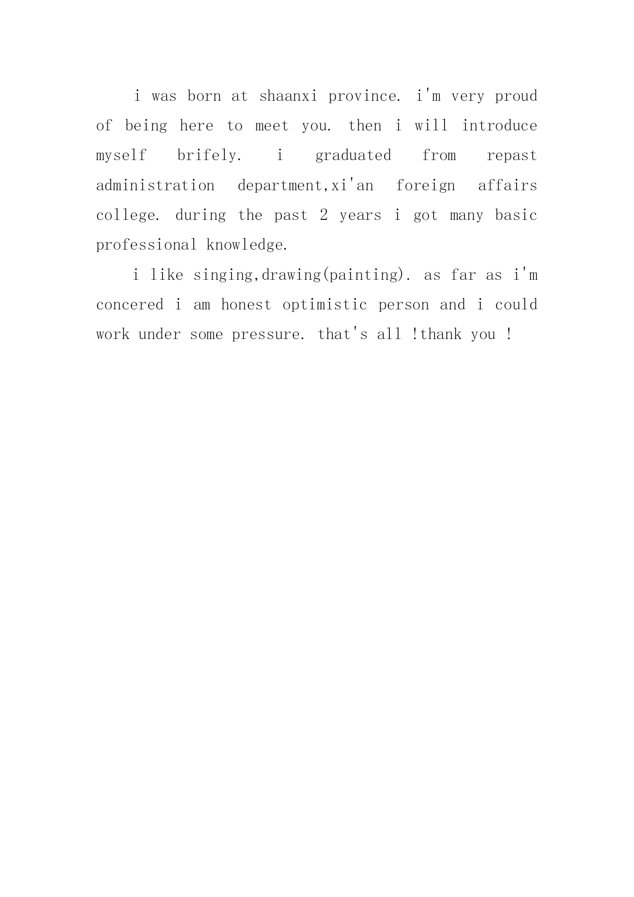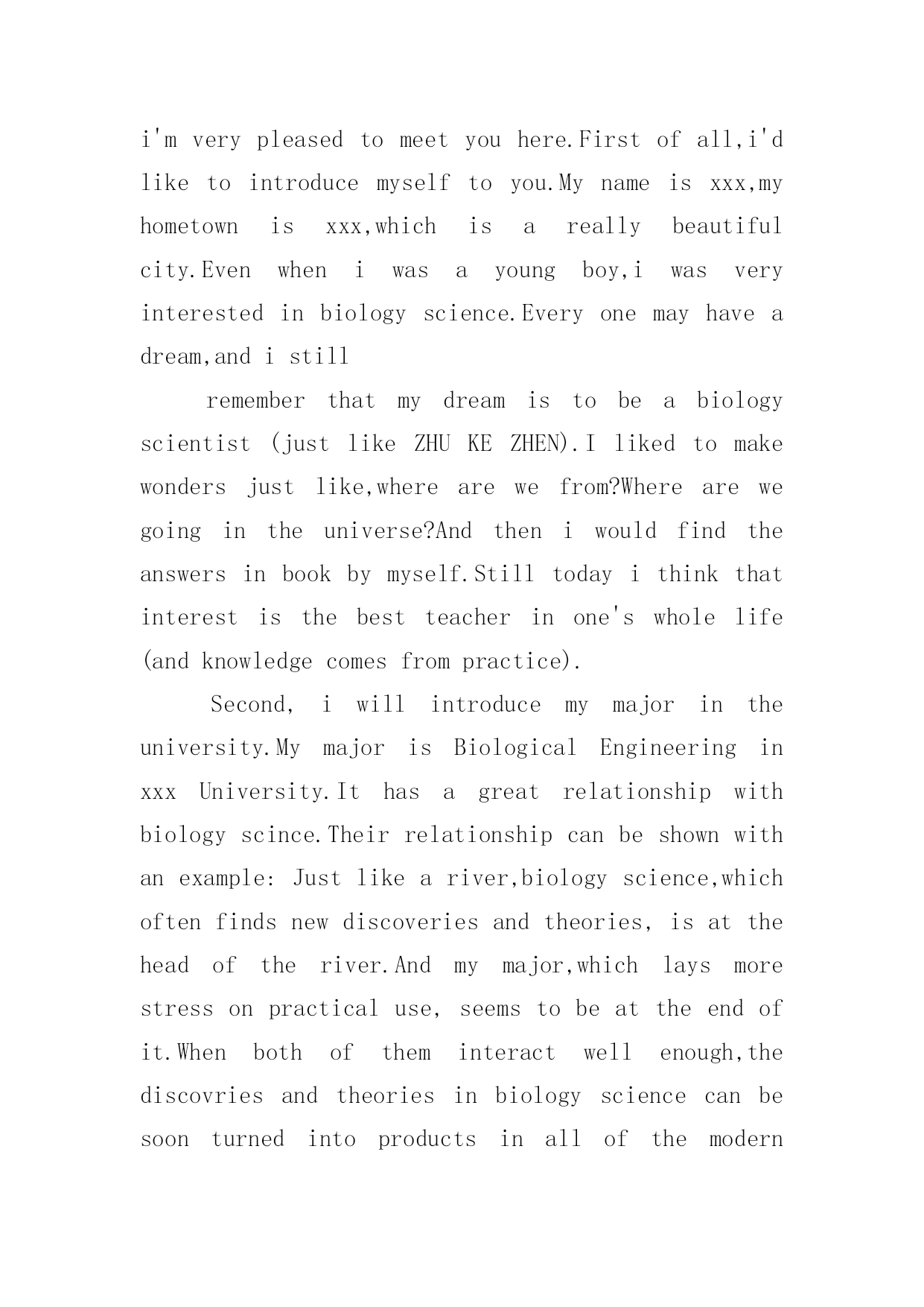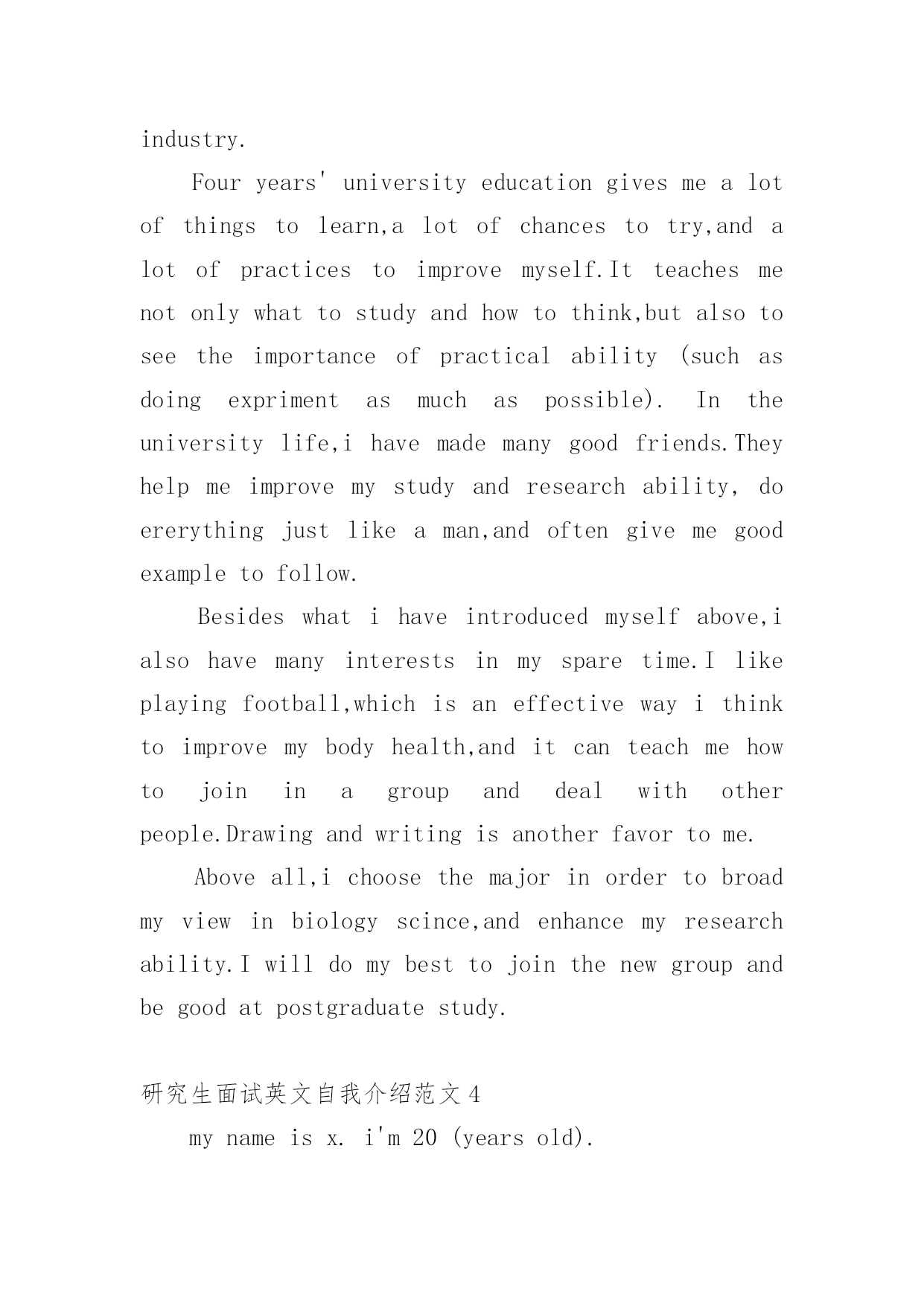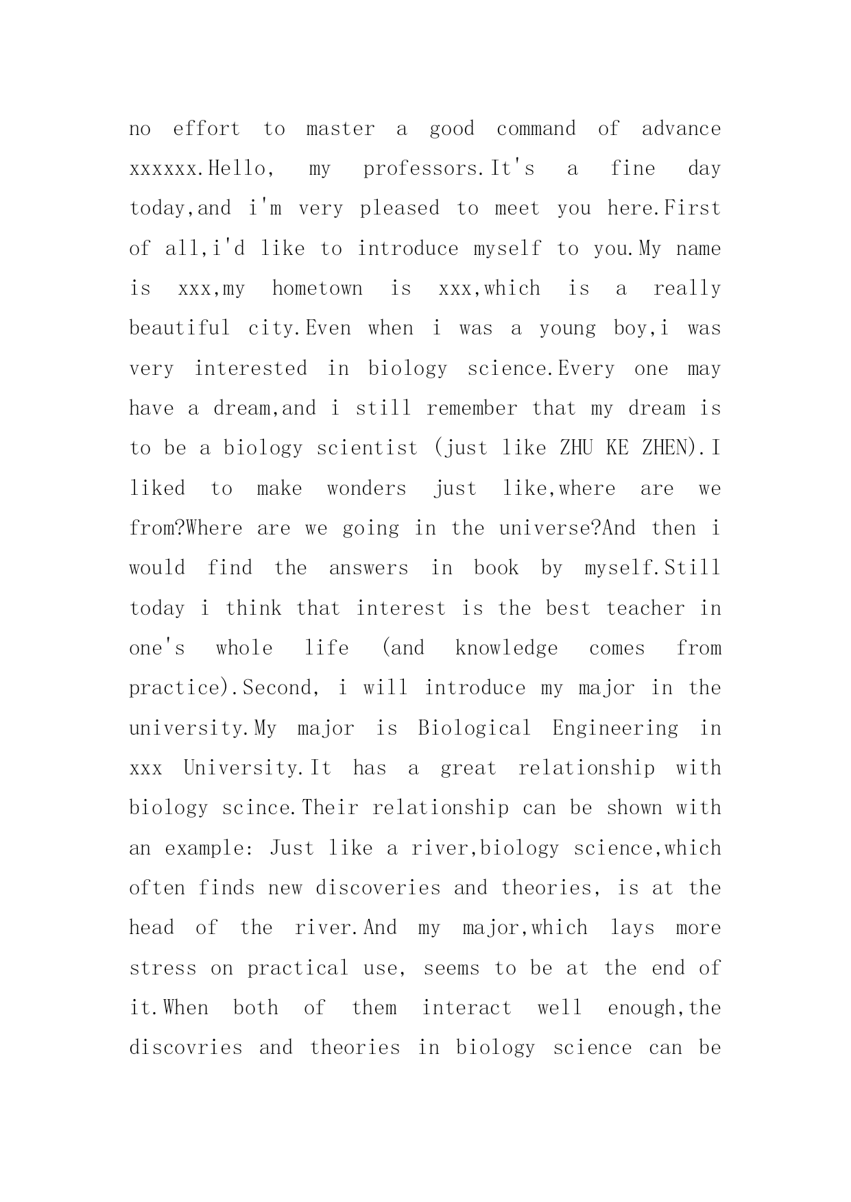 研究生面试英文自我介绍范文1研究生面试英文自我介绍范文来到一个完全陌生的环境,我们时常会需要作自我介绍,自我介绍是我们重新认识自己的'开始。到底应如何写自我介绍呢?下面是小编帮大家整理的研究生面试英文自我介绍范文,欢迎大家借鉴与参考,希望对大家有所帮助。研究生面试英文自我介绍范文1Dearteachers,goodmorning.Firstletmeintroducemyself.Mynameisxxx,xxyearsoldthisyear,fromxxx,20xxIgraduatedfromxxxUniversity,majoringinprofessionalxxx,thefirstcompanyaftergraduationIenteredthexxxxxxxcompany,myjobisxxxx,Iaminchargeofthiscompanyinxxxxx.InafewyearsIwonthexxxxupgrade,thesecondcompaniesinmyxxxxxxxcompany,myjobisxxxx,Iaminchargeofxxxxx,Ireachedthexxxxprojectinthecompanywithinafewyears,tohelpenterprisestoobtainxxxmillionThecompanyproducesthexxxforprofitorlong-termimpact.AlsoIinthecompanyduringthexxxmedal/rewardwoneveryyear,Ihaveledmyteam(men)completedthexxxprogram,throughthisprogramIxxxhavebeengreatlyimproved,andobtainthecolleague'ssupportandrecognition,layasolidfoundationformyfutureoccupationdevelopment.ThereasonIwantedtotestMBAisverysimple,becauseofmypositioninthecompanyhasincreasedinrecentyears,IfoundthatlearningintheUniversityofknowledgeisnotenoughtosupportmeformymanagementjobverywell,soIverymuchhopethatthroughourxxxxuniversitystudy,letmyoccupationcareersmoothlyatthesametime,weimprove;xxxuniversityprofessionalistheMBASchoolofbusinessintherankingsareveryexamisverydistinctive,itcanhelpmetoimprovemymanagementexperience;also,wexxxUniversityAlumniAssociationinthexxxindustry'sinfluenceisverystrong,IhopetostudyattheUniversityofxxxAtthesametime,canbeverygooddevelopmentwithintheindustrycircle研究生面试英文自我介绍范文2Goodmorning.Iamgladtobehereforthisinterview.Firstletmeintroducemyself.Mynameisxxx,24.Icomefromxxxxxx,thecapitalofxxxxxxxProvince.IgraduatedfromthexxxxxxdepartmentofxxxxxUniversityinJuly,20xx.InthepasttwoyearsIhavebeenprepareingforthepostgraduateexaminationwhileIhavebeenteachingxxxxxinNO.xxxxmiddleSchoolandIwasahead-teacherofaclassinjuniorgradetwo.NowallmyhardworkhasgotaresultsinceIhaveachancetobeinterviewbyyou.Iamopen-minded,quickinthoughtandveryfondofhistory.Inmysparetime,Ihavebroadinterestslikemanyotheryoungers.Ilikeread