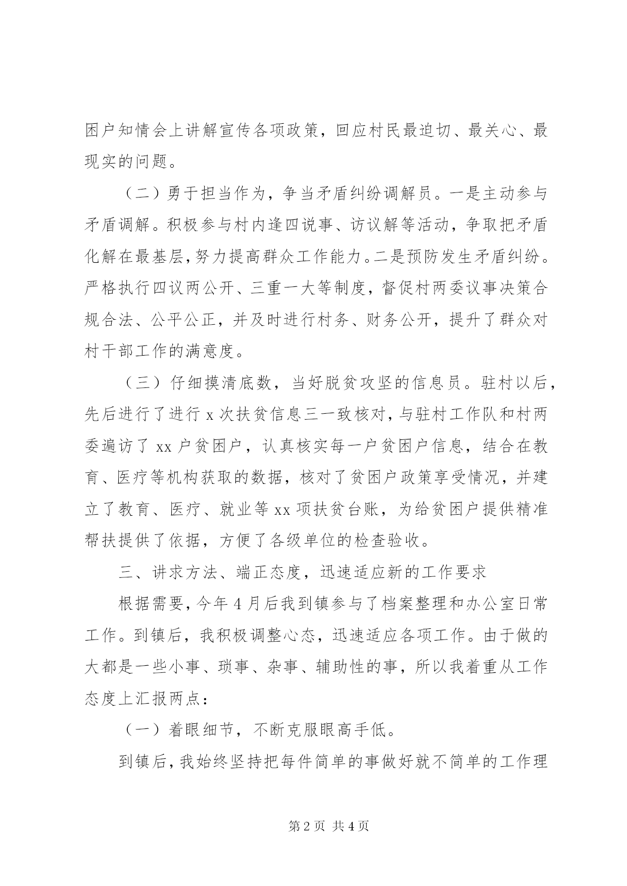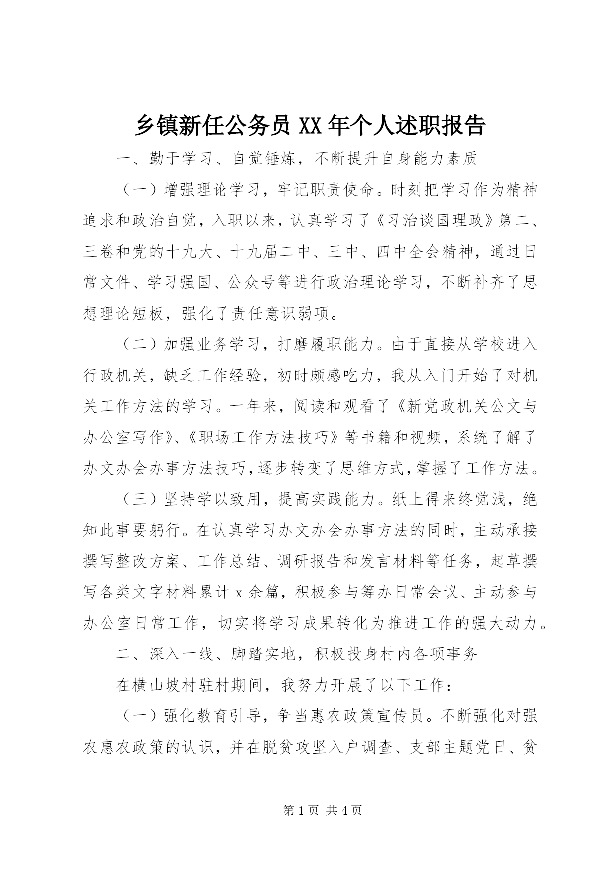 第PAGE\*Arabic\*MERGEFORMAT4页共NUMPAGES\*MERGEFORMAT4页乡镇新任公务员XX年个人述职报告一、勤于学习、自觉锤炼,不断提升自身能力素质(一)增强理论学习,牢记职责使命。时刻把学习作为精神追求和政治自觉,入职以来,认真学习了《习治谈国理政》第二、三卷和党的十九大、十九届二中、三中、四中全会精神,通过日常文件、学习强国、公众号等进行政治理论学习,不断补齐了思想理论短板,强化了责任意识弱项。(二)加强业务学习,打磨履职能力。由于直接从学校进入行政机关,缺乏工作经验,初时颇感吃力,我从入门开始了对机关工作方法的学习。一年来,阅读和观看了《新党政机关公文与办公室写作》、《职场工作方法技巧》等书籍和视频,系统了解了办文办会办事方法技巧,逐步转变了思维方式,掌握了工作方法。(三)坚持学以致用,提高实践能力。纸上得来终觉浅,绝知此事要躬行。在认真学习办文办会办事方法的同时,主动承接撰写整改方案、工作总结、调研报告和发言材料等任务,起草撰写各类文字材料累计x余篇,积极参与筹办日常会议、主动参与办公室日常工作,切实将学习成果转化为推进工作的强大动力。二、深入一线、脚踏实地,积极投身村内各项事务在横山坡村驻村期间,我努力开展了以下工作:(一)强化教育引导,争当惠农政策宣传员。不断强化对强农惠农政策的认识,并在脱贫攻坚入户调查、支部主题党日、贫困户知情会上讲解宣传各项政策,回应村民最迫切、最关心、最现实的问题。(二)勇于担当作为,争当矛盾纠纷调解员。一是主动参与矛盾调解。积极参与村内逢四说事、访议解等活动,争取把矛盾化解在最基层,努力提高群众工作能力。二是预防发生矛盾纠纷。严格执行四议两公开、三重一大等制度,督促村两委议事决策合规合法、公平公正,并及时进行村务、财务公开,提升了群众对村干部工作的满意度。(三)仔细摸清底数,当好脱贫攻坚的信息员。驻村以后,先后进行了进行x次扶贫信息三一致核对,与驻村工作队和村两委遍访了xx户贫困户,认真核实每一户贫困户信息,结合在教育、医疗等机构获取的数据,核对了贫困户政策享受情况,并建立了教育、医疗、就业等xx项扶贫台账,为给贫困户提供精准帮扶提供了依据,方便了各级单位的检查验收。三、讲求方法、端正态度,迅速适应新的工作要求根据需要,今年4月后我到镇参与了档案整理和办公室日常工作。到镇后,我积极调整心态,迅速适应各项工作。由于做的大都是一些小事、琐事、杂事、辅助性的事,所以我着重从工作态度上汇报两点:(一)着眼细节,不断克服眼高手低。到镇后,我始终坚持把每件简单的事做好就不简单的工作理念,严肃认真的对待每一项工作。在档案整理中,进行了分类、扫描、准备验收材料等工作,力求规范、易查,方便了镇上各部门查找档案。对于领导交办的材料撰写、沟通联络、办会办事等工作,把握细节,坚持不推不拖,不等不靠,立刻就办,加班加点,努力提高办事效率,确保事事有回音、件件有着落。(二)注重总结,不断追求精益求精。君子博学而日参省乎己,则智明而行无过矣。我坚持把定期总结、查找不足、及时改正当成改进工作的有效途径,建立工作失误备忘录,对同样的错误决不犯第二次。对于文字材料,我写完后进行再三打磨,力求精品;在沟通联络中,认真组织协调,力求不偏不倚;在办会办事中,再三思考,力求高效到位,通过不断总结检查,努力培养了一丝不苟,兢兢业业的做事风格。四、认识不足、树立信心,扬帆起航再出发一年的工作,帮助我成长不少,在此,特别要感谢这一年当中领导的关怀与培养,同事的支持与帮助,也感谢领导能给予一次发言的机会。同时,我也认识到自己还有诸多不足。一是应对复杂工作的方式方法还不够灵活;二是自身能力与领导要求还有差距。路漫漫其修远兮,吾将上下而求索,在今后的工作中,我将把学习作为一个永恒的课题,埋头苦干、攻坚克难,进一步提高自身综合素质,切实服从组织的各项安排,认真完成领导交办的各项任务,努力成为一个有素质、能担当、靠得住的下属和同事。