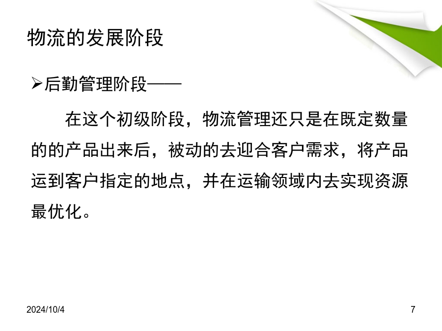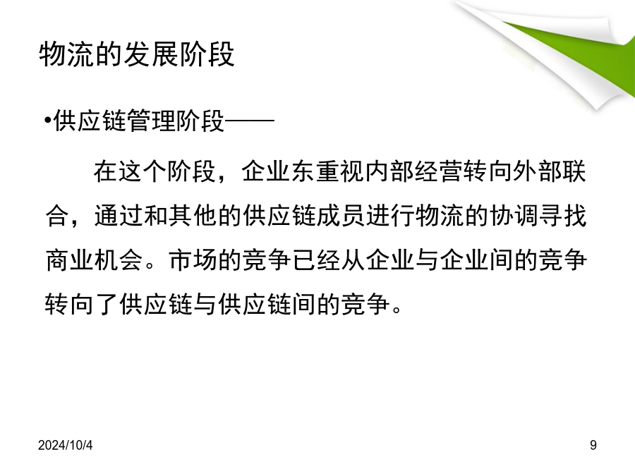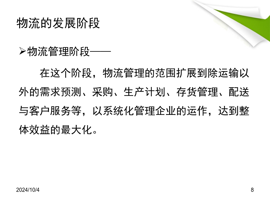 第6章现代物流工程与管理第6章现代物流工程与管理物流的定义日本工业标准对物流的定义——物流是将实物从供给者物流性地移动到用户这一过程的活动,一般包括输送、保管、装卸、包装以及与其相关的情报等各种活动。物流的定义我国的物流定义——物流是物品从供应地到接受地的实体流动过程,根据客户需要,将运输、储存、装卸、搬运、包装、流通加工、配送、信息处理等功能有机结合来实现用户要求的过程。物流的发展阶段物流的发展阶段供应链管理阶段——在这个阶段,企业东重视内部经营转向外部联合,通过和其他的供应链成员进行物流的协调寻找商业机会。市场的竞争已经从企业与企业间的竞争转向了供应链与供应链间的竞争。物流在国内外的发展现状物流在国内外的发展现状我国物流的发展现状现代物流的发展趋势现代物流的发展趋势(3)仓储、运输的现代化与综合化趋势仓储现代化要求实现高度机械化、自动化和标准化,和组织起高效的人、机、物的系统;运输则要求建立起铁路、公路、水路、航空与管道的综合运输体系。二者匹配是现代物流的必备条件。(4)协作物流协作物流,从企业内部来讲,它是对信息、运输、存货管理、仓储、物料供应、搬运、包装、实物配送等分散的物流作业领域的综合协调管理。(5)服务化物流、绿色物流和逆向物流将是现代物流发展主题服务化物流源于人们收入的提高和消费的多样化、全方位化的发展趋势。绿色物流注重生态环境,减少物流活动对环境造成的危害,促进经济和消费生活的健康发展。逆向物流是设计和建立一个闭环的循环的物流系统,使其达到传统物流末段的废旧物质能回流到正常的物流过程中来,是一种全新的物流形态。物流管理物流管理的主要内容物流管理的过程物流管理的功能物流管理的策略