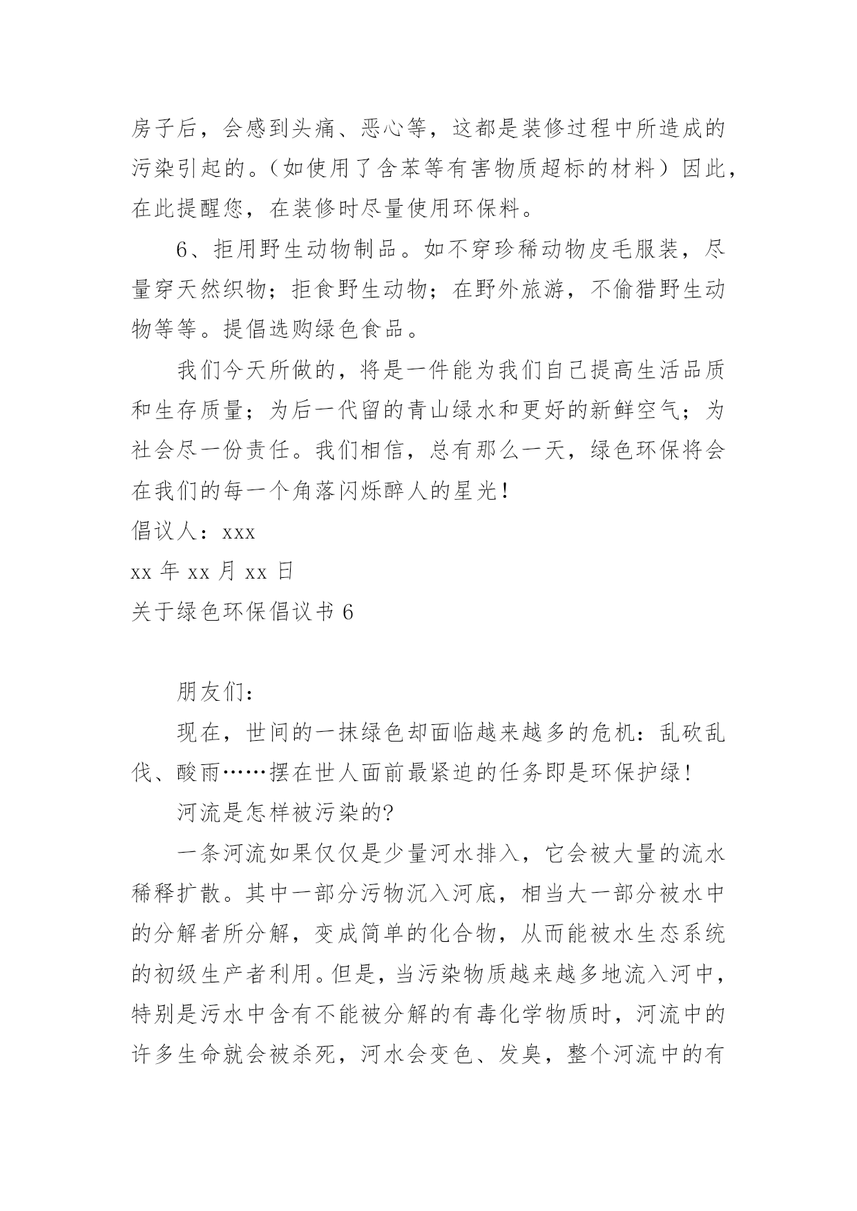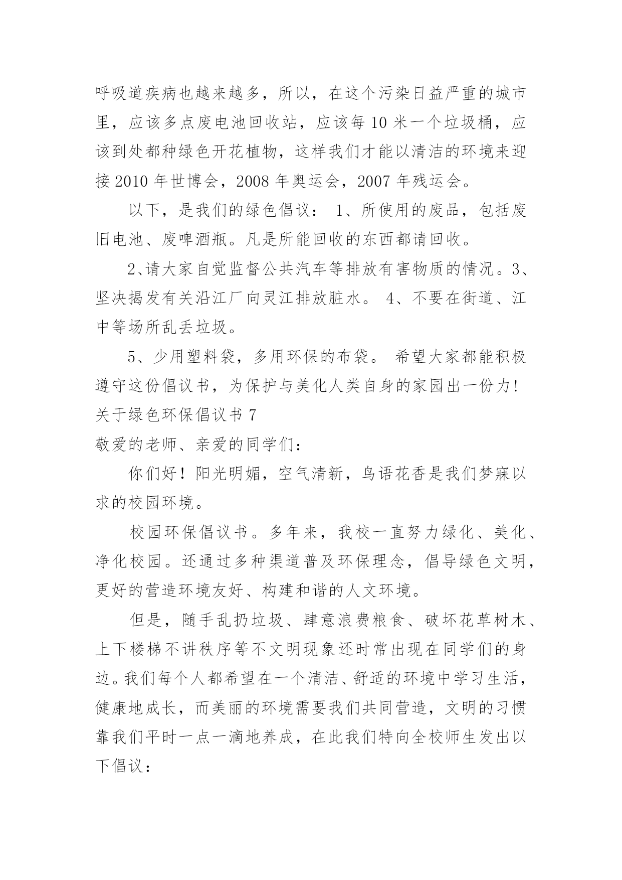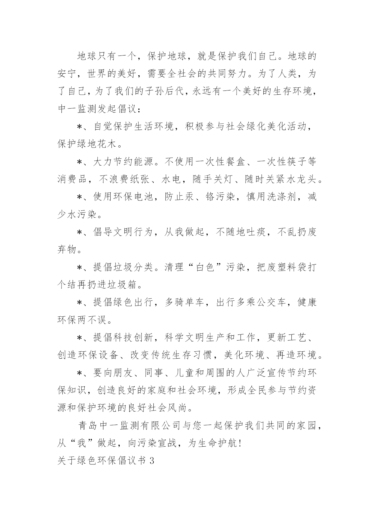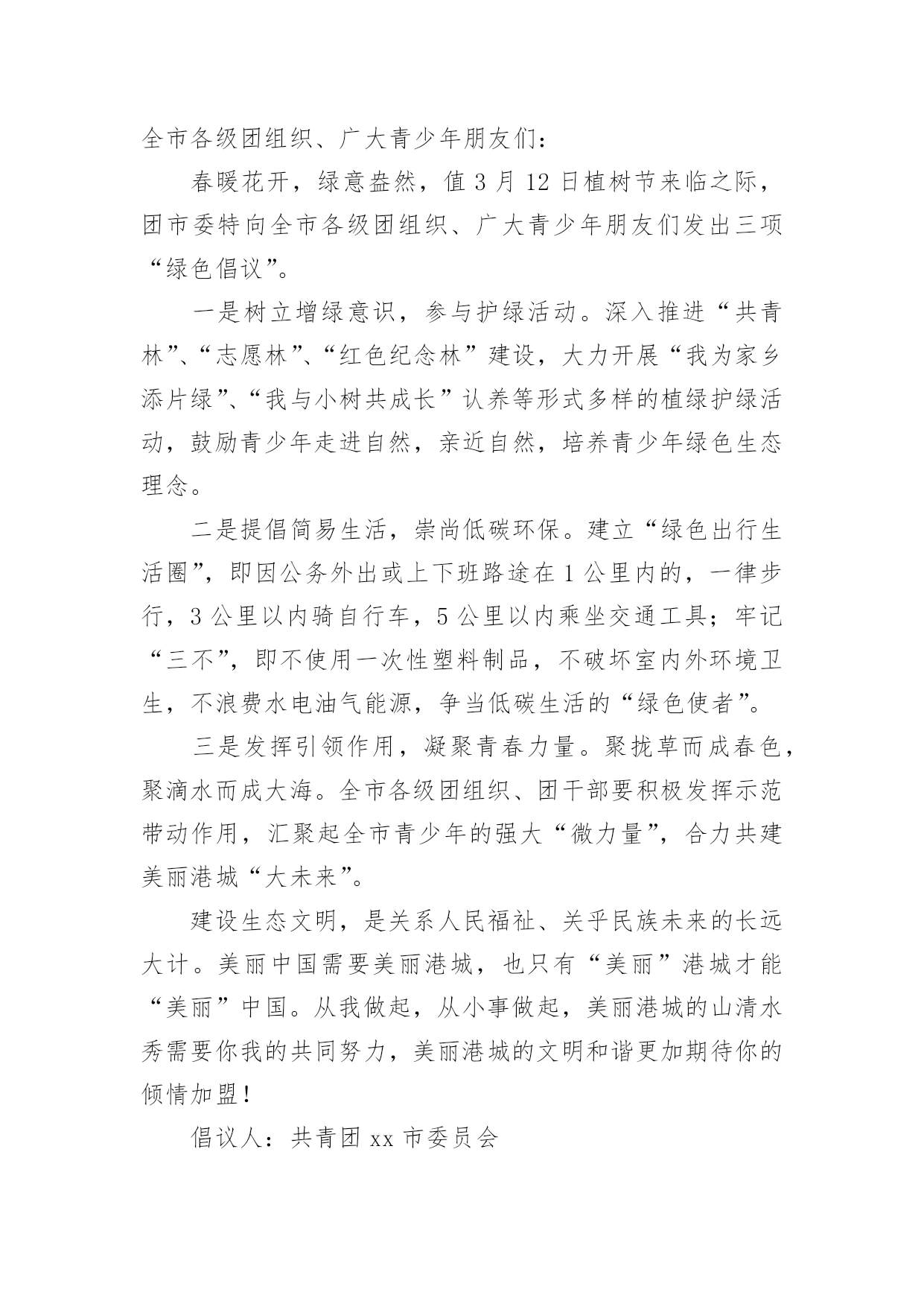 绿色环保倡议书关于绿色环保倡议书现如今,倡议书与我们的生活息息相关,倡议书有利于倡议者交代清楚倡议活动的原因,以及当时的各种背景事实。那要怎么写好倡议书呢?下面是小编为大家收集的关于绿色环保倡议书,欢迎大家借鉴与参考,希望对大家有所帮助。关于绿色环保倡议书1亲爱的老师、同学们:在全球环境问题日趋严重的今天,尤其是被称为环保头号大敌的“白色污染”,已成为影响城市乡村环境和人们生活的一道难题。环境保护正变得越来越紧迫,不加限制的环境污染,将会导致环境污染不断蔓延扩散。为了更清新的空气,更清澈的水源,更洁净的蓝天白云,任何一个谋求长远发展的国家,任何一个有责任心的市民,都不能再忍受由不文明的生活方式造成对环境的污染。为了我们的地球能够重返绿色、为了我们日日夜夜生活的城市,让我们立即行动起来吧!保护环境,消灭污染,从点滴做起,从拒绝使用塑料袋做起。所谓“白色污染”,是指主要包括塑料袋、塑料快餐盒、餐具、杯盘、塑料包装等废弃的不易降解的塑料对环境的污染。许多塑料袋成分是聚氯乙烯,如果焚烧,焚烧产生的气体会污染大气,由于含氯,有可能生成二恶英这样的毒性更大的污染物。如果填埋,由于塑料袋的成分都很稳定,所以很难降解,混在土壤中将对土壤造成长期影响。目前,全国每年塑料废弃量多达1000余万吨。不知从何时开始,人们还经常被眼前出现的一幕幕情景所震惊:铁路沿线两旁遍地都是盒盒袋袋,一眼望不到边际,极象一座白色长城;隆冬季节,光秃秃的树枝上挂满了塑料袋、塑料薄膜,被狂风吹得飘飘扬扬,极不雅观,车站、码头、街道的一次性塑料饭盒、塑料袋遍地开花,令人触目惊心,景区、农田、河湖海溪里的废塑料碎片星罗棋布,随处可见。所有这一幕幕的情景预示着“白色污染”已到了让人不能再忍受的地步了。亲爱的老师、同学,为了绿色地球,为了我们自己,为了子孙后代,为了美好明天,我们有义务、有责任保护我们的地球,我们必须立即行动起来,制止“白色污染”,拒绝塑料制品,使用可降解产品,共同美化我们赖以生存的空间。为此,我们倡议:正确认识“白色污染”的危害,减少塑料袋的使用,开展回收利用,出门购物提前准备环保袋或者购物篮;用过的塑料袋不乱扔,整理在家循环使用;不使用一次性塑料制品,提倡使用可降解环保用品;开展垃圾分类回收,有效控制日常生活中产生的污染。老师同学们,为了山,为了水,为了空气,为了森林,为了我们共同生存的生态环境,让我们携起手来,从我做起,从现在做起。相信只要我们都参与进来,“白色污染”一定会离我们越来越远,我们的家园最终将回归她神圣的纯洁!此致敬礼!倡议人:xxxxx年xx月xx日关于绿色环保倡议书2朋友们:****年*月*日为“世界环境日”,中国确定主题为“向污染宣战”,向污染宣战的主攻方向,是深化大气污染防治,强化水污染防治,抓好土壤污染治理,加大重金属、化学品和危险废物污染防治力度,深化工业污染防治。人类生活的地球已有**亿年的历史,地球丰饶的'资源和多姿多彩的自然景观为人类生存与发展提供了必不可少的条件。人类在漫长的历史发展过程中,依靠开发利用自然资源繁衍生息。在增强生产力、提高生活水平的同时,对地球的索取日益变本加厉,不可再生的资源在迅速消耗,大片原始森林、矿产资源消耗巨大,以及工业化的快速发展,也影响着周围的环境,废水、废气、废物的排放,使地球上的水源、空气和土地遭到了严重的污染。造成生态系统失衡,环境恶化,灾害频发,水土流失加剧,人类面临着巨大挑战。所有这一切都在向人类发出警示:人类在破坏地球环境的同时,也在毁灭着自己。人类只有一个地球,尊重地球就是尊重生命,拯救地球就是拯救未来。地球只有一个,保护地球,就是保护我们自己。地球的安宁,世界的美好,需要全社会的共同努力。为了人类,为了自己,为了我们的子孙后代,永远有一个美好的生存环境,中一监测发起倡议:*、自觉保护生活环境,积极参与社会绿化美化活动,保护绿地花木。*、大力节约能源。不使用一次性餐盒、一次性筷子等消费品,不浪费纸张、水电,随手关灯、随时关紧水龙头。*、使用环保电池,防止汞、铬污染,慎用洗涤剂,减少水污染。*、倡导文明行为,从我做起,不随地吐痰,不乱扔废弃物。*、提倡垃圾分类。清理“白色”污染,把废塑料袋打个结再扔进垃圾箱。*、提倡绿色出行,多骑单车,出行多乘公交车,健康环保两不误。*、提倡科技创新,科学文明生产和工作,更新工艺、创造环保设备、改变传统生存习惯,美化环境、再造环境。*、要向朋友、同事、儿童和周围的人广泛宣传节约环保知识,创造良好的家庭和社会环境,形成全民参与节约资源和保护环境的良好社会风尚。青岛中一监测有限公司与您一起保护我们共同的家园,从“我”做起,向污染宣战,为生命护航!关于绿色环保倡议书3全市各级团组织、广大青少年朋友们:春暖花开,绿意盎然,值3月12日植树节来临之际,团市委