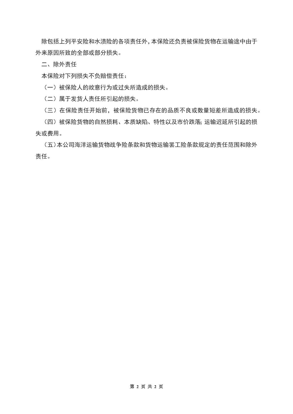 第PAGE\*MERGEFORMAT2页共NUMPAGES\*MERGEFORMAT2页海洋运输货物保险条款一、责任范围本保险分为平安险、水渍险及一切险三种。被保险货物遭受损失时,本保险按照保险单上订明承保险别的条款规定,负赔偿责任。(一)平安险本保险负责赔偿:1、被保险货物在运输途中由于恶劣气候、雷电、海啸、地震、洪水自然灾害造成整批货物的全部损失或推定全损。当被保险人要求赔付推定全损时,须将受损货物及其权利委付给保险公司。被保险货物用驳船运往或运离海轮的,每一驳船所装的货物可视作一个整批。推定全损是指被保险货物的实际全损已经不可避免,或者恢复、修复受损货物以及运送货物到原订目的地的费用超过该目的地的货物价值。2、由于运输工具遭受搁浅、触礁、沉没、互撞、与流冰或其他物体碰撞以及失火、爆炸意外事故造成货物的全部或部份损失。3、在运输工具已经发生搁浅、触礁、沉没、焚毁意外事故的情况下,货物在此前后又在海上遭受恶劣气候、雷电、海啸等自然灾害所造成的部份损失。4、在装卸或转运时由于一件或数件整件货物落海造成的全部或部份损失。5、被保险人对遭受承保责任内危险的货物采取抢救、防止或减少货损的措施而支付的合理费用,但以不超过该批被救货物的保险金额为限。6、运输工具遭遇海难后,在避难港由于卸货所引起的损失以及在中途港,避难港由于卸货,存仓以及运送货物所产生的特别费用。7、共同海损的牺牲、分摊和救助费用。8、运输契约订有“船舶互撞责任”条款,根据该条款规定应由货方偿还船方的损失。(二)水渍险除包括上列平安险的各项责任外,本保险还负责被保险货物由于恶劣气候、雷电、海啸、地震、洪水自然灾害所造成的部份损失。(三)一切险除包括上列平安险和水渍险的各项责任外,本保险还负责被保险货物在运输途中由于外来原因所致的全部或部分损失。二、除外责任本保险对下列损失不负赔偿责任:(一)被保险人的故意行为或过失所造成的损失。(二)属于发货人责任所引起的损失。(三)在保险责任开始前,被保险货物已存在的品质不良或数量短差所造成的损失。(四)被保险货物的自然损耗、本质缺陷、特性以及市价跌落;运输迟延所引起的损失或费用。(五)本公司海洋运输货物战争险条款和货物运输罢工险条款规定的责任范围和除外责任。