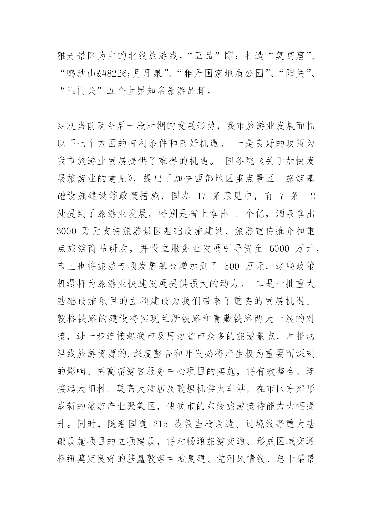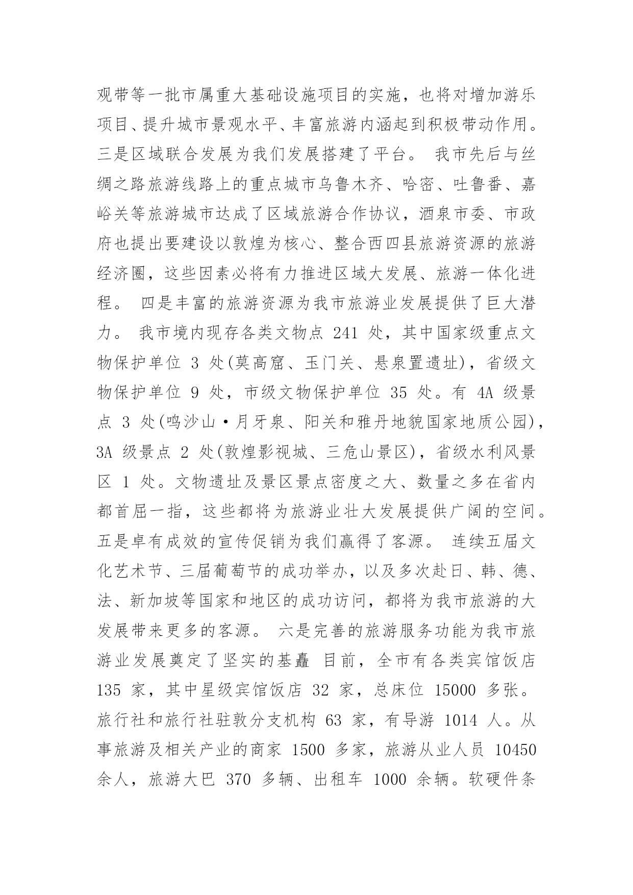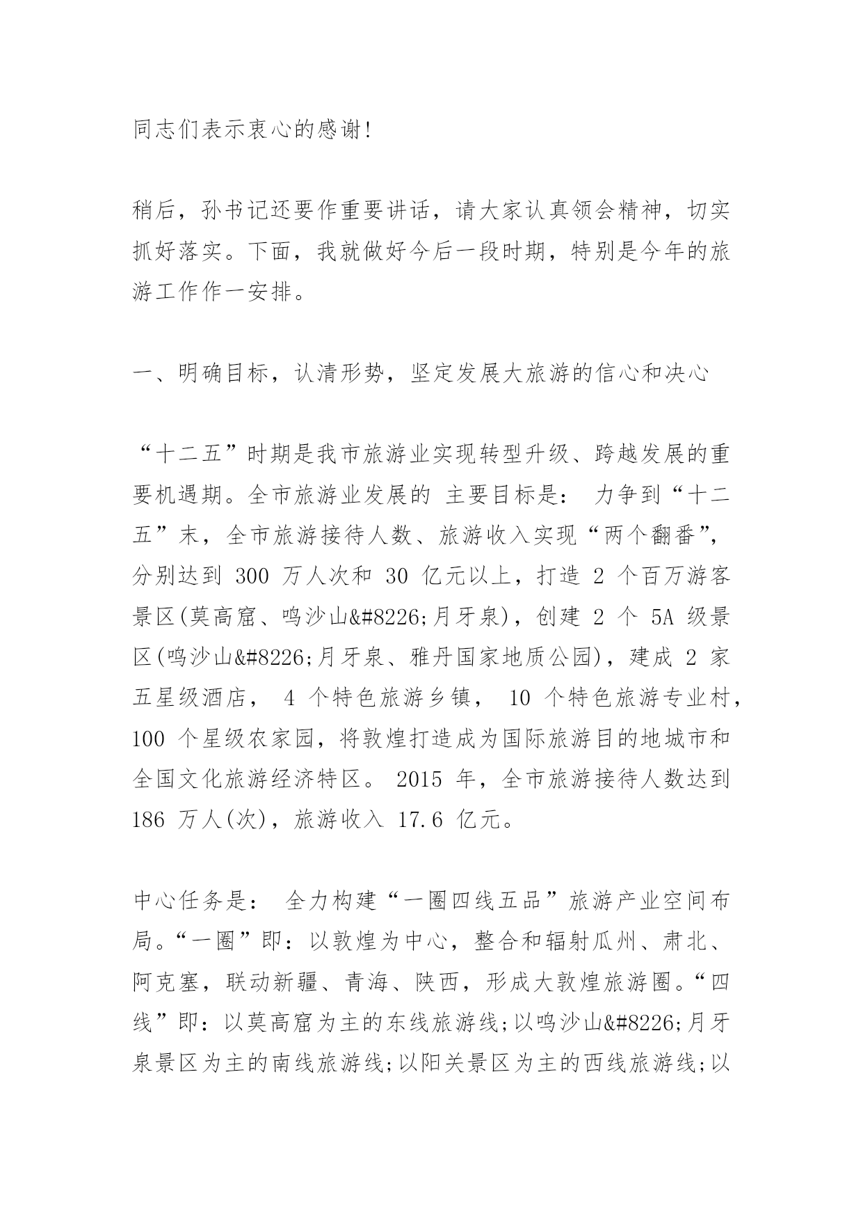 旅游工作讲话旅游工作讲话同志们:今天会议的主要任务是贯彻落实盛市旅游工作会议精神,全面分析当前旅游形势,安排部署今年的旅游工作和“我爱敦煌”教育活动。刚才,市委、市政府对全市旅游-行业服务先进集体和先进个人进行了表彰奖励,首先,对获奖的单位和个人我们再一次表示热烈的祝贺!“十一五”期间,我市紧紧围绕“三城一基地”建设目标,依托旅游资源优势,加大宣传促销,加强基础建设,强化市场管理,旅游业实现了健康快速发展。五年来,全市累计接待中外游客623.35万人(次),比“十五”期间增加272.12万人(次),年均增长8.52%;累计实现旅游收入41.18亿元,比“十五”期间增加27.70亿元,年均增长29.39%。2010年全市旅游接待人数151.04万人(次),旅游收入14.05亿元,分别比“十五”末增长50%和2.57倍。我市先后荣获“感动世界品牌城市”、“国家旅游名片城市”、“中国最具国际影响力旅游目的地”、“国际知名旅游目的地”等荣誉称号。这些成绩的取得,是市委正确领导的结果,是全市人民共同努力的结果,更是在座各位同志们辛勤努力的结果。在此,我们对为旅游业发展做出积极贡献的同志们表示衷心的感谢!稍后,孙书记还要作重要讲话,请大家认真领会精神,切实抓好落实。下面,我就做好今后一段时期,特别是今年的旅游工作作一安排。一、明确目标,认清形势,坚定发展大旅游的信心和决心“十二五”时期是我市旅游业实现转型升级、跨越发展的重要机遇期。全市旅游业发展的主要目标是:力争到“十二五”末,全市旅游接待人数、旅游收入实现“两个翻番”,分别达到300万人次和30亿元以上,打造2个百万游客景区(莫高窟、鸣沙山•月牙泉),创建2个5A级景区(鸣沙山•月牙泉、雅丹国家地质公园),建成2家五星级酒店,4个特色旅游乡镇,10个特色旅游专业村,100个星级农家园,将敦煌打造成为国际旅游目的地城市和全国文化旅游经济特区。2015年,全市旅游接待人数达到186万人(次),旅游收入17.6亿元。中心任务是:全力构建“一圈四线五品”旅游产业空间布局。“一圈”即:以敦煌为中心,整合和辐射瓜州、肃北、阿克塞,联动新疆、青海、陕西,形成大敦煌旅游圈。“四线”即:以莫高窟为主的东线旅游线;以鸣沙山•月牙泉景区为主的南线旅游线;以阳关景区为主的西线旅游线;以雅丹景区为主的北线旅游线。“五品”即:打造“莫高窟”、“鸣沙山•月牙泉”、“雅丹国家地质公园”、“阳关”、“玉门关”五个世界知名旅游品牌。纵观当前及今后一段时期的发展形势,我市旅游业发展面临以下七个方面的有利条件和良好机遇。一是良好的政策为我市旅游业发展提供了难得的机遇。国务院《关于加快发展旅游业的意见》,提出了加快西部地区重点景区、旅游基础设施建设等政策措施,国办47条意见中,有7条12处提到了旅游业发展,特别是省上拿出1个亿,酒泉拿出3000万元支持旅游景区基础设施建设、旅游宣传推介和重点旅游商品研发,并设立服务业发展引导资金6000万元,市上也将旅游专项发展基金增加到了500万元,这些政策机遇将为旅游业快速发展提供强大的动力。二是一批重大基础设施项目的立项建设为我们带来了重要的发展机遇。敦格铁路的建设将实现兰新铁路和青藏铁路两大干线的对接,进一步连接起我市及周边省市众多的旅游景点,对推动沿线旅游资源的.深度整合和开发必将产生极为重要而深刻的影响。莫高窟游客服务中心项目的实施,将有效整合、连接起太阳村、莫高大酒店及敦煌机尝火车站,在市区东郊形成新的旅游产业聚集区,使我市的东线旅游接待能力大幅提升。同时,随着国道215线敦当段改造、过境线等重大基础设施项目的立项建设,将对畅通旅游交通、形成区域交通枢纽奠定良好的基矗敦煌古城复建、党河风情线、总干渠景观带等一批市属重大基础设施项目的实施,也将对增加游乐项目、提升城市景观水平、丰富旅游内涵起到积极带动作用。三是区域联合发展为我们发展搭建了平台。我市先后与丝绸之路旅游线路上的重点城市乌鲁木齐、哈密、吐鲁番、嘉峪关等旅游城市达成了区域旅游合作协议,酒泉市委、市政府也提出要建设以敦煌为核心、整合西四县旅游资源的旅游经济圈,这些因素必将有力推进区域大发展、旅游一体化进程。四是丰富的旅游资源为我市旅游业发展提供了巨大潜力。我市境内现存各类文物点241处,其中国家级重点文物保护单位3处(莫高窟、玉门关、悬泉置遗址),省级文物保护单位9处,市级文物保护单位35处。有4A级景点3处(鸣沙山·月牙泉、阳关和雅丹地貌国家地质公园),3A级景点2处(敦煌影视城、三危山景区),省级水利风景区1处。文物遗址及景区景点密度之大、数量之多在省内都首屈一指,这些都将为旅游业壮大发展提供广阔的空间。五是卓有成效的宣传促销为我们赢得了客源。连续五届文化艺术节、三届葡