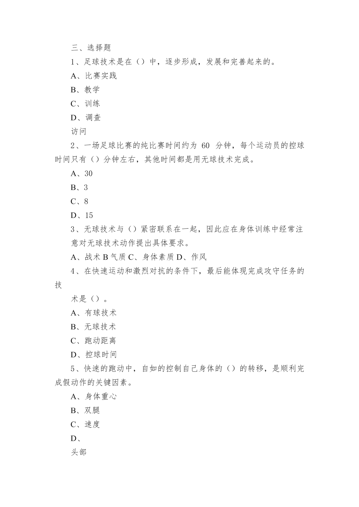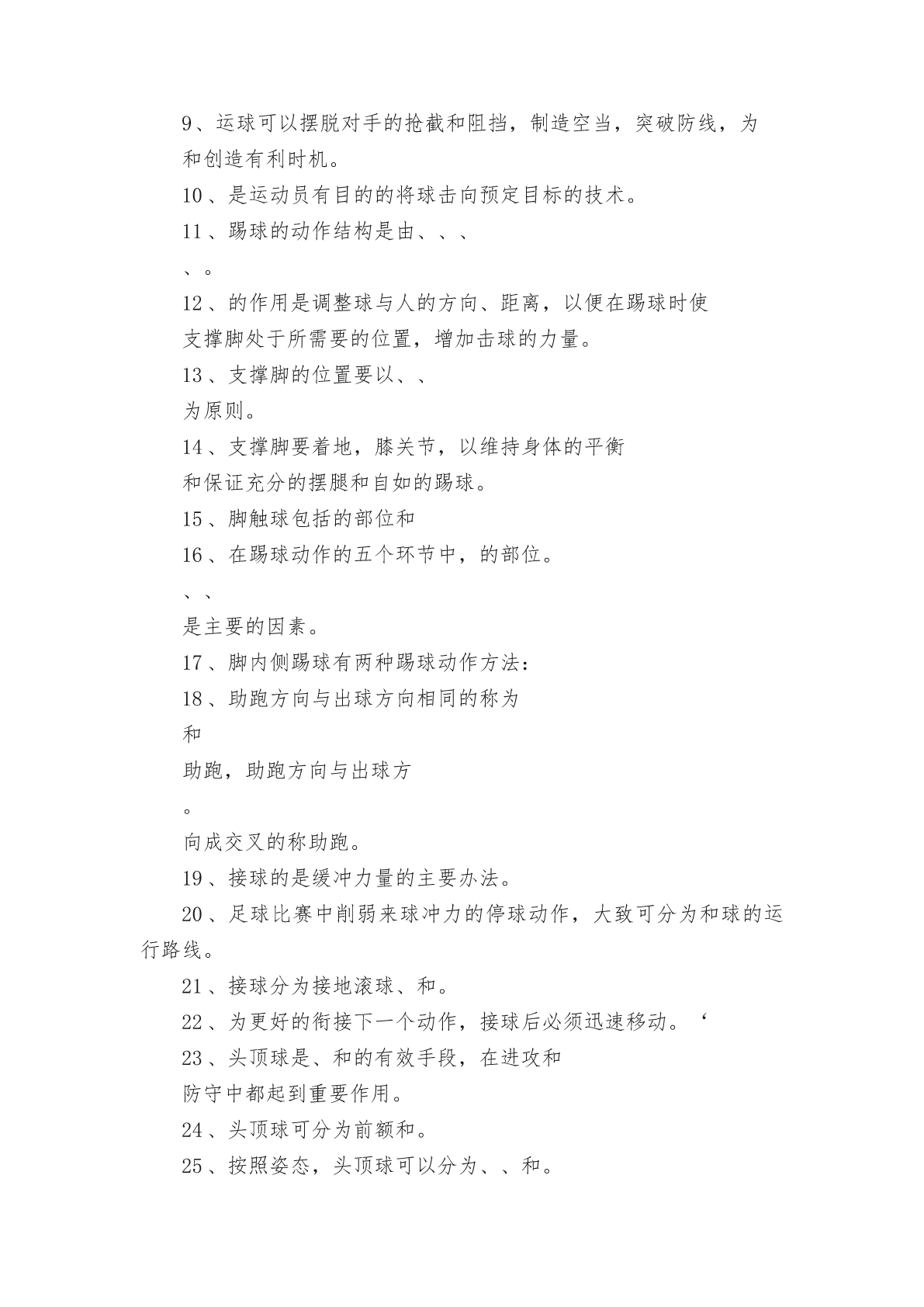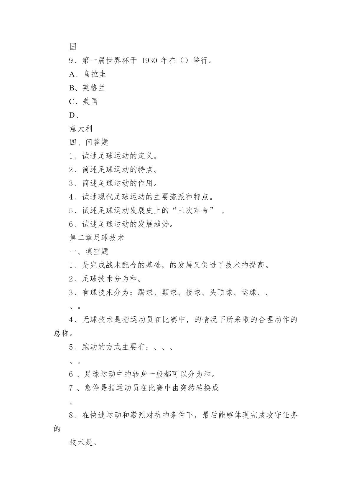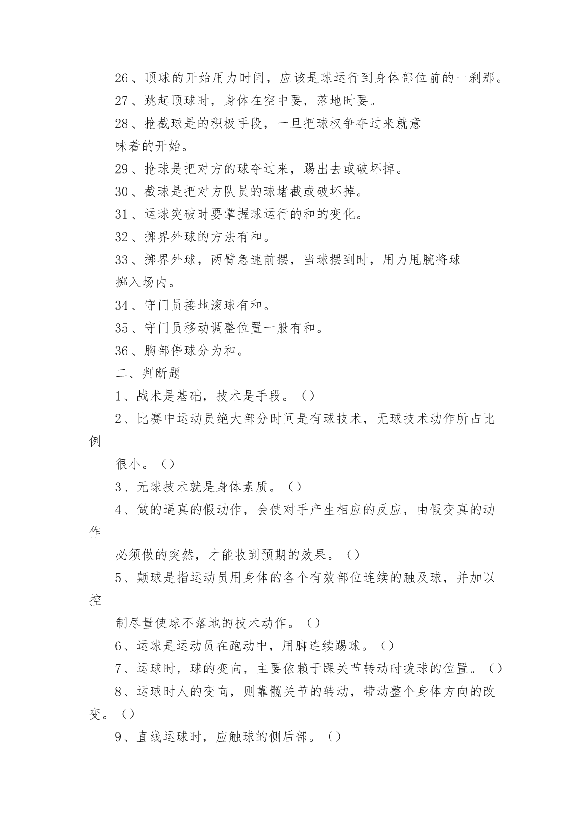 体育足球理论考试题及答案(2)作业与习题第一章足球运动概述一、填空题1、足球运动是以支配球为主,两个队进行的一项体育运动。2、我国古代称足球游戏为或。3、现代足球运动于年月日在诞生。4、年在届国际足联代表大会上,恢复中华人民共和国在国际足联的合法地位。5、年月日,成立了世界上第一个足球运动组织,。6、年月日,在由、、、、、、足球协会创立了国际足球联合会,法文缩写为。7、国际足联于年在举行会议,决定举行世界足球锦标赛,每年举行一届。8、第一届世界足球锦标赛于年在举行。9、从1896年现代奥运会诞生以来,除了因世界大战未举行奥运会外,只有届奥运会没有足球比赛项目,但第届奥运会才将足球项目列为正式比赛项目。10、第一届世界女子足球锦标赛于年在举行。11、在奥运会,将女子足球比赛列为奥运会正式比赛项目。12、足球比赛是以决定比赛胜负。二、判断题1、目前足球国际性组织是国际足球理事会。()2、1863年10月26日,英格兰足球协会成立,这是现代足球运动的诞生日。()3、1904年5月21日在巴黎成立的国际足球联合会是国际性组织,它是奥林匹克委员会的一个单项体育组织。()4、蹴鞠就是踢球的意思。()5、灌气的球我国公元7世纪的唐代就有了,而英国11世纪才有。()6、从第10届奥运会起足球才被列为正式比赛项目。()7、世界杯足球赛不分业余队和职业队,每个国家都可以参加一个队比赛,所以是世界上最高水平的足球赛。()8、世界上第一部足球规则共有24条。()9、我国的足球运动1957年至1978年一直被排斥在国际足球的大门外,直到1979年才恢复我国在国际足联的合法地位。)(10、欧洲力量派、拉丁技术派都属于能攻善守的踢法。()11、每届奥运会都举行了足球比赛。()三、选择题1、古代足球游戏起源于()。A、英国B、日本C、巴西D、中国2、现代足球运动起源于()。A、中国B、印度C、英国D、巴西3、目前国际性足球组织是()。A、国际足球理事会B、国际足球联合会C、国际足球常委会D、国际足球协会4、国际足球联合会是()的单项体育组织。A、奥林匹克委员会B、世界体育总会C、国际体育协会D、世界体育研究会5、我国古代足球游戏的名称为()。A、蹴鞠B、踢球C、足球D、打球6、1912年第)届奥运会起,足球比赛被列为正式比赛项目。(A、2B、3C、4D、57、世界上规模最大,水平最高、影响最大的足球比赛是()。A、奥运会足球赛B、世界杯足球赛C、世界青年锦标赛D丰田杯足球赛8、1863年,()足球协会制定了世界上最早的第一部足球竞赛规则。A、苏格兰B、北爱尔兰C、英格兰D、德国9、第一届世界杯于1930年在()举行。A、乌拉圭B、英格兰C、美国D、意大利四、问答题1、试述足球运动的定义。2、简述足球运动的特点。3、简述足球运动的作用。4、试述现代足球运动的主要流派和特点。5、试述足球运动发展史上的“三次革命”。6、试述足球运动的发展趋势。第二章足球技术一、填空题1、是完成战术配合的基础,的发展又促进了技术的提高。2、足球技术分为和。3、有球技术分为:踢球、颠球、接球、头顶球、运球、、、。4、无球技术是指运动员在比赛中,的情况下所采取的合理动作的总称。5、跑动的方式主要有:、、、、。6、足球运动中的转身一般都可以分为和。7、急停是指运动员在比赛中由突然转换成。8、在快速运动和激烈对抗的条件下,最后能够体现完成攻守任务的技术是。9、运球可以摆脱对手的抢截和阻挡,制造空当,突破防线,为和创造有利时机。10、是运动员有目的的将球击向预定目标的技术。11、踢球的动作结构是由、、、、。12、的作用是调整球与人的方向、距离,以便在踢球时使支撑脚处于所需要的位置,增加击球的力量。13、支撑脚的位置要以、、为原则。14、支撑脚要着地,膝关节,以维持身体的平衡和保证充分的摆腿和自如的踢球。15、脚触球包括的部位和16、在踢球动作的五个环节中,的部位。、、是主要的因素。17、脚内侧踢球有两种踢球动作方法:18、助跑方向与出球方向相同的称为和助跑,助跑方向与出球方。向成交叉的称助跑。19、接球的是缓冲力量的主要办法。20、足球比赛中削弱来球冲力的停球动作,大致可分为和球的运行路线。21、接球分为接地滚球、和。22、为更好的衔接下一个动作,接球后必须迅速移动。‘23、头顶球是、和的有效手段,在进攻和防守中都起到重要作用。24、头顶球可分为前额和。25、按照姿态,头顶球可以分为、、和。
