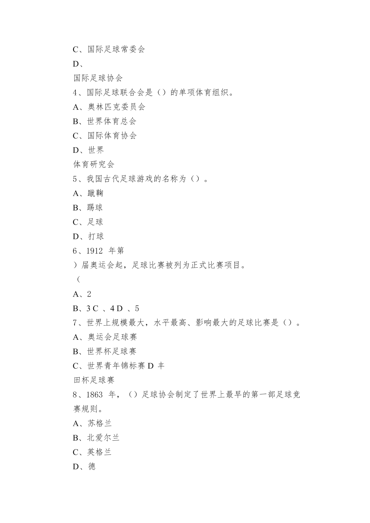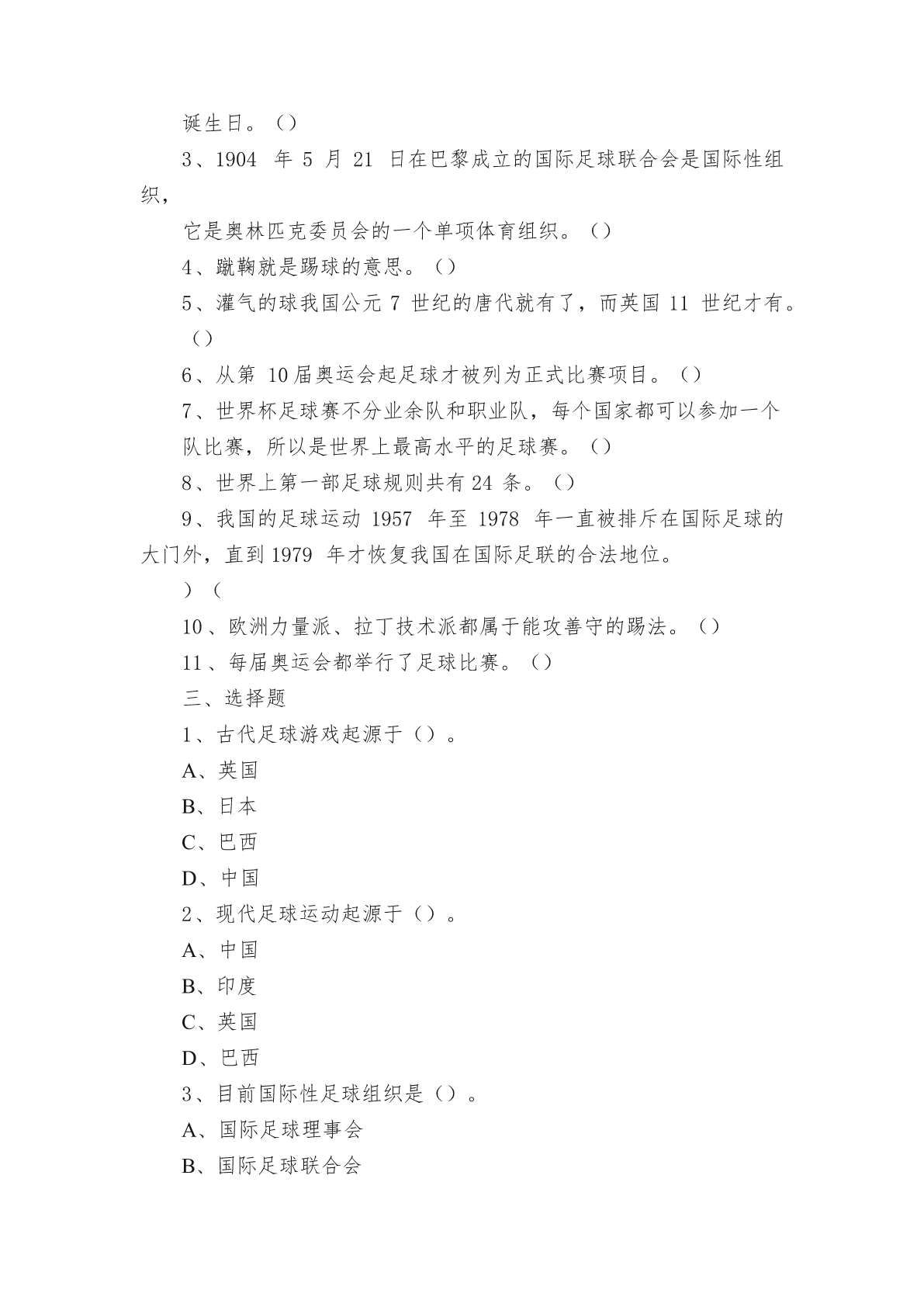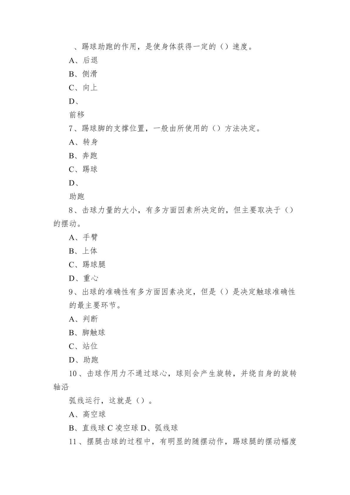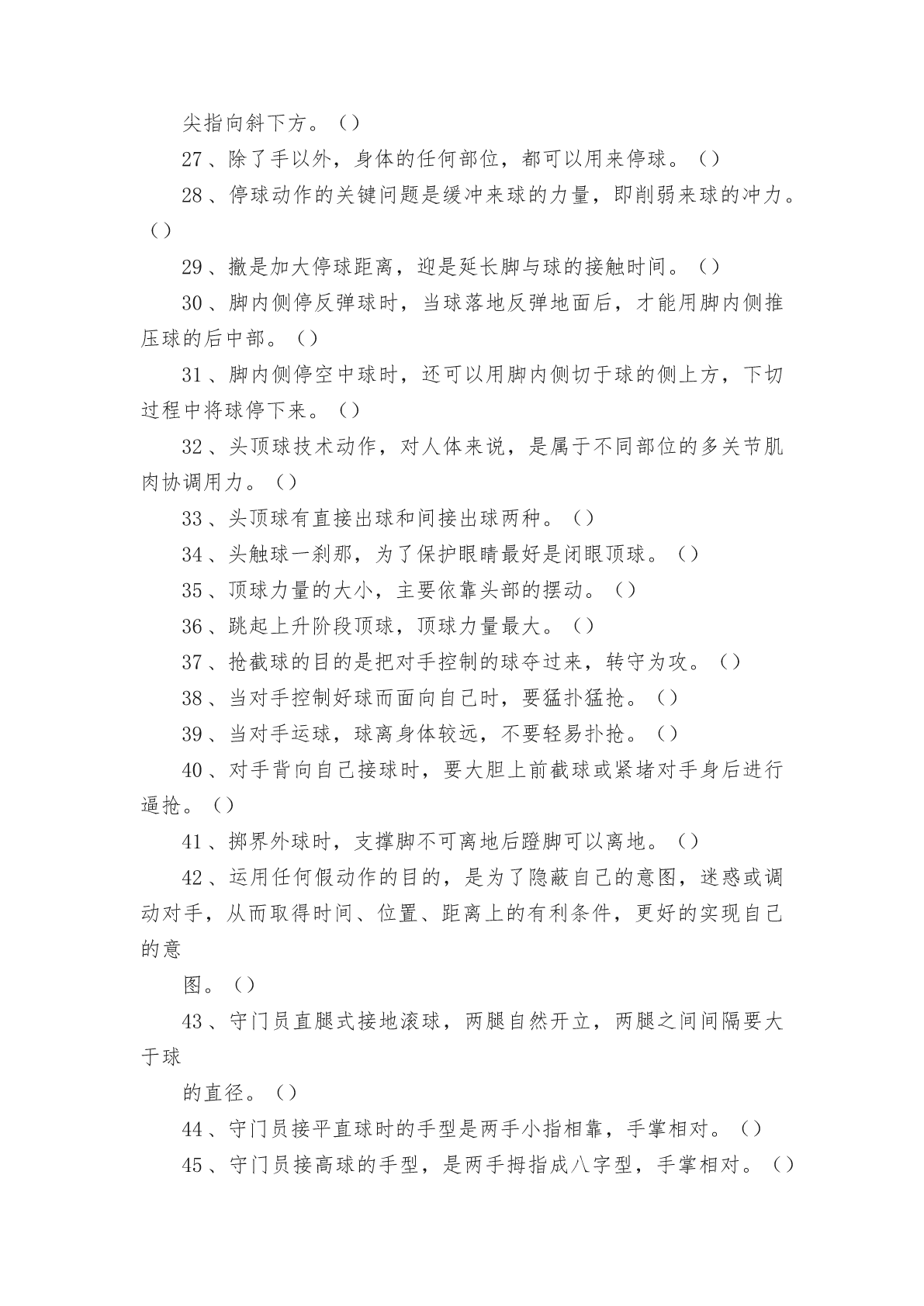 体育足球理论考试题及答案(2)作业与习题第一章足球运动概述一、填空题1、足球运动是以支配球为主,两个队进行的一项体育运动。2、我国古代称足球游戏为或。3、现代足球运动于年月日在诞生。4、年在届国际足联代表大会上,恢复中华人民共和国在国际足联的合法地位。5、年月日,成立了世界上第一个足球运动组织,。6、年月日,在由、、、、、、足球协会创立了国际足球联合会,法文缩写为。7、国际足联于年在举行会议,决定举行世界足球锦标赛,每年举行一届。8、第一届世界足球锦标赛于年在举行。9、从1896年现代奥运会诞生以来,除了因世界大战未举行奥运会外,只有届奥运会没有足球比赛项目,但第届奥运会才将足球项目列为正式比赛项目。10、第一届世界女子足球锦标赛于年在举行。11、在奥运会,将女子足球比赛列为奥运会正式比赛项目。12、足球比赛是以决定比赛胜负。二、判断题1、目前足球国际性组织是国际足球理事会。()2、1863年10月26日,英格兰足球协会成立,这是现代足球运动的诞生日。()3、1904年5月21日在巴黎成立的国际足球联合会是国际性组织,它是奥林匹克委员会的一个单项体育组织。()4、蹴鞠就是踢球的意思。()5、灌气的球我国公元7世纪的唐代就有了,而英国11世纪才有。()6、从第10届奥运会起足球才被列为正式比赛项目。()7、世界杯足球赛不分业余队和职业队,每个国家都可以参加一个队比赛,所以是世界上最高水平的足球赛。()8、世界上第一部足球规则共有24条。()9、我国的足球运动1957年至1978年一直被排斥在国际足球的大门外,直到1979年才恢复我国在国际足联的合法地位。)(10、欧洲力量派、拉丁技术派都属于能攻善守的踢法。()11、每届奥运会都举行了足球比赛。()三、选择题1、古代足球游戏起源于()。A、英国B、日本C、巴西D、中国2、现代足球运动起源于()。A、中国B、印度C、英国D、巴西3、目前国际性足球组织是()。A、国际足球理事会B、国际足球联合会C、国际足球常委会D、国际足球协会4、国际足球联合会是()的单项体育组织。A、奥林匹克委员会B、世界体育总会C、国际体育协会D、世界体育研究会5、我国古代足球游戏的名称为()。A、蹴鞠B、踢球C、足球D、打球6、1912年第)届奥运会起,足球比赛被列为正式比赛项目。(A、2B、3C、4D、57、世界上规模最大,水平最高、影响最大的足球比赛是()。A、奥运会足球赛B、世界杯足球赛C、世界青年锦标赛D丰田杯足球赛8、1863年,()足球协会制定了世界上最早的第一部足球竞赛规则。A、苏格兰B、北爱尔兰C、英格兰D、德国9、第一届世界杯于1930年在()举行。A、乌拉圭B、英格兰C、美国D、意大利四、问答题1、试述足球运动的定义。2、简述足球运动的特点。3、简述足球运动的作用。4、试述现代足球运动的主要流派和特点。5、试述足球运动发展史上的“三次革命”。6、试述足球运动的发展趋势。第二章足球技术一、填空题1、是完成战术配合的基础,的发展又促进了技术的提高。2、足球技术分为和。3、有球技术分为:踢球、颠球、接球、头顶球、运球、、、。4、无球技术是指运动员在比赛中,的情况下所采取的合理动作的总称。5、跑动的方式主要有:、、、、。6、足球运动中的转身一般都可以分为和。7、急停是指运动员在比赛中由突然转换成。8、在快速运动和激烈对抗的条件下,最后能够体现完成攻守任务的技术是。9、运球可以摆脱对手的抢截和阻挡,制造空当,突破防线,为和创造有利时机。10、是运动员有目的的将球击向预定目标的技术。11、踢球的动作结构是由、、、、。12、的作用是调整球与人的方向、距离,以便在踢球时使支撑脚处于所需要的位置,增加击球的力量。13、支撑脚的位置要以、、为原则。14、支撑脚要着地,膝关节,以维持身体的平衡和保证充分的摆腿和自如的踢球。15、脚触球包括的部位和16、在踢球动作的五个环节中,的部位。、、是主要的因素。17、脚内侧踢球有两种踢球动作方法:18、助跑方向与出球方向相同的称为和助跑,助跑方向与出球方。向成交叉的称助跑。19、接球的是缓冲力量的主要办法。20、足球比赛中削弱来球冲力的停球动作,大致可分为和球的运行路线。21、接球分为接地滚球、和。22、为更好的衔接下一个动作,接球后必须迅速移动。‘23、头顶球是、和的有效手段,在进攻和防守中都起到重要作用。24、头顶球可分为前额和。25、按照姿态,头顶球可以分为、、和。