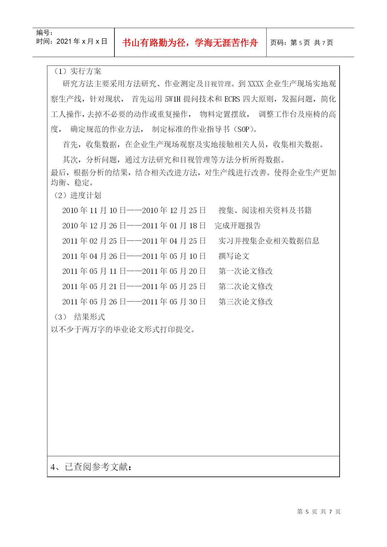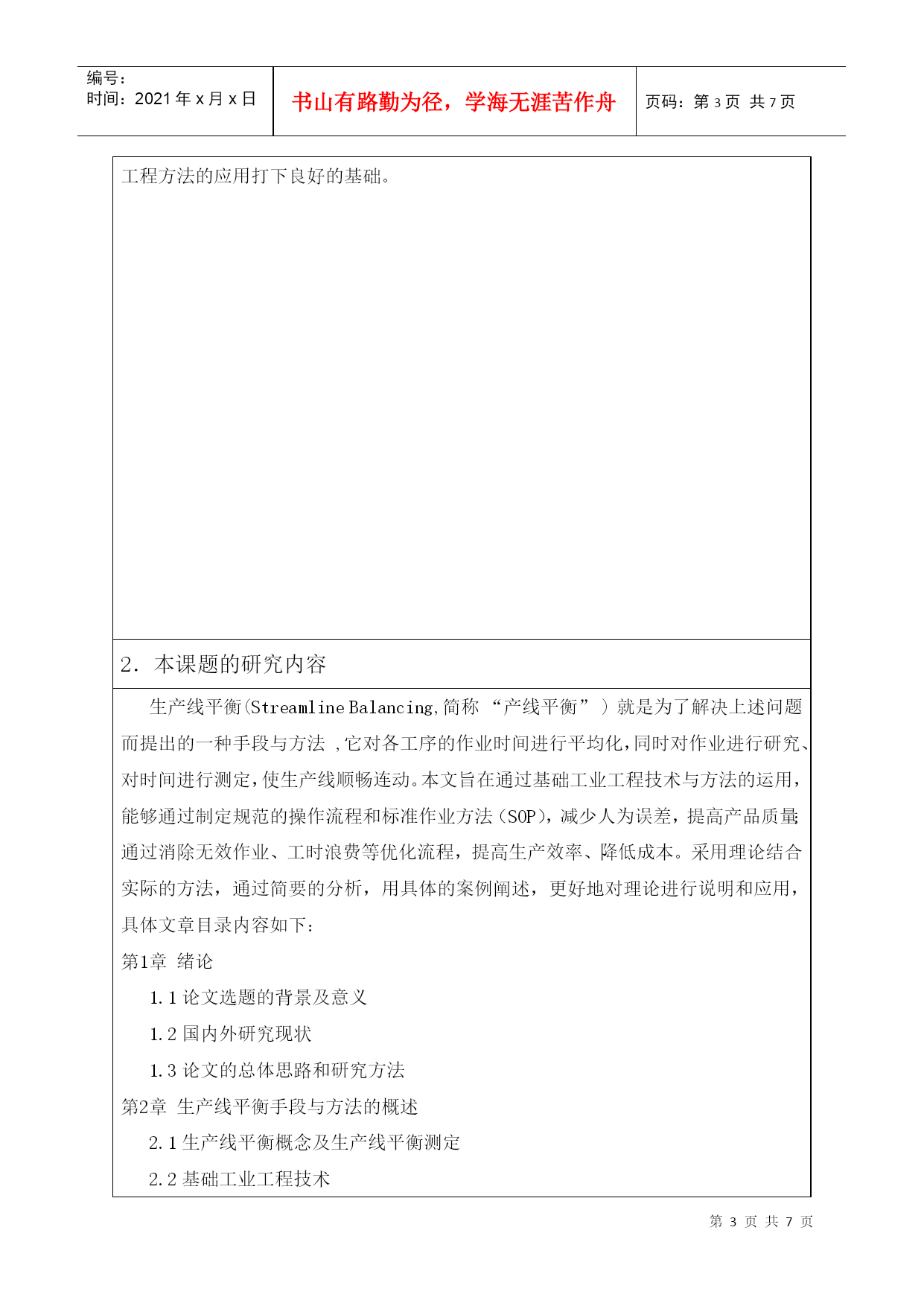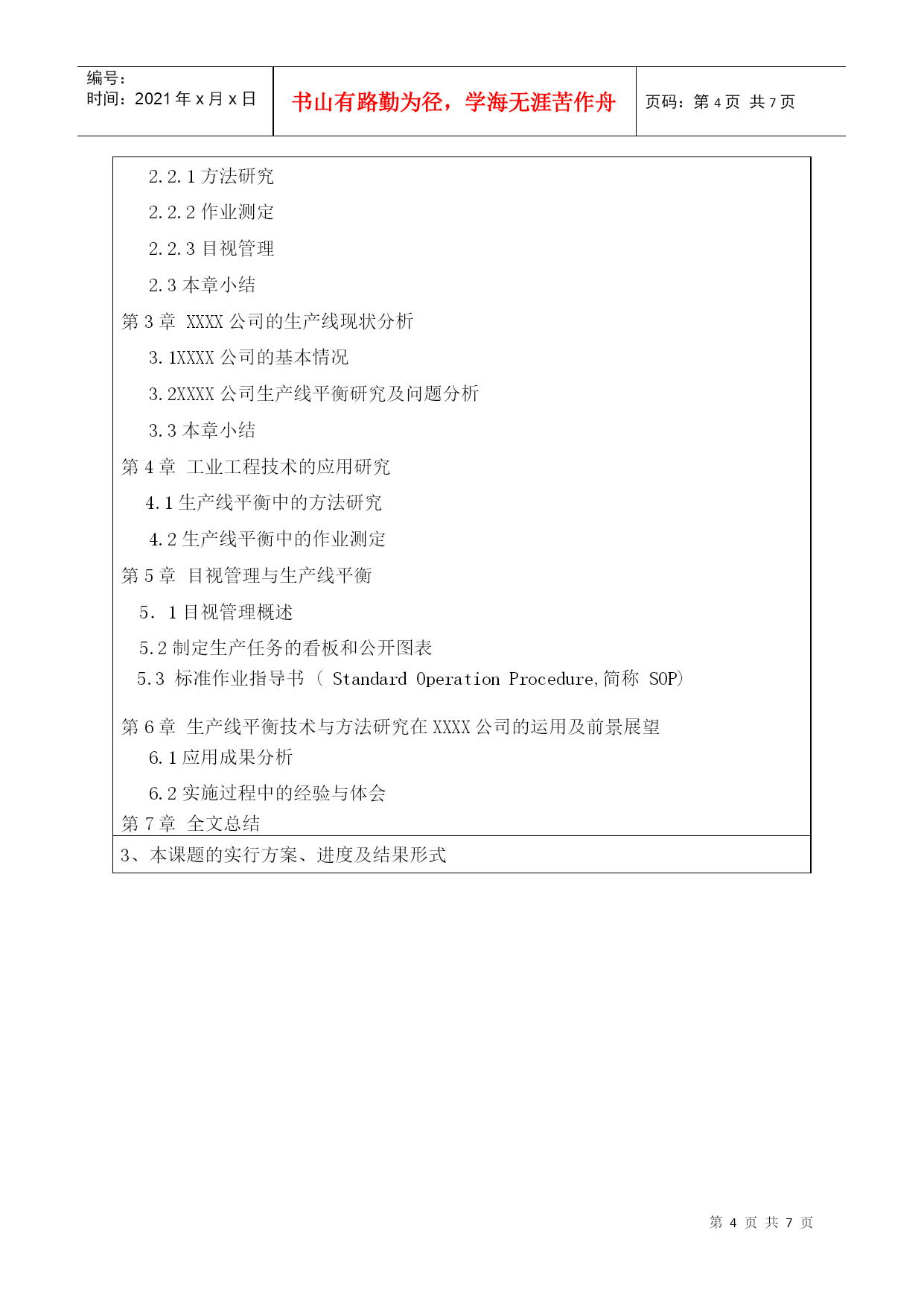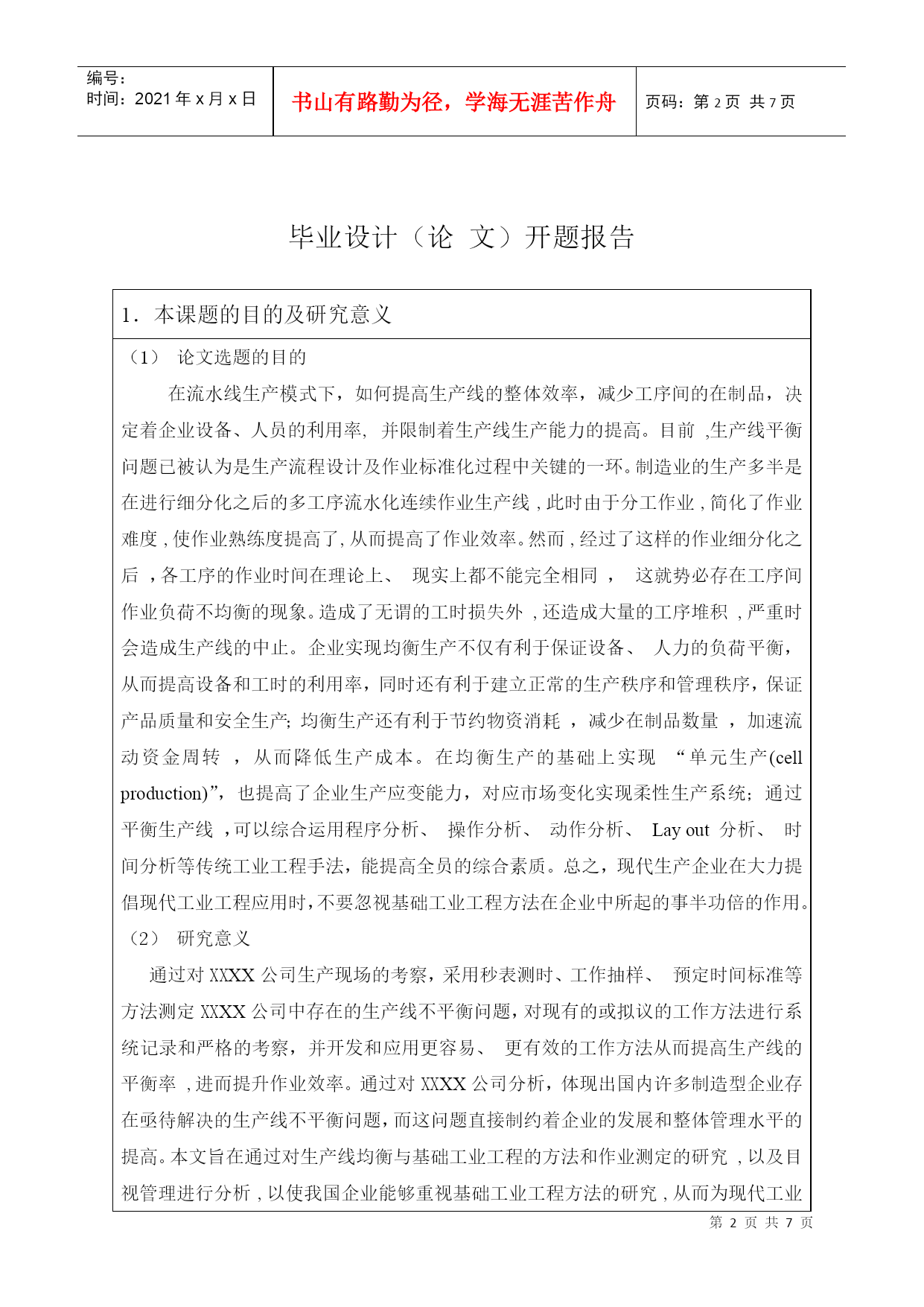 编号:时间:2021年x月x日书山有路勤为径,学海无涯苦作舟页码:第PAGE7页共NUMPAGES7页第PAGE\*MERGEFORMAT7页共NUMPAGES\*MERGEFORMAT7页桂林电子科技大学信息科技学院本科毕业设计(论文)开题报告题目:XX企业装配生产线的平衡研究系别:管理系专业:工业工程班级:07543001学号:0754300111姓名:刘平指导教师:李雷填表日期:2011年1月18日毕业设计(论文)开题报告1.本课题的目的及研究意义论文选题的目的在流水线生产模式下,如何提高生产线的整体效率,减少工序间的在制品,决定着企业设备、人员的利用率,并限制着生产线生产能力的提高。目前,生产线平衡问题已被认为是生产流程设计及作业标准化过程中关键的一环。制造业的生产多半是在进行细分化之后的多工序流水化连续作业生产线,此时由于分工作业,简化了作业难度,使作业熟练度提高了,从而提高了作业效率。然而,经过了这样的作业细分化之后,各工序的作业时间在理论上、现实上都不能完全相同,这就势必存在工序间作业负荷不均衡的现象。造成了无谓的工时损失外,还造成大量的工序堆积,严重时会造成生产线的中止。企业实现均衡生产不仅有利于保证设备、人力的负荷平衡,从而提高设备和工时的利用率,同时还有利于建立正常的生产秩序和管理秩序,保证产品质量和安全生产;均衡生产还有利于节约物资消耗,减少在制品数量,加速流动资金周转,从而降低生产成本。在均衡生产的基础上实现“单元生产(cellproduction)”,也提高了企业生产应变能力,对应市场变化实现柔性生产系统;通过平衡生产线,可以综合运用程序分析、操作分析、动作分析、Layout分析、时间分析等传统工业工程手法,能提高全员的综合素质。总之,现代生产企业在大力提倡现代工业工程应用时,不要忽视基础工业工程方法在企业中所起的事半功倍的作用。研究意义通过对XXXX公司生产现场的考察,采用秒表测时、工作抽样、预定时间标准等方法测定XXXX公司中存在的生产线不平衡问题,对现有的或拟议的工作方法进行系统记录和严格的考察,并开发和应用更容易、更有效的工作方法从而提高生产线的平衡率,进而提升作业效率。通过对XXXX公司分析,体现出国内许多制造型企业存在亟待解决的生产线不平衡问题,而这问题直接制约着企业的发展和整体管理水平的提高。本文旨在通过对生产线均衡与基础工业工程的方法和作业测定的研究,以及目视管理进行分析,以使我国企业能够重视基础工业工程方法的研究,从而为现代工业工程方法的应用打下良好的基础。2.本课题的研究内容生产线平衡(StreamlineBalancing,简称“产线平衡”)就是为了解决上述问题而提出的一种手段与方法,它对各工序的作业时间进行平均化,同时对作业进行研究、对时间进行测定,使生产线顺畅连动。本文旨在通过基础工业工程技术与方法的运用,能够通过制定规范的操作流程和标准作业方法(SOP),减少人为误差,提高产品质量;通过消除无效作业、工时浪费等优化流程,提高生产效率、降低成本。采用理论结合实际的方法,通过简要的分析,用具体的案例阐述,更好地对理论进行说明和应用,具体文章目录内容如下:绪论1.1论文选题的背景及意义1.2国内外研究现状1.3论文的总体思路和研究方法生产线平衡手段与方法的概述2.1生产线平衡概念及生产线平衡测定2.2基础工业工程技术2.2.1方法研究2.2.2作业测定2.2.3目视管理2.3本章小结第3章XXXX公司的生产线现状分析3.1XXXX公司的基本情况3.2XXXX公司生产线平衡研究及问题分析3.3本章小结第4章工业工程技术的应用研究4.1生产线平衡中的方法研究4.2生产线平衡中的作业测定第5章目视管理与生产线平衡5.1目视管理概述5.2制定生产任务的看板和公开图表5.3标准作业指导书(StandardOperationProcedure,简称SOP)第6章生产线平衡技术与方法研究在XXXX公司的运用及前景展望6.1应用成果分析6.2实施过程中的经验与体会第7章全文总结3、本课题的实行方案、进度及结果形式(1)实行方案研究方法主要采用方法研究、作业测定及目视管理。到XXXX企业生产现场实地观察生产线,针对现状,首先运用5W1H提问技术和ECRS四大原则,发掘问题,简化工人操作,去掉不必要的动作或重复操作,物料定置摆放,调整工作台及座椅的高度,确定规范的作业方法,制定标准的作业指导书(S0P)。首先,收集数据,在企业生产现场观察及实地接触相关人员,收集相关数据。其次,分析问题,通过方法研究和目视管理等方法分析所得数据。最后,根据分析