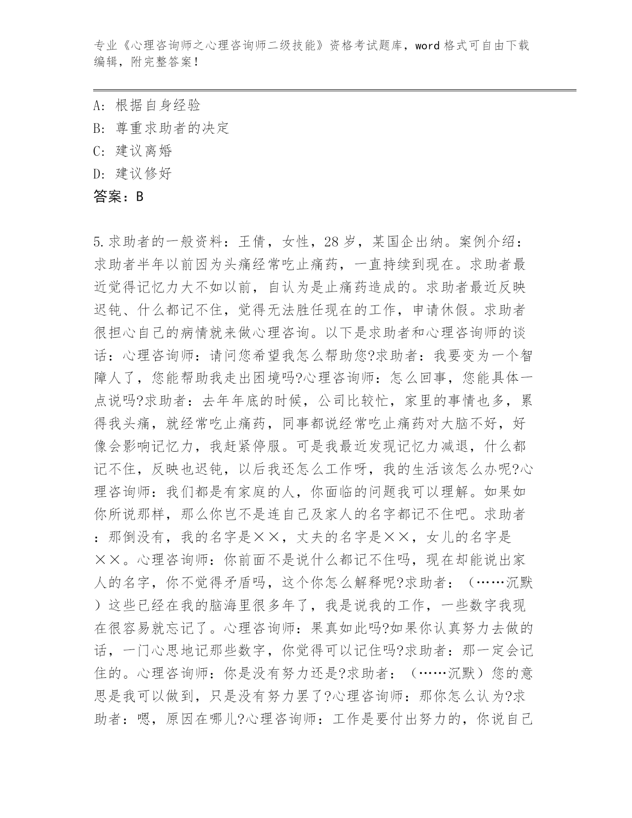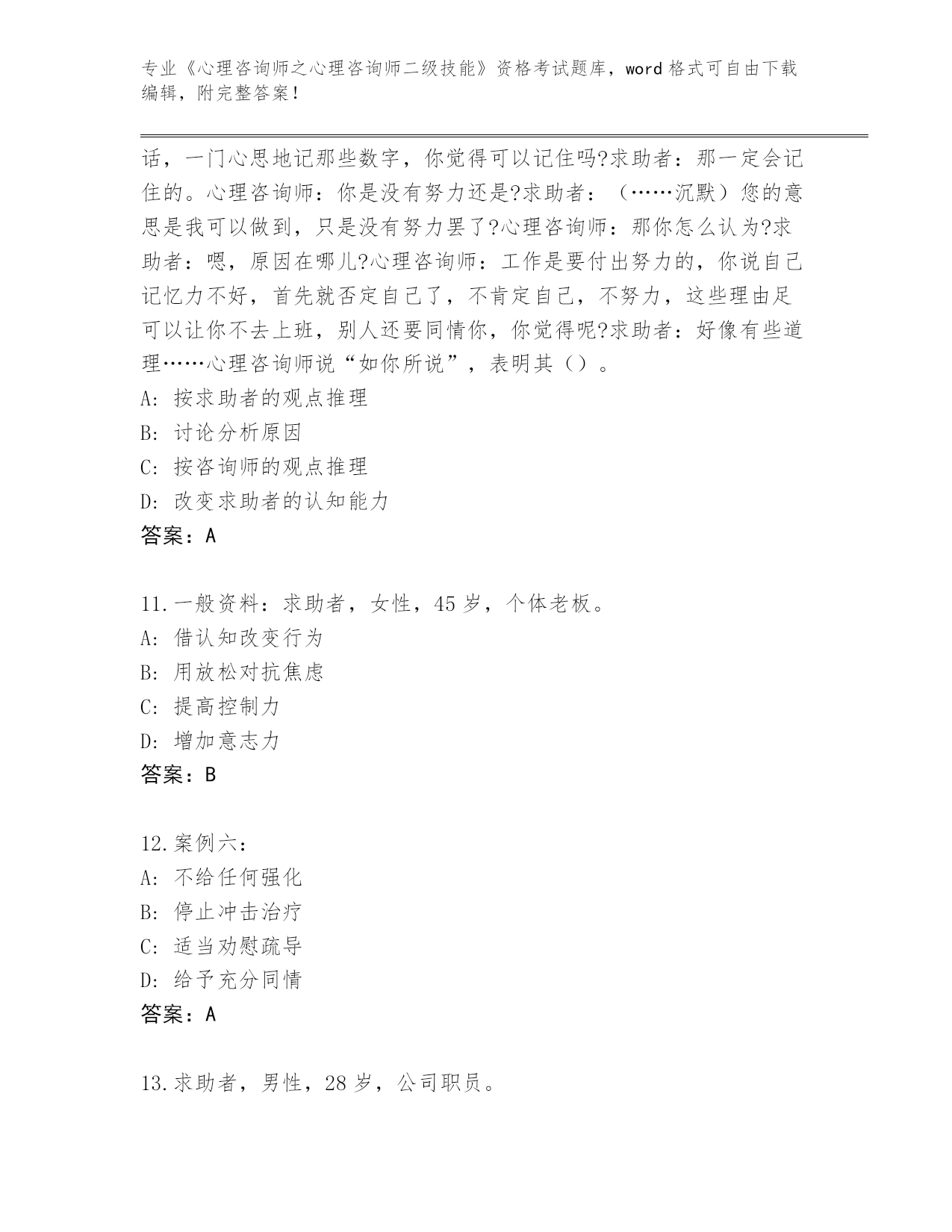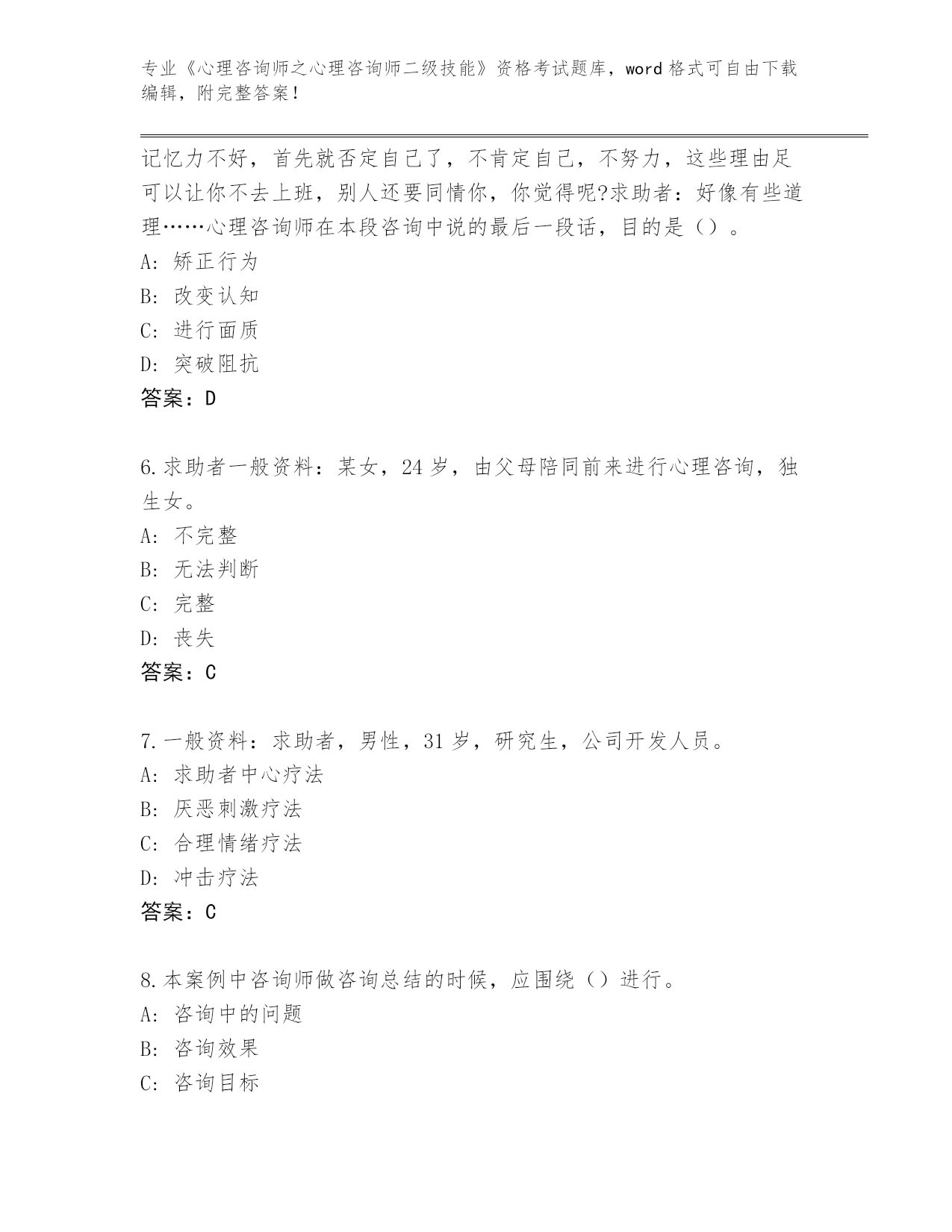 陕西省西乡县2024年《心理咨询师之心理咨询师二级技能》资格考试必刷200题题库【考试直接用】