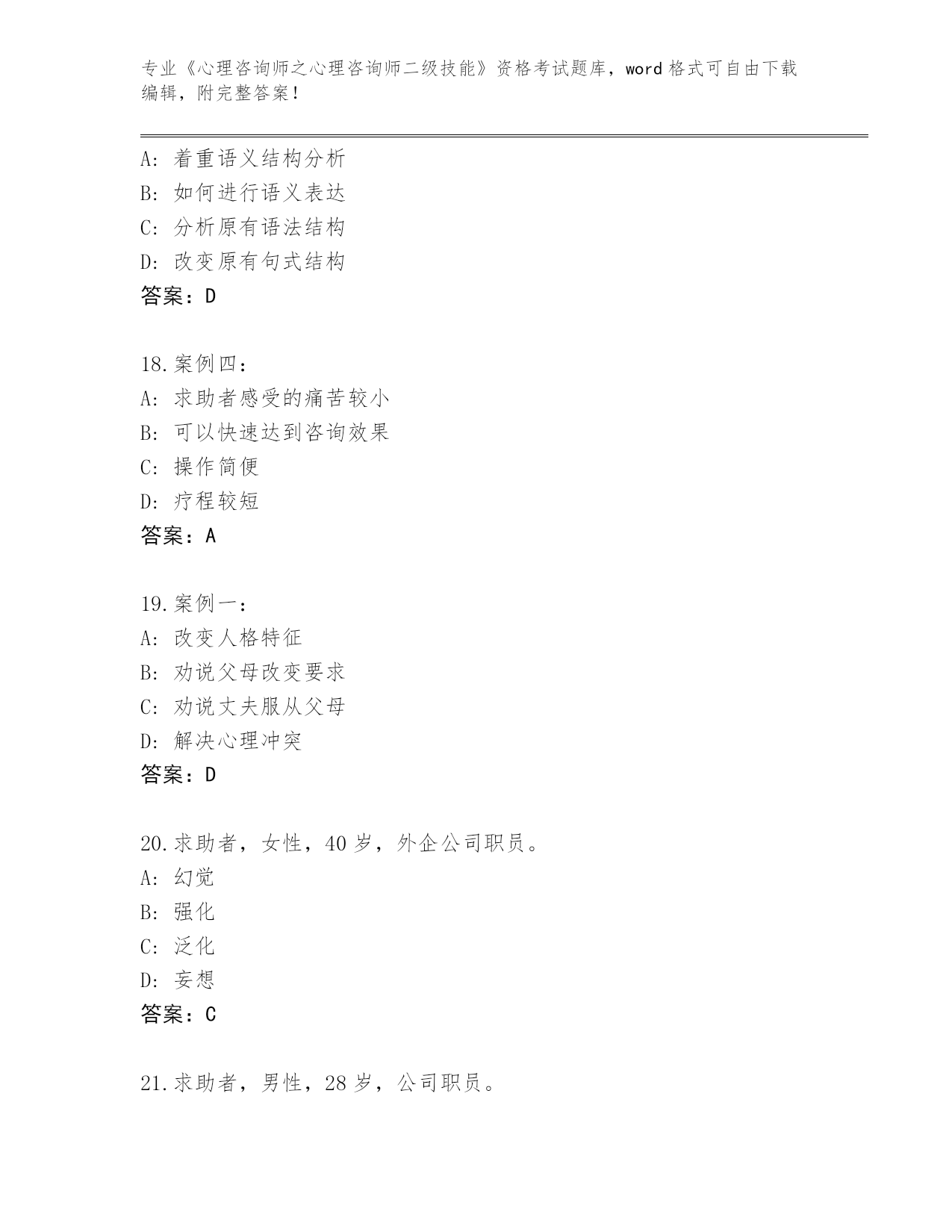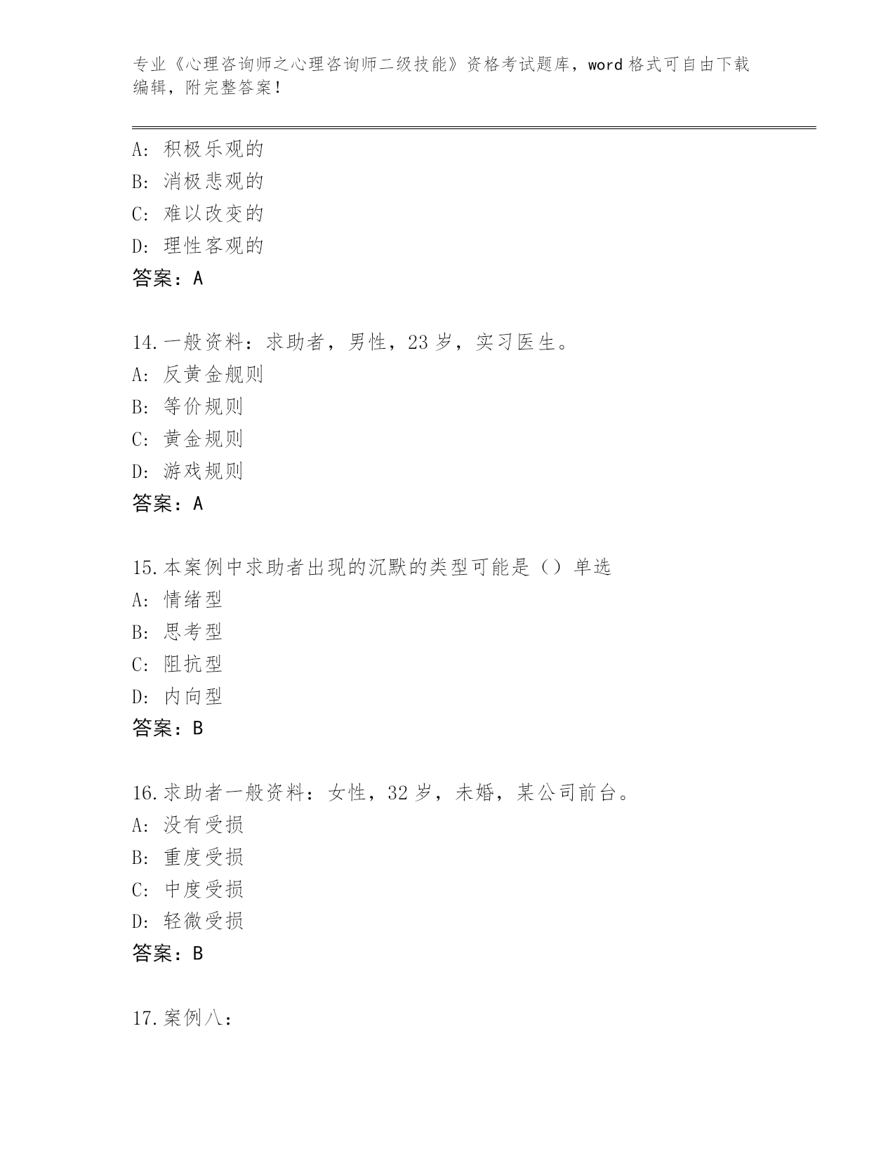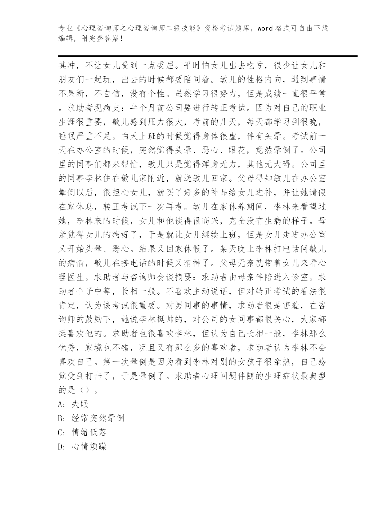 陕西省西乡县2024年《心理咨询师之心理咨询师二级技能》资格考试必刷200题题库【考试直接用】
