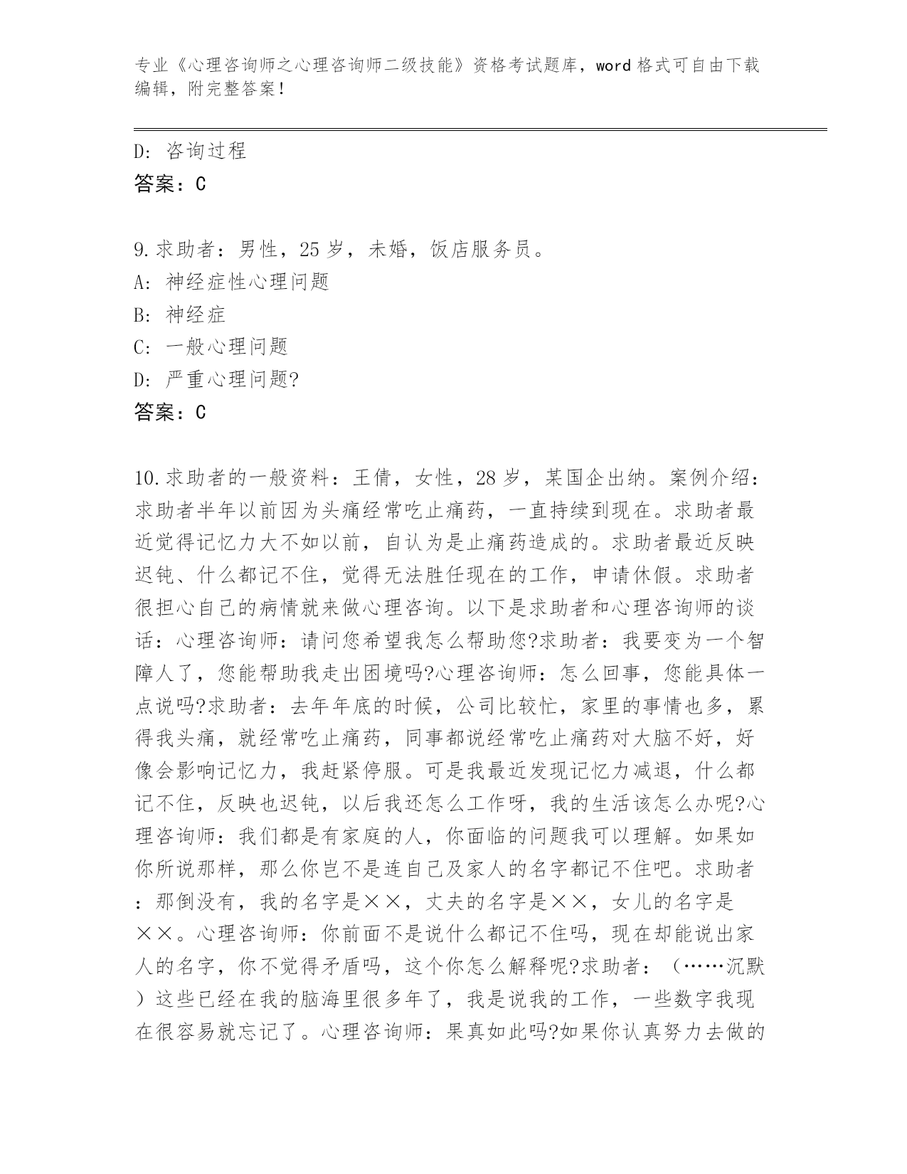 陕西省西乡县2024《心理咨询师之心理咨询师二级技能》考试必考200题题库【预热题】