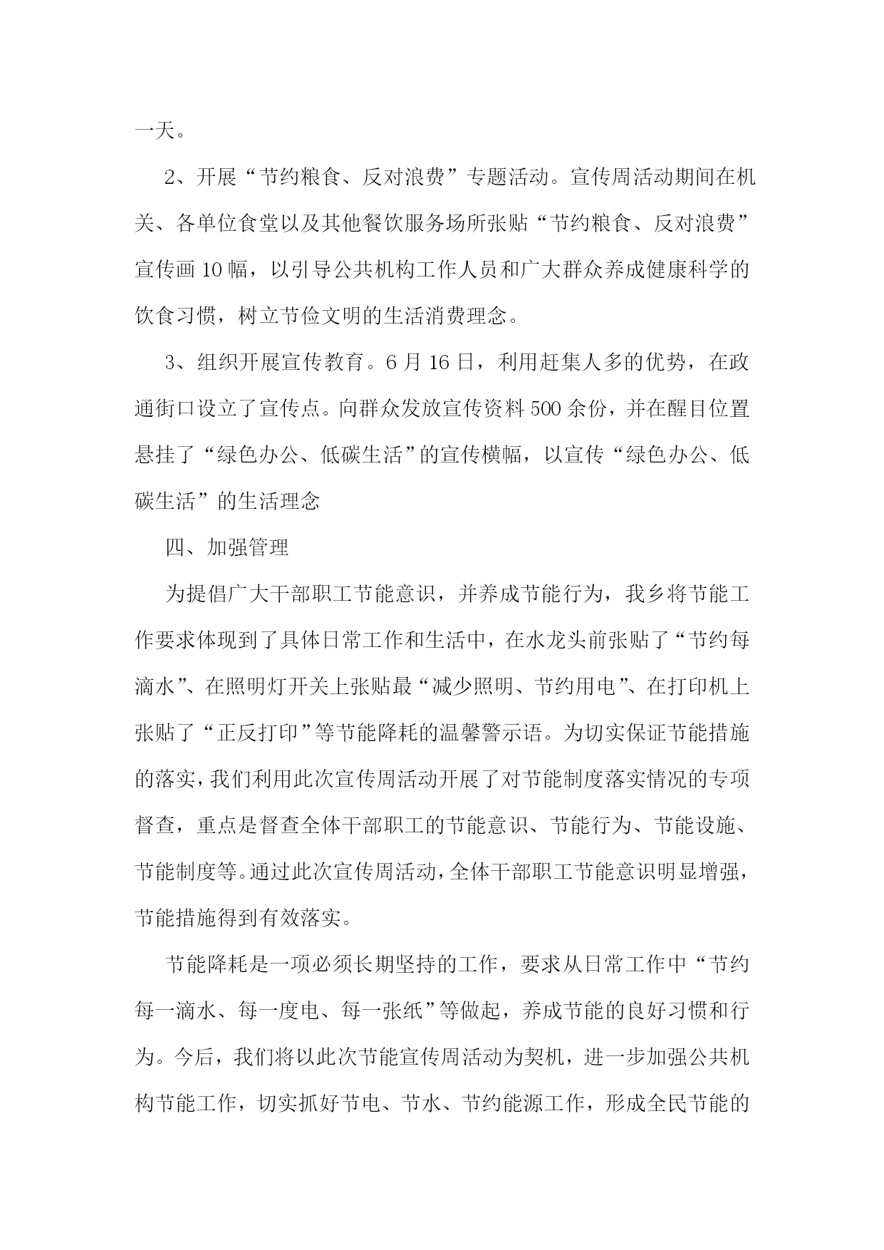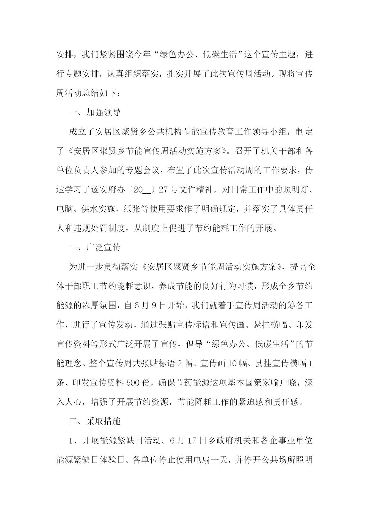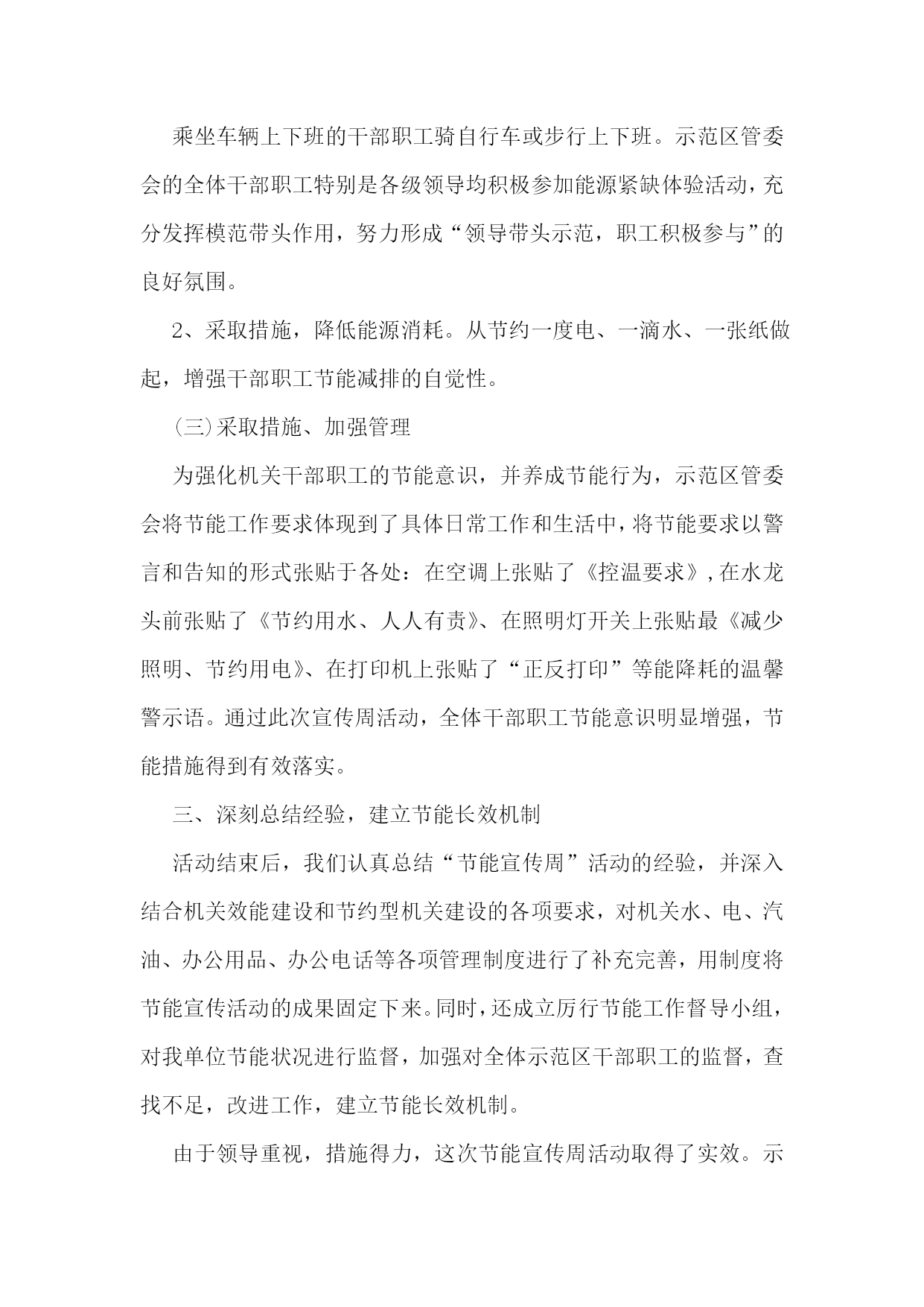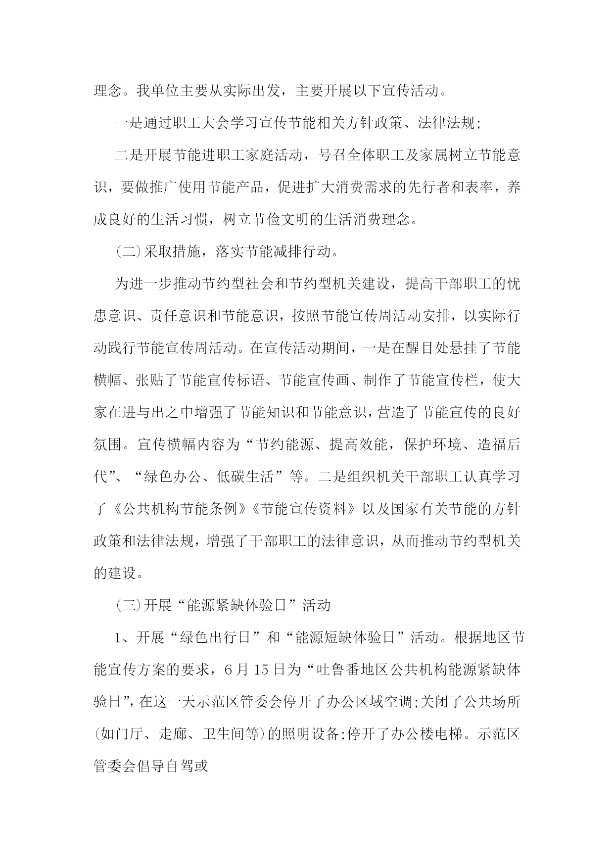 公共机构节能宣传周工作总结公共机构节能宣传周工作总结1为进一步推动节约型社会和节约型机关建设,深入开展公共机构节能宣传教育,提高工作人员忧患意识、责任意识和节能意识,引导和带动全单位营造节能减排的良好氛围,按照地区节能宣传周统一部署,吐鲁番示范区管委会紧紧围绕“节能低碳新生活,公共机构作表率”的宣传主题,以建设节约型机关为目标,扎实开展了20__年度公共机构节能宣传周活动。现将活动情况总结如下:一、领导重视、狠抓落实接到《吐鲁番地区20__年公共机构节能宣传周活动实施方案》(吐地行办[20__]114号)后,示范区管委会领导十分重视,迅速组织召开会议,成立了公共机构节能宣传活动领导小组,讨论并确定活动方案,并把活动任务分解到各科室和个人,进行动员布置,精心组织,明确分工,加强对宣传周活动的监督、指导,为宣传活动提供强有力的组织保障,保证了宣传活动的顺利开展。示范区管委会全体职工按照活动方案的具体安排,认真落实责任。二、强化活动措施,确保活动取得实效(一)大力宣传,增强节能减排意识。加大了节能宣传,使干部和职工了解节约能源的重要性和紧迫性,树立节约光荣、浪费可耻的意识,形成了节约能源从我做起、从小事做起的观念。吐鲁番示范区是国家新能源示范城区暨自治区和谐生态城区和城乡一体化示范区,秉承“低碳、节能、绿色、宜居”的建设理念。我单位主要从实际出发,主要开展以下宣传活动。一是通过职工大会学习宣传节能相关方针政策、法律法规;二是开展节能进职工家庭活动,号召全体职工及家属树立节能意识,要做推广使用节能产品,促进扩大消费需求的先行者和表率,养成良好的生活习惯,树立节俭文明的生活消费理念。(二)采取措施,落实节能减排行动。为进一步推动节约型社会和节约型机关建设,提高干部职工的忧患意识、责任意识和节能意识,按照节能宣传周活动安排,以实际行动践行节能宣传周活动。在宣传活动期间,一是在醒目处悬挂了节能横幅、张贴了节能宣传标语、节能宣传画、制作了节能宣传栏,使大家在进与出之中增强了节能知识和节能意识,营造了节能宣传的良好氛围。宣传横幅内容为“节约能源、提高效能,保护环境、造福后代”、“绿色办公、低碳生活”等。二是组织机关干部职工认真学习了《公共机构节能条例》《节能宣传资料》以及国家有关节能的方针政策和法律法规,增强了干部职工的法律意识,从而推动节约型机关的建设。(三)开展“能源紧缺体验日”活动1、开展“绿色出行日”和“能源短缺体验日”活动。根据地区节能宣传方案的要求,6月15日为“吐鲁番地区公共机构能源紧缺体验日”,在这一天示范区管委会停开了办公区域空调;关闭了公共场所(如门厅、走廊、卫生间等)的照明设备;停开了办公楼电梯。示范区管委会倡导自驾或乘坐车辆上下班的干部职工骑自行车或步行上下班。示范区管委会的全体干部职工特别是各级领导均积极参加能源紧缺体验活动,充分发挥模范带头作用,努力形成“领导带头示范,职工积极参与”的良好氛围。2、采取措施,降低能源消耗。从节约一度电、一滴水、一张纸做起,增强干部职工节能减排的自觉性。(三)采取措施、加强管理为强化机关干部职工的节能意识,并养成节能行为,示范区管委会将节能工作要求体现到了具体日常工作和生活中,将节能要求以警言和告知的形式张贴于各处:在空调上张贴了《控温要求》,在水龙头前张贴了《节约用水、人人有责》、在照明灯开关上张贴最《减少照明、节约用电》、在打印机上张贴了“正反打印”等能降耗的温馨警示语。通过此次宣传周活动,全体干部职工节能意识明显增强,节能措施得到有效落实。三、深刻总结经验,建立节能长效机制活动结束后,我们认真总结“节能宣传周”活动的经验,并深入结合机关效能建设和节约型机关建设的各项要求,对机关水、电、汽油、办公用品、办公电话等各项管理制度进行了补充完善,用制度将节能宣传活动的成果固定下来。同时,还成立厉行节能工作督导小组,对我单位节能状况进行监督,加强对全体示范区干部职工的监督,查找不足,改进工作,建立节能长效机制。由于领导重视,措施得力,这次节能宣传周活动取得了实效。示范区管委会并没有就此止步,示范区管委会的领导强调在节能的问题上并不能光靠“节能宣传周”来推动。未来的吐鲁番示范区是“低碳、节能、绿色、环保”的示范区,因此示范区管委会全体干部职工要把一年365天天天当成“节能宣传日”,要以自己的`模范行为为节能工作鼓与呼。本次节能宣传周活动顺利进行,达到宣传周活动的目标,增强了公众的能源忧患意识和节约意识,在吐鲁番示范区形成了从我做起,从现在做起,从身边点滴事情做起,“节约光荣、浪费可耻”的浓厚氛围,有效地促进示范区管委会全面实现节能降耗的目标,为建立节能减排的长效机制打下了基础。公共机构节能宣传周工作总结2一、加大宣传力度。教育是基础,是增强干部
