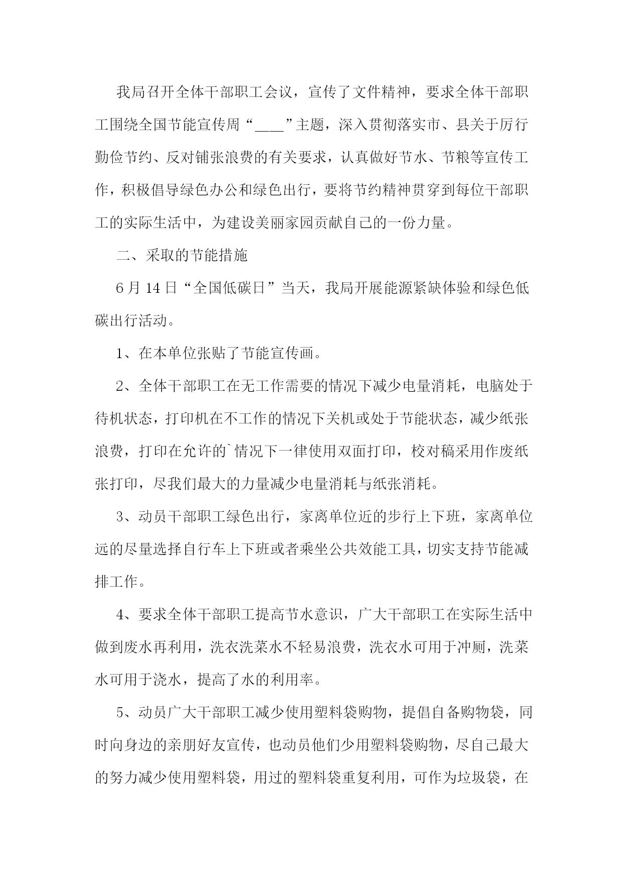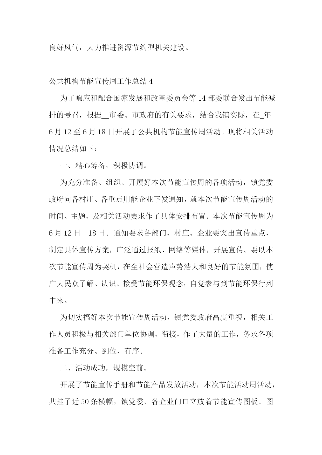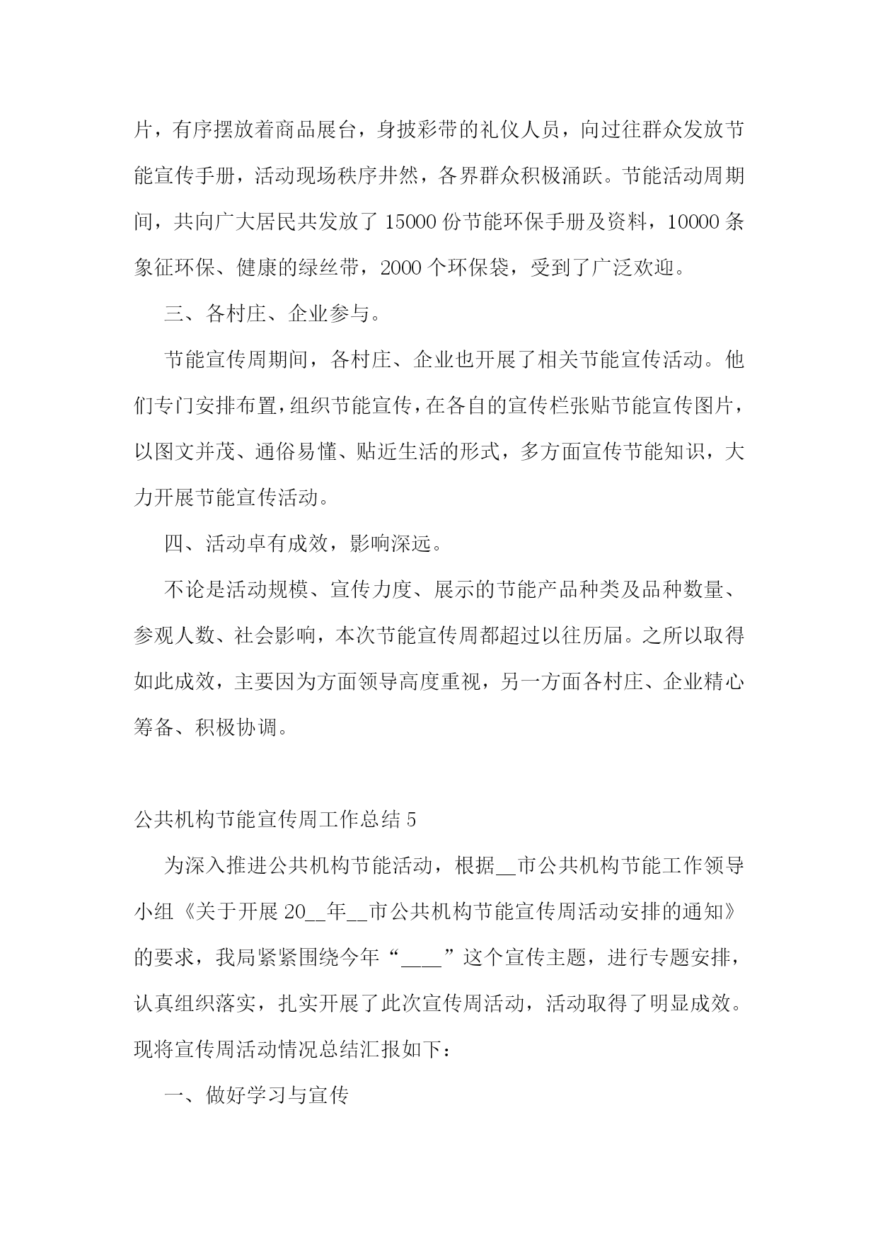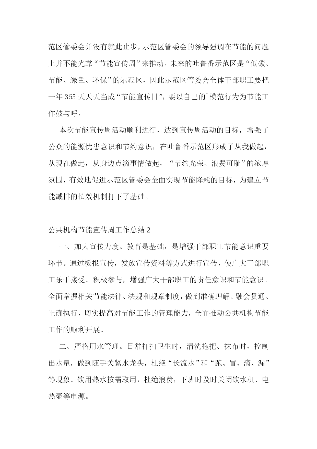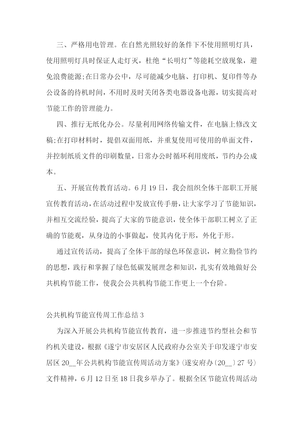 公共机构节能宣传周工作总结公共机构节能宣传周工作总结1为进一步推动节约型社会和节约型机关建设,深入开展公共机构节能宣传教育,提高工作人员忧患意识、责任意识和节能意识,引导和带动全单位营造节能减排的良好氛围,按照地区节能宣传周统一部署,吐鲁番示范区管委会紧紧围绕“节能低碳新生活,公共机构作表率”的宣传主题,以建设节约型机关为目标,扎实开展了20__年度公共机构节能宣传周活动。现将活动情况总结如下:一、领导重视、狠抓落实接到《吐鲁番地区20__年公共机构节能宣传周活动实施方案》(吐地行办[20__]114号)后,示范区管委会领导十分重视,迅速组织召开会议,成立了公共机构节能宣传活动领导小组,讨论并确定活动方案,并把活动任务分解到各科室和个人,进行动员布置,精心组织,明确分工,加强对宣传周活动的监督、指导,为宣传活动提供强有力的组织保障,保证了宣传活动的顺利开展。示范区管委会全体职工按照活动方案的具体安排,认真落实责任。二、强化活动措施,确保活动取得实效(一)大力宣传,增强节能减排意识。加大了节能宣传,使干部和职工了解节约能源的重要性和紧迫性,树立节约光荣、浪费可耻的意识,形成了节约能源从我做起、从小事做起的观念。吐鲁番示范区是国家新能源示范城区暨自治区和谐生态城区和城乡一体化示范区,秉承“低碳、节能、绿色、宜居”的建设理念。我单位主要从实际出发,主要开展以下宣传活动。一是通过职工大会学习宣传节能相关方针政策、法律法规;二是开展节能进职工家庭活动,号召全体职工及家属树立节能意识,要做推广使用节能产品,促进扩大消费需求的先行者和表率,养成良好的生活习惯,树立节俭文明的生活消费理念。(二)采取措施,落实节能减排行动。为进一步推动节约型社会和节约型机关建设,提高干部职工的忧患意识、责任意识和节能意识,按照节能宣传周活动安排,以实际行动践行节能宣传周活动。在宣传活动期间,一是在醒目处悬挂了节能横幅、张贴了节能宣传标语、节能宣传画、制作了节能宣传栏,使大家在进与出之中增强了节能知识和节能意识,营造了节能宣传的良好氛围。宣传横幅内容为“节约能源、提高效能,保护环境、造福后代”、“绿色办公、低碳生活”等。二是组织机关干部职工认真学习了《公共机构节能条例》《节能宣传资料》以及国家有关节能的方针政策和法律法规,增强了干部职工的法律意识,从而推动节约型机关的建设。(三)开展“能源紧缺体验日”活动1、开展“绿色出行日”和“能源短缺体验日”活动。根据地区节能宣传方案的要求,6月15日为“吐鲁番地区公共机构能源紧缺体验日”,在这一天示范区管委会停开了办公区域空调;关闭了公共场所(如门厅、走廊、卫生间等)的照明设备;停开了办公楼电梯。示范区管委会倡导自驾或乘坐车辆上下班的干部职工骑自行车或步行上下班。示范区管委会的全体干部职工特别是各级领导均积极参加能源紧缺体验活动,充分发挥模范带头作用,努力形成“领导带头示范,职工积极参与”的良好氛围。2、采取措施,降低能源消耗。从节约一度电、一滴水、一张纸做起,增强干部职工节能减排的自觉性。(三)采取措施、加强管理为强化机关干部职工的节能意识,并养成节能行为,示范区管委会将节能工作要求体现到了具体日常工作和生活中,将节能要求以警言和告知的形式张贴于各处:在空调上张贴了《控温要求》,在水龙头前张贴了《节约用水、人人有责》、在照明灯开关上张贴最《减少照明、节约用电》、在打印机上张贴了“正反打印”等能降耗的温馨警示语。通过此次宣传周活动,全体干部职工节能意识明显增强,节能措施得到有效落实。三、深刻总结经验,建立节能长效机制活动结束后,我们认真总结“节能宣传周”活动的经验,并深入结合机关效能建设和节约型机关建设的各项要求,对机关水、电、汽油、办公用品、办公电话等各项管理制度进行了补充完善,用制度将节能宣传活动的成果固定下来。同时,还成立厉行节能工作督导小组,对我单位节能状况进行监督,加强对全体示范区干部职工的监督,查找不足,改进工作,建立节能长效机制。由于领导重视,措施得力,这次节能宣传周活动取得了实效。示范区管委会并没有就此止步,示范区管委会的领导强调在节能的问题上并不能光靠“节能宣传周”来推动。未来的吐鲁番示范区是“低碳、节能、绿色、环保”的示范区,因此示范区管委会全体干部职工要把一年365天天天当成“节能宣传日”,要以自己的`模范行为为节能工作鼓与呼。本次节能宣传周活动顺利进行,达到宣传周活动的目标,增强了公众的能源忧患意识和节约意识,在吐鲁番示范区形成了从我做起,从现在做起,从身边点滴事情做起,“节约光荣、浪费可耻”的浓厚氛围,有效地促进示范区管委会全面实现节能降耗的目标,为建立节能减排的长效机制打下了基础。公共机构节能宣传周工作总结2一、加大宣传力度。教育是基础,是增强干部