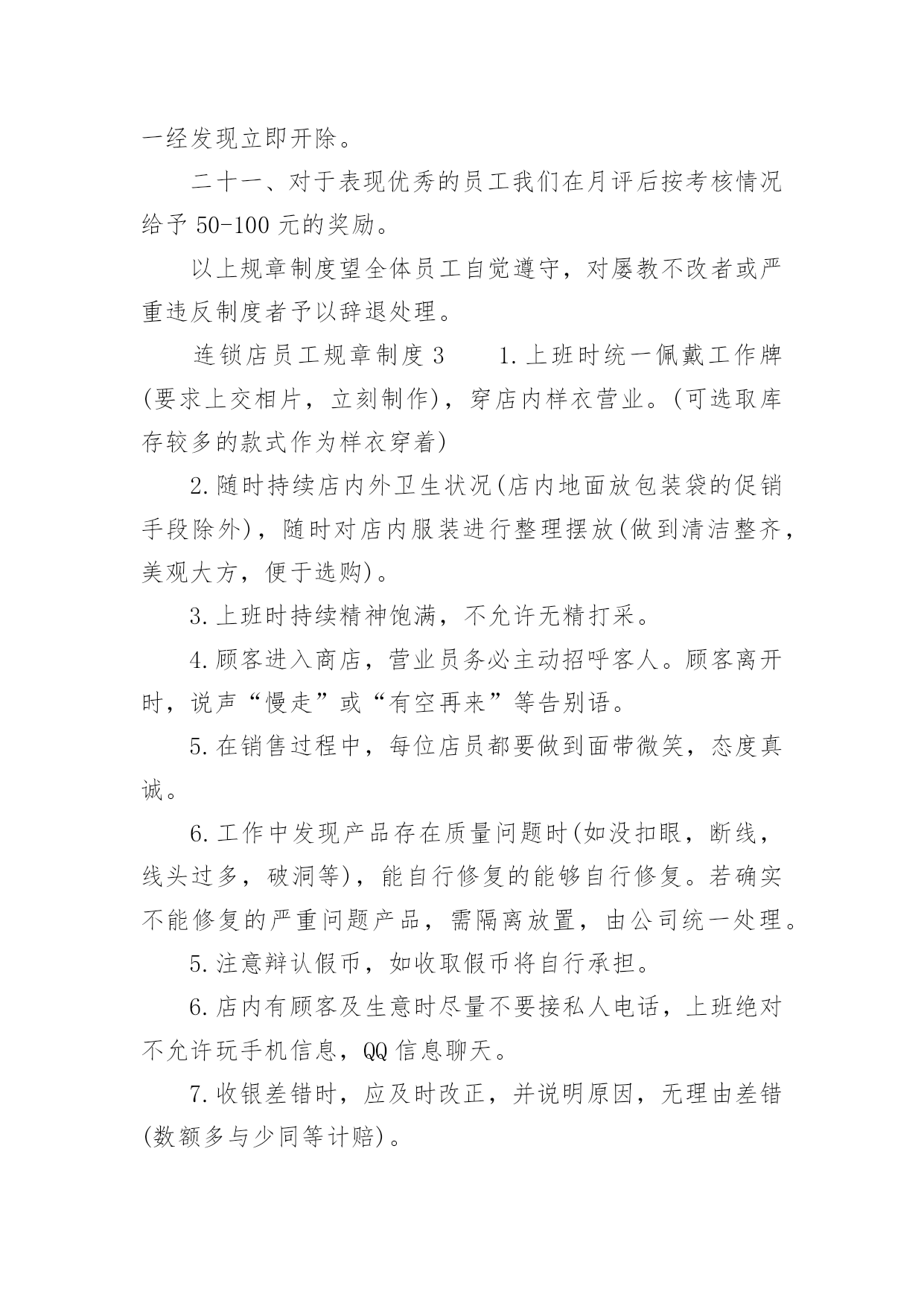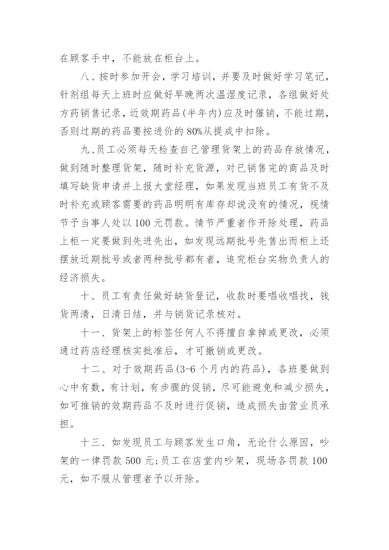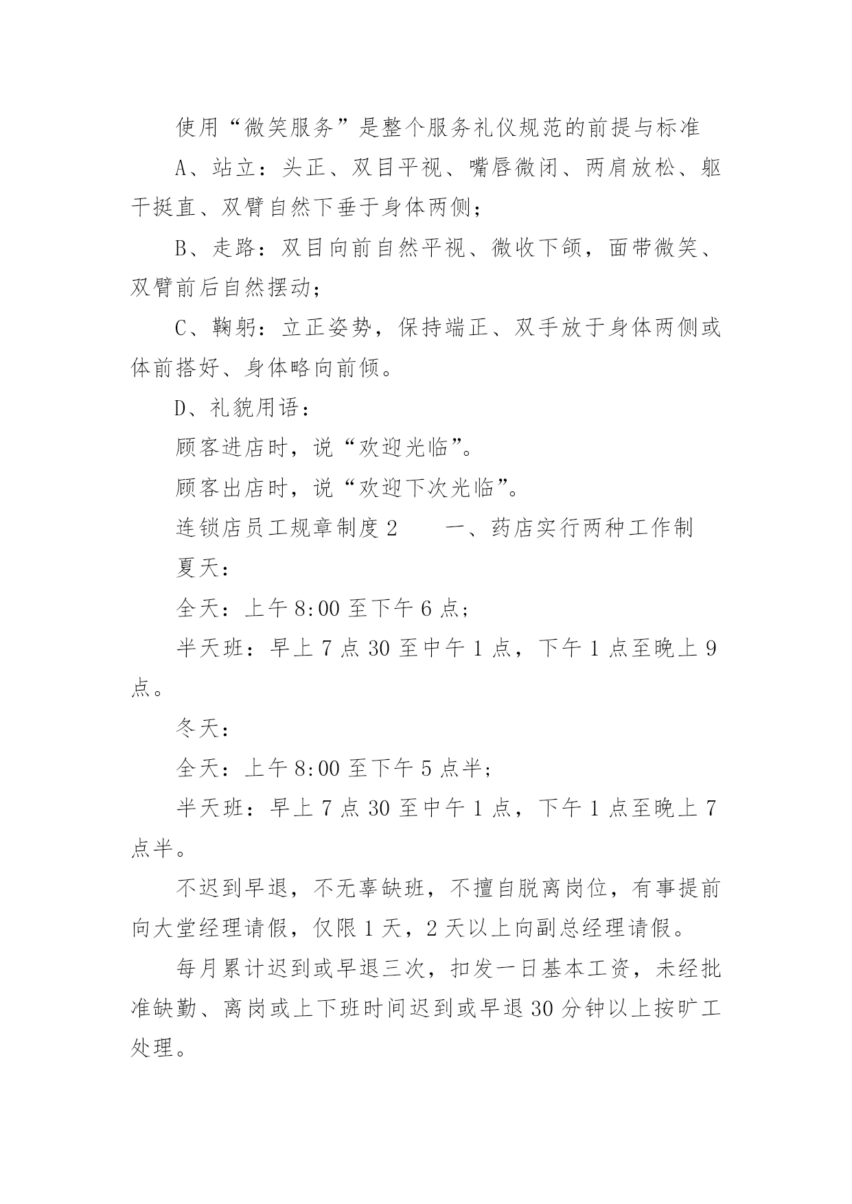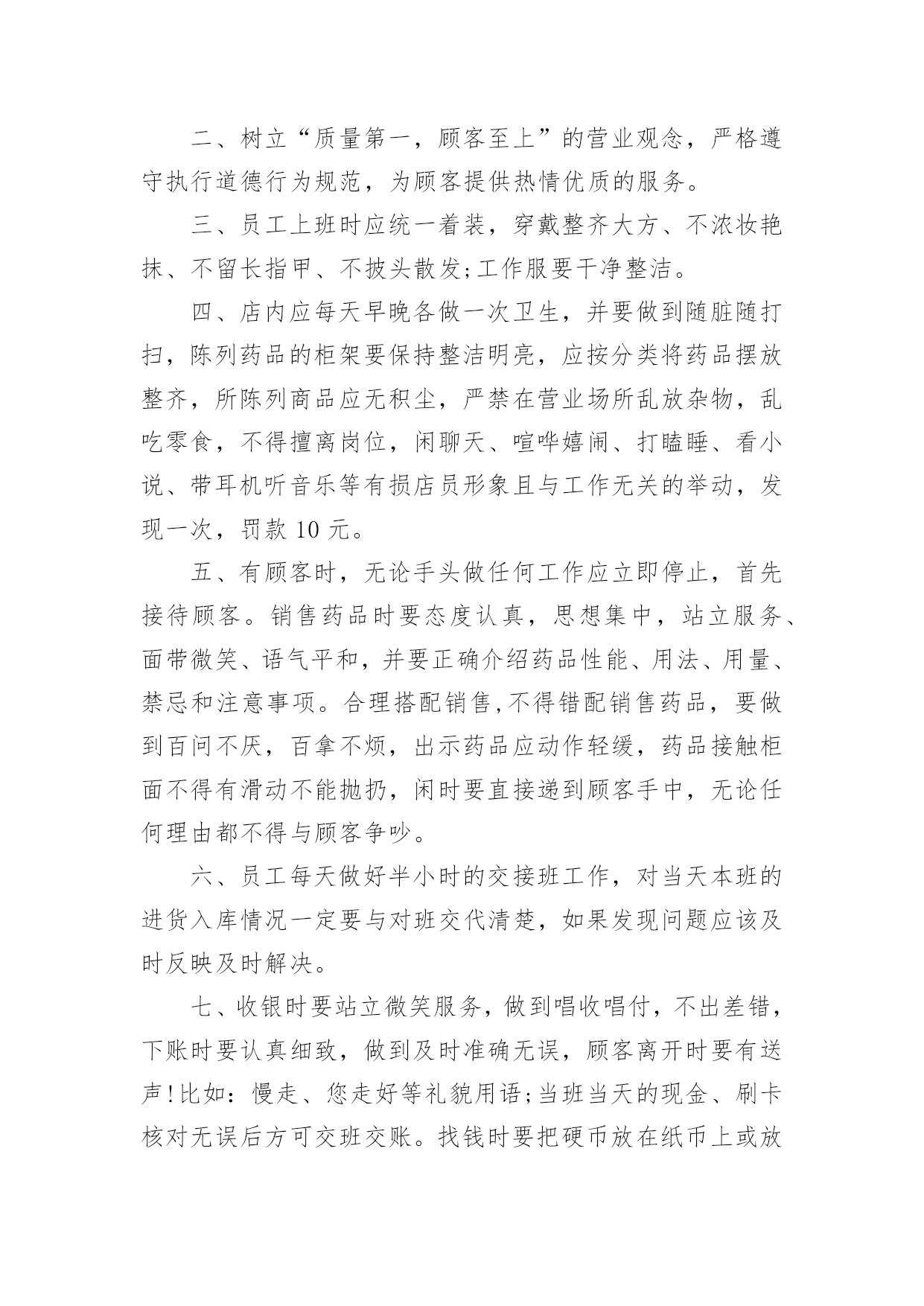 连锁店员工规章制度连锁店员工规章制度(精选5篇)在生活中,我们每个人都可能会接触到制度,制度一般指要求大家共同遵守的办事规程或行动准则,也指在一定历史条件下形成的法令、礼俗等规范或一定的规格。想必许多人都在为如何制定制度而烦恼吧,下面是小编为大家收集的连锁店员工规章制度(精选5篇),欢迎阅读与收藏。连锁店员工规章制度1(一)工作纪律1、上班时间不准在商场内吃零食、玩游戏,不准离岗、串岗,不准聚集在一起聊天、嬉笑、喧哗;不准在工作时间吃食物、看书、报、看杂志、做私事;不准在营业时间内会客、带小孩、带宠物,或逗玩亲朋好友的小孩;2、注意个人及公司形象,不得在营业场所内将手插入袋内站立或行走,不准将手搭撑在货架上,不准坐在货架、货箱及货品上;3、上班须用礼貌用语,提高销售技巧。接待顾客态度要和蔼,不准与顾客顶嘴、吵架、或打骂、殴打顾客;4、上班时间必须保持店内有人照顾,不准2个以上同时饮水或上厕所,不准店内同时有二位以上营业员当班而出现只有一个人在柜内15分钟以上。违者以空柜处理,处罚条例按商场管理条例执行;5、发现顾客在自己店内吸烟,要委婉地加以制止;6、注重个人及店内卫生,每天早晚进行一次清洁工作,清洁范围包括:展柜、玻璃柜、收银柜、地面、形象墙及陈列货品,要保持柜台及玻璃无指印、无灰尘,地面无积水、纸屑,商品整洁、无灰尘、无印迹,雨天时还须及时对脚印进行拖洗;不准将清洁用具、垃圾堆放在公共走道或垃圾箱上;8、爱护场内商品,不得故意损坏商品,或将店内任何物品带出工作场所。9、营业员在停止营业前5分钟才可以做最后结束工作,店内如还有客人,不得更换衣服做下班准备。(二)礼仪行为规范1、仪容仪表规范A、工作时间须统一穿着公司指定的制服及佩带商场的胸牌。制服要保持平整、干净(穿制服前应先检查扣子是否有掉落,有无破损),不得在制服上另加自己的衣服。胸牌配带于左胸处,不歪斜,不掉落;B、保持头发整齐清洁,长发及肩者需扎起来,饰品以适量,适宜,不夸张为原则,不应配带金属制品的发饰;C、表情开朗,化妆以适度化妆,擦上口红为原则,着近肤色无花纹的丝袜,黑色素面前后包的低跟皮鞋;D、员工不留长指甲,必须保持圆滑、清洁。除女性的淡色指甲油外,不得涂其它深浓色指甲油;E、工作时间员工不得携带任何音乐播放器(MP3、CD、收音机等)。2、服务礼仪规范使用“微笑服务”是整个服务礼仪规范的前提与标准A、站立:头正、双目平视、嘴唇微闭、两肩放松、躯干挺直、双臂自然下垂于身体两侧;B、走路:双目向前自然平视、微收下颌,面带微笑、双臂前后自然摆动;C、鞠躬:立正姿势,保持端正、双手放于身体两侧或体前搭好、身体略向前倾。D、礼貌用语:顾客进店时,说“欢迎光临”。顾客出店时,说“欢迎下次光临”。连锁店员工规章制度2一、药店实行两种工作制夏天:全天:上午8:00至下午6点;半天班:早上7点30至中午1点,下午1点至晚上9点。冬天:全天:上午8:00至下午5点半;半天班:早上7点30至中午1点,下午1点至晚上7点半。不迟到早退,不无辜缺班,不擅自脱离岗位,有事提前向大堂经理请假,仅限1天,2天以上向副总经理请假。每月累计迟到或早退三次,扣发一日基本工资,未经批准缺勤、离岗或上下班时间迟到或早退30分钟以上按旷工处理。二、树立“质量第一,顾客至上”的营业观念,严格遵守执行道德行为规范,为顾客提供热情优质的服务。三、员工上班时应统一着装,穿戴整齐大方、不浓妆艳抹、不留长指甲、不披头散发;工作服要干净整洁。四、店内应每天早晚各做一次卫生,并要做到随脏随打扫,陈列药品的柜架要保持整洁明亮,应按分类将药品摆放整齐,所陈列商品应无积尘,严禁在营业场所乱放杂物,乱吃零食,不得擅离岗位,闲聊天、喧哗嬉闹、打瞌睡、看小说、带耳机听音乐等有损店员形象且与工作无关的举动,发现一次,罚款10元。五、有顾客时,无论手头做任何工作应立即停止,首先接待顾客。销售药品时要态度认真,思想集中,站立服务、面带微笑、语气平和,并要正确介绍药品性能、用法、用量、禁忌和注意事项。合理搭配销售,不得错配销售药品,要做到百问不厌,百拿不烦,出示药品应动作轻缓,药品接触柜面不得有滑动不能抛扔,闲时要直接递到顾客手中,无论任何理由都不得与顾客争吵。六、员工每天做好半小时的交接班工作,对当天本班的进货入库情况一定要与对班交代清楚,如果发现问题应该及时反映及时解决。七、收银时要站立微笑服务,做到唱收唱付,不出差错,下账时要认真细致,做到及时准确无误,顾客离开时要有送声!比如:慢走、您走好等礼貌用语;当班当天的现金、刷卡核对无误后方可交班交账。找钱时要把硬币放在纸币上或放在顾客手中,不能放在柜台上。八、按时参加开会,学习培训,并要及时做好学习笔记,针剂组每天上班时应做好早晚两次温湿度记录,各组做好处方药销售记录,近效期药品