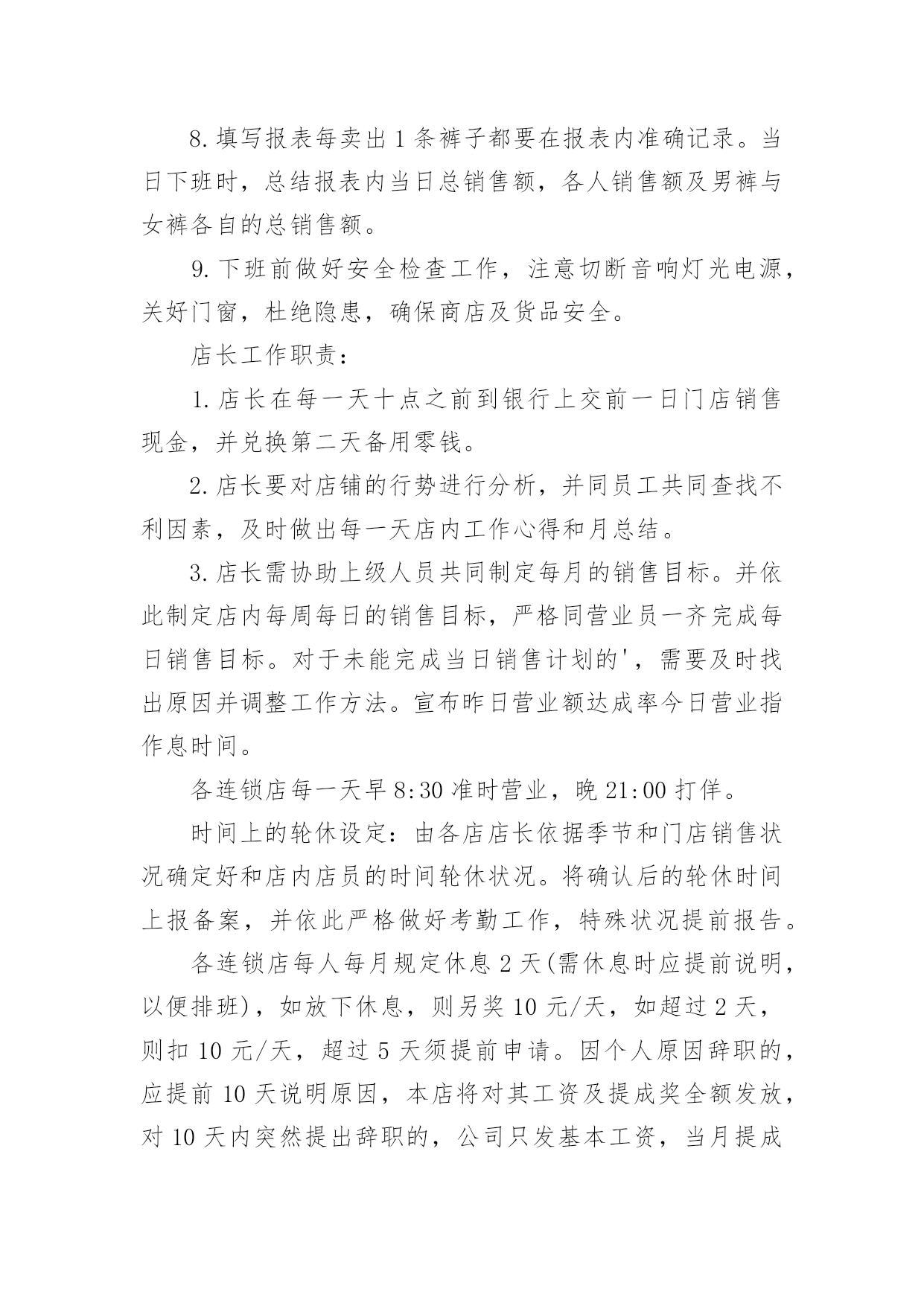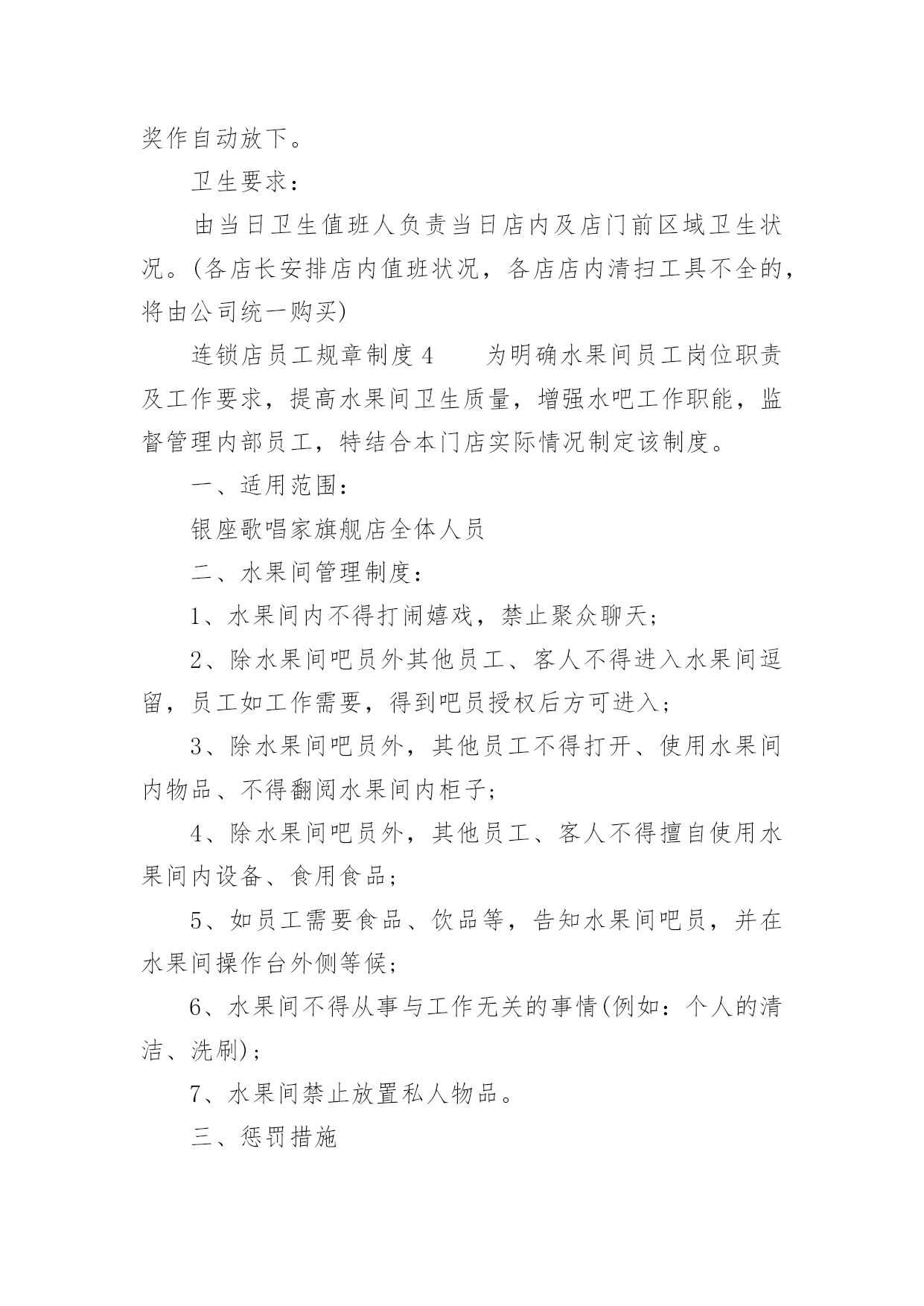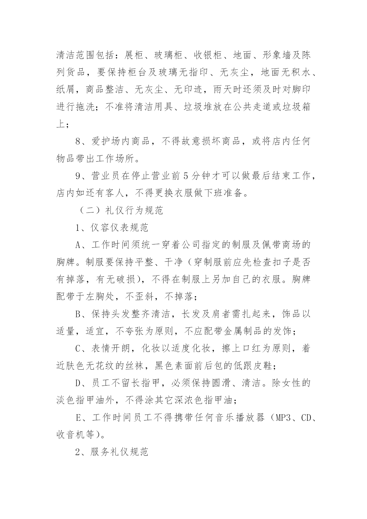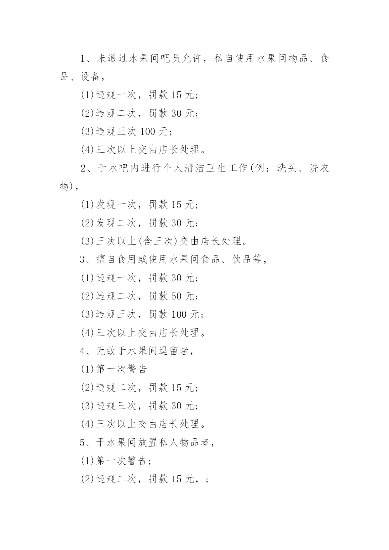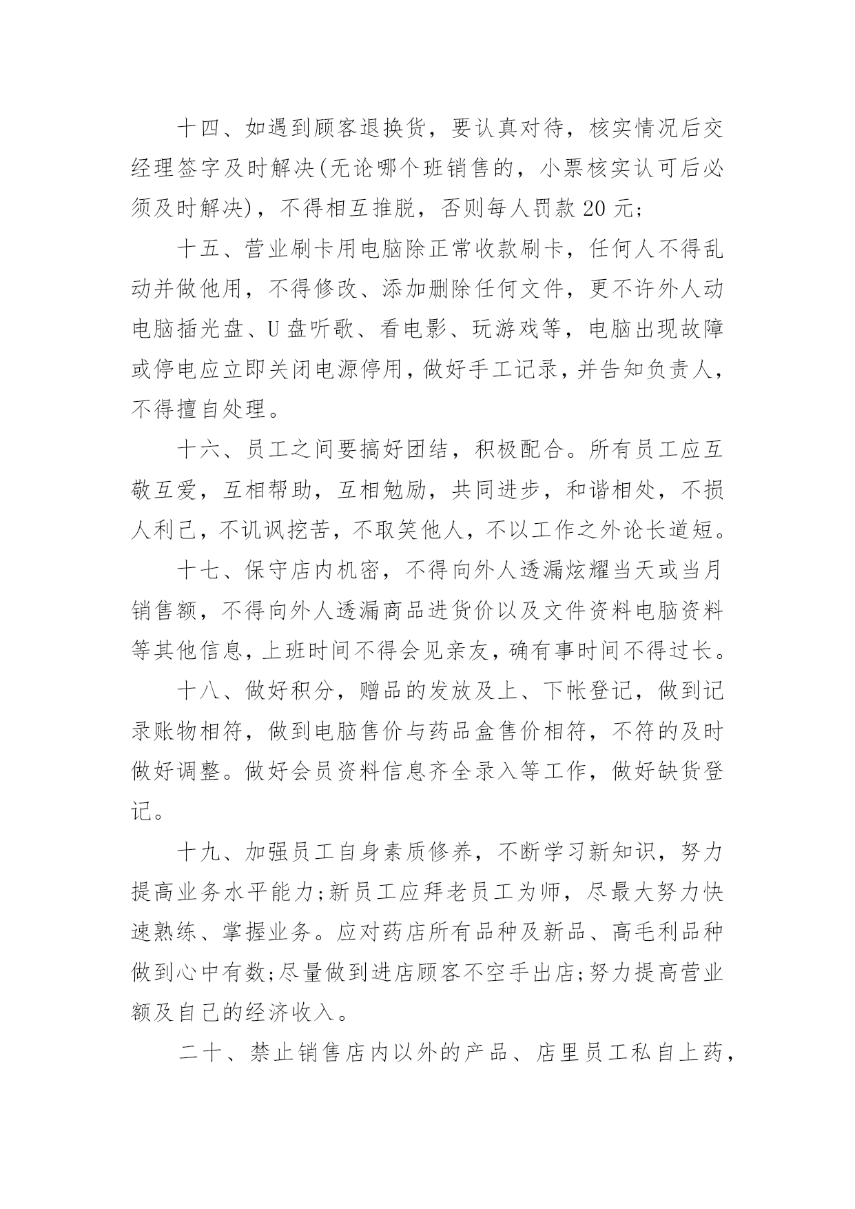 连锁店员工规章制度连锁店员工规章制度(精选5篇)在生活中,我们每个人都可能会接触到制度,制度一般指要求大家共同遵守的办事规程或行动准则,也指在一定历史条件下形成的法令、礼俗等规范或一定的规格。想必许多人都在为如何制定制度而烦恼吧,下面是小编为大家收集的连锁店员工规章制度(精选5篇),欢迎阅读与收藏。连锁店员工规章制度1(一)工作纪律1、上班时间不准在商场内吃零食、玩游戏,不准离岗、串岗,不准聚集在一起聊天、嬉笑、喧哗;不准在工作时间吃食物、看书、报、看杂志、做私事;不准在营业时间内会客、带小孩、带宠物,或逗玩亲朋好友的小孩;2、注意个人及公司形象,不得在营业场所内将手插入袋内站立或行走,不准将手搭撑在货架上,不准坐在货架、货箱及货品上;3、上班须用礼貌用语,提高销售技巧。接待顾客态度要和蔼,不准与顾客顶嘴、吵架、或打骂、殴打顾客;4、上班时间必须保持店内有人照顾,不准2个以上同时饮水或上厕所,不准店内同时有二位以上营业员当班而出现只有一个人在柜内15分钟以上。违者以空柜处理,处罚条例按商场管理条例执行;5、发现顾客在自己店内吸烟,要委婉地加以制止;6、注重个人及店内卫生,每天早晚进行一次清洁工作,清洁范围包括:展柜、玻璃柜、收银柜、地面、形象墙及陈列货品,要保持柜台及玻璃无指印、无灰尘,地面无积水、纸屑,商品整洁、无灰尘、无印迹,雨天时还须及时对脚印进行拖洗;不准将清洁用具、垃圾堆放在公共走道或垃圾箱上;8、爱护场内商品,不得故意损坏商品,或将店内任何物品带出工作场所。9、营业员在停止营业前5分钟才可以做最后结束工作,店内如还有客人,不得更换衣服做下班准备。(二)礼仪行为规范1、仪容仪表规范A、工作时间须统一穿着公司指定的制服及佩带商场的胸牌。制服要保持平整、干净(穿制服前应先检查扣子是否有掉落,有无破损),不得在制服上另加自己的衣服。胸牌配带于左胸处,不歪斜,不掉落;B、保持头发整齐清洁,长发及肩者需扎起来,饰品以适量,适宜,不夸张为原则,不应配带金属制品的发饰;C、表情开朗,化妆以适度化妆,擦上口红为原则,着近肤色无花纹的丝袜,黑色素面前后包的低跟皮鞋;D、员工不留长指甲,必须保持圆滑、清洁。除女性的淡色指甲油外,不得涂其它深浓色指甲油;E、工作时间员工不得携带任何音乐播放器(MP3、CD、收音机等)。2、服务礼仪规范使用“微笑服务”是整个服务礼仪规范的前提与标准A、站立:头正、双目平视、嘴唇微闭、两肩放松、躯干挺直、双臂自然下垂于身体两侧;B、走路:双目向前自然平视、微收下颌,面带微笑、双臂前后自然摆动;C、鞠躬:立正姿势,保持端正、双手放于身体两侧或体前搭好、身体略向前倾。D、礼貌用语:顾客进店时,说“欢迎光临”。顾客出店时,说“欢迎下次光临”。连锁店员工规章制度2一、药店实行两种工作制夏天:全天:上午8:00至下午6点;半天班:早上7点30至中午1点,下午1点至晚上9点。冬天:全天:上午8:00至下午5点半;半天班:早上7点30至中午1点,下午1点至晚上7点半。不迟到早退,不无辜缺班,不擅自脱离岗位,有事提前向大堂经理请假,仅限1天,2天以上向副总经理请假。每月累计迟到或早退三次,扣发一日基本工资,未经批准缺勤、离岗或上下班时间迟到或早退30分钟以上按旷工处理。二、树立“质量第一,顾客至上”的营业观念,严格遵守执行道德行为规范,为顾客提供热情优质的服务。三、员工上班时应统一着装,穿戴整齐大方、不浓妆艳抹、不留长指甲、不披头散发;工作服要干净整洁。四、店内应每天早晚各做一次卫生,并要做到随脏随打扫,陈列药品的柜架要保持整洁明亮,应按分类将药品摆放整齐,所陈列商品应无积尘,严禁在营业场所乱放杂物,乱吃零食,不得擅离岗位,闲聊天、喧哗嬉闹、打瞌睡、看小说、带耳机听音乐等有损店员形象且与工作无关的举动,发现一次,罚款10元。五、有顾客时,无论手头做任何工作应立即停止,首先接待顾客。销售药品时要态度认真,思想集中,站立服务、面带微笑、语气平和,并要正确介绍药品性能、用法、用量、禁忌和注意事项。合理搭配销售,不得错配销售药品,要做到百问不厌,百拿不烦,出示药品应动作轻缓,药品接触柜面不得有滑动不能抛扔,闲时要直接递到顾客手中,无论任何理由都不得与顾客争吵。六、员工每天做好半小时的交接班工作,对当天本班的进货入库情况一定要与对班交代清楚,如果发现问题应该及时反映及时解决。七、收银时要站立微笑服务,做到唱收唱付,不出差错,下账时要认真细致,做到及时准确无误,顾客离开时要有送声!比如:慢走、您走好等礼貌用语;当班当天的现金、刷卡核对无误后方可交班交账。找钱时要把硬币放在纸币上或放在顾客手中,不能放在柜台上。八、按时参加开会,学习培训,并要及时做好学习笔记,针剂组每天上班时应做好早晚两次温湿度记录,各组做好处方药销售记录,近效期药品