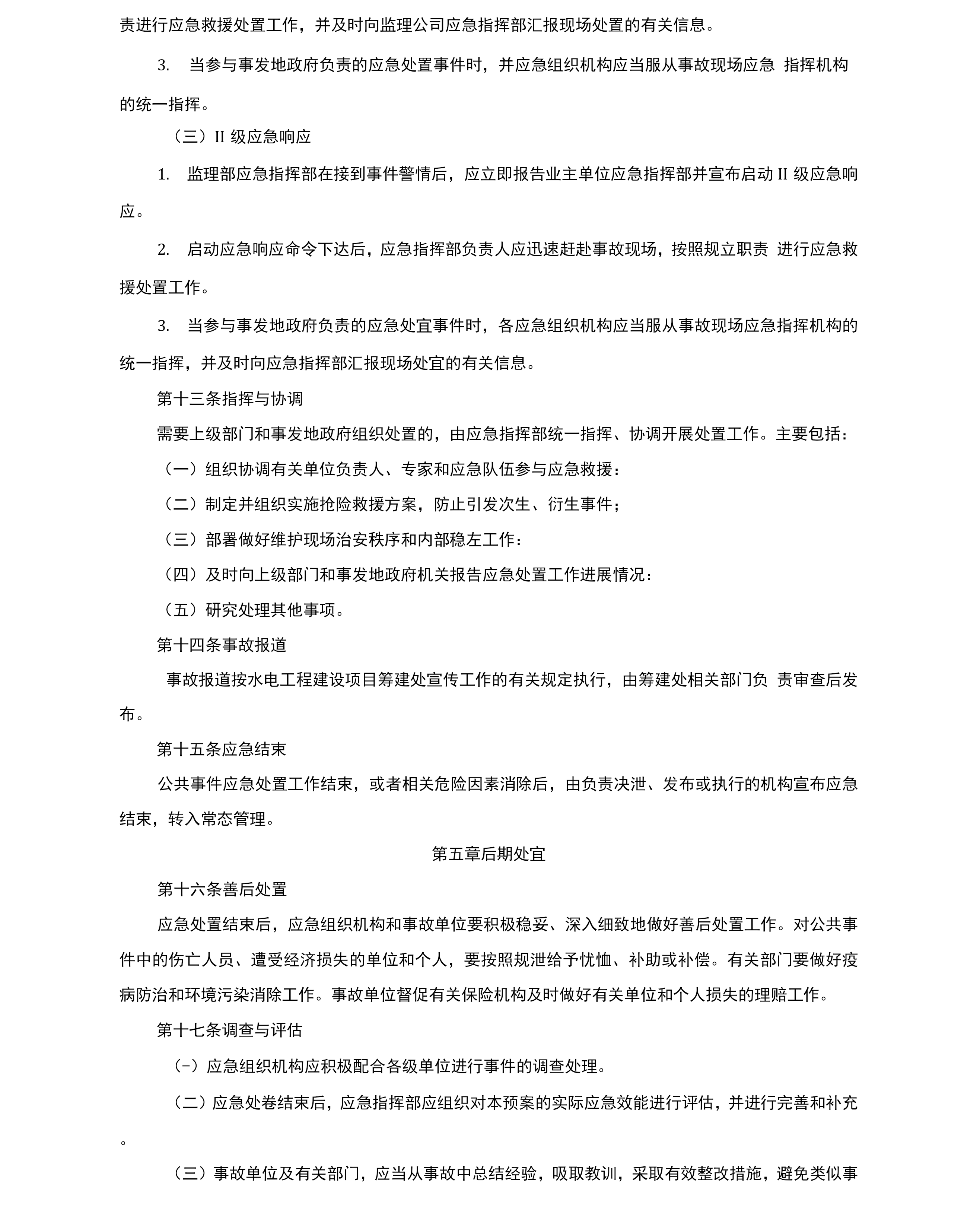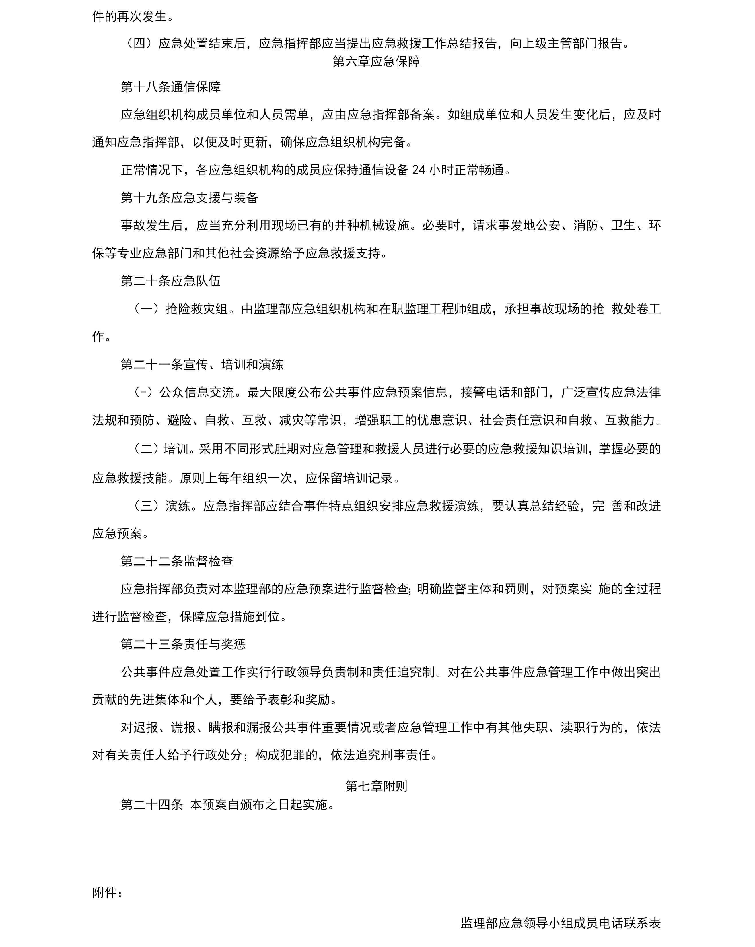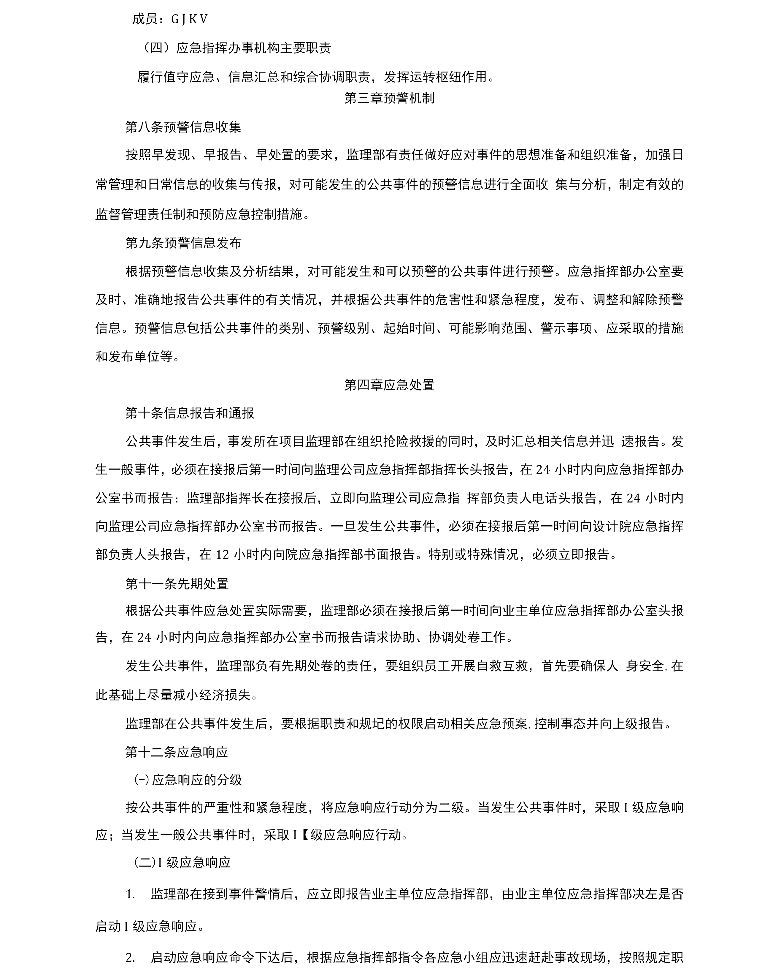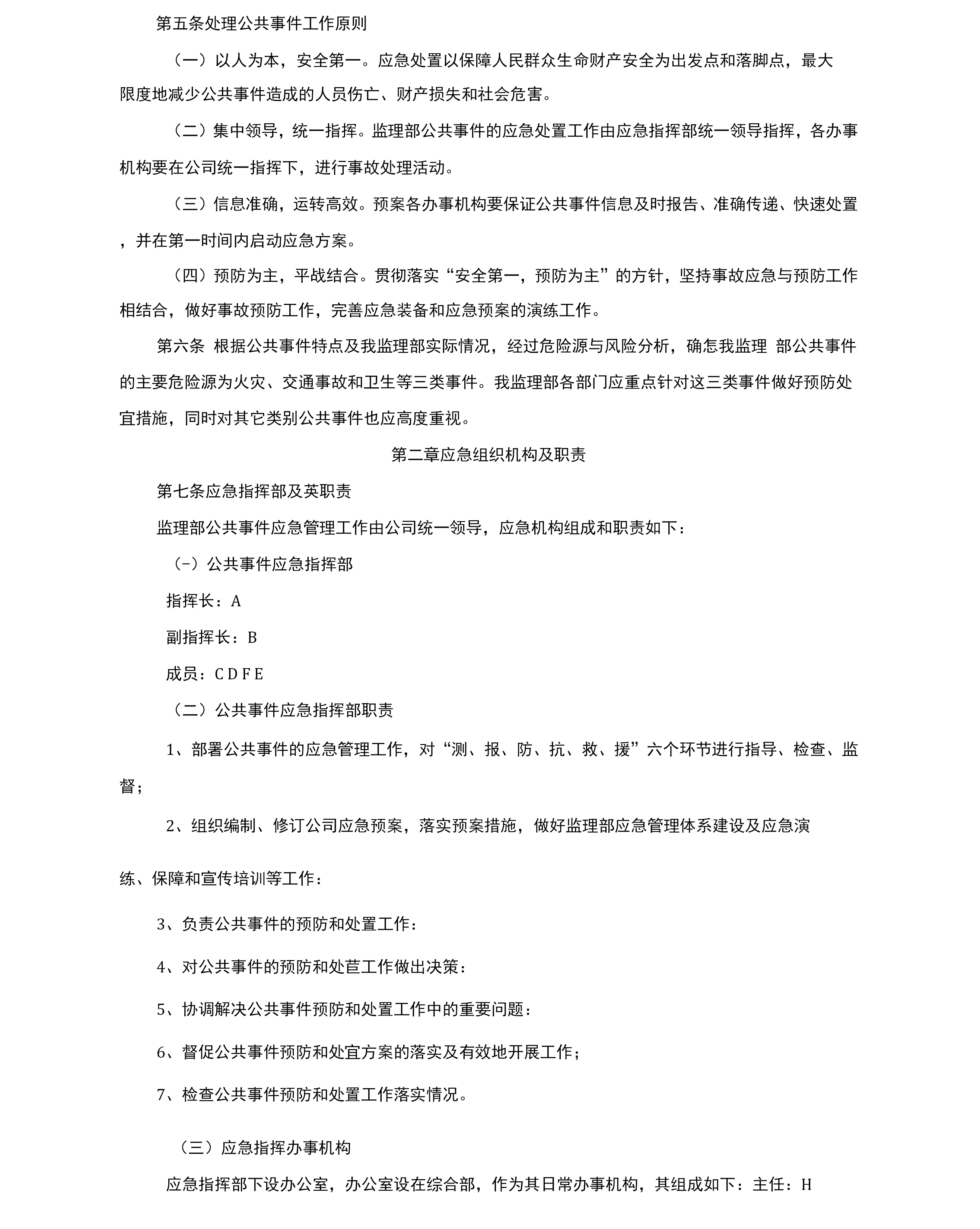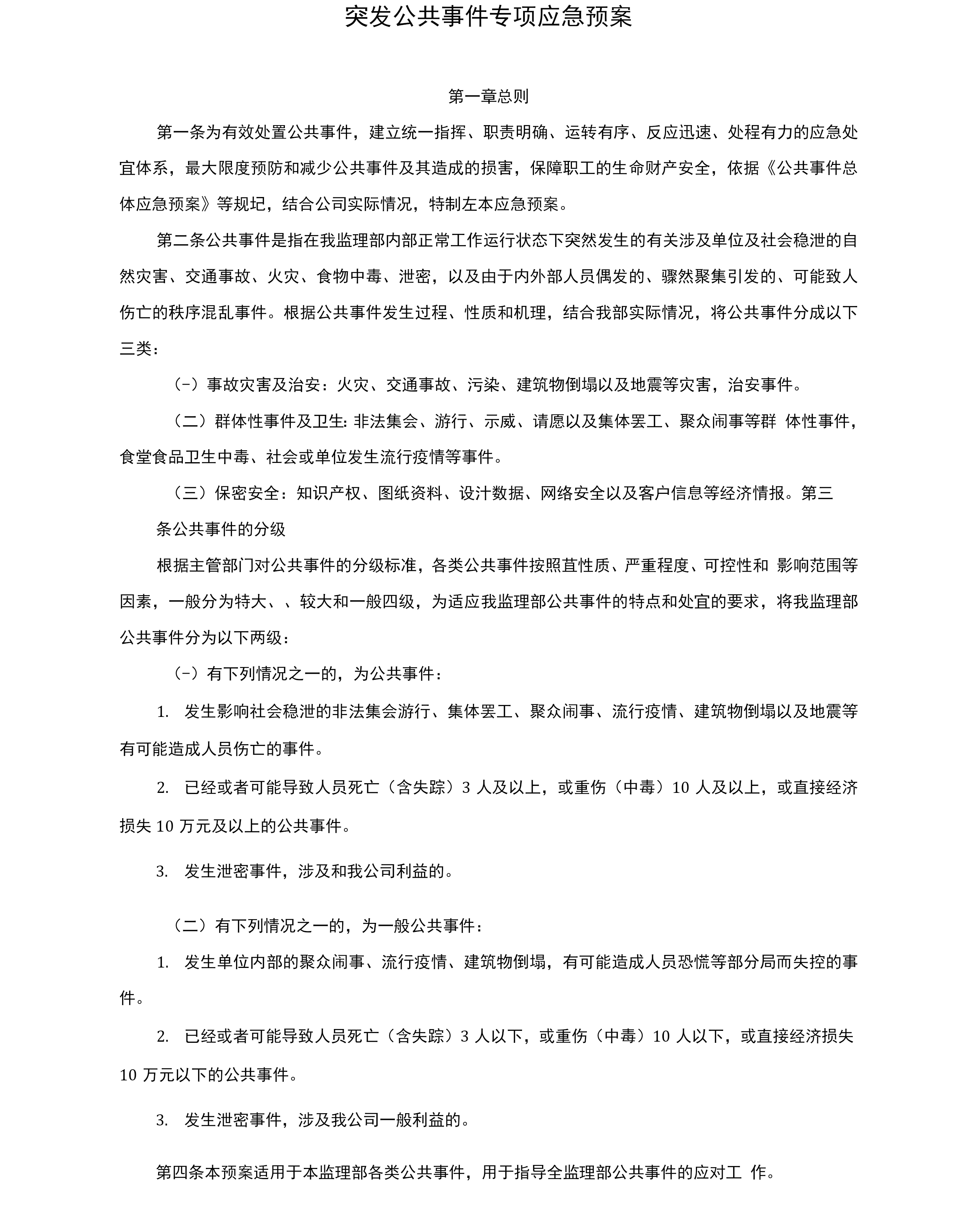 突发公共事件专项应急预案第一章总则第一条为有效处置公共事件,建立统一指挥、职责明确、运转有序、反应迅速、处程有力的应急处宜体系,最大限度预防和减少公共事件及其造成的损害,保障职工的生命财产安全,依据《公共事件总体应急预案》等规圮,结合公司实际情况,特制左本应急预案。第二条公共事件是指在我监理部内部正常工作运行状态下突然发生的有关涉及单位及社会稳泄的自然灾害、交通事故、火灾、食物中毒、泄密,以及由于内外部人员偶发的、骤然聚集引发的、可能致人伤亡的秩序混乱事件。根据公共事件发生过程、性质和机理,结合我部实际情况,将公共事件分成以下三类:(-)事故灾害及治安:火灾、交通事故、污染、建筑物倒塌以及地震等灾害,治安事件。(二)群体性事件及卫生:非法集会、游行、示威、请愿以及集体罢工、聚众闹事等群体性事件,食堂食品卫生中毒、社会或单位发生流行疫情等事件。(三)保密安全:知识产权、图纸资料、设汁数据、网络安全以及客户信息等经济情报。第三条公共事件的分级根据主管部门对公共事件的分级标准,各类公共事件按照苴性质、严重程度、可控性和影响范围等因素,一般分为特大、、较大和一般四级,为适应我监理部公共事件的特点和处宜的要求,将我监理部公共事件分为以下两级:(-)有下列情况之一的,为公共事件:发生影响社会稳泄的非法集会游行、集体罢工、聚众闹事、流行疫情、建筑物倒塌以及地震等有可能造成人员伤亡的事件。已经或者可能导致人员死亡(含失踪)3人及以上,或重伤(中毒)10人及以上,或直接经济损失10万元及以上的公共事件。发生泄密事件,涉及和我公司利益的。(二)有下列情况之一的,为一般公共事件:发生单位内部的聚众闹事、流行疫情、建筑物倒塌,有可能造成人员恐慌等部分局而失控的事件。已经或者可能导致人员死亡(含失踪)3人以下,或重伤(中毒)10人以下,或直接经济损失10万元以下的公共事件。发生泄密事件,涉及我公司一般利益的。第四条本预案适用于本监理部各类公共事件,用于指导全监理部公共事件的应对工作。第五条处理公共事件工作原则(一)以人为本,安全第一。应急处置以保障人民群众生命财产安全为出发点和落脚点,最大限度地减少公共事件造成的人员伤亡、财产损失和社会危害。(二)集中领导,统一指挥。监理部公共事件的应急处置工作由应急指挥部统一领导指挥,各办事机构要在公司统一指挥下,进行事故处理活动。(三)信息准确,运转高效。预案各办事机构要保证公共事件信息及时报告、准确传递、快速处置,并在第一时间内启动应急方案。(四)预防为主,平战结合。贯彻落实“安全第一,预防为主”的方针,坚持事故应急与预防工作相结合,做好事故预防工作,完善应急装备和应急预案的演练工作。第六条根据公共事件特点及我监理部实际情况,经过危险源与风险分析,确怎我监理部公共事件的主要危险源为火灾、交通事故和卫生等三类事件。我监理部各部门应重点针对这三类事件做好预防处宜措施,同时对其它类别公共事件也应高度重视。第二章应急组织机构及职责第七条应急指挥部及英职责监理部公共事件应急管理工作由公司统一领导,应急机构组成和职责如下:(-)公共事件应急指挥部指挥长:A副指挥长:B成员:CDFE(二)公共事件应急指挥部职责1、部署公共事件的应急管理工作,对“测、报、防、抗、救、援”六个环节进行指导、检查、监督;2、组织编制、修订公司应急预案,落实预案措施,做好监理部应急管理体系建设及应急演练、保障和宣传培训等工作:3、负责公共事件的预防和处置工作:4、对公共事件的预防和处苣工作做出决策:5、协调解决公共事件预防和处置工作中的重要问题:6、督促公共事件预防和处宜方案的落实及有效地开展工作;7、检查公共事件预防和处置工作落实情况。(三)应急指挥办事机构应急指挥部下设办公室,办公室设在综合部,作为其日常办事机构,其组成如下:主任:H成员:GJKV(四)应急指挥办事机构主要职责履行值守应急、信息汇总和综合协调职责,发挥运转枢纽作用。第三章预警机制第八条预警信息收集按照早发现、早报告、早处置的要求,监理部有责任做好应对事件的思想准备和组织准备,加强日常管理和日常信息的收集与传报,对可能发生的公共事件的预警信息进行全面收集与分析,制定有效的监督管理责任制和预防应急控制措施。第九条预警信息发布根据预警信息收集及分析结果,对可能发生和可以预警的公共事件进行预警。应急指挥部办公室要及时、准确地报告公共事件的有关情况,并根据公共事件的危害性和紧急程度,发布、调整和解除预警信息。预警信息包括公共事件的类别、预警级别、起始时间、可能影响范围、警示事项、应采取的措施和发布单位等。第四章应急处置第十条信息报告和通报公共事件发生后,事发所在项目监理部在组织抢险救援