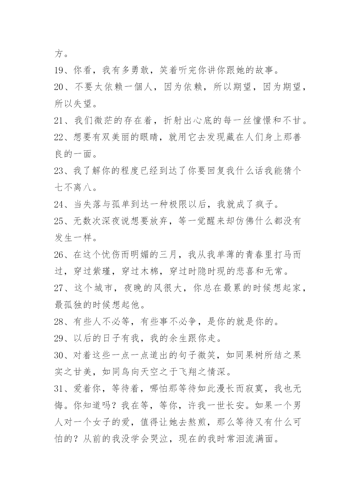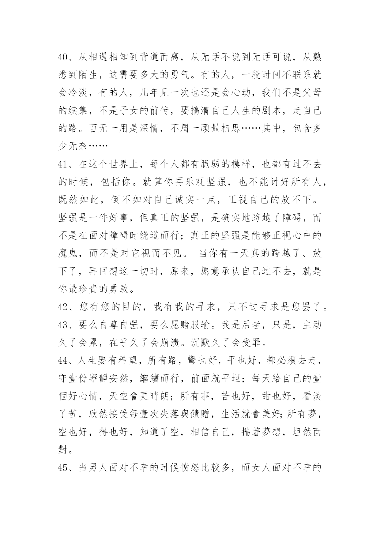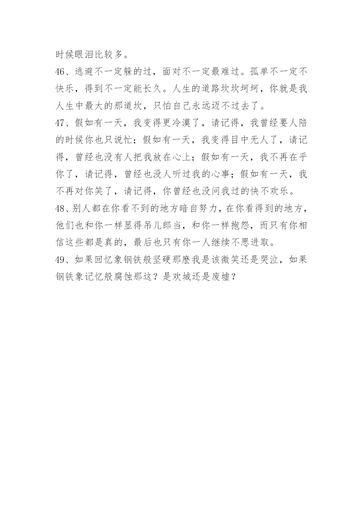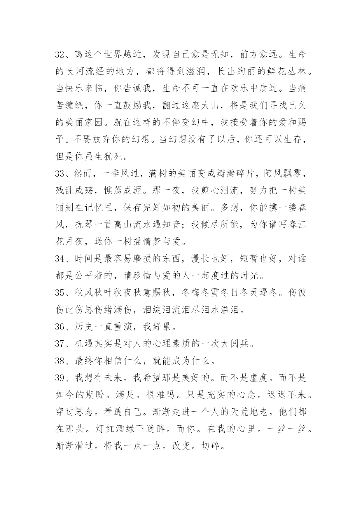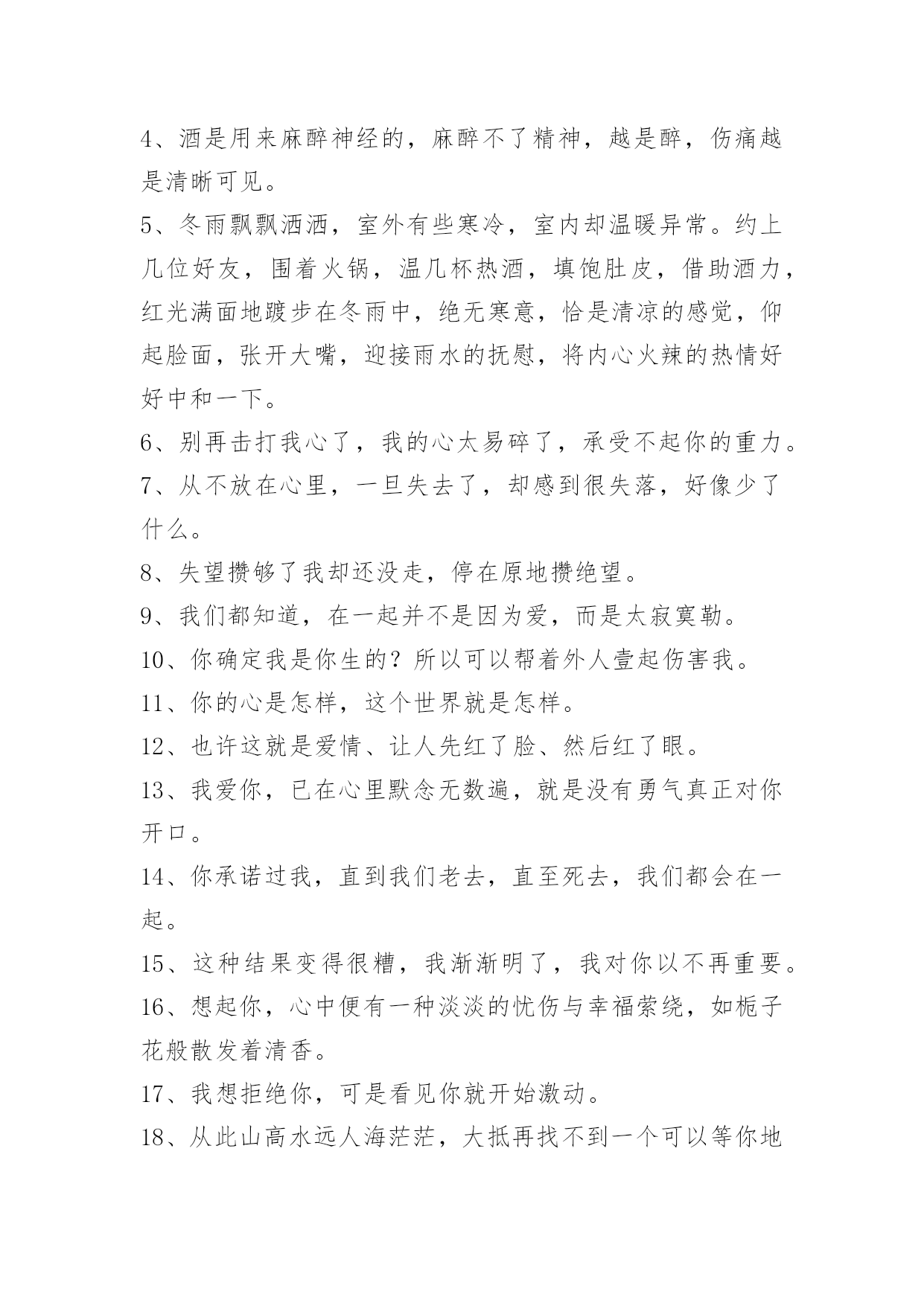 生活伤感句子摘录【精华】2023年生活伤感句子摘录49句已然到来,不必惊慌,随遇而安,爱时请认真,不爱时请珍重。不要伤害爱过的尽管是已经不爱的人,毕竟,相爱的岁月中你们一起走过。更不要为情自伤,这不是爱的本意。下面是小编为大家收集的生活伤感句子49句,供大家参考借鉴,希望可以帮助到有需要的朋友。1、心存美好,则无可恼之事;心存善良,则无可恨之人;心若简单,世间纷扰皆成空。言之美,美在真;人之美,美在善。心怀善念,处处阳光;人有肚量,事事和谐。人与人,不必事事究尽,处处紧逼;事与事,不必处处透明,不留余地。清醒,是一种理智;糊涂,是一种智慧。无论,多少寻觅,多少负累,看开后,风景依旧很美;无论,多少风景,多少心碎,放下了,情怀依旧纯粹。把阳光的一面给世界,自己的生命也会被照亮。2、字里行间透露的唯一就是那种曾经的记忆,大概是记忆值得回忆,也许是回忆值得再次被记忆,用键盘敲打着指缝间流露的淡淡的不舍,每个人的经历或许感伤是必经的荆棘之路,不管是否值得记忆或回忆,但总是有它被值得纪念的价值。总是喜欢在记忆中找寻,总是习惯在回忆中流离,或许此时短暂的停留才是最美好的时刻。3、面对未来,或许无助,或许迷茫,但绝不依赖。4、酒是用来麻醉神经的,麻醉不了精神,越是醉,伤痛越是清晰可见。5、冬雨飘飘洒洒,室外有些寒冷,室内却温暖异常。约上几位好友,围着火锅,温几杯热酒,填饱肚皮,借助酒力,红光满面地踱步在冬雨中,绝无寒意,恰是清凉的感觉,仰起脸面,张开大嘴,迎接雨水的抚慰,将内心火辣的热情好好中和一下。6、别再击打我心了,我的心太易碎了,承受不起你的重力。7、从不放在心里,一旦失去了,却感到很失落,好像少了什么。8、失望攒够了我却还没走,停在原地攒绝望。9、我们都知道,在一起并不是因为爱,而是太寂寞勒。10、你确定我是你生的?所以可以帮着外人壹起伤害我。11、你的心是怎样,这个世界就是怎样。12、也许这就是爱情、让人先红了脸、然后红了眼。13、我爱你,已在心里默念无数遍,就是没有勇气真正对你开口。14、你承诺过我,直到我们老去,直至死去,我们都会在一起。15、这种结果变得很糟,我渐渐明了,我对你以不再重要。16、想起你,心中便有一种淡淡的忧伤与幸福萦绕,如栀子花般散发着清香。17、我想拒绝你,可是看见你就开始激动。18、从此山高水远人海茫茫,大抵再找不到一个可以等你地方。19、你看,我有多勇敢,笑着听完你讲你跟她的故事。20、不要太依赖一個人,因为依赖,所以期望,因为期望,所以失望。21、我们微茫的存在着,折射出心底的每一丝憧憬和不甘。22、想要有双美丽的眼睛,就用它去发现藏在人们身上那善良的一面。23、我了解你的程度已经到达了你要回复我什么话我能猜个七不离八。24、当失落与孤单到达一种极限以后,我就成了疯子。25、无数次深夜说想要放弃,等一觉醒来却仿佛什么都没有发生一样。26、在这个忧伤而明媚的三月,我从我单薄的青春里打马而过,穿过紫瑾,穿过木棉,穿过时隐时现的悲喜和无常。27、这个城市,夜晚的风很大,你总在最累的时候想起家,最孤独的时候想起他。28、有些人不必等,有些事不必争,是你的就是你的。29、以后的日子有我,我的余生跟你走。30、对着这些一点一点道出的句子微笑,如同果树所结之果实之甘美,如同鸟向天空之于飞翔之情深。31、爱着你,等待着,哪怕那等待如此漫长而寂寞,我也无悔。你知道吗?我在等,等你,许我一世长安。如果一个男人对一个女子的爱,值得让她去熬煎,那么等待又有什么可怕的?从前的我没学会哭泣,现在的我时常泪流满面。32、离这个世界越近,发现自己愈是无知,前方愈远。生命的长河流经的地方,都将得到滋润,长出绚丽的鲜花丛林。当快乐来临,你告诚我,生命不可一直在欢乐中度过。当痛苦缠绕,你一直鼓励我,翻过这座大山,将是我们寻找已久的美丽家园。就在这样的不停变幻中,我接受着你的爱和赐予。不要放弃你的幻想。当幻想没有了以后,你还可以生存,但是你虽生犹死。33、然而,一季风过,满树的美丽变成瓣瓣碎片,随风飘零,残乱成殇,憔蔫成泥。那一夜,我煎心泪流,努力把一树美丽刻在记忆里,保存完好如初的美丽。多想,你能携一缕春风,抚琴一首高山流水遇知音;我倾尽所能,为你谱写春江花月夜,送你一树摇情梦与爱。34、时间是最容易磨损的东西,漫长也好,短暂也好,对谁都是公平着的,请珍惜与爱的人一起度过的时光。35、秋风秋叶秋夜秋意赐秋,冬梅冬雪冬日冬灵逼冬。伤彼伤此伤思伤绪满伤,泪绽泪流泪尽泪水溢泪。36、历史一直重演,我好累。37、机遇其实是对人的心理素质的一次大阅兵。38、最终你相信什么,就能成为什么。39、我想有未来。我希望那是美好的。而不是虚度。而不是如今的期盼。满足。很难吗。只是充实的心念。迟迟不来。穿过思念。看透自己。渐渐走进一个人的天荒地老。他们都在
