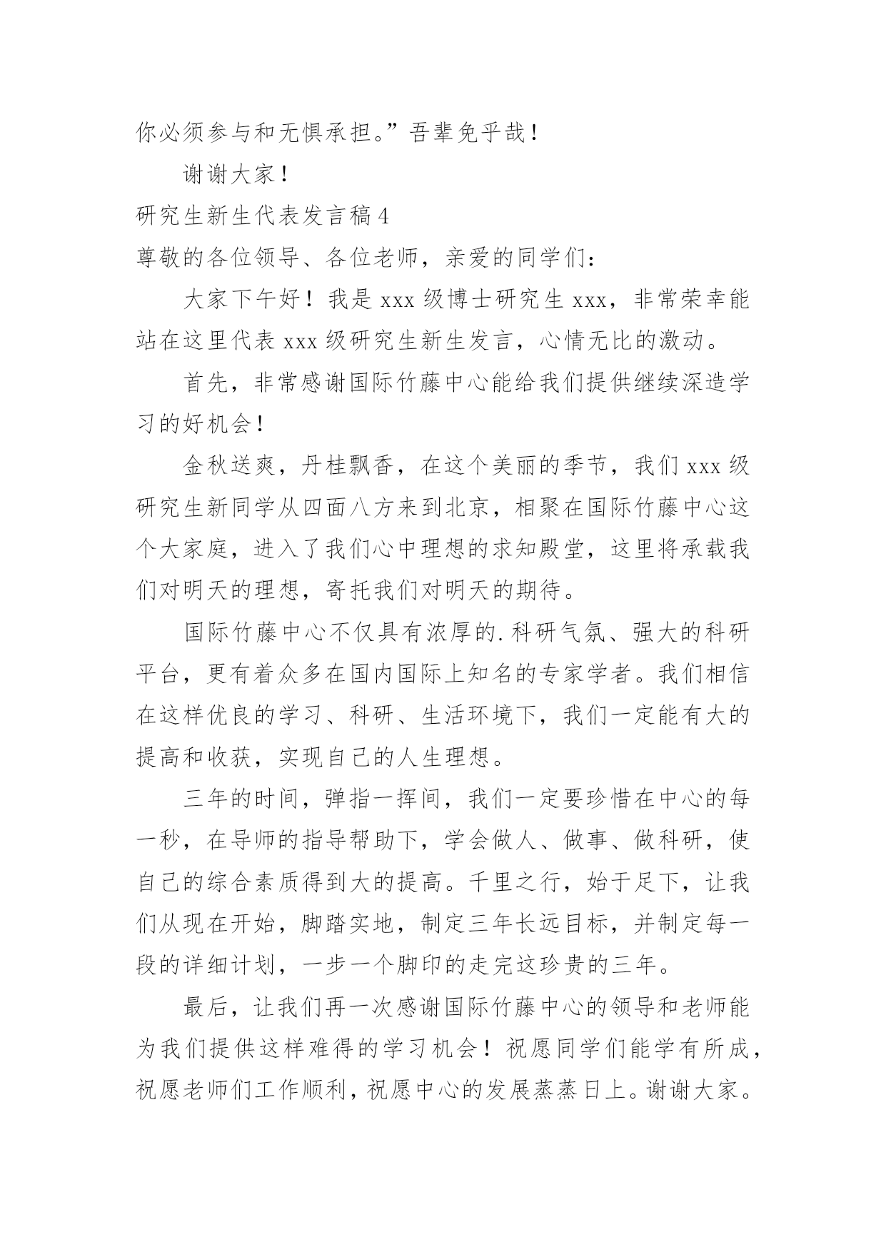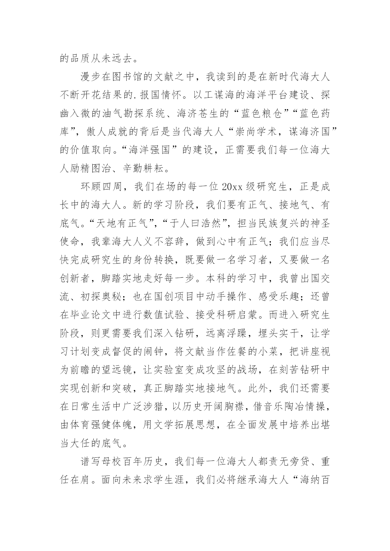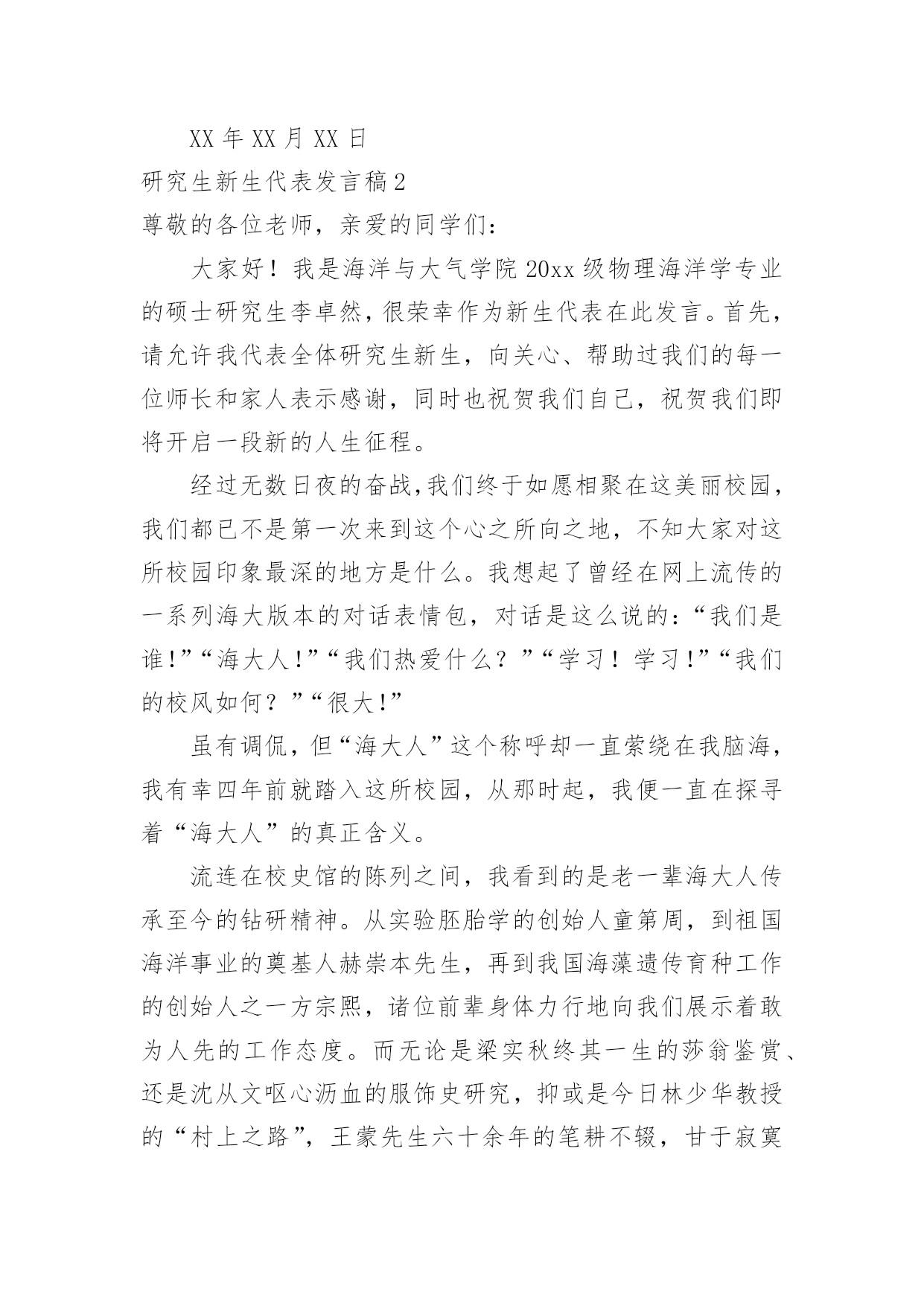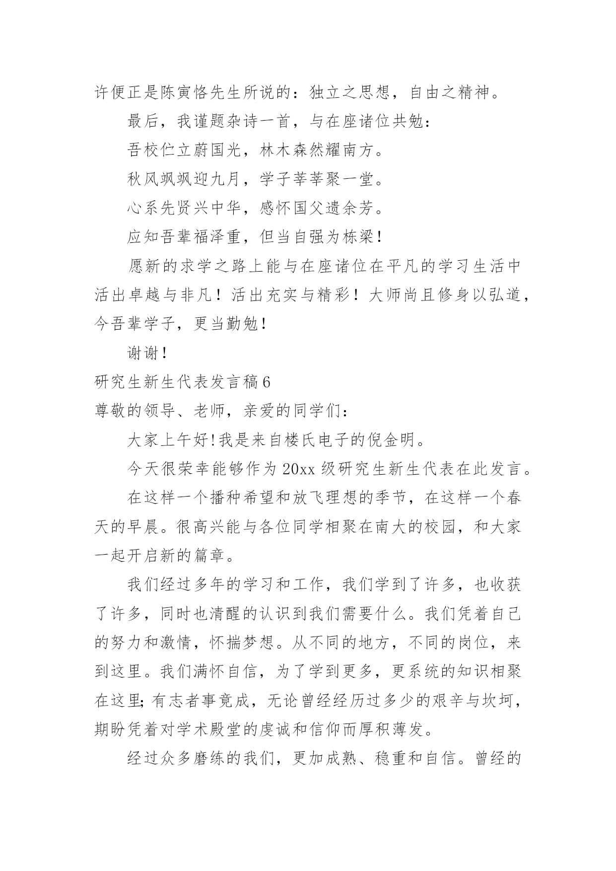 研究生新生代表发言稿研究生新生代表发言稿在不断进步的时代,发言稿使用的情况越来越多,发言稿是在一定的场合,面对一定的听众,发言人围绕着主题讲话的文稿。大家知道发言稿怎么写才正确吗?以下是小编帮大家整理的研究生新生代表发言稿,欢迎大家借鉴与参考,希望对大家有所帮助。研究生新生代表发言稿1尊敬的各位领导、老师,亲爱的同学们!大家好!我是xx学专业xxx,很荣幸能够作为XX级研究生新生代表在此发言。首先,请允许我代表全体新生感谢在这个忙碌的开学季为我们热情服务的各位老师及师长们!亲爱的同学,你一定还记得,去年此时我们还在为理想奋斗拼搏,即使夏日炎炎,即使寒冬腊月,终于在这个充满收获与希望的季节迎来了属于我们的开学礼!古之立大事者,不惟有超世之才,亦必有坚忍不拔之志。求学路上的悲喜见证了我们履行誓言、坚守信念、执着梦想的青春不悔,泪水与汗水的付出已酝酿成了今天踌躇满志的希望,吾生有涯,学而无涯,我们将在牡丹江师范学院这片沃土上开始新的征程。历经半世纪风雨的xxxxx学校在今年迎来了她的XX周年庆典,我们有幸见证了母校的荣光,但我们不能忘却的是一代又一代的师院人在“崇德尚学、厚积薄发”校训的指引下,在学术园地中勤奋耕耘,为国家培养了众多优秀教师,为推动师院科学发展、培育精英人才做出的巨大贡献,前辈们以无愧于时代的光辉业绩铸就了母校今日的辉煌,从师院走出的优秀校友黄万华,著名作家杨乃寅都是我们将要攀登的高峰。十二五期间,学校更是贯穿“师范教育精英化、非师教育卓越化”的人才培养主线,以更名和申博为龙头,全力推进“质量立校、人才强校、特色兴校”三大工程。作为xxxxxx学校的`新成员,我们更应以“师院梦”托起“中国梦”,在研究生新的起点上,我们期待着更多的机遇与挑战,在未来的三年中,除了完成规定课程,还要有意识的培养独立思维和科研的能力,不仅要掌握专业知识,更应具备运用专业知识的能力,博取众长,为发展成为全方位人才目标做积极准备。让我们从学习中认识真理、从独立中体验自主、在计划中把握时间,从追求中获得成长。学而深思、思而后得,做一个有务实精神的理想主义者,有远大理想的务实主义者!最后,在教师节即将到来之际,我谨代表所有学子,向敬爱的老师们道一声节日快乐,祝各位领导、老师身体健康、工作顺利、阖家幸福!祝亲爱的同学们在这块美丽的土地上收获真知与人生的意义!谢谢大家!XX年XX月XX日研究生新生代表发言稿2尊敬的各位老师,亲爱的同学们:大家好!我是海洋与大气学院20xx级物理海洋学专业的硕士研究生李卓然,很荣幸作为新生代表在此发言。首先,请允许我代表全体研究生新生,向关心、帮助过我们的每一位师长和家人表示感谢,同时也祝贺我们自己,祝贺我们即将开启一段新的人生征程。经过无数日夜的奋战,我们终于如愿相聚在这美丽校园,我们都已不是第一次来到这个心之所向之地,不知大家对这所校园印象最深的地方是什么。我想起了曾经在网上流传的一系列海大版本的对话表情包,对话是这么说的:“我们是谁!”“海大人!”“我们热爱什么?”“学习!学习!”“我们的校风如何?”“很大!”虽有调侃,但“海大人”这个称呼却一直萦绕在我脑海,我有幸四年前就踏入这所校园,从那时起,我便一直在探寻着“海大人”的真正含义。流连在校史馆的陈列之间,我看到的是老一辈海大人传承至今的钻研精神。从实验胚胎学的创始人童第周,到祖国海洋事业的奠基人赫崇本先生,再到我国海藻遗传育种工作的创始人之一方宗熙,诸位前辈身体力行地向我们展示着敢为人先的工作态度。而无论是梁实秋终其一生的莎翁鉴赏、还是沈从文呕心沥血的服饰史研究,抑或是今日林少华教授的“村上之路”,王蒙先生六十余年的笔耕不辍,甘于寂寞的品质从未远去。漫步在图书馆的文献之中,我读到的是在新时代海大人不断开花结果的.报国情怀。以工谋海的海洋平台建设、探幽入微的油气勘探系统、海济苍生的“蓝色粮仓”“蓝色药库”,傲人成就的背后是当代海大人“崇尚学术,谋海济国”的价值取向。“海洋强国”的建设,正需要我们每一位海大人励精图治、辛勤耕耘。环顾四周,我们在场的每一位20xx级研究生,正是成长中的海大人。新的学习阶段,我们要有正气、接地气、有底气。“天地有正气”,“于人曰浩然”,担当民族复兴的神圣使命,我辈海大人义不容辞,做到心中有正气;我们应当尽快完成研究生的身份转换,既要做一名学习者,又要做一名创新者,脚踏实地走好每一步。本科的学习中,我曾出国交流、初探奥秘;也在国创项目中动手操作、感受乐趣;还曾在毕业论文中进行数值试验、接受科研启蒙。而进入研究生阶段,则更需要我们深入钻研,远离浮躁,埋头实干,让学习计划变成督促的闹钟,将文献当作佐餐的小菜,把讲座视为前瞻的望远镜,让实验室变成攻坚的战场,在刻苦钻研中实现创新和突破,真正脚踏实地接地气。此外,我们还需要在日常生活中广泛涉