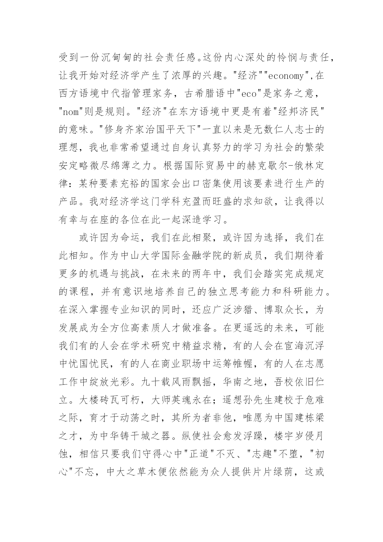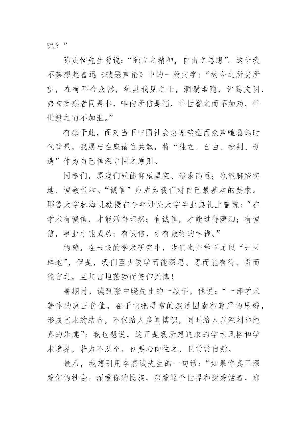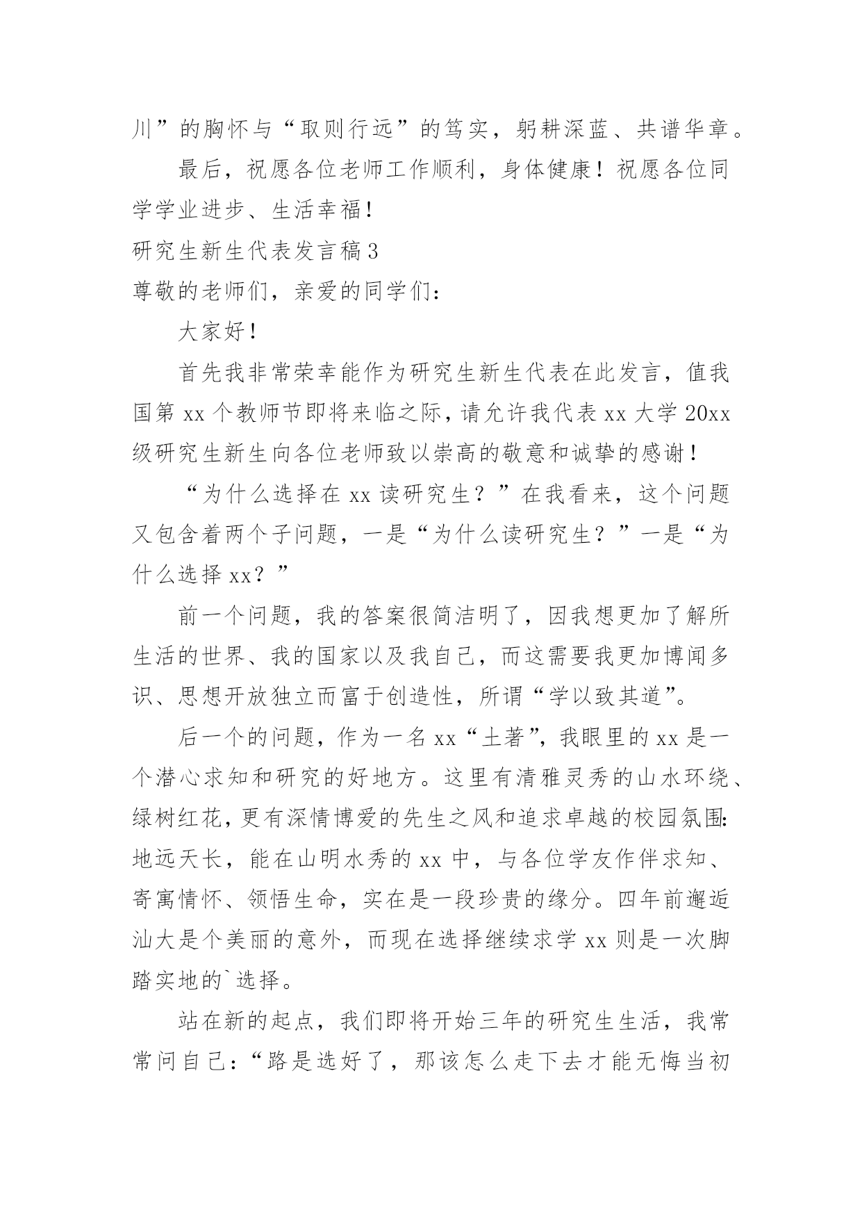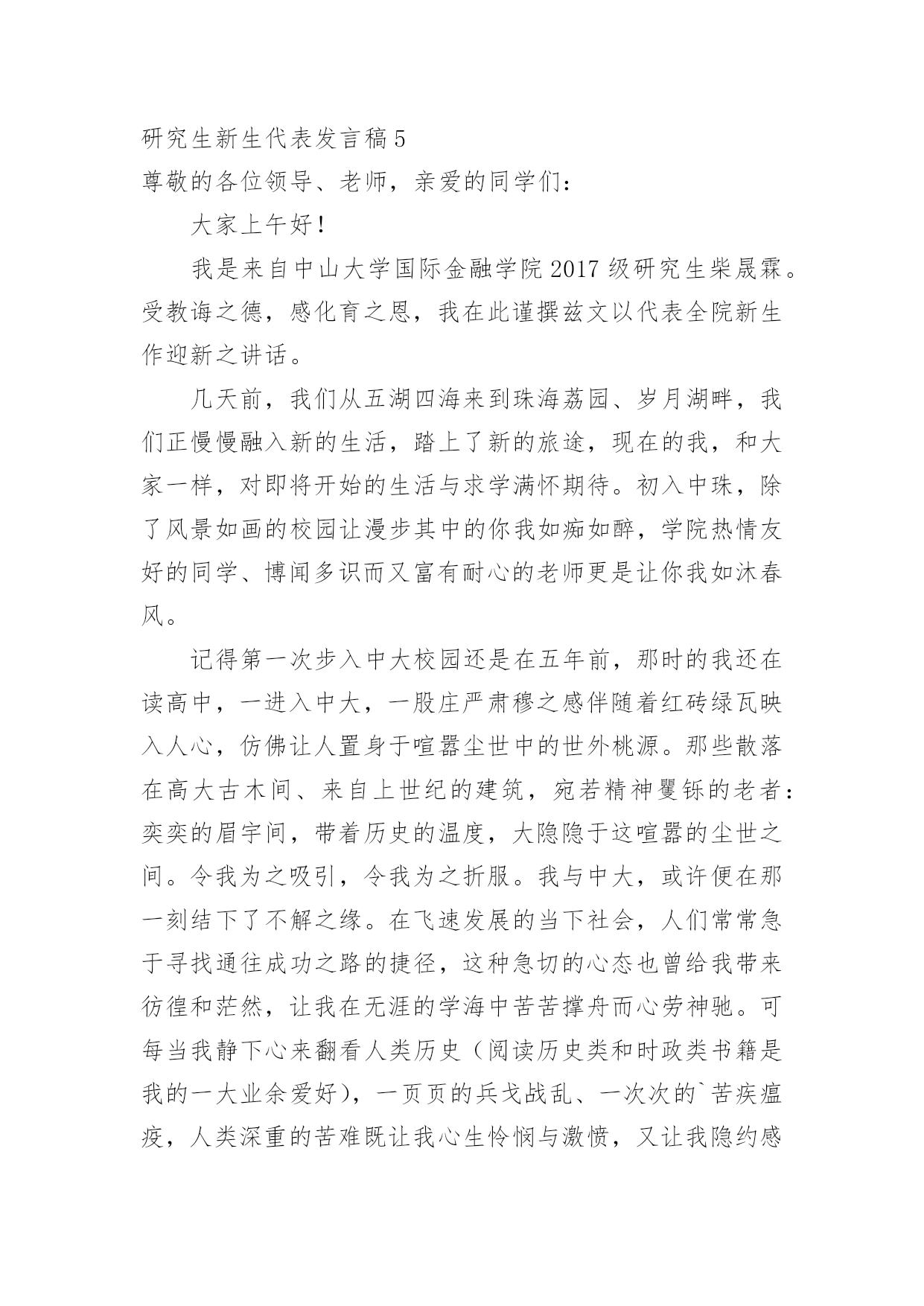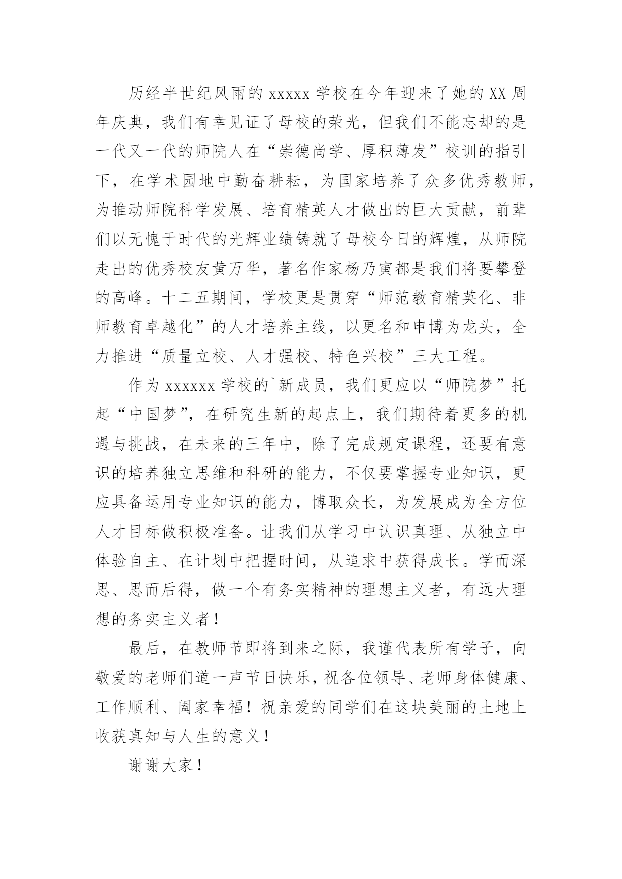 研究生新生代表发言稿研究生新生代表发言稿在不断进步的时代,发言稿使用的情况越来越多,发言稿是在一定的场合,面对一定的听众,发言人围绕着主题讲话的文稿。大家知道发言稿怎么写才正确吗?以下是小编帮大家整理的研究生新生代表发言稿,欢迎大家借鉴与参考,希望对大家有所帮助。研究生新生代表发言稿1尊敬的各位领导、老师,亲爱的同学们!大家好!我是xx学专业xxx,很荣幸能够作为XX级研究生新生代表在此发言。首先,请允许我代表全体新生感谢在这个忙碌的开学季为我们热情服务的各位老师及师长们!亲爱的同学,你一定还记得,去年此时我们还在为理想奋斗拼搏,即使夏日炎炎,即使寒冬腊月,终于在这个充满收获与希望的季节迎来了属于我们的开学礼!古之立大事者,不惟有超世之才,亦必有坚忍不拔之志。求学路上的悲喜见证了我们履行誓言、坚守信念、执着梦想的青春不悔,泪水与汗水的付出已酝酿成了今天踌躇满志的希望,吾生有涯,学而无涯,我们将在牡丹江师范学院这片沃土上开始新的征程。历经半世纪风雨的xxxxx学校在今年迎来了她的XX周年庆典,我们有幸见证了母校的荣光,但我们不能忘却的是一代又一代的师院人在“崇德尚学、厚积薄发”校训的指引下,在学术园地中勤奋耕耘,为国家培养了众多优秀教师,为推动师院科学发展、培育精英人才做出的巨大贡献,前辈们以无愧于时代的光辉业绩铸就了母校今日的辉煌,从师院走出的优秀校友黄万华,著名作家杨乃寅都是我们将要攀登的高峰。十二五期间,学校更是贯穿“师范教育精英化、非师教育卓越化”的人才培养主线,以更名和申博为龙头,全力推进“质量立校、人才强校、特色兴校”三大工程。作为xxxxxx学校的`新成员,我们更应以“师院梦”托起“中国梦”,在研究生新的起点上,我们期待着更多的机遇与挑战,在未来的三年中,除了完成规定课程,还要有意识的培养独立思维和科研的能力,不仅要掌握专业知识,更应具备运用专业知识的能力,博取众长,为发展成为全方位人才目标做积极准备。让我们从学习中认识真理、从独立中体验自主、在计划中把握时间,从追求中获得成长。学而深思、思而后得,做一个有务实精神的理想主义者,有远大理想的务实主义者!最后,在教师节即将到来之际,我谨代表所有学子,向敬爱的老师们道一声节日快乐,祝各位领导、老师身体健康、工作顺利、阖家幸福!祝亲爱的同学们在这块美丽的土地上收获真知与人生的意义!谢谢大家!XX年XX月XX日研究生新生代表发言稿2尊敬的各位老师,亲爱的同学们:大家好!我是海洋与大气学院20xx级物理海洋学专业的硕士研究生李卓然,很荣幸作为新生代表在此发言。首先,请允许我代表全体研究生新生,向关心、帮助过我们的每一位师长和家人表示感谢,同时也祝贺我们自己,祝贺我们即将开启一段新的人生征程。经过无数日夜的奋战,我们终于如愿相聚在这美丽校园,我们都已不是第一次来到这个心之所向之地,不知大家对这所校园印象最深的地方是什么。我想起了曾经在网上流传的一系列海大版本的对话表情包,对话是这么说的:“我们是谁!”“海大人!”“我们热爱什么?”“学习!学习!”“我们的校风如何?”“很大!”虽有调侃,但“海大人”这个称呼却一直萦绕在我脑海,我有幸四年前就踏入这所校园,从那时起,我便一直在探寻着“海大人”的真正含义。流连在校史馆的陈列之间,我看到的是老一辈海大人传承至今的钻研精神。从实验胚胎学的创始人童第周,到祖国海洋事业的奠基人赫崇本先生,再到我国海藻遗传育种工作的创始人之一方宗熙,诸位前辈身体力行地向我们展示着敢为人先的工作态度。而无论是梁实秋终其一生的莎翁鉴赏、还是沈从文呕心沥血的服饰史研究,抑或是今日林少华教授的“村上之路”,王蒙先生六十余年的笔耕不辍,甘于寂寞的品质从未远去。漫步在图书馆的文献之中,我读到的是在新时代海大人不断开花结果的.报国情怀。以工谋海的海洋平台建设、探幽入微的油气勘探系统、海济苍生的“蓝色粮仓”“蓝色药库”,傲人成就的背后是当代海大人“崇尚学术,谋海济国”的价值取向。“海洋强国”的建设,正需要我们每一位海大人励精图治、辛勤耕耘。环顾四周,我们在场的每一位20xx级研究生,正是成长中的海大人。新的学习阶段,我们要有正气、接地气、有底气。“天地有正气”,“于人曰浩然”,担当民族复兴的神圣使命,我辈海大人义不容辞,做到心中有正气;我们应当尽快完成研究生的身份转换,既要做一名学习者,又要做一名创新者,脚踏实地走好每一步。本科的学习中,我曾出国交流、初探奥秘;也在国创项目中动手操作、感受乐趣;还曾在毕业论文中进行数值试验、接受科研启蒙。而进入研究生阶段,则更需要我们深入钻研,远离浮躁,埋头实干,让学习计划变成督促的闹钟,将文献当作佐餐的小菜,把讲座视为前瞻的望远镜,让实验室变成攻坚的战场,在刻苦钻研中实现创新和突破,真正脚踏实地接地气。此外,我们还需要在日常生活中广泛涉