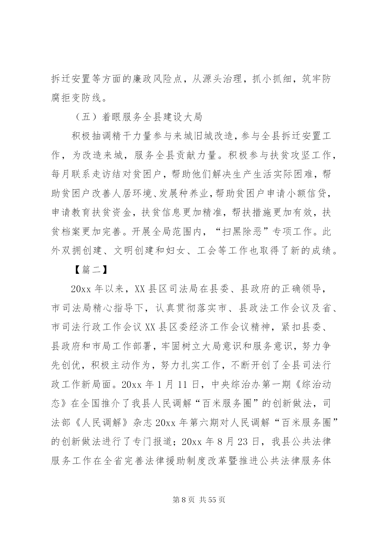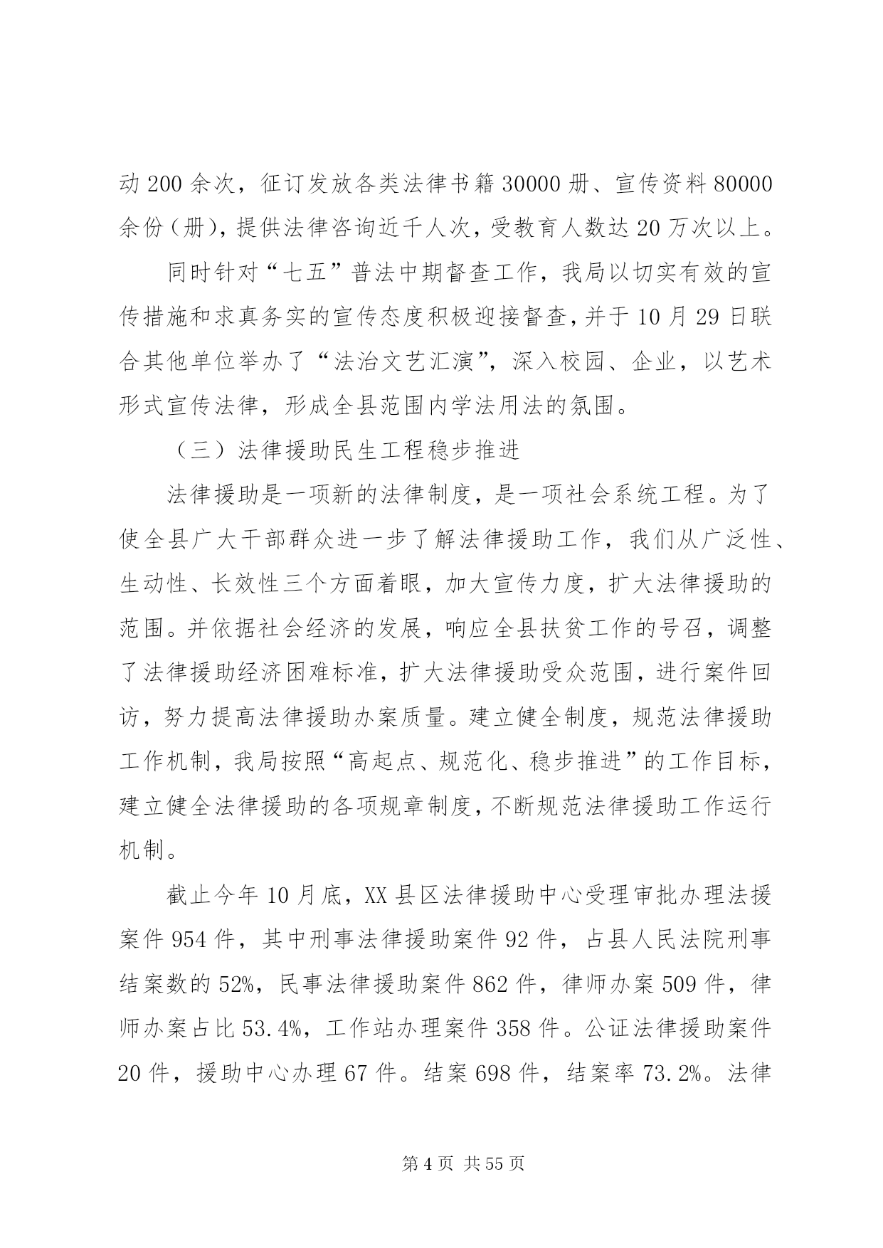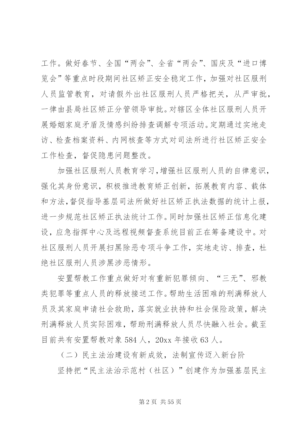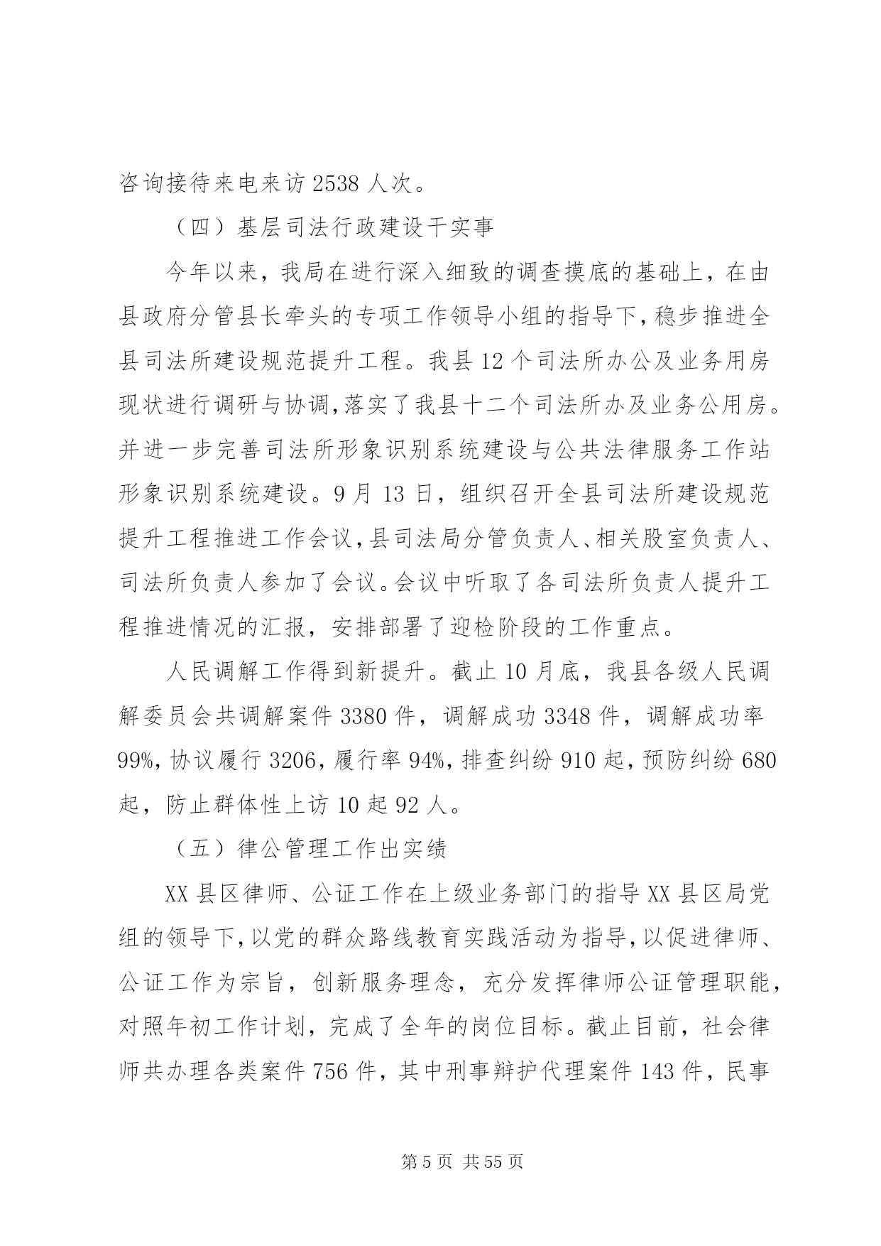 第PAGE\*Arabic\*MERGEFORMAT55页共NUMPAGES\*MERGEFORMAT55页县司法局工作总结5篇文秘网是专业的范文写作网站,每日更新大量热点文章。同时,我们有一支专业的写作团队,为客户提供高质量的原创文章定制服务。如果下面的范文没有合适的,您可以通过企业qq:4000121855或者写作电话:400-012-1855联系我们,我们将为您提供最优质的一对一服务。【篇一】20xx年以来,XX县区司法局在县委、县政府的的正确领导和市司法局精心指导下,坚持以习近平新时代中国特色社会主义思想为指导,认真学习贯彻党的十九大精神,主动作为、扎实工作、开拓进取,不断开创全县司法行政工作新局面,现将今年以来工作总结如下:一、司法行政工作实现新发展(一)特殊人群安全管理出奇招我县认真贯彻实施《社区矫正实施办法》、《XX省社区矫正实施细则》,以及司法部、省、市社区矫正有关文件及会议精神。不断创新工作方法,强化工作举措,促进社区矫正工作有序开展,实现了社区矫正对象无漏管、无脱管、无重新违法犯罪现象发生。截至目前,全县管理社区服刑人员411人,其中全年新入矫178人,解除矫正189人;开展社区影响调查评估214件。加强社区服刑人员日常监管,以及开展特殊时期保安全攻坚工作。做好春节、全国“两会”、全省“两会”、国庆及“进口博览会”等重点时段期间社区矫正安全稳定工作,加强对社区服刑人员监管教育,对请假外出社区服刑人员严格把关,从严审批,一律由县局社区矫正分管领导审批。对辖区全体社区服刑人员开展婚姻家庭矛盾及情感纠纷排查调解专项活动。定期通过实地走访、检查档案资料、内网核查等方式对司法所进行社区矫正安全工作检查,督促隐患问题整改。加强社区服刑人员教育学习,增强社区服刑人员的自律意识,强化其身份意识,积极推进教育矫正创新,拓展教育内容、载体和方法,督促指导基层司法所做好社区矫正执法数据的统计上报,进一步规范社区矫正执法统计工作。同时加强社区矫正信息化建设,应急指挥中心及远程视频督查系统目前正在筹备建设中。对社区服刑人员开展扫黑除恶专项斗争工作,实地走访、排查,杜绝社区服刑人员涉黑涉恶情形。安置帮教工作重点做好对有重新犯罪倾向、“三无”、邪教类犯罪等重点人员的释放接送工作。帮助生活困难的刑满释放人员及其家庭申请社会救助,落实就业扶持和社会保险政策,解决刑满释放人员实际困难,帮助刑满释放人员尽快融入社会。截至目前共有安置帮教对象584人,20xx年接收63人。(二)民主法治建设有新成效,法制宣传迈入新台阶坚持把“民主法治示范村(社区)”创建作为加强基层民主法治建设的一项重要任务来抓,重点围绕健全机制、加强联动、完善评估等方面,认真组织开展美丽集镇和美好乡村法治建设和依法治理,全力化解矛盾纠纷,努力创建和谐社会。今年全县有11个村被命名表彰为“XX市民主法治示范村”,同时,施官镇顿邱村还被申报为第七批“XX省民主法治示范村”。法治文化建设有新阵地。为进一步弘扬宪法精神,营造全社会尊法守法用法的良好氛围,结合来安实际,拟在我县来中公园建设宪法宣传主题公园,主要由法治雕塑、法治小品、宣传栏、宣传灯箱、宪法宣誓墙、插牌、石刻等组成,以图文并茂的形式宣传宪法知识,弘扬宪法精神,让市民在休闲娱乐中感受法治文化的熏陶,形成全民尊崇宪法、学习宪法、维护宪法、运用宪法的浓厚氛围。法治宣传水平有新提升。创新法治宣传形式,与XX县区邮政公司合作建成的“来安普法”微信公众平台,以文字、图片、视频等多种形式向微信用户推送广告10万条,及时发布普法动态、新法速递、典型案例、法治文化等内容,快速地为群众普及了法律知识。先后结合“江淮普法行”、“三下乡”、“双提升”、精准扶贫等,积极开展普法宣传进基层、进乡村专项活动,尤其是结合扶贫工作开展的法律扶贫,向扶贫对象发放法律服务卡等活动,取得良好的社会效果。重点宣传《宪法》《人民调解法》《法律援助条例》等法律法规,今年以来共开展各类法治宣传活动200余次,征订发放各类法律书籍30000册、宣传资料80000余份(册),提供法律咨询近千人次,受教育人数达20万次以上。同时针对“七五”普法中期督查工作,我局以切实有效的宣传措施和求真务实的宣传态度积极迎接督查,并于10月29日联合其他单位举办了“法治文艺汇演”,深入校园、企业,以艺术形式宣传法律,形成全县范围内学法用法的氛围。(三)法律援助民生工程稳步推进法律援助是一项新的法律制度,是一项社会系统工程。为了使全县广大干部群众进一步了解法律援助工作,我们从广泛性、生动性、长效性三个方面着眼,加大宣传力度,扩大法律援助的范围。并依据社会经济的发展,响应全县扶贫工作的号召,调整了法律援助经济困难标准,扩大法律援助受众范围,进行案件回访,努力提高法律援助办