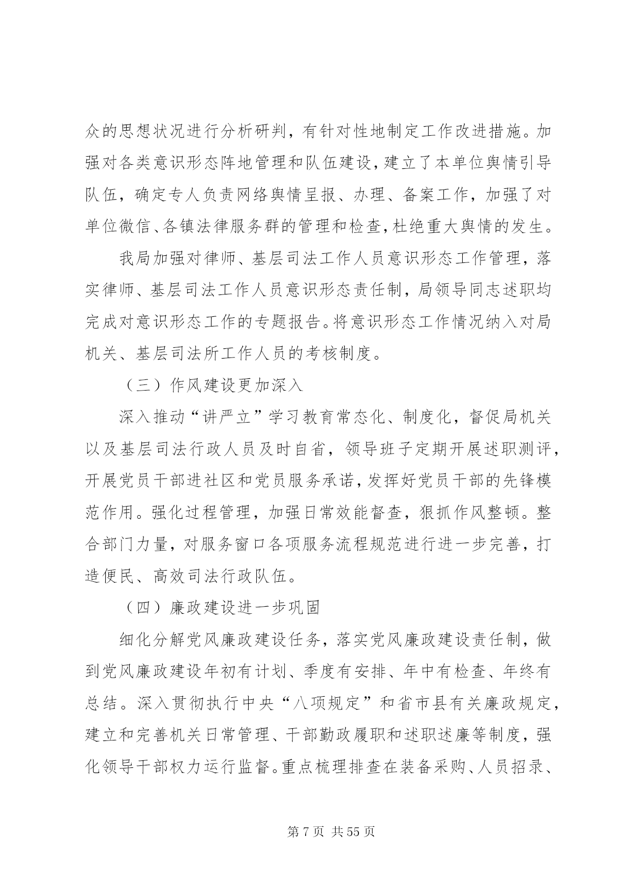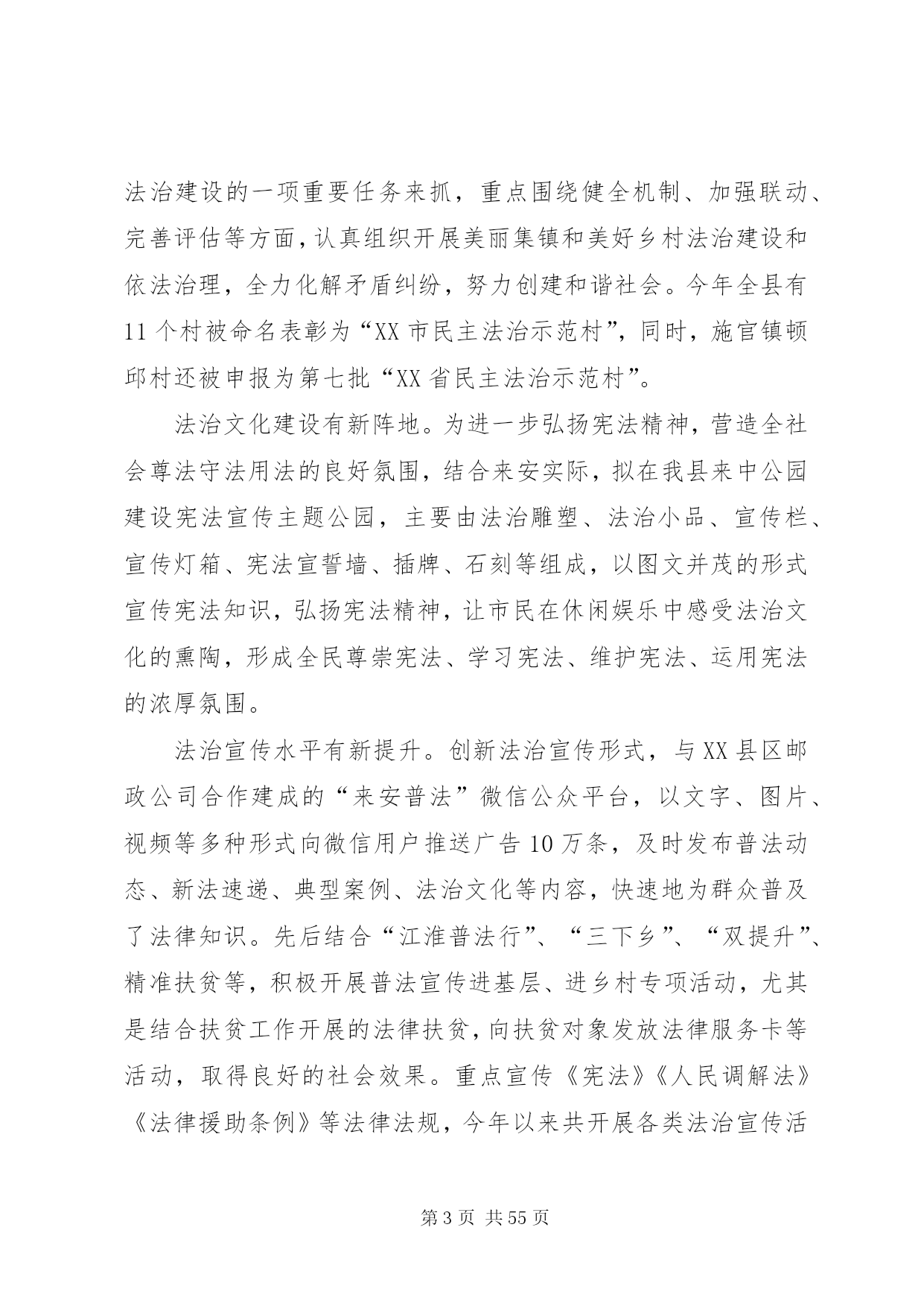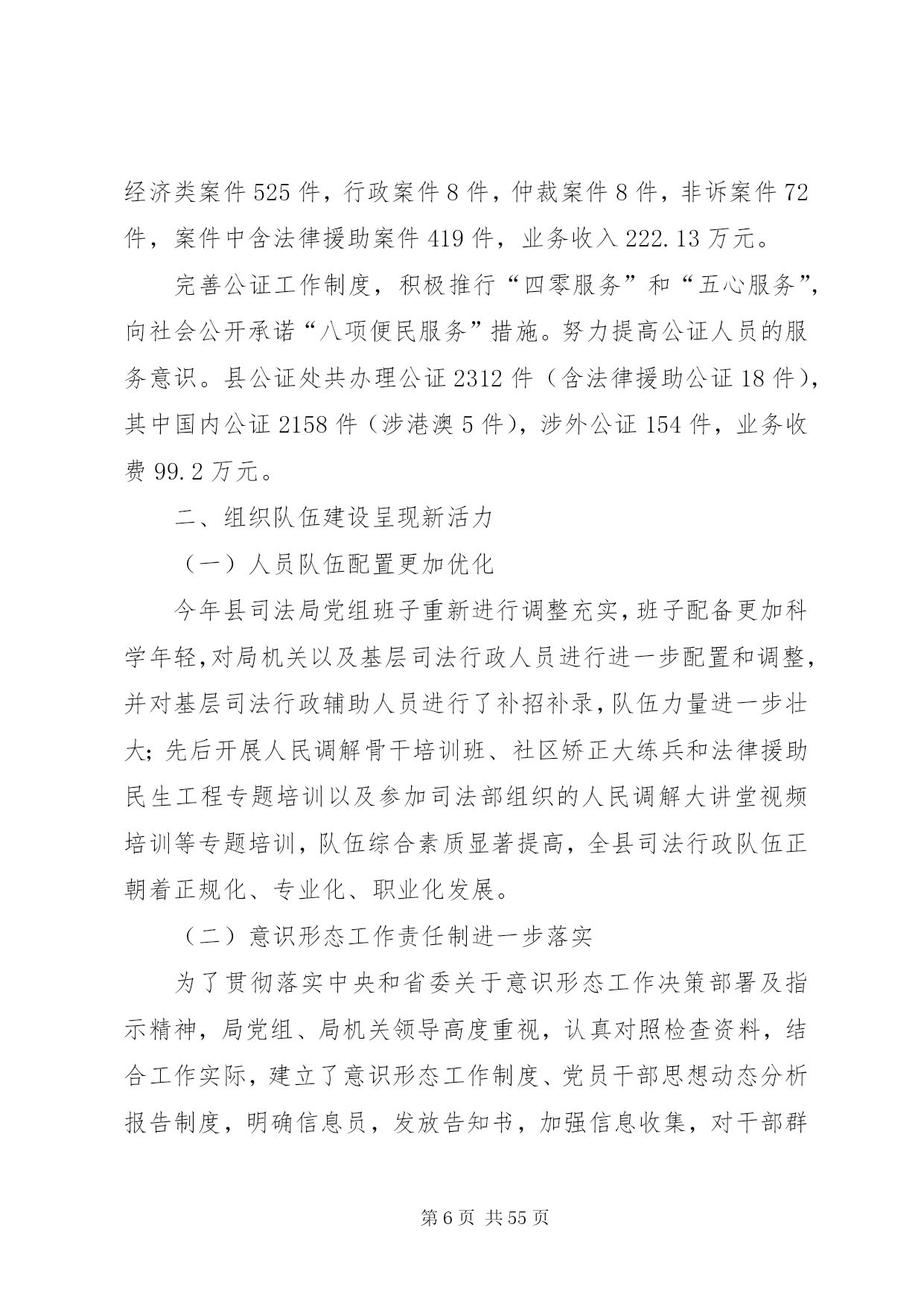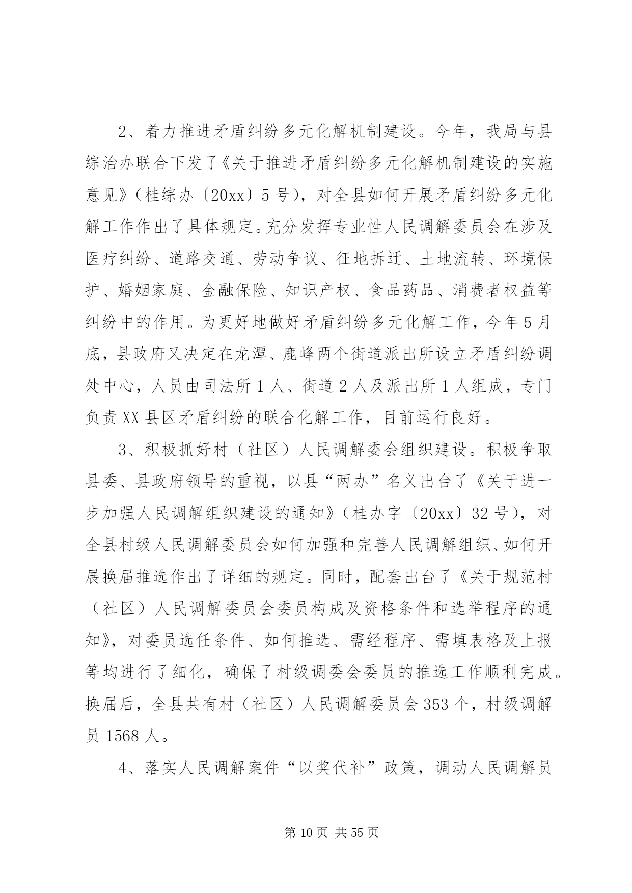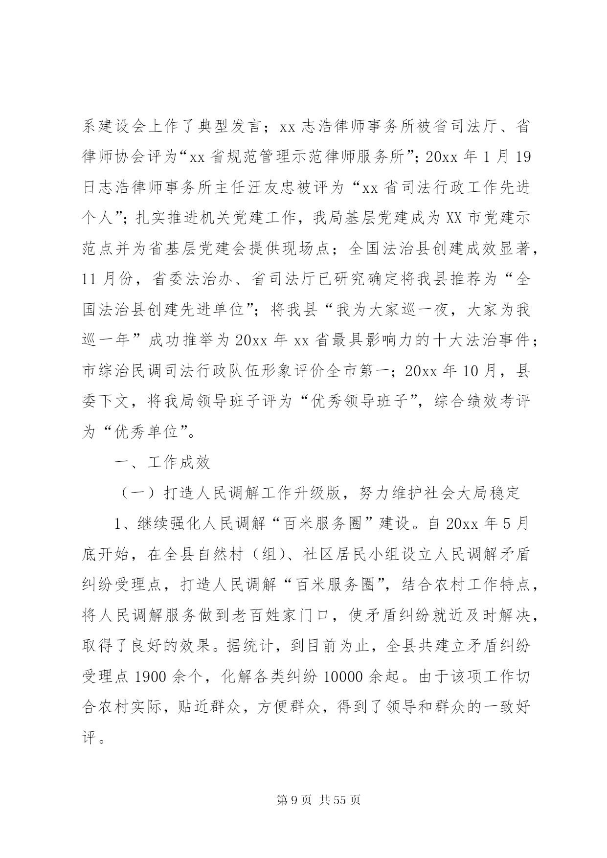 第PAGE\*Arabic\*MERGEFORMAT55页共NUMPAGES\*MERGEFORMAT55页县司法局工作总结5篇文秘网是专业的范文写作网站,每日更新大量热点文章。同时,我们有一支专业的写作团队,为客户提供高质量的原创文章定制服务。如果下面的范文没有合适的,您可以通过企业qq:4000121855或者写作电话:400-012-1855联系我们,我们将为您提供最优质的一对一服务。【篇一】20xx年以来,XX县区司法局在县委、县政府的的正确领导和市司法局精心指导下,坚持以习近平新时代中国特色社会主义思想为指导,认真学习贯彻党的十九大精神,主动作为、扎实工作、开拓进取,不断开创全县司法行政工作新局面,现将今年以来工作总结如下:一、司法行政工作实现新发展(一)特殊人群安全管理出奇招我县认真贯彻实施《社区矫正实施办法》、《XX省社区矫正实施细则》,以及司法部、省、市社区矫正有关文件及会议精神。不断创新工作方法,强化工作举措,促进社区矫正工作有序开展,实现了社区矫正对象无漏管、无脱管、无重新违法犯罪现象发生。截至目前,全县管理社区服刑人员411人,其中全年新入矫178人,解除矫正189人;开展社区影响调查评估214件。加强社区服刑人员日常监管,以及开展特殊时期保安全攻坚工作。做好春节、全国“两会”、全省“两会”、国庆及“进口博览会”等重点时段期间社区矫正安全稳定工作,加强对社区服刑人员监管教育,对请假外出社区服刑人员严格把关,从严审批,一律由县局社区矫正分管领导审批。对辖区全体社区服刑人员开展婚姻家庭矛盾及情感纠纷排查调解专项活动。定期通过实地走访、检查档案资料、内网核查等方式对司法所进行社区矫正安全工作检查,督促隐患问题整改。加强社区服刑人员教育学习,增强社区服刑人员的自律意识,强化其身份意识,积极推进教育矫正创新,拓展教育内容、载体和方法,督促指导基层司法所做好社区矫正执法数据的统计上报,进一步规范社区矫正执法统计工作。同时加强社区矫正信息化建设,应急指挥中心及远程视频督查系统目前正在筹备建设中。对社区服刑人员开展扫黑除恶专项斗争工作,实地走访、排查,杜绝社区服刑人员涉黑涉恶情形。安置帮教工作重点做好对有重新犯罪倾向、“三无”、邪教类犯罪等重点人员的释放接送工作。帮助生活困难的刑满释放人员及其家庭申请社会救助,落实就业扶持和社会保险政策,解决刑满释放人员实际困难,帮助刑满释放人员尽快融入社会。截至目前共有安置帮教对象584人,20xx年接收63人。(二)民主法治建设有新成效,法制宣传迈入新台阶坚持把“民主法治示范村(社区)”创建作为加强基层民主法治建设的一项重要任务来抓,重点围绕健全机制、加强联动、完善评估等方面,认真组织开展美丽集镇和美好乡村法治建设和依法治理,全力化解矛盾纠纷,努力创建和谐社会。今年全县有11个村被命名表彰为“XX市民主法治示范村”,同时,施官镇顿邱村还被申报为第七批“XX省民主法治示范村”。法治文化建设有新阵地。为进一步弘扬宪法精神,营造全社会尊法守法用法的良好氛围,结合来安实际,拟在我县来中公园建设宪法宣传主题公园,主要由法治雕塑、法治小品、宣传栏、宣传灯箱、宪法宣誓墙、插牌、石刻等组成,以图文并茂的形式宣传宪法知识,弘扬宪法精神,让市民在休闲娱乐中感受法治文化的熏陶,形成全民尊崇宪法、学习宪法、维护宪法、运用宪法的浓厚氛围。法治宣传水平有新提升。创新法治宣传形式,与XX县区邮政公司合作建成的“来安普法”微信公众平台,以文字、图片、视频等多种形式向微信用户推送广告10万条,及时发布普法动态、新法速递、典型案例、法治文化等内容,快速地为群众普及了法律知识。先后结合“江淮普法行”、“三下乡”、“双提升”、精准扶贫等,积极开展普法宣传进基层、进乡村专项活动,尤其是结合扶贫工作开展的法律扶贫,向扶贫对象发放法律服务卡等活动,取得良好的社会效果。重点宣传《宪法》《人民调解法》《法律援助条例》等法律法规,今年以来共开展各类法治宣传活动200余次,征订发放各类法律书籍30000册、宣传资料80000余份(册),提供法律咨询近千人次,受教育人数达20万次以上。同时针对“七五”普法中期督查工作,我局以切实有效的宣传措施和求真务实的宣传态度积极迎接督查,并于10月29日联合其他单位举办了“法治文艺汇演”,深入校园、企业,以艺术形式宣传法律,形成全县范围内学法用法的氛围。(三)法律援助民生工程稳步推进法律援助是一项新的法律制度,是一项社会系统工程。为了使全县广大干部群众进一步了解法律援助工作,我们从广泛性、生动性、长效性三个方面着眼,加大宣传力度,扩大法律援助的范围。并依据社会经济的发展,响应全县扶贫工作的号召,调整了法律援助经济困难标准,扩大法律援助受众范围,进行案件回访,努力提高法律援助办