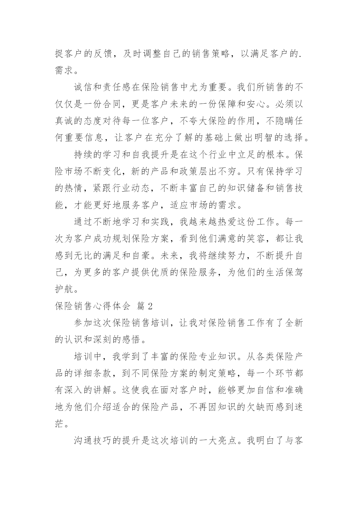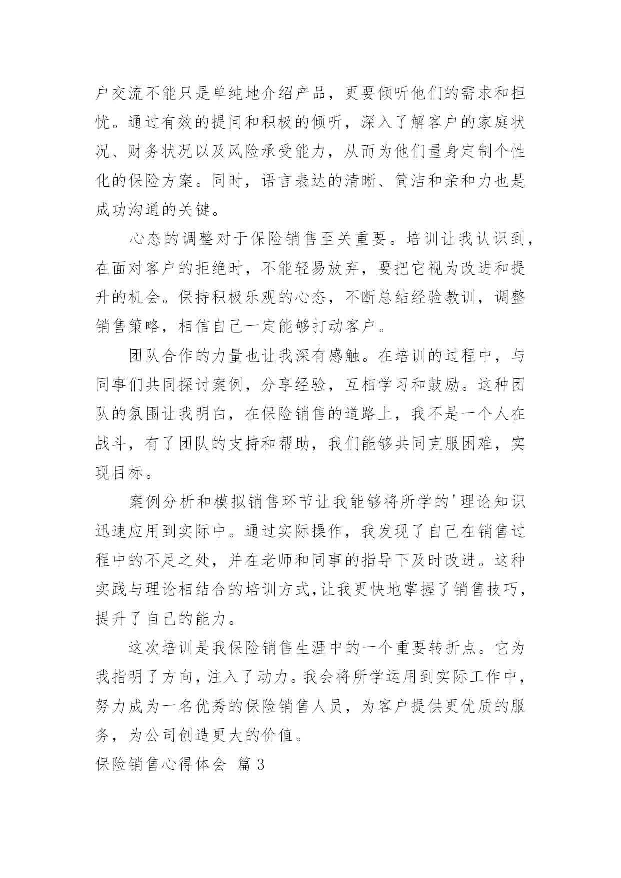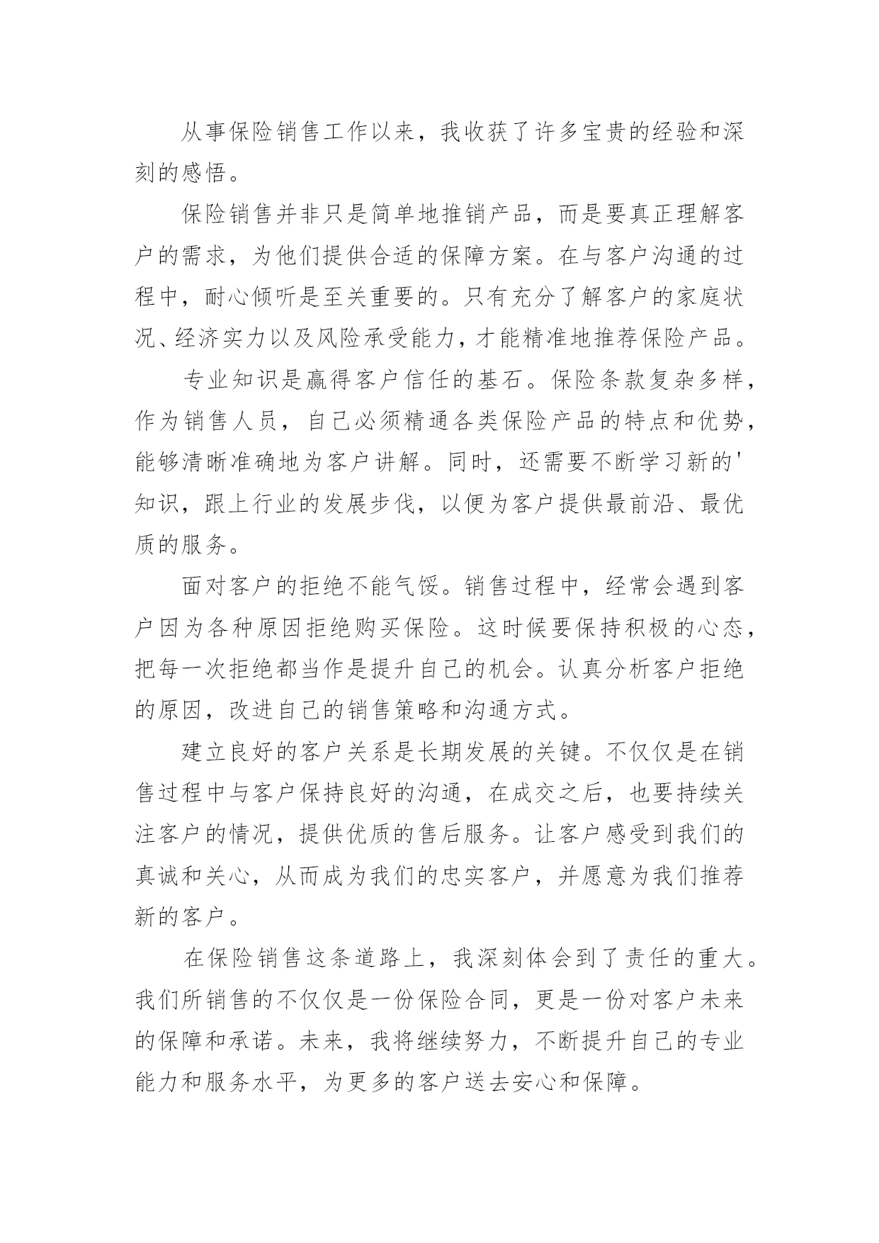 保险销售心得体会保险销售心得体会【优选】我们从一些事情上得到感悟后,心得体会是很好的记录方式,这么做能够提升我们的书面表达能力。那么好的心得体会是什么样的呢?以下是小编收集整理的保险销售心得体会,仅供参考,大家一起来看看吧。保险销售心得体会篇1作为一名保险销售人员,在不断的学习与实践中,我收获了许多宝贵的经验和深刻的感悟。在学习的过程中,我深刻认识到保险知识的广博与复杂。每一种保险产品都有着独特的条款和保障范围,需要我们深入钻研,才能清晰准确地向客户介绍。这不仅要求我们对各类保险产品了如指掌,还需要理解相关的法律法规和政策,以便为客户提供合法合规且符合其需求的保险方案。客户需求的多样性让我明白,不能用千篇一律的方式去对待每一位客户。不同的客户有着不同的家庭状况、经济条件和风险承受能力。有的客户注重健康保障,有的则更关心财产安全;有的客户追求高保额,有的则更看重性价比。只有通过细致的沟通和深入的了解,才能真正洞察客户的内心需求,为他们推荐最合适的保险产品。有效的沟通技巧是成功销售的关键。学会倾听客户的心声,理解他们的担忧和期望,并用通俗易懂的语言解释复杂的保险条款,让客户能够轻松理解和接受。同时,要善于捕捉客户的反馈,及时调整自己的销售策略,以满足客户的.需求。诚信和责任感在保险销售中尤为重要。我们所销售的不仅仅是一份合同,更是客户未来的一份保障和安心。必须以真诚的态度对待每一位客户,不夸大保险的作用,不隐瞒任何重要信息,让客户在充分了解的基础上做出明智的选择。持续的学习和自我提升是在这个行业中立足的根本。保险市场不断变化,新的产品和政策层出不穷。只有保持学习的热情,紧跟行业动态,不断丰富自己的知识储备和销售技能,才能更好地服务客户,适应市场的需求。通过不断地学习和实践,我越来越热爱这份工作。每一次为客户成功规划保险方案,看到他们满意的笑容,都让我感到无比的满足和自豪。未来,我将继续努力,不断提升自己,为更多的客户提供优质的保险服务,为他们的生活保驾护航。保险销售心得体会篇2参加这次保险销售培训,让我对保险销售工作有了全新的认识和深刻的感悟。培训中,我学到了丰富的保险专业知识。从各类保险产品的详细条款,到不同保险方案的制定策略,每一个环节都有深入的讲解。这使我在面对客户时,能够更加自信和准确地为他们介绍适合的保险产品,不再因知识的欠缺而感到迷茫。沟通技巧的提升是这次培训的一大亮点。我明白了与客户交流不能只是单纯地介绍产品,更要倾听他们的需求和担忧。通过有效的提问和积极的倾听,深入了解客户的家庭状况、财务状况以及风险承受能力,从而为他们量身定制个性化的保险方案。同时,语言表达的清晰、简洁和亲和力也是成功沟通的关键。心态的调整对于保险销售至关重要。培训让我认识到,在面对客户的拒绝时,不能轻易放弃,要把它视为改进和提升的机会。保持积极乐观的心态,不断总结经验教训,调整销售策略,相信自己一定能够打动客户。团队合作的力量也让我深有感触。在培训的过程中,与同事们共同探讨案例,分享经验,互相学习和鼓励。这种团队的氛围让我明白,在保险销售的道路上,我不是一个人在战斗,有了团队的支持和帮助,我们能够共同克服困难,实现目标。案例分析和模拟销售环节让我能够将所学的'理论知识迅速应用到实际中。通过实际操作,我发现了自己在销售过程中的不足之处,并在老师和同事的指导下及时改进。这种实践与理论相结合的培训方式,让我更快地掌握了销售技巧,提升了自己的能力。这次培训是我保险销售生涯中的一个重要转折点。它为我指明了方向,注入了动力。我会将所学运用到实际工作中,努力成为一名优秀的保险销售人员,为客户提供更优质的服务,为公司创造更大的价值。保险销售心得体会篇3从事保险销售工作以来,我收获了许多宝贵的经验和深刻的感悟。保险销售并非只是简单地推销产品,而是要真正理解客户的需求,为他们提供合适的保障方案。在与客户沟通的过程中,耐心倾听是至关重要的。只有充分了解客户的家庭状况、经济实力以及风险承受能力,才能精准地推荐保险产品。专业知识是赢得客户信任的基石。保险条款复杂多样,作为销售人员,自己必须精通各类保险产品的特点和优势,能够清晰准确地为客户讲解。同时,还需要不断学习新的'知识,跟上行业的发展步伐,以便为客户提供最前沿、最优质的服务。面对客户的拒绝不能气馁。销售过程中,经常会遇到客户因为各种原因拒绝购买保险。这时候要保持积极的心态,把每一次拒绝都当作是提升自己的机会。认真分析客户拒绝的原因,改进自己的销售策略和沟通方式。建立良好的客户关系是长期发展的关键。不仅仅是在销售过程中与客户保持良好的沟通,在成交之后,也要持续关注客户的情况,提供优质的售后服务。让客户感受到我们的真诚和关心,从而成为我们的忠实客户,并愿意为我们推荐新的客户。在保险销售这条道路上,我深刻体会到了责任