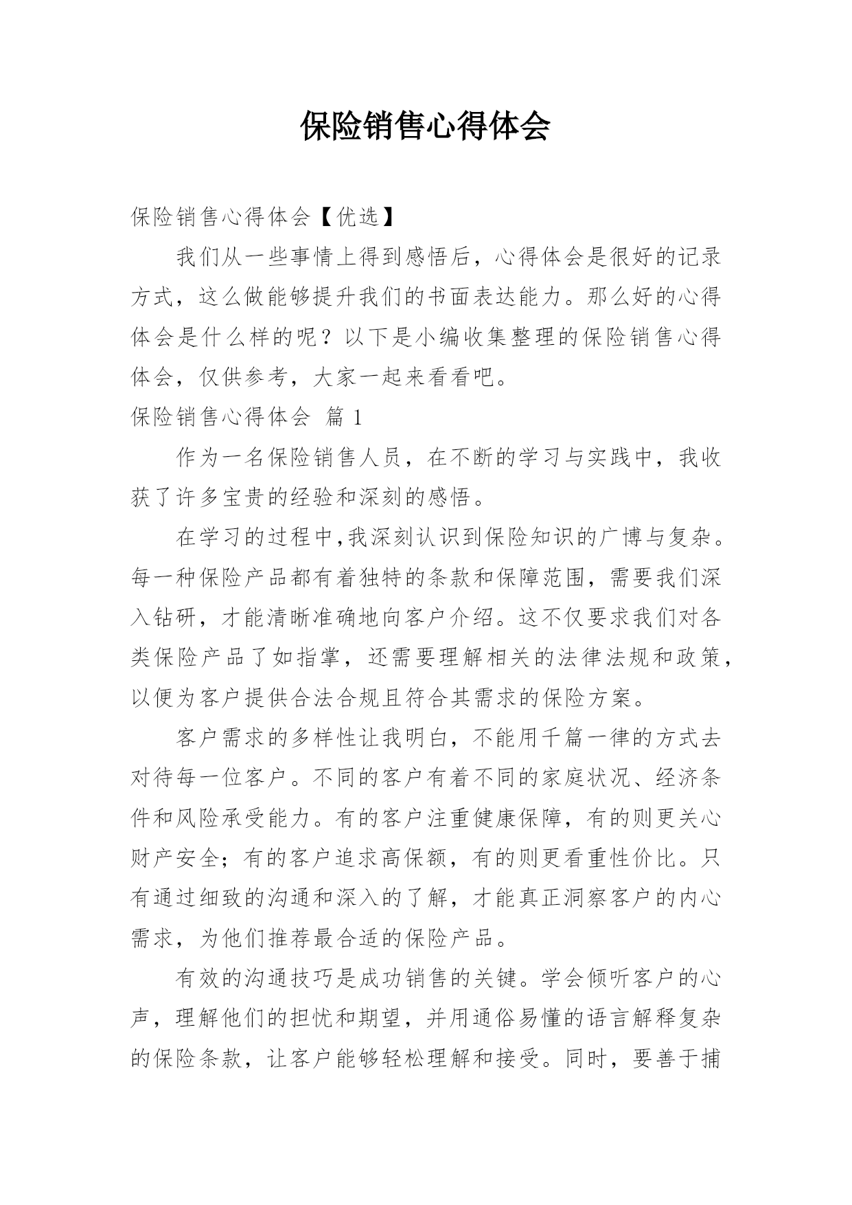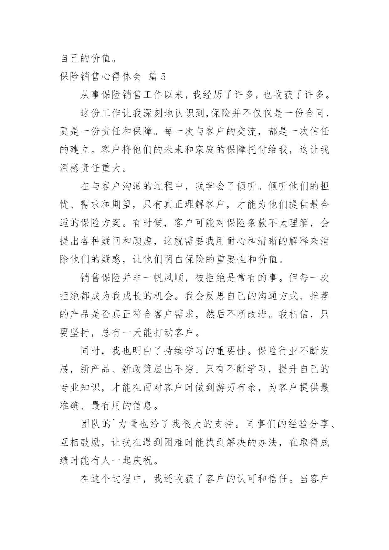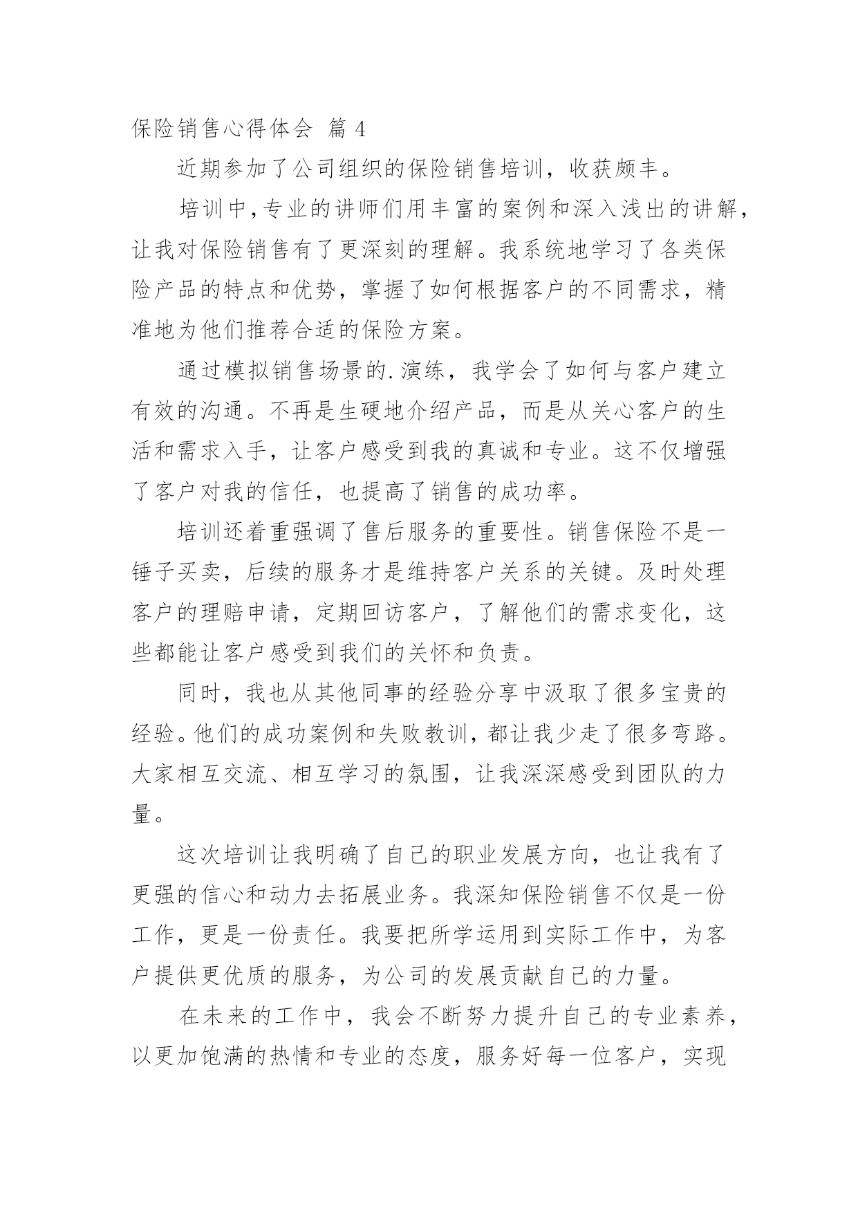保险销售心得体会保险销售心得体会【优选】我们从一些事情上得到感悟后,心得体会是很好的记录方式,这么做能够提升我们的书面表达能力。那么好的心得体会是什么样的呢?以下是小编收集整理的保险销售心得体会,仅供参考,大家一起来看看吧。保险销售心得体会篇1作为一名保险销售人员,在不断的学习与实践中,我收获了许多宝贵的经验和深刻的感悟。在学习的过程中,我深刻认识到保险知识的广博与复杂。每一种保险产品都有着独特的条款和保障范围,需要我们深入钻研,才能清晰准确地向客户介绍。这不仅要求我们对各类保险产品了如指掌,还需要理解相关的法律法规和政策,以便为客户提供合法合规且符合其需求的保险方案。客户需求的多样性让我明白,不能用千篇一律的方式去对待每一位客户。不同的客户有着不同的家庭状况、经济条件和风险承受能力。有的客户注重健康保障,有的则更关心财产安全;有的客户追求高保额,有的则更看重性价比。只有通过细致的沟通和深入的了解,才能真正洞察客户的内心需求,为他们推荐最合适的保险产品。有效的沟通技巧是成功销售的关键。学会倾听客户的心声,理解他们的担忧和期望,并用通俗易懂的语言解释复杂的保险条款,让客户能够轻松理解和接受。同时,要善于捕捉客户的反馈,及时调整自己的销售策略,以满足客户的.需求。诚信和责任感在保险销售中尤为重要。我们所销售的不仅仅是一份合同,更是客户未来的一份保障和安心。必须以真诚的态度对待每一位客户,不夸大保险的作用,不隐瞒任何重要信息,让客户在充分了解的基础上做出明智的选择。持续的学习和自我提升是在这个行业中立足的根本。保险市场不断变化,新的产品和政策层出不穷。只有保持学习的热情,紧跟行业动态,不断丰富自己的知识储备和销售技能,才能更好地服务客户,适应市场的需求。通过不断地学习和实践,我越来越热爱这份工作。每一次为客户成功规划保险方案,看到他们满意的笑容,都让我感到无比的满足和自豪。未来,我将继续努力,不断提升自己,为更多的客户提供优质的保险服务,为他们的生活保驾护航。保险销售心得体会篇2参加这次保险销售培训,让我对保险销售工作有了全新的认识和深刻的感悟。培训中,我学到了丰富的保险专业知识。从各类保险产品的详细条款,到不同保险方案的制定策略,每一个环节都有深入的讲解。这使我在面对客户时,能够更加自信和准确地为他们介绍适合的保险产品,不再因知识的欠缺而感到迷茫。沟通技巧的提升是这次培训的一大亮点。我明白了与客户交流不能只是单纯地介绍产品,更要倾听他们的需求和担忧。通过有效的提问和积极的倾听,深入了解客户的家庭状况、财务状况以及风险承受能力,从而为他们量身定制个性化的保险方案。同时,语言表达的清晰、简洁和亲和力也是成功沟通的关键。心态的调整对于保险销售至关重要。培训让我认识到,在面对客户的拒绝时,不能轻易放弃,要把它视为改进和提升的机会。保持积极乐观的心态,不断总结经验教训,调整销售策略,相信自己一定能够打动客户。团队合作的力量也让我深有感触。在培训的过程中,与同事们共同探讨案例,分享经验,互相学习和鼓励。这种团队的氛围让我明白,在保险销售的道路上,我不是一个人在战斗,有了团队的支持和帮助,我们能够共同克服困难,实现目标。案例分析和模拟销售环节让我能够将所学的'理论知识迅速应用到实际中。通过实际操作,我发现了自己在销售过程中的不足之处,并在老师和同事的指导下及时改进。这种实践与理论相结合的培训方式,让我更快地掌握了销售技巧,提升了自己的能力。这次培训是我保险销售生涯中的一个重要转折点。它为我指明了方向,注入了动力。我会将所学运用到实际工作中,努力成为一名优秀的保险销售人员,为客户提供更优质的服务,为公司创造更大的价值。保险销售心得体会篇3从事保险销售工作以来,我收获了许多宝贵的经验和深刻的感悟。保险销售并非只是简单地推销产品,而是要真正理解客户的需求,为他们提供合适的保障方案。在与客户沟通的过程中,耐心倾听是至关重要的。只有充分了解客户的家庭状况、经济实力以及风险承受能力,才能精准地推荐保险产品。专业知识是赢得客户信任的基石。保险条款复杂多样,作为销售人员,自己必须精通各类保险产品的特点和优势,能够清晰准确地为客户讲解。同时,还需要不断学习新的'知识,跟上行业的发展步伐,以便为客户提供最前沿、最优质的服务。面对客户的拒绝不能气馁。销售过程中,经常会遇到客户因为各种原因拒绝购买保险。这时候要保持积极的心态,把每一次拒绝都当作是提升自己的机会。认真分析客户拒绝的原因,改进自己的销售策略和沟通方式。建立良好的客户关系是长期发展的关键。不仅仅是在销售过程中与客户保持良好的沟通,在成交之后,也要持续关注客户的情况,提供优质的售后服务。让客户感受到我们的真诚和关心,从而成为我们的忠实客户,并愿意为我们推荐新的客户。在保险销售这条道路上,我深刻体会到了责任
