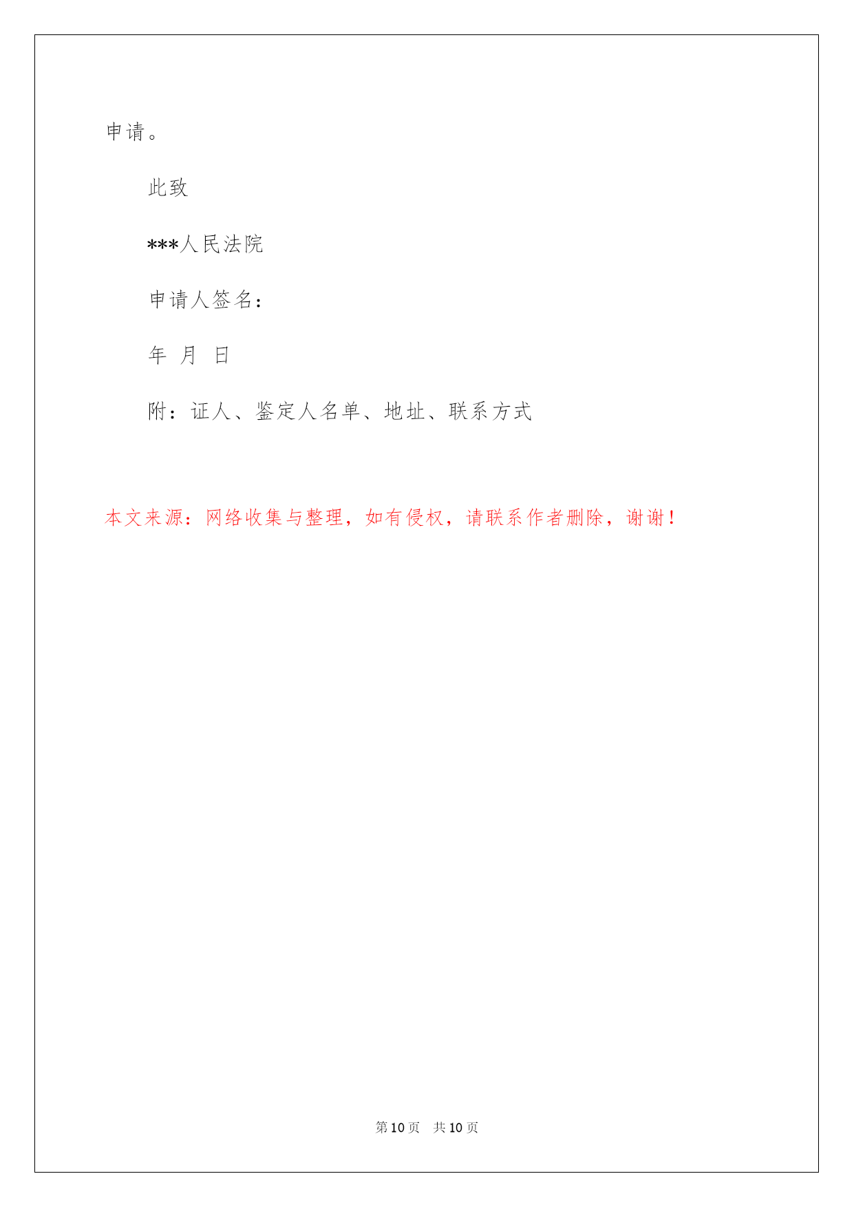第PAGE\*Arabic\*MERGEFORMAT10页共NUMPAGES\*Arabic\*MERGEFORMAT10页第PAGE\*MERGEFORMAT10页共NUMPAGES\*MERGEFORMAT10页第PAGE\*MERGEFORMAT10页共NUMPAGES\*MERGEFORMAT10页第PAGE\*MERGEFORMAT10页共NUMPAGES\*MERGEFORMAT10页第PAGE\*MERGEFORMAT10页共NUMPAGES\*MERGEFORMAT10页第PAGE\*MERGEFORMAT10页共NUMPAGES\*MERGEFORMAT10页第PAGE\*MERGEFORMAT10页共NUMPAGES\*MERGEFORMAT10页第PAGE\*MERGEFORMAT10页共NUMPAGES\*MERGEFORMAT10页第PAGE\*MERGEFORMAT10页共NUMPAGES\*MERGEFORMAT10页第PAGE\*MERGEFORMAT10页共NUMPAGES\*MERGEFORMAT10页第PAGE\*MERGEFORMAT10页共NUMPAGES\*MERGEFORMAT10页2022司法鉴定申请书关于司法鉴定申请书7篇现今社会公众的追求意识不断提升,申请书应用范围广泛,我们在写申请书的时候要留意看法要恳切、朴实。来参考自己须要的申请书吧!下面是我整理的司法鉴定申请书7篇,欢迎阅读与保藏。司法鉴定申请书篇1申请人:李xx,男,19xx年7月1日诞生,汉族,住址是新疆xx县阔克阿尕什乡迭里布列克村19号。唐x,女,19xx年10月2号,汉,住址是新疆xx县一农场建设东路65号。恳求事项:恳求法院依法托付具备相关资质的司法鉴定单位对申请人的经济损失进行评估。事实和理由20xx年8月25日,被告xx生物科技有限公司所修的涵洞质量不合格,导致原告在运输小麦的运输过程中车辆发生侧翻,将车上的小麦倾倒入旁边的水渠中,给原告造成了重大的经济损失。为查清事实损失的数额,恳求法院依法托付鉴定单位进行评估鉴定。此致xx县人民法院申请人:年月日司法鉴定申请书篇2申请人:中国人民财产保险股份有限公司市分公司,居处地:市文昌中路388号,负责人:被申请人:,男,汉族,191年9月22日生,住西安市莲湖区号。电话:恳求事项:恳求人民法院依法托付有鉴定资质的鉴定机构对被申请人的伤残等级进行重新鉴定,并对后续治疗费重新评估。事实与理由:申请人与被申请人道路交通事故损害赔偿纠纷一案,20xx年10月16日,被申请人托付西北政法高校司法鉴定中心对其伤残等做出司法鉴定看法:构成九级伤残,并对后续治疗费评估为一万元。对该鉴定结论申请人提出异议。被申请人伤残鉴定时,内固定尚未取出,治疗并未终结,伤情亦未完全稳定,且西北政法高校司法鉴定中心即非申请人与被申请人协商确定,亦非人民法院指定,而且评估的后续治疗费用过高。依据《最高人民法院关于民事诉讼证据的若干规定》其次十八条规定,申请人有权申请重新鉴定。综上所述,为维护申请人的合法权益,确保司法的公正,特申请重新鉴定,望人民法院批准。此致西安市莲湖区市人民法院申请人:中国人民财产保险股份有限公司市分公司托付代理人:二〇xx年一月三日司法鉴定申请书篇3申请人:某某某,男,________年____月____日诞生,汉族,住XX市XX区XX路XX号楼XX单元XX室,电话:86763XXX托付代理人:XXX被申请人:XXX,女,________年____月____日诞生,汉族,住XX市XX区XX路XX号楼XX单元XX室,电话:1366195XXXX恳求事项:恳求法院依法指定司法鉴定机构对被申请人进行司法精神病鉴定事实和理由被申请人诉申请人离婚纠纷一案中,因被申请人患有精神分裂症,系无民事行为实力人,其精神健康状况干脆关系到本案的实体审理以及被申请人对其代理律师的授权是否有效,故依法向贵院提出司法精神病鉴定申请,以便查清相关事实,请予批准。此致XX市XX区人民法院申请人:xxx20xx年x月x日司法鉴定申请书篇4一、概述(一)司法鉴定文书的概念司法鉴定文书是司法鉴定人依照法律规定的条件和程序,运用特地学问或者技能对诉讼、仲裁等活动中所涉及的特地性问题进行科学鉴别和判定后制作的规范化文书的总称,司法鉴定申请书格式。(二)司法鉴定文书的特征1敝谱髦魈宓奶囟ㄐ司法鉴定文书必需由具有相应执业资格的司法鉴定人制作。2敝谱鞒绦虻暮戏ㄐ司法鉴定文书的产生过程必需符合法律、法规与司法鉴定程序等有关规定。3蔽氖槟谌莸目蒲性司法鉴定文书阐明的是自