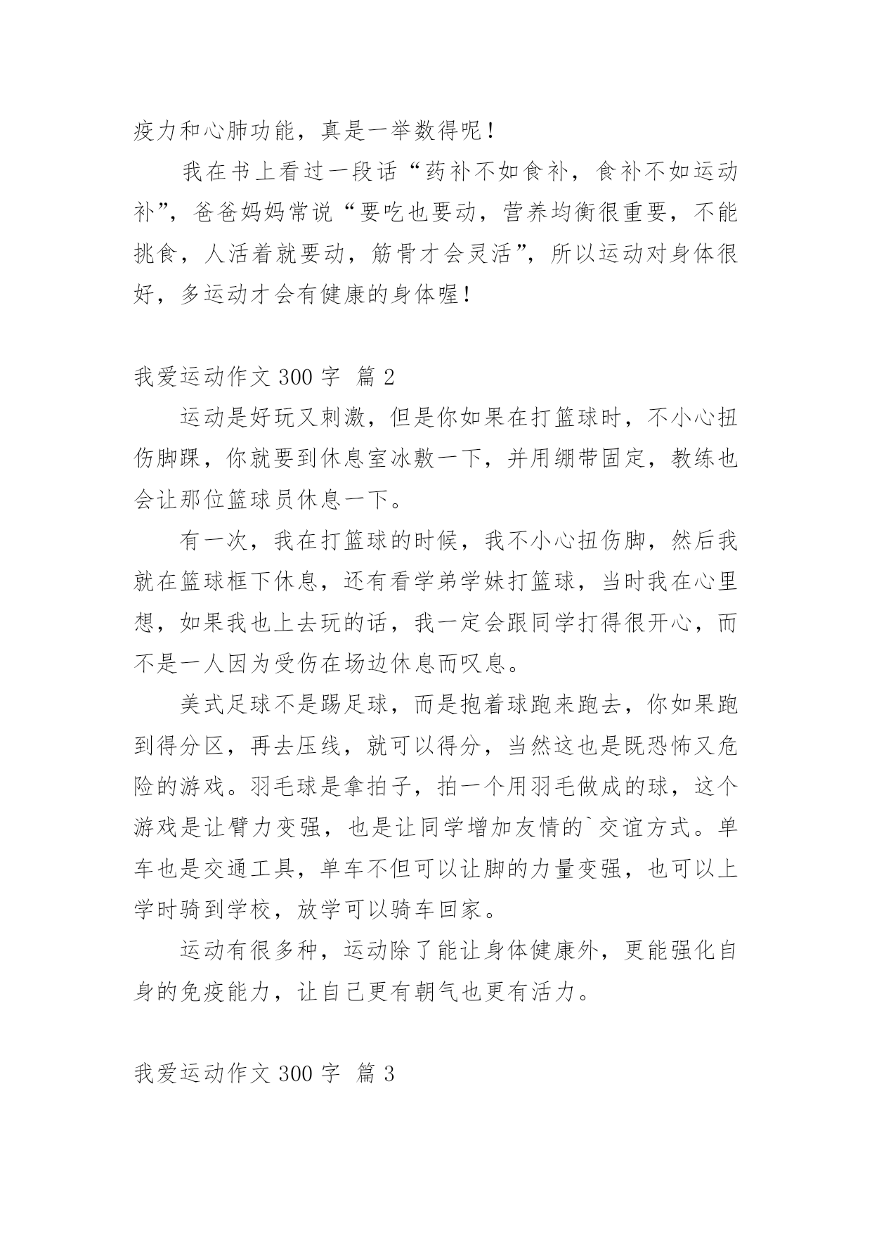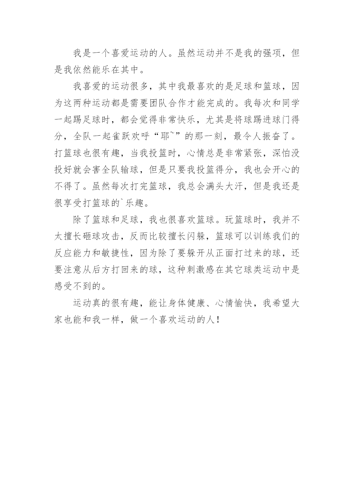 我爱运动作文300字【集合】我爱运动作文300字3篇在生活、工作和学习中,许多人都写过作文吧,作文要求篇章结构完整,一定要避免无结尾作文的出现。如何写一篇有思想、有文采的作文呢?以下是小编精心整理的我爱运动作文300字3篇,希望对大家有所帮助。我爱运动作文300字篇1运动的种类很多,好处更是多,比如:打球可以让我们手脚和反应灵敏,更可以帮助身高增长,拉单干能训练我们的手臂和手腕的力气,跑不可以训练脚力和心肺耐力,提升肺部功能,还有着许多的`运动和好处,真是多得数不清呢!每个人都有喜爱的运动和方法,其中我最喜欢的项目是骑自行车,因为骑自行车可以训练平衡感,慢慢骑着车,感觉很悠闲,如果加快速度就变得有点刺激喔!我还喜欢打球,因为球弹跳时,好像我在玩弹跳床般的兴奋,越高兴弹的越高,尤其是投进篮框的时候,我特别有成就感喔!最重要的就是他可以帮助我快速长高呢!运动项目里,还有一项是我最最喜欢的运动,有些人不喜欢运动后气喘如牛、汗如雨下的感觉,我也一样讨厌那汗流浃背,带着汗臭酸味非常不舒服,所以,如果可以马上到游泳池里泡泡水,自由自在悠闲的游着泳,那是多么完美幸福的事呀!而且游泳可以提升免疫力和心肺功能,真是一举数得呢!我在书上看过一段话“药补不如食补,食补不如运动补”,爸爸妈妈常说“要吃也要动,营养均衡很重要,不能挑食,人活着就要动,筋骨才会灵活”,所以运动对身体很好,多运动才会有健康的身体喔!我爱运动作文300字篇2运动是好玩又刺激,但是你如果在打篮球时,不小心扭伤脚踝,你就要到休息室冰敷一下,并用绷带固定,教练也会让那位篮球员休息一下。有一次,我在打篮球的时候,我不小心扭伤脚,然后我就在篮球框下休息,还有看学弟学妹打篮球,当时我在心里想,如果我也上去玩的话,我一定会跟同学打得很开心,而不是一人因为受伤在场边休息而叹息。美式足球不是踢足球,而是抱着球跑来跑去,你如果跑到得分区,再去压线,就可以得分,当然这也是既恐怖又危险的游戏。羽毛球是拿拍子,拍一个用羽毛做成的球,这个游戏是让臂力变强,也是让同学增加友情的`交谊方式。单车也是交通工具,单车不但可以让脚的力量变强,也可以上学时骑到学校,放学可以骑车回家。运动有很多种,运动除了能让身体健康外,更能强化自身的免疫能力,让自己更有朝气也更有活力。我爱运动作文300字篇3我是一个喜爱运动的人。虽然运动并不是我的强项,但是我依然能乐在其中。我喜爱的运动很多,其中我最喜欢的是足球和篮球,因为这两种运动都是需要团队合作才能完成的。我每次和同学一起踢足球时,都会觉得非常快乐,尤其是将球踢进球门得分,全队一起雀跃欢呼“耶~”的那一刻,最令人振奋了。打篮球也很有趣,当我投篮时,心情总是非常紧张,深怕没投好就会害全队输球,但是只要我投篮得分,我也会开心的不得了。虽然每次打完篮球,我总会满头大汗,但是我还是很享受打篮球的`乐趣。除了篮球和足球,我也很喜欢篮球。玩篮球时,我并不太擅长砸球攻击,反而比较擅长闪躲,篮球可以训练我们的反应能力和敏捷性,因为除了要躲开从正面打过来的球,还要注意从后方打回来的球,这种刺激感在其它球类运动中是感受不到的。运动真的很有趣,能让身体健康、心情愉快,我希望大家也能和我一样,做一个喜欢运动的人!