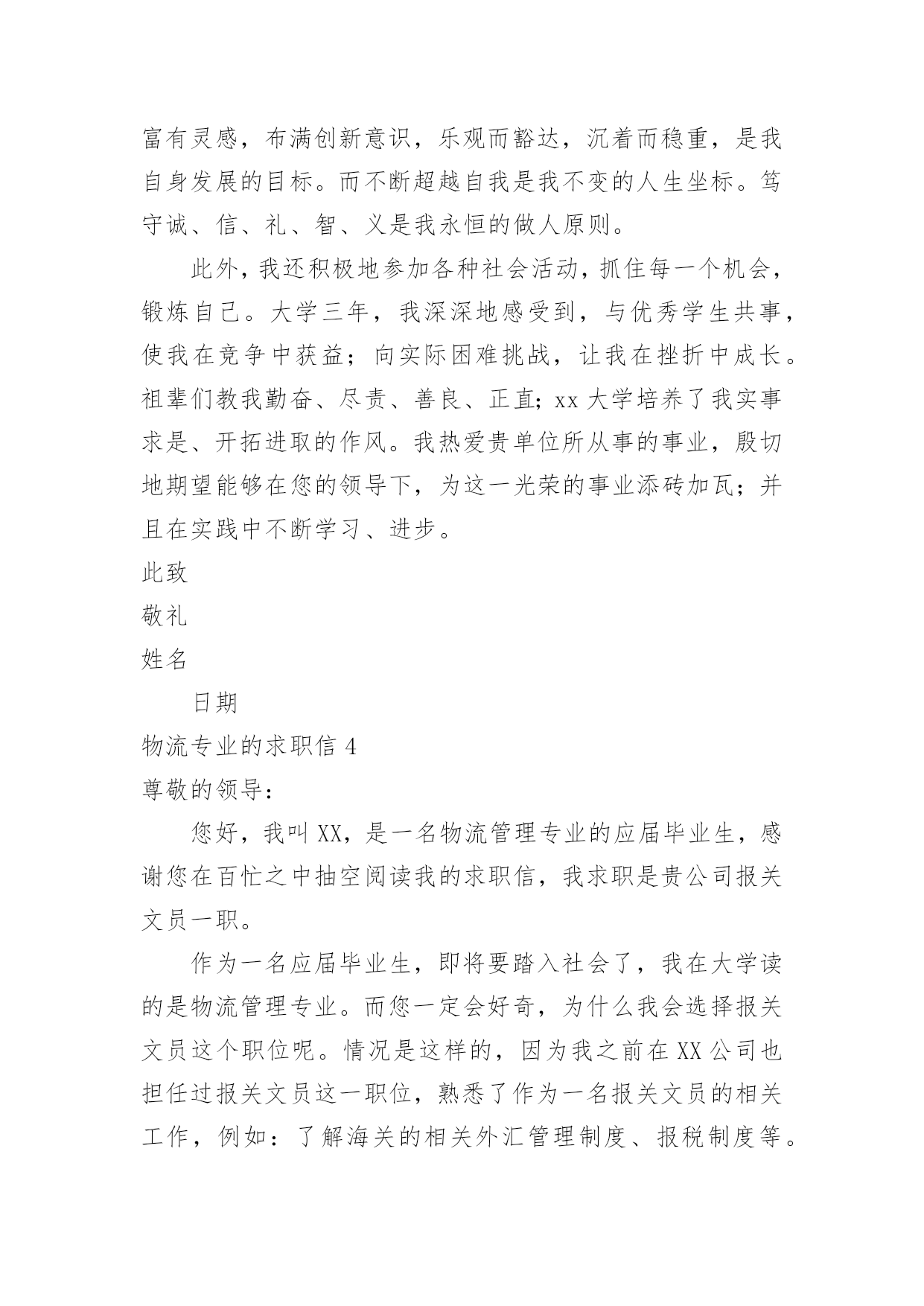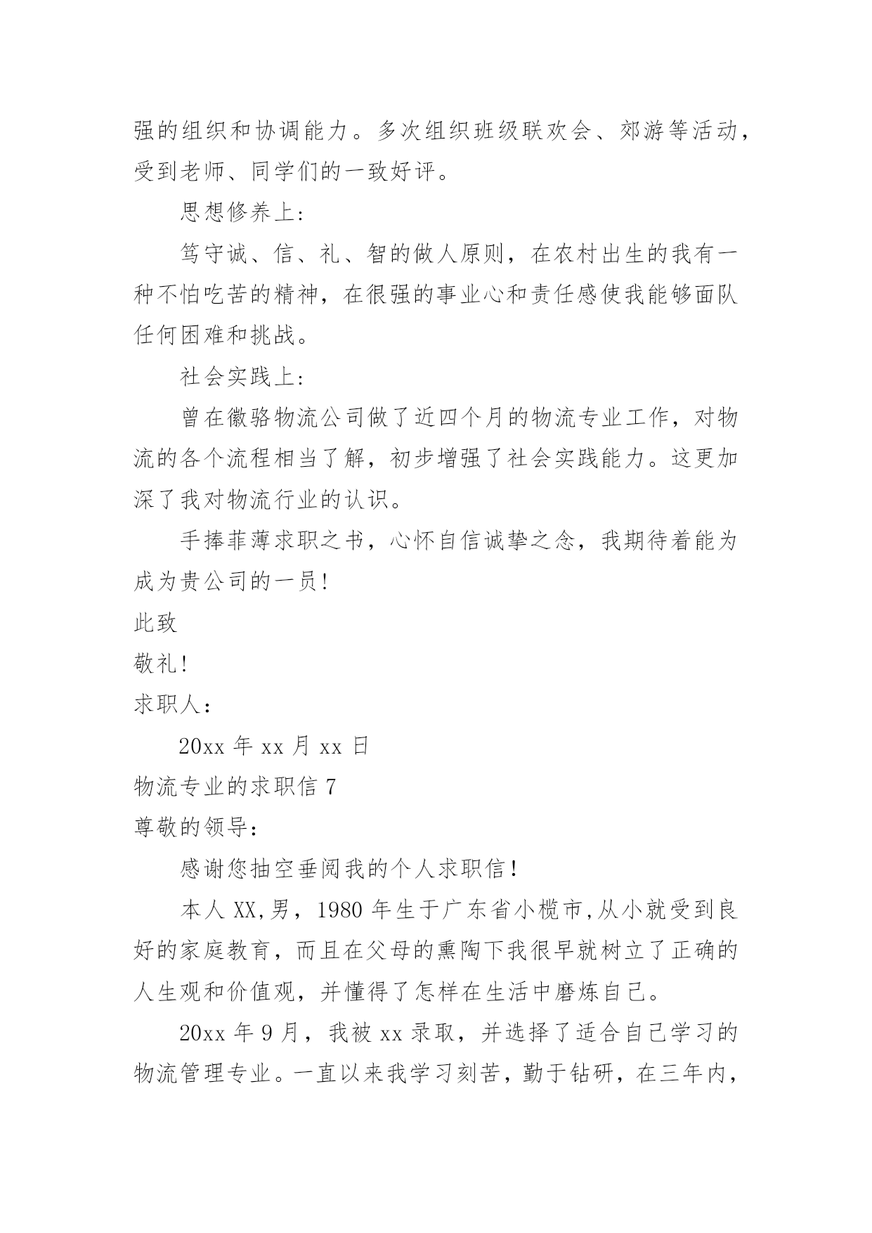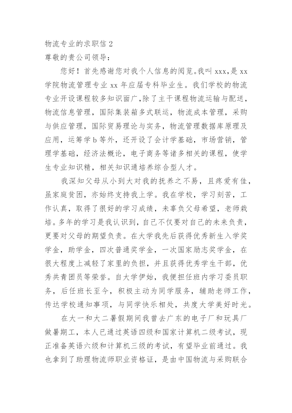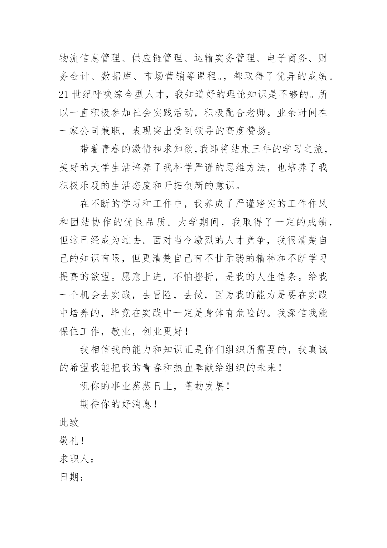 物流专业的求职信物流专业的求职信时间流逝得如此之快,许多朋友又将开始寻求新的工作机会,现在这个时候,写好一封求职信就十分有必要了!求职信怎么写才不会千篇一律呢?下面是小编为大家整理的物流专业的求职信,希望对大家有所帮助。物流专业的求职信1各位领导:您好!非常感谢您在百忙之中抽出时间来复习我的自荐!我是兰州外国语职业学院物流管理专业的学生,将于xx年6月毕业。当我们即将踏上征途时,我在这里提供我的工作信息,并自我介绍。我愿意接受你的评估和选择。我通过各种渠道对贵公司有了一个大致的了解,知道贵公司是一家很有前途的公司,有现代化的趋势,有很大的生命力,我非常希望加入这样的企业,尽我最大的努力为公司的发展贡献自己微薄的力量。同时能对你自身的发展起到积极的作用,希望在贵公司的帮助下,在贵公司的大发展环境下,促进你自身的发展。现在我想向你推荐我自己:在大学生活中,我很好地掌握了自己的专业知识,主修物流概论、企业物流管理、仓储与配送管理、物流经济学、物流信息管理、供应链管理、运输实务管理、电子商务、财务会计、数据库、市场营销等课程。,都取得了优异的成绩。21世纪呼唤综合型人才,我知道好的理论知识是不够的。所以一直积极参加社会实践活动,积极配合老师。业余时间在一家公司兼职,表现突出受到领导的高度赞扬。带着青春的激情和求知欲,我即将结束三年的学习之旅,美好的大学生活培养了我科学严谨的思维方法,也培养了我积极乐观的生活态度和开拓创新的意识。在不断的学习和工作中,我养成了严谨踏实的工作作风和团结协作的优良品质。大学期间,我取得了一定的成绩,但这已经成为过去。面对当今激烈的人才竞争,我很清楚自己的知识有限,但更清楚自己有不甘示弱的精神和不断学习提高的欲望。愿意上进,不怕挫折,是我的人生信条。给我一个机会去实践,去冒险,去做,因为我的能力是要在实践中培养的,毕竟在实践中一定是身体有危险的。我深信我能保住工作,敬业,创业更好!我相信我的能力和知识正是你们组织所需要的,我真诚的希望我能把我的青春和热血奉献给组织的未来!祝你的事业蒸蒸日上,蓬勃发展!期待你的好消息!此致敬礼!求职人:日期:物流专业的求职信2尊敬的贵公司领导:您好!首先感谢您对我个人信息的阅览。我叫xxx,是xx学院物流管理专业xx年应届专科毕业生。我们学校的物流专业开设课程较多知识面广,除了主干课程物流运输与配送,物流信息管理,国际集装箱多式联运,物流成本管理,采购与供应管理,国际贸易理论与实务,物流管理数据库原理及应用,运筹学b等外,还开设了会计学基础,市场营销,管理学基础,经济法概论,电子商务等诸多相关的课程,使学生专业知识精,相关知识通培养综合型人才。我深知父母从小到大对我的抚养之不易,且疼爱有佳,虽家庭贫困,亦始终支持我上学。我在学校,学习刻苦,工作认真,取得了很好的学习成绩,未辜负父母希望,老师栽培。多年的学习是我认识到,自己不仅要对自己的未来负责,更要对父母的期望负责。在大学我先后获得优秀新生入学奖学金,助学金,四次普通奖学金,一次国家励志奖学金,在很大程度上减轻了家里的负担,并且获得优秀学生干部,优秀共青团员等荣誉。自大学伊始,我便担任班内学习委员职务,后任班长至今,积极主动为同学服务,辅助老师工作,传达学校通知事项,与同学快乐相处,共度大学美好时光。在大一和大二暑假期间我曾去广东的电子厂和玩具厂做暑期工,本人已通过英语四级和国家计算机二级考试,现正准备英语六级和计算机三级的考试,有望毕业前通过。我也拿到了助理物流师职业资格证,是由中国物流与采购联合会颁发的。对于办公软件甚是熟练,可以较快的完成某些文件的设计打印。另外我参加了自学考试,工商企业管理专业独立本科,主要课程有财务管理学,金融理论与实务,企业经营战略,企业管理咨询,组织行为学等,目前只剩三门课程未考,有望专科毕业时拿到此专业毕业证。我是有进取心之人,不会安于现状,在工作中也会力争上游,热情积极,准确及时完成工作任务的。物流管理和工商企业管理两专业的学习,使我对企业经营管理,财务会计,国际贸易,物流运输配送及金融银行类知识有相当程度的了解掌握,能适应较多的工作岗位。当然与其他专业人员相比,我优点在于知识面较广。我所期望的行业有a物流,交通运输,采购,贸易,电子商务b食品加工,农林牧渔,其他生产加工企业。a类主要是与专业接口,也是国家十大振兴产业之一,会有较好的发展b类则是因为出身于农村,深知农村经济亟待发展,且会有较大的潜力。无论哪一类都是给自己多一种选择,而且这两者有都是有联系的,农产品需要物流,物流的发展会促进农产品的贸易运输,扩大市场区域。任何企业不管是大型的跨国公司,还是小型的商铺都有其自身的弱点和优势,企业要趋利避害,首先就要发掘自身弱点,这是需要有能力的人才能发现的。一个企业的成功需要杰出人才的推动,没