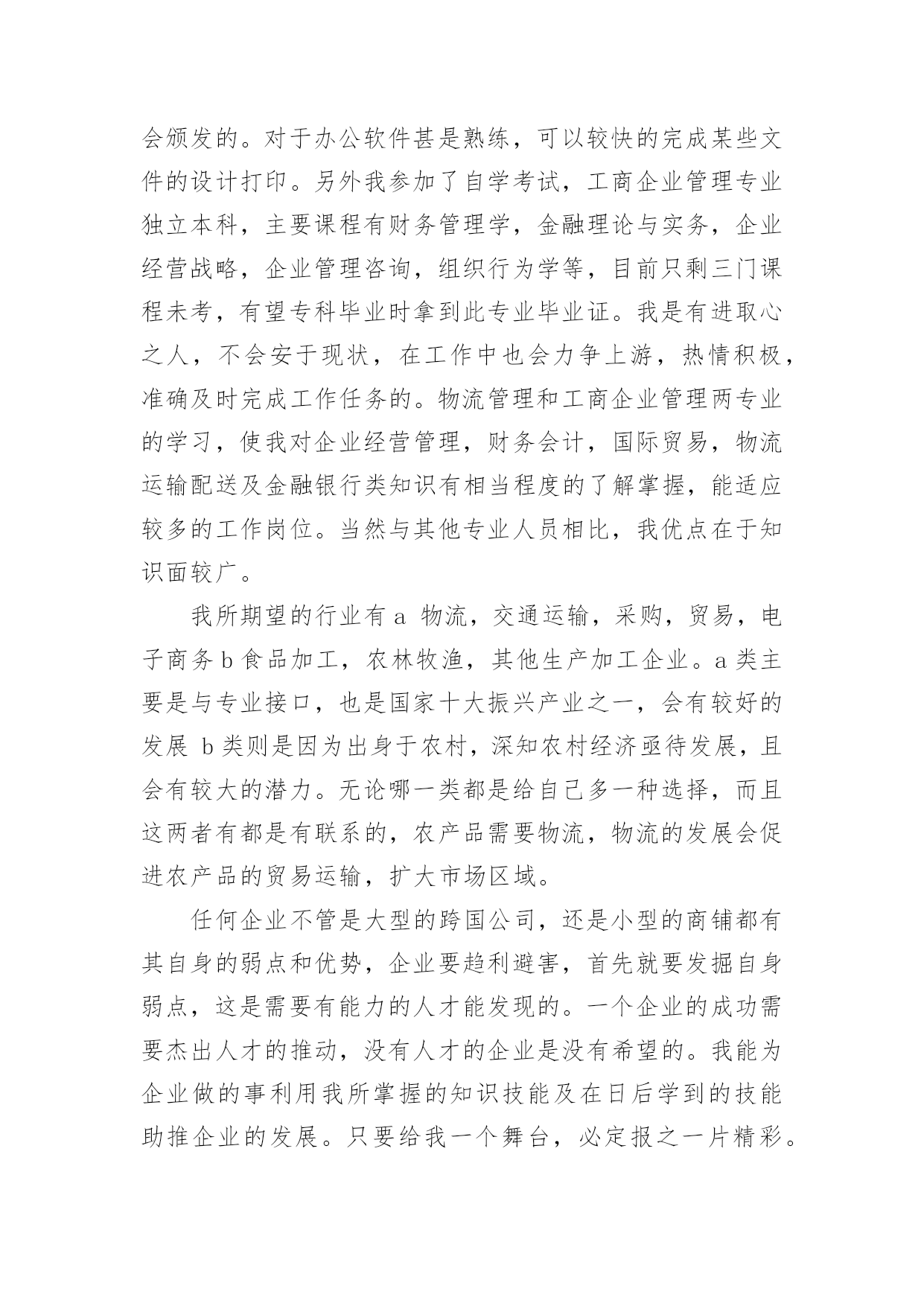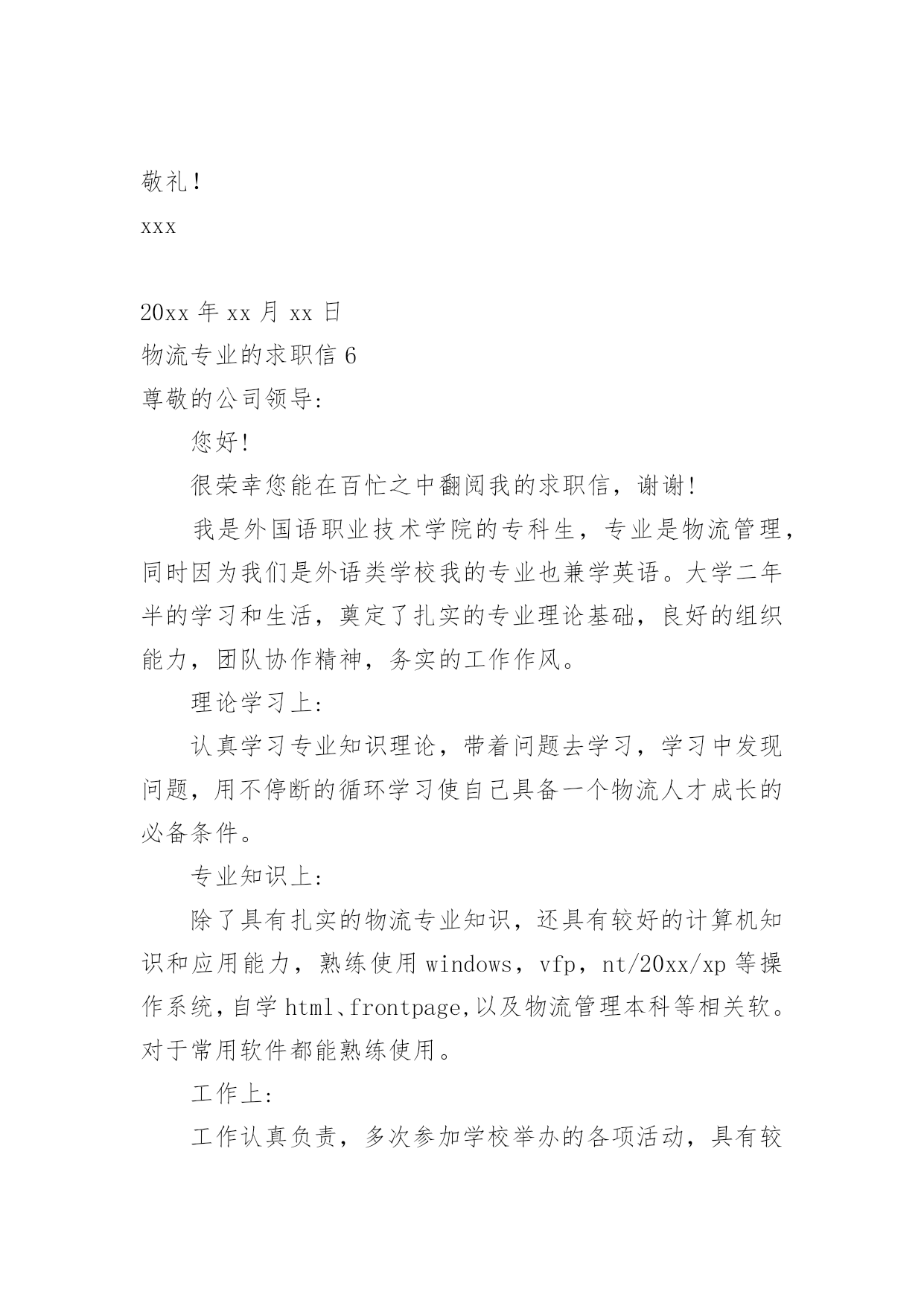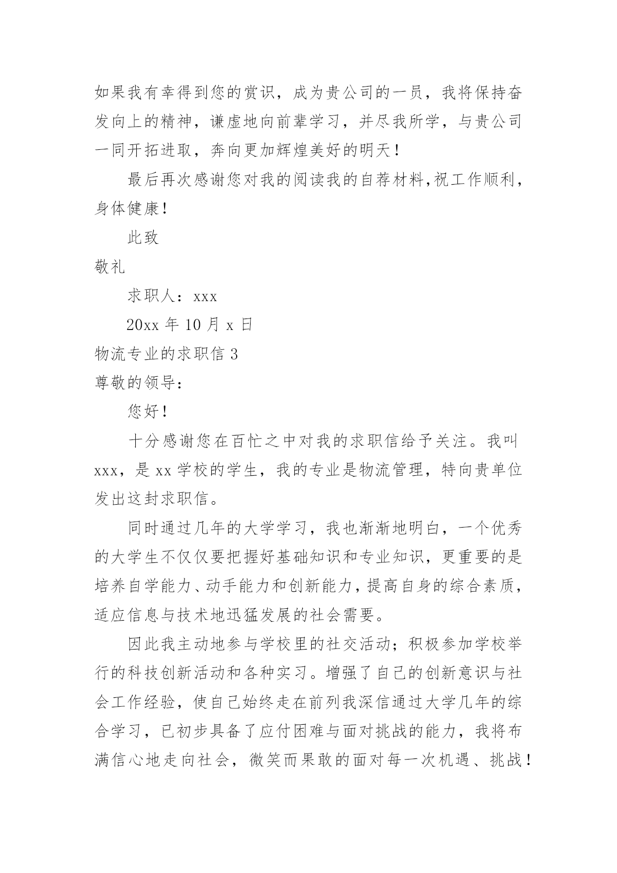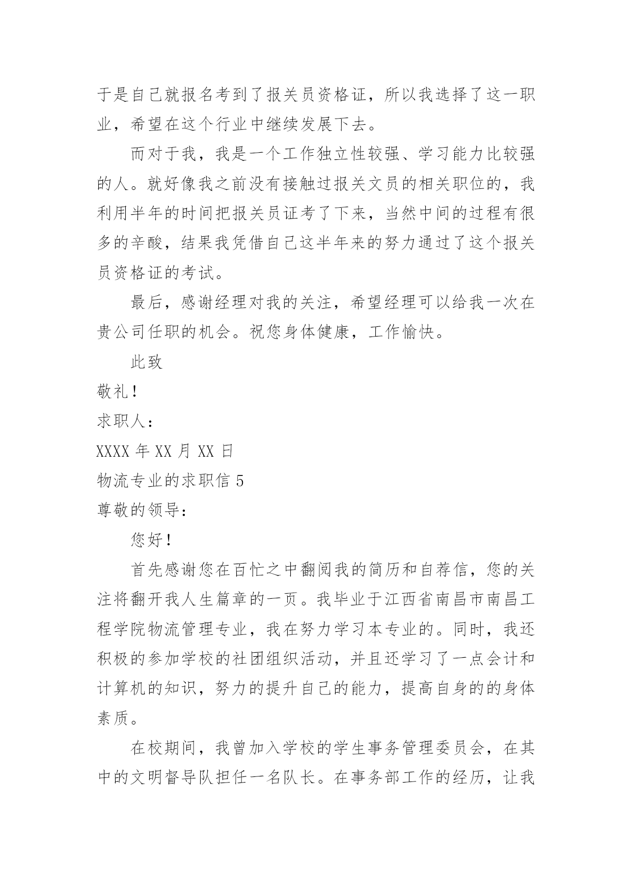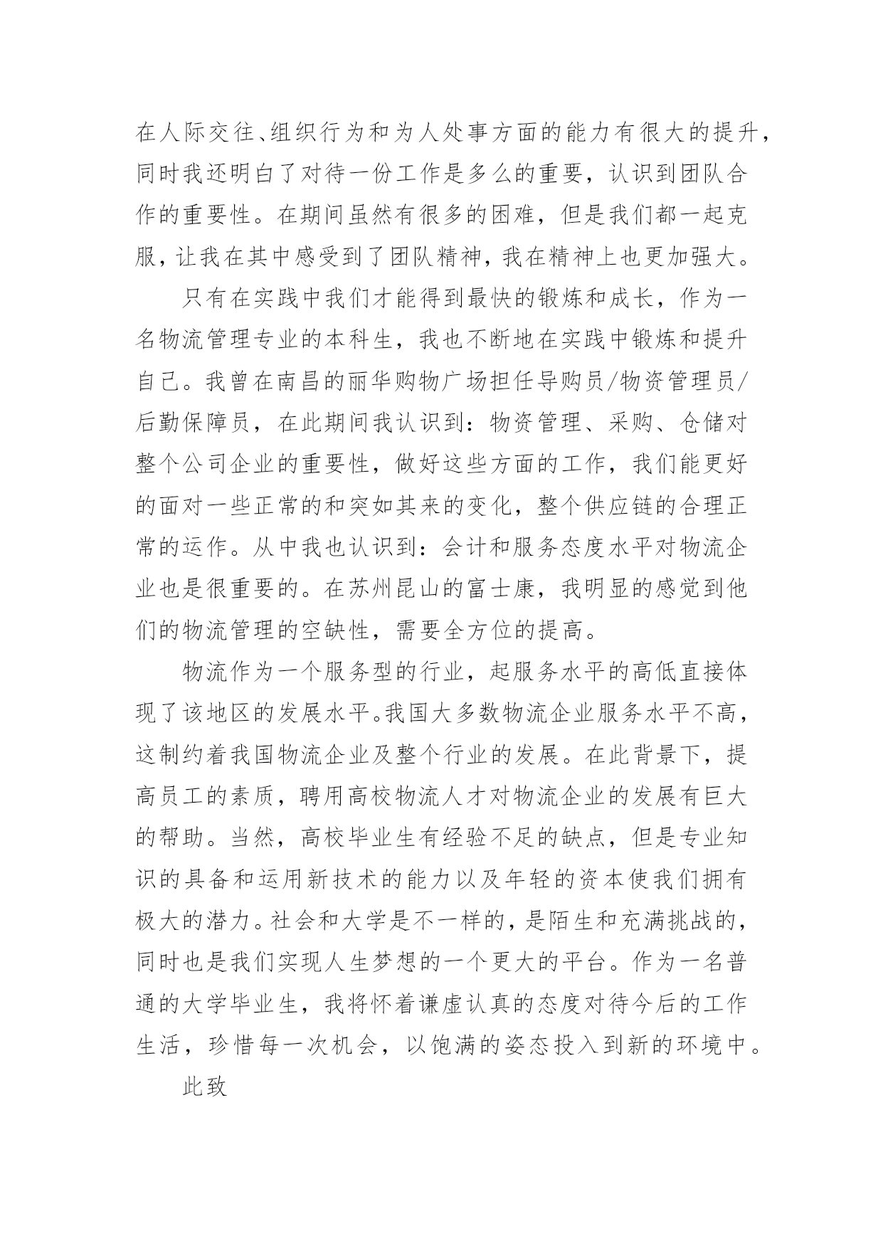 物流专业的求职信物流专业的求职信时间流逝得如此之快,许多朋友又将开始寻求新的工作机会,现在这个时候,写好一封求职信就十分有必要了!求职信怎么写才不会千篇一律呢?下面是小编为大家整理的物流专业的求职信,希望对大家有所帮助。物流专业的求职信1各位领导:您好!非常感谢您在百忙之中抽出时间来复习我的自荐!我是兰州外国语职业学院物流管理专业的学生,将于xx年6月毕业。当我们即将踏上征途时,我在这里提供我的工作信息,并自我介绍。我愿意接受你的评估和选择。我通过各种渠道对贵公司有了一个大致的了解,知道贵公司是一家很有前途的公司,有现代化的趋势,有很大的生命力,我非常希望加入这样的企业,尽我最大的努力为公司的发展贡献自己微薄的力量。同时能对你自身的发展起到积极的作用,希望在贵公司的帮助下,在贵公司的大发展环境下,促进你自身的发展。现在我想向你推荐我自己:在大学生活中,我很好地掌握了自己的专业知识,主修物流概论、企业物流管理、仓储与配送管理、物流经济学、物流信息管理、供应链管理、运输实务管理、电子商务、财务会计、数据库、市场营销等课程。,都取得了优异的成绩。21世纪呼唤综合型人才,我知道好的理论知识是不够的。所以一直积极参加社会实践活动,积极配合老师。业余时间在一家公司兼职,表现突出受到领导的高度赞扬。带着青春的激情和求知欲,我即将结束三年的学习之旅,美好的大学生活培养了我科学严谨的思维方法,也培养了我积极乐观的生活态度和开拓创新的意识。在不断的学习和工作中,我养成了严谨踏实的工作作风和团结协作的优良品质。大学期间,我取得了一定的成绩,但这已经成为过去。面对当今激烈的人才竞争,我很清楚自己的知识有限,但更清楚自己有不甘示弱的精神和不断学习提高的欲望。愿意上进,不怕挫折,是我的人生信条。给我一个机会去实践,去冒险,去做,因为我的能力是要在实践中培养的,毕竟在实践中一定是身体有危险的。我深信我能保住工作,敬业,创业更好!我相信我的能力和知识正是你们组织所需要的,我真诚的希望我能把我的青春和热血奉献给组织的未来!祝你的事业蒸蒸日上,蓬勃发展!期待你的好消息!此致敬礼!求职人:日期:物流专业的求职信2尊敬的贵公司领导:您好!首先感谢您对我个人信息的阅览。我叫xxx,是xx学院物流管理专业xx年应届专科毕业生。我们学校的物流专业开设课程较多知识面广,除了主干课程物流运输与配送,物流信息管理,国际集装箱多式联运,物流成本管理,采购与供应管理,国际贸易理论与实务,物流管理数据库原理及应用,运筹学b等外,还开设了会计学基础,市场营销,管理学基础,经济法概论,电子商务等诸多相关的课程,使学生专业知识精,相关知识通培养综合型人才。我深知父母从小到大对我的抚养之不易,且疼爱有佳,虽家庭贫困,亦始终支持我上学。我在学校,学习刻苦,工作认真,取得了很好的学习成绩,未辜负父母希望,老师栽培。多年的学习是我认识到,自己不仅要对自己的未来负责,更要对父母的期望负责。在大学我先后获得优秀新生入学奖学金,助学金,四次普通奖学金,一次国家励志奖学金,在很大程度上减轻了家里的负担,并且获得优秀学生干部,优秀共青团员等荣誉。自大学伊始,我便担任班内学习委员职务,后任班长至今,积极主动为同学服务,辅助老师工作,传达学校通知事项,与同学快乐相处,共度大学美好时光。在大一和大二暑假期间我曾去广东的电子厂和玩具厂做暑期工,本人已通过英语四级和国家计算机二级考试,现正准备英语六级和计算机三级的考试,有望毕业前通过。我也拿到了助理物流师职业资格证,是由中国物流与采购联合会颁发的。对于办公软件甚是熟练,可以较快的完成某些文件的设计打印。另外我参加了自学考试,工商企业管理专业独立本科,主要课程有财务管理学,金融理论与实务,企业经营战略,企业管理咨询,组织行为学等,目前只剩三门课程未考,有望专科毕业时拿到此专业毕业证。我是有进取心之人,不会安于现状,在工作中也会力争上游,热情积极,准确及时完成工作任务的。物流管理和工商企业管理两专业的学习,使我对企业经营管理,财务会计,国际贸易,物流运输配送及金融银行类知识有相当程度的了解掌握,能适应较多的工作岗位。当然与其他专业人员相比,我优点在于知识面较广。我所期望的行业有a物流,交通运输,采购,贸易,电子商务b食品加工,农林牧渔,其他生产加工企业。a类主要是与专业接口,也是国家十大振兴产业之一,会有较好的发展b类则是因为出身于农村,深知农村经济亟待发展,且会有较大的潜力。无论哪一类都是给自己多一种选择,而且这两者有都是有联系的,农产品需要物流,物流的发展会促进农产品的贸易运输,扩大市场区域。任何企业不管是大型的跨国公司,还是小型的商铺都有其自身的弱点和优势,企业要趋利避害,首先就要发掘自身弱点,这是需要有能力的人才能发现的。一个企业的成功需要杰出人才的推动,没