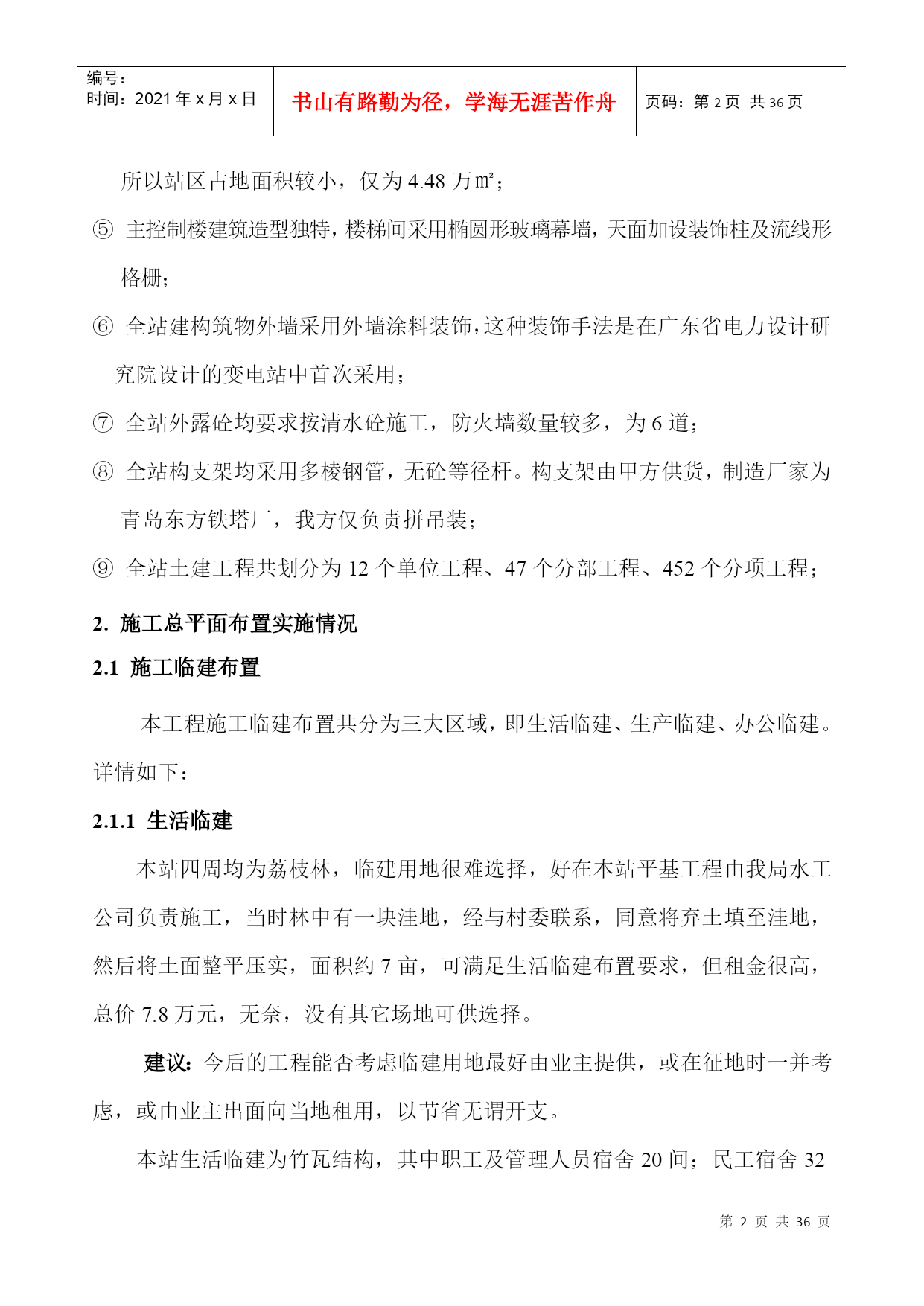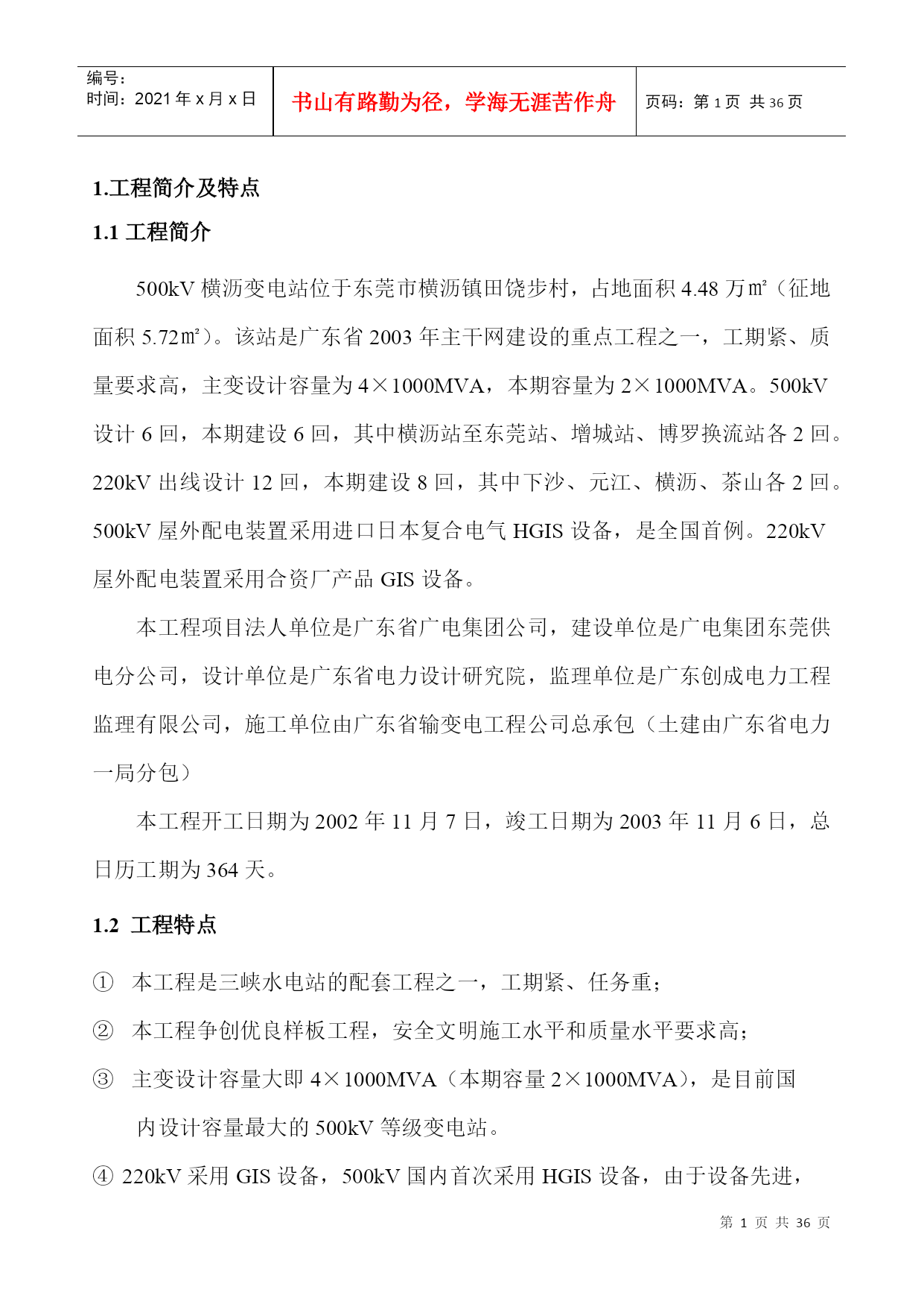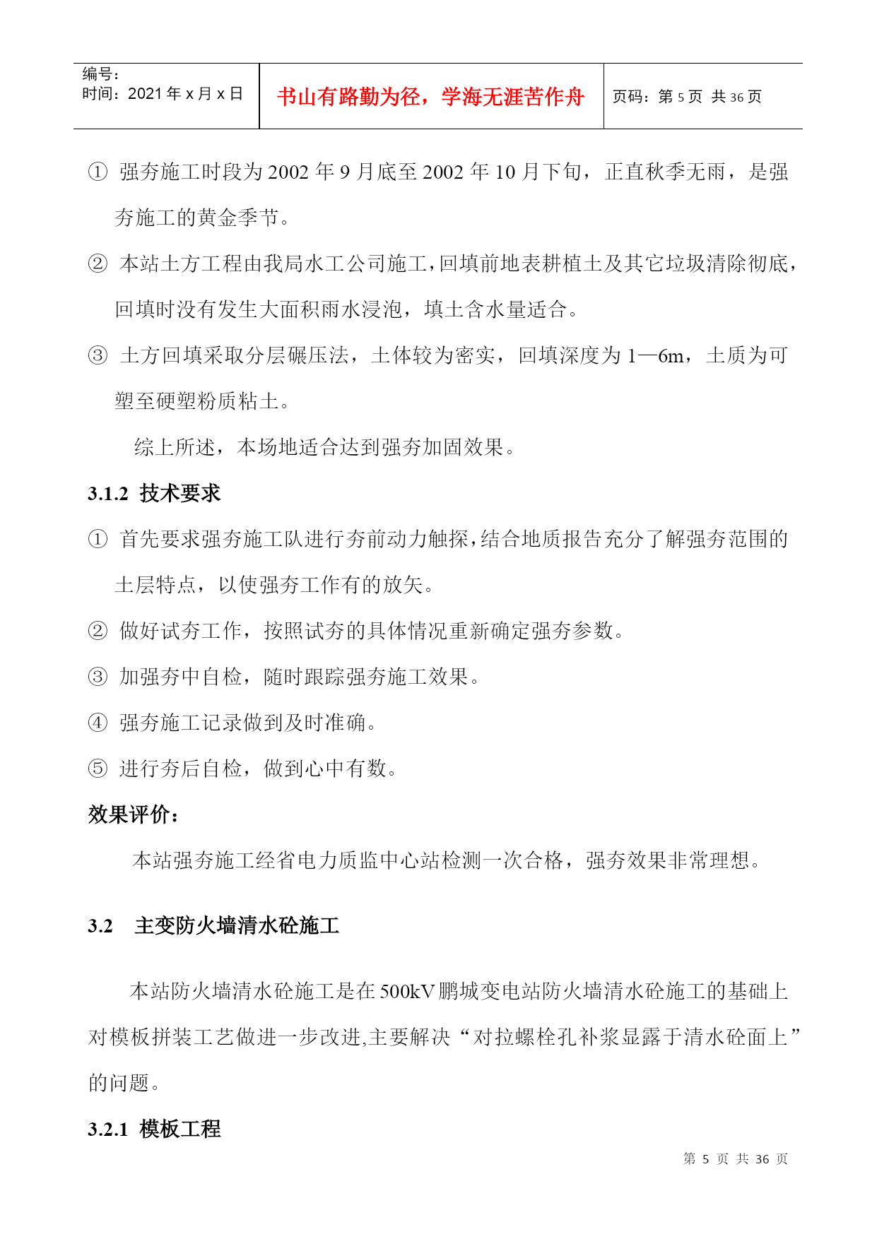 GEFB500kV横沥变电站工程施工组织设计PAGE-PAGE2-500kV东莞横沥变电站工程项目部二○○四年三月500kV横沥变电站土建工程施工技术总结审批:审核:编写:500kV横沥变电站工程项目部二○○四年三月目录TOC\*MERGEFORMAT1.工程简介及特点PAGEREF_Toc67906373\h11.1工程简介PAGEREF_Toc67906374\h11.2工程特点PAGEREF_Toc67906375\h12.施工总平面布置实施情况PAGEREF_Toc67906376\h22.1施工临建布置PAGEREF_Toc67906377\h22.2机械设备选用PAGEREF_Toc67906378\h32.3劳动力配置PAGEREF_Toc67906379\h43.主要施工技术措施PAGEREF_Toc67906380\h43.1强夯施工PAGEREF_Toc67906381\h43.2主变防火墙清水砼施工PAGEREF_Toc67906382\h53.3主控楼施工PAGEREF_Toc67906383\h103.4构支架吊装PAGEREF_Toc67906384\h143.5电缆沟施工PAGEREF_Toc67906385\h153.6公路及砼场地施工PAGEREF_Toc67906386\h173.7预埋件施工PAGEREF_Toc67906387\h193.8竣工资料PAGEREF_Toc67906388\h204.工程管理情况PAGEREF_Toc67906389\h214.1质量目标实施情况PAGEREF_Toc67906390\h214.2安全文明施工及环境管理目标实施情况PAGEREF_Toc67906391\h224.3施工进度计划目标实施情况PAGEREF_Toc67906392\h235.质量管理情况PAGEREF_Toc67906393\h245.1质量预控PAGEREF_Toc67906394\h245.2质量监控PAGEREF_Toc67906395\h255.3质量验收评定PAGEREF_Toc67906396\h286.经济管理情况PAGEREF_Toc67906397\h296.1资金情况PAGEREF_Toc67906398\h296.2成本控制管理PAGEREF_Toc67906399\h297.物资管理情况PAGEREF_Toc67906400\h308.工程创优PAGEREF_Toc67906401\h309.工程施工总体评价PAGEREF_Toc67906402\h30编号:时间:2021年x月x日书山有路勤为径,学海无涯苦作舟页码:第PAGE32页共NUMPAGES36页第PAGE\*MERGEFORMAT32页共NUMPAGES\*MERGEFORMAT36页1.工程简介及特点1.1工程简介500kV横沥变电站位于东莞市横沥镇田饶步村,占地面积4.48万㎡(征地面积5.72㎡)。该站是广东省2003年主干网建设的重点工程之一,工期紧、质量要求高,主变设计容量为4×1000MVA,本期容量为2×1000MVA。500kV设计6回,本期建设6回,其中横沥站至东莞站、增城站、博罗换流站各2回。220kV出线设计12回,本期建设8回,其中下沙、元江、横沥、茶山各2回。500kV屋外配电装置采用进口日本复合电气HGIS设备,是全国首例。220kV屋外配电装置采用合资厂产品GIS设备。本工程项目法人单位是广东省广电集团公司,建设单位是广电集团东莞供电分公司,设计单位是广东省电力设计研究院,监理单位是广东创成电力工程监理有限公司,施工单位由广东省输变电工程公司总承包(土建由广东省电力一局分包)本工程开工日期为2002年11月7日,竣工日期为2003年11月6日,总日历工期为364天。1.2工程特点本工程是三峡水电站的配套工程之一,工期紧、任务重;本工程争创优良样板工程,安全文明施工水平和质量水平要求高;主变设计容量大即4×1000MVA(本期容量2×1000MVA),是目前国内设计容量最大的500kV等级变电站。④220kV采用GIS设备,500kV国内首次采用HGIS设备,由于设备先进,所以站区占地面积较小,仅为4.48万㎡;⑤主控