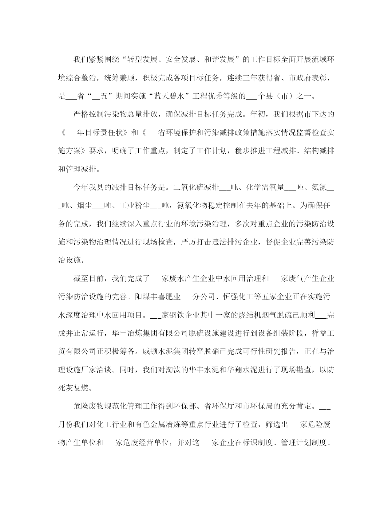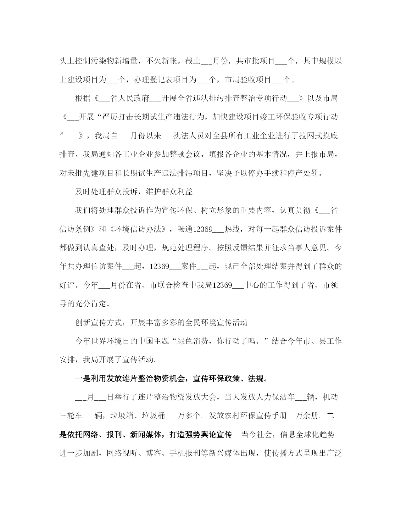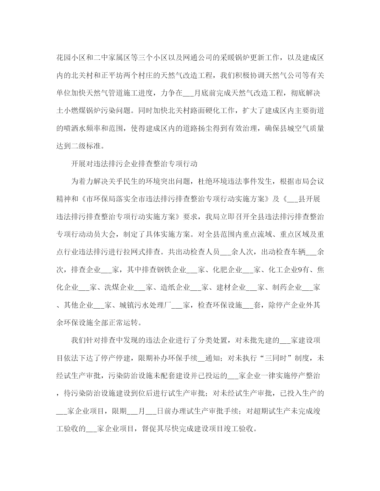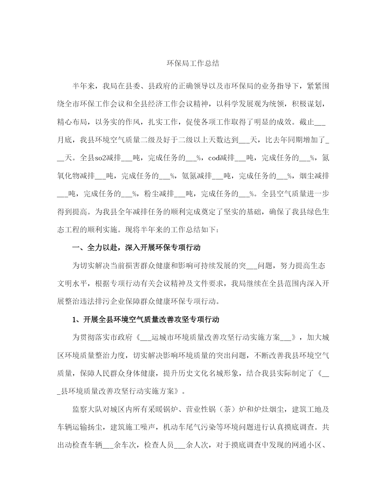 环保局工作总结(完整版)文档资料可直接使用,可编辑,欢迎下载环保局工作总结半年来,我局在县委、县政府的正确领导以及市环保局的业务指导下,紧紧围绕全市环保工作会议和全县经济工作会议精神,以科学发展观为统领,积极谋划,精心布局,以务实的作风,扎实工作,促使各项工作取得了明显的成效。截止___月底,我县环境空气质量二级及好于二级以上天数达到___天,比去年同期增加了___天。全县so2减排___吨,完成任务的___%,cod减排___吨,完成任务的___%,氮氧化物减排___吨,完成任务的___%,氨氮减排___吨,完成任务的___%,烟尘减排___吨,完成任务的___%,粉尘减排___吨,完成任务的___%。全县空气质量进一步得到提高。为我县全年减排任务的顺利完成奠定了坚实的基础,确保了我县绿色生态工程的顺利实施。现将半年来的工作总结如下:一、全力以赴,深入开展环保专项行动为切实解决当前损害群众健康和影响可持续发展的突___问题,努力提高生态文明水平,根据专项行动有关会议精神及文件要求,我局继续在全县范围内深入开展整治违法排污企业保障群众健康环保专项行动。1、开展全县环境空气质量改善攻坚专项行动为贯彻落实市政府《___运城市环境质量改善攻坚行动实施方案___》,加大城区环境质量整治力度,切实解决影响环境质量的突出问题,不断改善我县环境空气质量,保障人民群众身体健康,提升历史文化名城形象,结合我县实际制定了《___县环境质量改善攻坚行动实施方案》。监察大队对城区内所有采暖锅炉、营业性锅(茶)炉和炉灶烟尘,建筑工地及车辆运输扬尘,建筑施工噪声,机动车尾气污染等环境问题进行认真摸底调查。共出动检查车辆___余车次,检查人员___余人次,对于摸底调查中发现的网通小区、花园小区和二中家属区等三个小区以及网通公司的采暖锅炉更新工作,以及建成区内的北关村和正平坊两个村庄的天然气改造工程,我们积极协调天然气公司等有关单位加快天然气管道施工进度,力争在___月底前完成天然气改造工程,彻底解决土小燃煤锅炉污染问题。同时加快北关村路面硬化工作,扩大了建成区内主要街道的喷洒水频率和范围,使得建成区内的道路扬尘得到有效治理,确保县城空气质量达到二级标准。开展对违法排污企业排查整治专项行动为着力解决关乎民生的环境突出问题,杜绝环境违法事件发生,根据市局会议精神和《市环保局落实全市违法排污排查整治专项行动实施方案》及《___县开展违法排污排查整治专项行动实施方案》要求,我局立即召开全县违法排污排查整治专项行动动员大会,制定了具体实施方案。对全县范围内重点流域、重点区域及重点行业违法排污进行拉网式排查。共出动检查人员___余人次,出动检查车辆___余次,排查企业___家,其中排查钢铁企业___家、化肥企业___家、化工企业9有、焦化企业___家、洗煤企业___家、造纸企业___家、建材企业___家、制药企业___家、其他企业___家、城镇污水处理厂___家,检查环保设施___套,除停产企业外其余环保设施全部正常运转。我们针对排查中发现的违法企业进行了分类处置,对未批先建的___家建设项目依法下达了停产停建,限期补办环保手续__通知;对未执行“三同时”制度,未经试生产审批,污染防治设施未配套建设并已投运的___家企业一律实施停产整治,待污染防治设施建设到位后进行试生产审批;对未经试生产审批,已投入生产的___家企业项目,限期___月___日前办理试生产审批手续;对超期试生产未完成竣工验收的___家企业项目,督促其尽快完成建设项目竣工验收。3、开展对国控、省控及重点流域污染源自动在线监控设施的执法检查。根据省环保厅《___完善全省国控污染源废气氮氧化物和废水氨氮自动监控设施建设》__通知,氮氧化物、氨氮是“__五”期间减排考核新增的两项约束性指标。我县国控企业共___家(其中新增的国控企业为___家),省控新增两家,包括重点区域的重点企业___的在线监控设施,我县现在共有___家企业___有废气、废水在线监控设施共___套。为下一步排污收费及企业排污状况提供有效的数据,确保各项污染物稳定达标排放。我们多措并举,从而有效防止了企业的偷排、漏排现象,保障了企业污染防治设施的正常运行,确保了我县汾河流域水环境质量的安全稳定。4、继续加强对汾河流域水环境的监测和监管为确保我县汾河流域水环境质量,我们采取有力措施,继续增加对涉水企业每月不低于二次的监管频次,重点加强对排水企业的监管力度,同时对汾河流经我县的出入境断面不定期采样监测,随时掌握水环境状况。按照市局对汾河区域加强监管,严厉查处偷排漏排等环境违法行为的要求,我局抽调执法人员对全县___家涉水企业的生产废水产生及处理利用情况进行检查,对排水企业实施驻厂监管,连续采样,并完成了废水排放企业