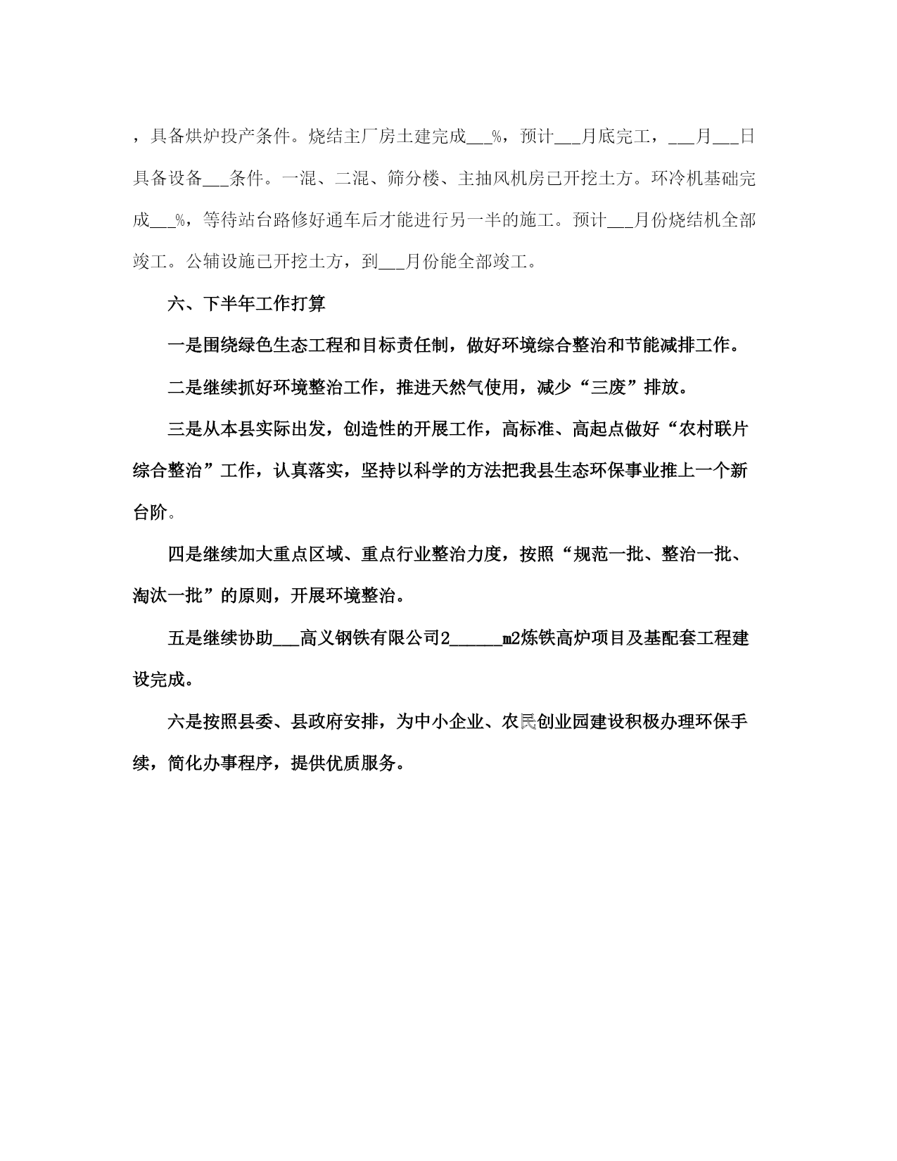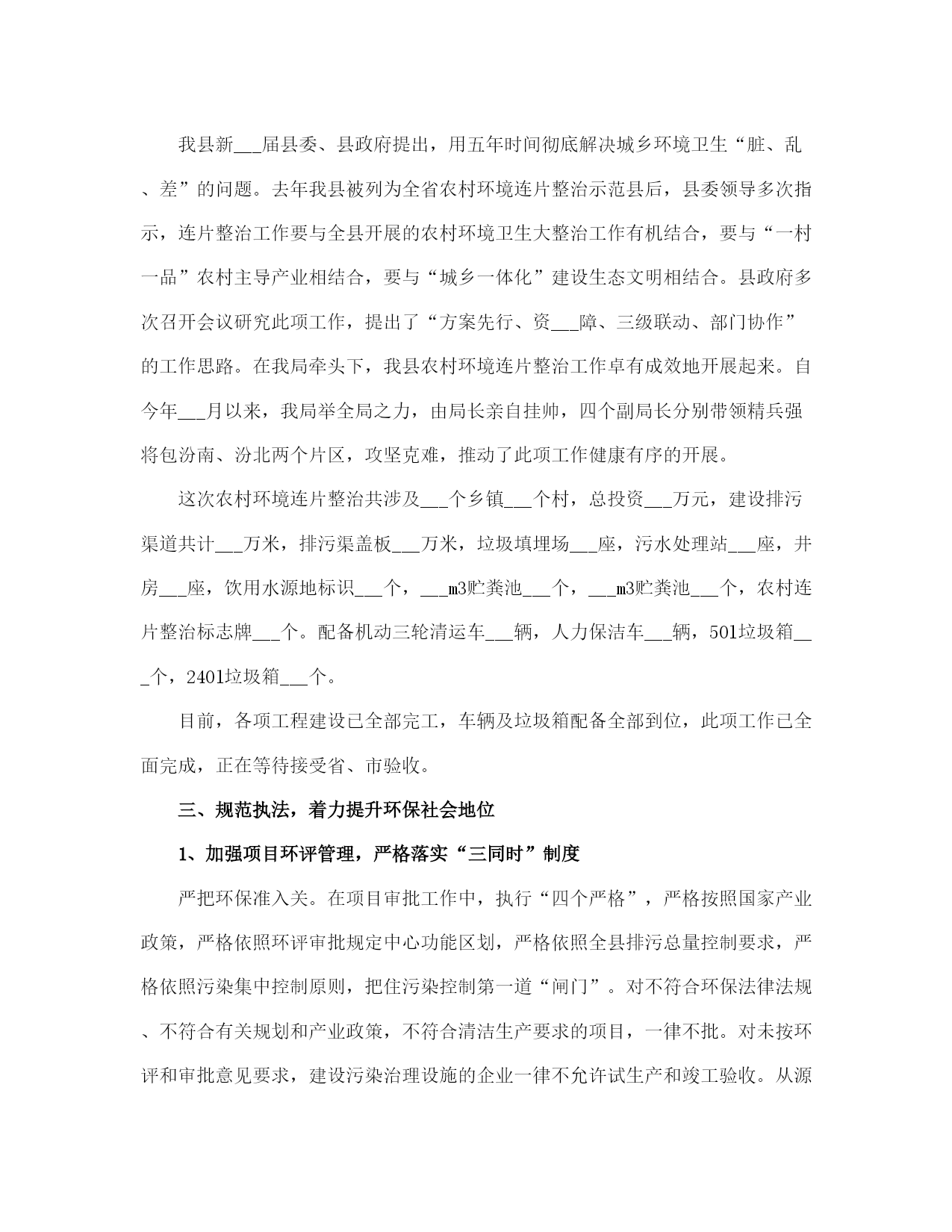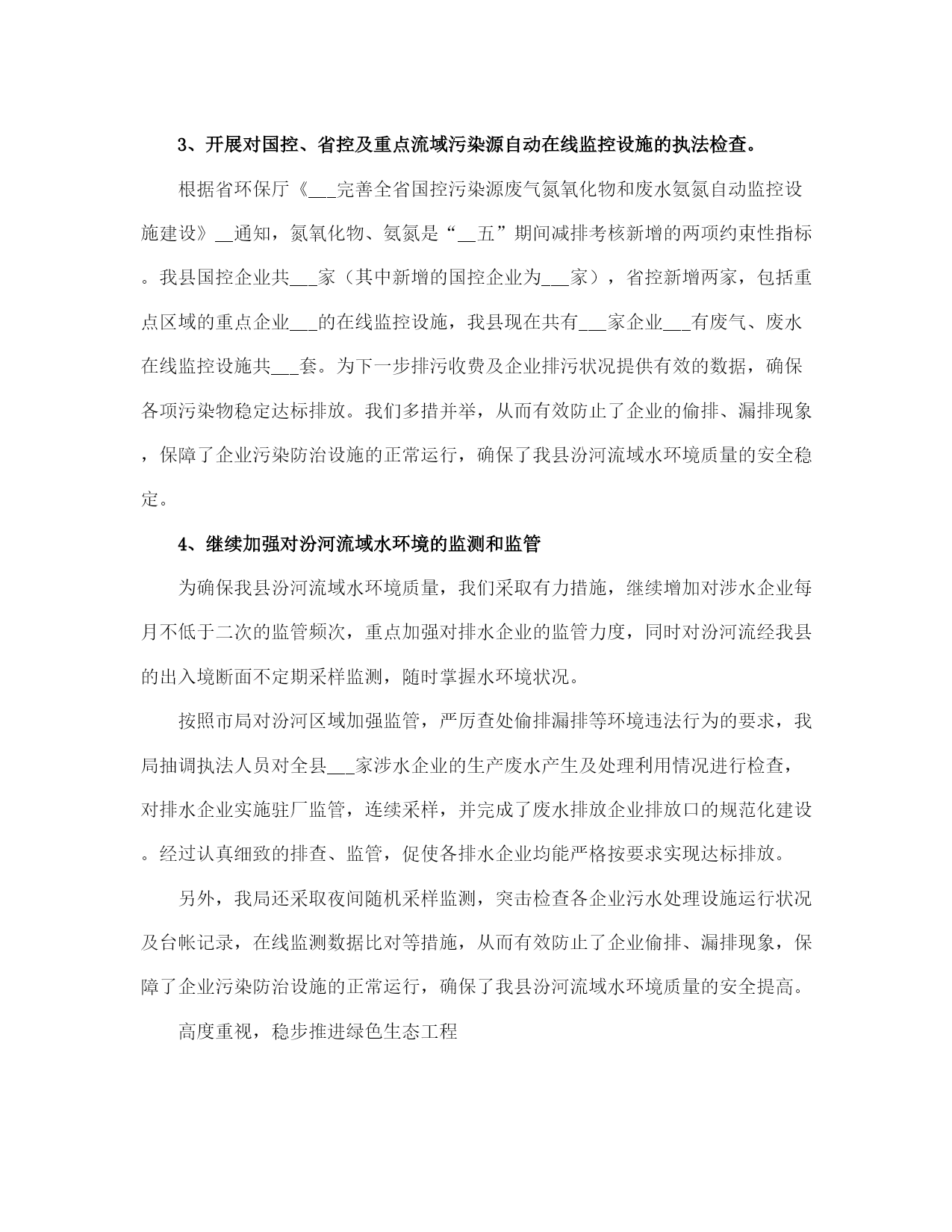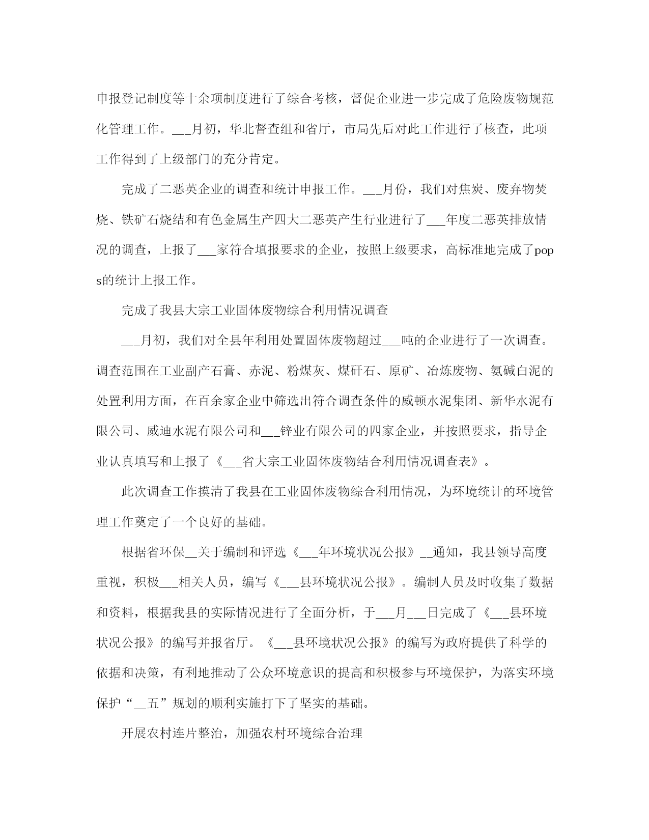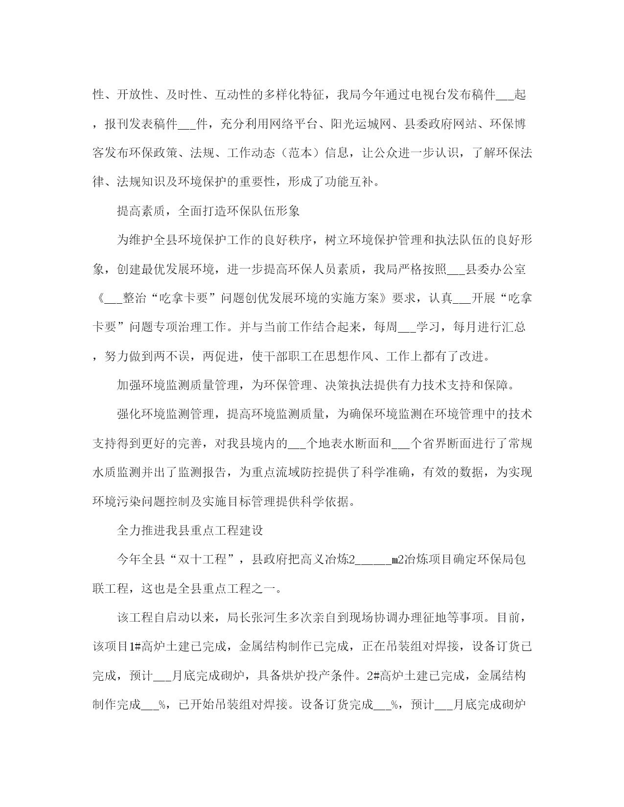 环保局工作总结(完整版)文档资料可直接使用,可编辑,欢迎下载环保局工作总结半年来,我局在县委、县政府的正确领导以及市环保局的业务指导下,紧紧围绕全市环保工作会议和全县经济工作会议精神,以科学发展观为统领,积极谋划,精心布局,以务实的作风,扎实工作,促使各项工作取得了明显的成效。截止___月底,我县环境空气质量二级及好于二级以上天数达到___天,比去年同期增加了___天。全县so2减排___吨,完成任务的___%,cod减排___吨,完成任务的___%,氮氧化物减排___吨,完成任务的___%,氨氮减排___吨,完成任务的___%,烟尘减排___吨,完成任务的___%,粉尘减排___吨,完成任务的___%。全县空气质量进一步得到提高。为我县全年减排任务的顺利完成奠定了坚实的基础,确保了我县绿色生态工程的顺利实施。现将半年来的工作总结如下:一、全力以赴,深入开展环保专项行动为切实解决当前损害群众健康和影响可持续发展的突___问题,努力提高生态文明水平,根据专项行动有关会议精神及文件要求,我局继续在全县范围内深入开展整治违法排污企业保障群众健康环保专项行动。1、开展全县环境空气质量改善攻坚专项行动为贯彻落实市政府《___运城市环境质量改善攻坚行动实施方案___》,加大城区环境质量整治力度,切实解决影响环境质量的突出问题,不断改善我县环境空气质量,保障人民群众身体健康,提升历史文化名城形象,结合我县实际制定了《___县环境质量改善攻坚行动实施方案》。监察大队对城区内所有采暖锅炉、营业性锅(茶)炉和炉灶烟尘,建筑工地及车辆运输扬尘,建筑施工噪声,机动车尾气污染等环境问题进行认真摸底调查。共出动检查车辆___余车次,检查人员___余人次,对于摸底调查中发现的网通小区、花园小区和二中家属区等三个小区以及网通公司的采暖锅炉更新工作,以及建成区内的北关村和正平坊两个村庄的天然气改造工程,我们积极协调天然气公司等有关单位加快天然气管道施工进度,力争在___月底前完成天然气改造工程,彻底解决土小燃煤锅炉污染问题。同时加快北关村路面硬化工作,扩大了建成区内主要街道的喷洒水频率和范围,使得建成区内的道路扬尘得到有效治理,确保县城空气质量达到二级标准。开展对违法排污企业排查整治专项行动为着力解决关乎民生的环境突出问题,杜绝环境违法事件发生,根据市局会议精神和《市环保局落实全市违法排污排查整治专项行动实施方案》及《___县开展违法排污排查整治专项行动实施方案》要求,我局立即召开全县违法排污排查整治专项行动动员大会,制定了具体实施方案。对全县范围内重点流域、重点区域及重点行业违法排污进行拉网式排查。共出动检查人员___余人次,出动检查车辆___余次,排查企业___家,其中排查钢铁企业___家、化肥企业___家、化工企业9有、焦化企业___家、洗煤企业___家、造纸企业___家、建材企业___家、制药企业___家、其他企业___家、城镇污水处理厂___家,检查环保设施___套,除停产企业外其余环保设施全部正常运转。我们针对排查中发现的违法企业进行了分类处置,对未批先建的___家建设项目依法下达了停产停建,限期补办环保手续__通知;对未执行“三同时”制度,未经试生产审批,污染防治设施未配套建设并已投运的___家企业一律实施停产整治,待污染防治设施建设到位后进行试生产审批;对未经试生产审批,已投入生产的___家企业项目,限期___月___日前办理试生产审批手续;对超期试生产未完成竣工验收的___家企业项目,督促其尽快完成建设项目竣工验收。3、开展对国控、省控及重点流域污染源自动在线监控设施的执法检查。根据省环保厅《___完善全省国控污染源废气氮氧化物和废水氨氮自动监控设施建设》__通知,氮氧化物、氨氮是“__五”期间减排考核新增的两项约束性指标。我县国控企业共___家(其中新增的国控企业为___家),省控新增两家,包括重点区域的重点企业___的在线监控设施,我县现在共有___家企业___有废气、废水在线监控设施共___套。为下一步排污收费及企业排污状况提供有效的数据,确保各项污染物稳定达标排放。我们多措并举,从而有效防止了企业的偷排、漏排现象,保障了企业污染防治设施的正常运行,确保了我县汾河流域水环境质量的安全稳定。4、继续加强对汾河流域水环境的监测和监管为确保我县汾河流域水环境质量,我们采取有力措施,继续增加对涉水企业每月不低于二次的监管频次,重点加强对排水企业的监管力度,同时对汾河流经我县的出入境断面不定期采样监测,随时掌握水环境状况。按照市局对汾河区域加强监管,严厉查处偷排漏排等环境违法行为的要求,我局抽调执法人员对全县___家涉水企业的生产废水产生及处理利用情况进行检查,对排水企业实施驻厂监管,连续采样,并完成了废水排放企业