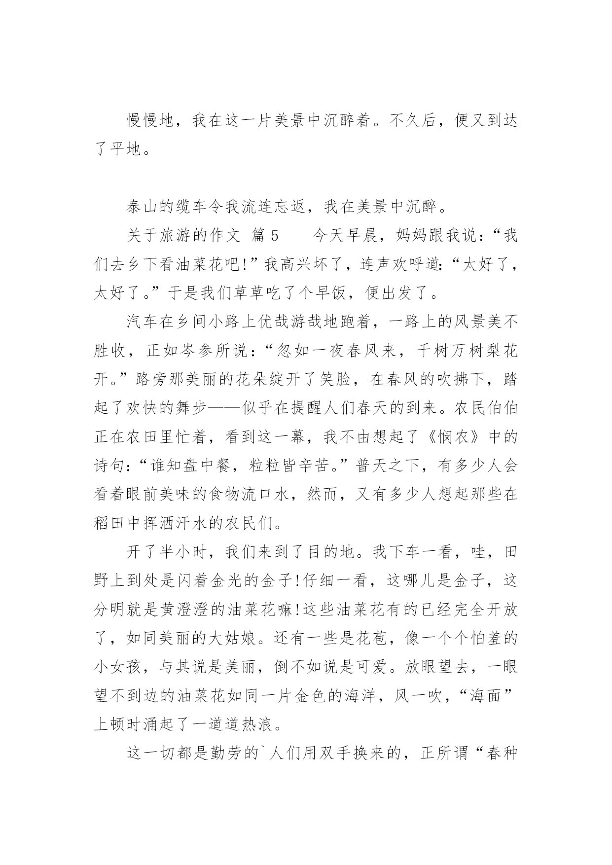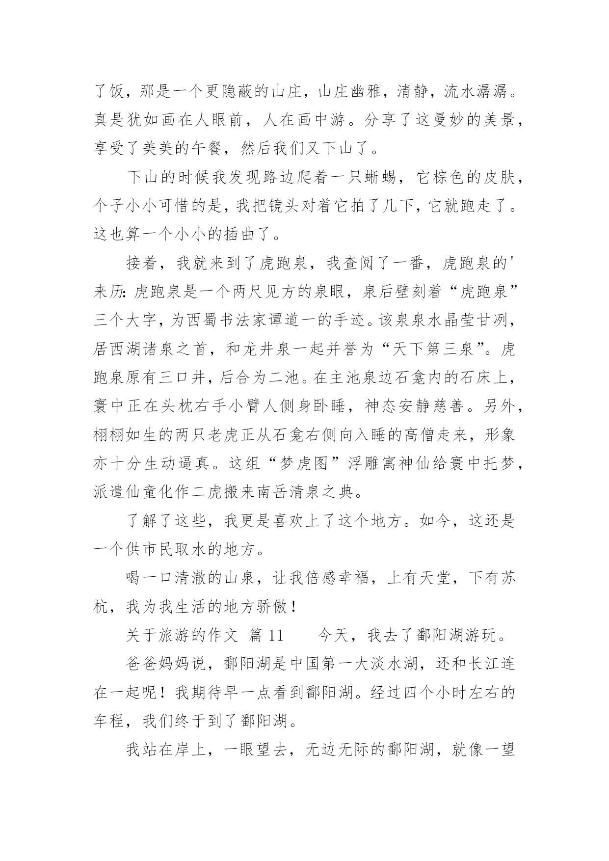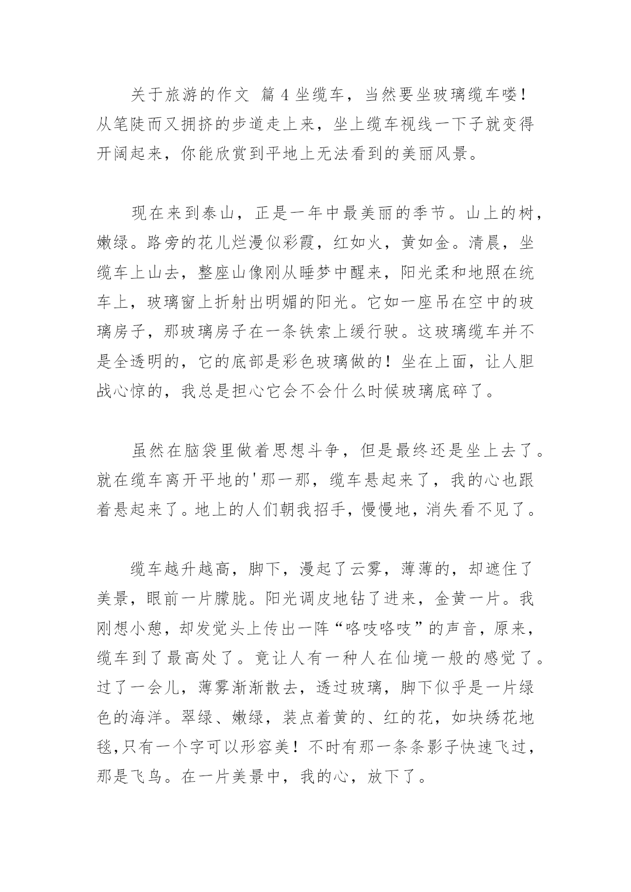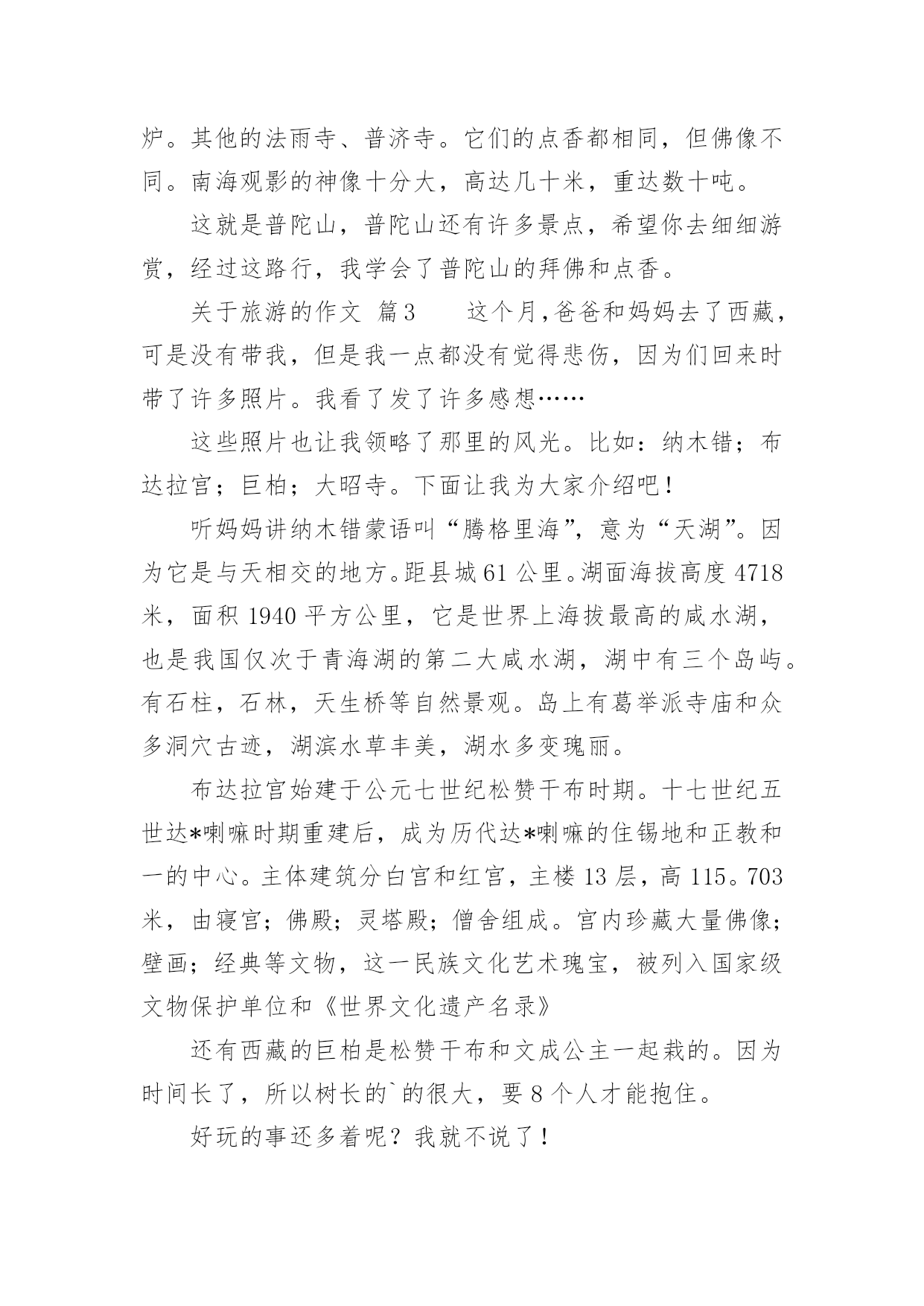 旅游的作文关于旅游的作文14篇(必备)在现实生活或工作学习中,大家都跟作文打过交道吧,作文一定要做到主题集中,围绕同一主题作深入阐述,切忌东拉西扯,主题涣散甚至无主题。那么问题来了,到底应如何写一篇优秀的作文呢?下面是小编收集整理的关于旅游的作文,仅供参考,大家一起来看看吧。关于旅游的作文篇1今天我随着老师同学们去滨海乐园了。来到滨海乐园,这里可真大啊!有碰碰车、激流、勇进、摩天轮、丛林飞鼠……摩天轮可是我最爱玩的项目,我迫不及待地让导游哥哥和汪汪姐姐带我们去玩,我和同学来到碰碰车入口,和几个人一起进了去,我选择了一头黄色的车子,把保护带绑好后,我真是既害怕又高兴,铃声一响我就猛踏加速板,“嗖”的一下车开始前进了,我看到别的人六神无主,把手打着方向盘转,我朝小明开去,一阵巨响声,我把小明碰的吓了一跳,他似已掌好了驾驶技术,向我撞来,我来了一个急转弯才避开了他的攻*,在碰碰车房里,大家撞来撞去,有些老师也认为好玩,也来玩了,似把教学的`疲倦丢了,开始玩起来。脸上也露出了开心的笑容。玩完碰碰车,我们又来到丛林飞鼠,光看滑行车轨道,就让人告别刺激,我们坐上车后,车就一辆接着一辆,我们坐在第一辆车,开始前进了,一开始是一个五六十度的上坡,随后是一个弯道,弯道过去一个大下坡又是一个拐弯,差点没把我甩出去,把我的头都给搞晕了。最惊险的是滑行车一直在往下沉,突然一拐弯-----这个弯道可不是一般的弯道,而是整个车都笔直地过去,如果不开快的话准会翻车,真险吧!还有好多好玩的,可是由于时间的问题我们也没有去玩了,只有依依不舍的离开了乐园。今天我真的好开心,玩的非常愉快。也许晚上做梦我还在摩天伦上呢?呵呵……关于旅游的作文篇2今年寒假是个十分有乐趣的寒假。正月初六,我们一家三口自己开车去旅游,我爸安排好要到舟山的一个风景区,叫普陀山,那里是历史很久的一个风景区,我们开了三个小时多到了舟山,把车停在岸边。本来是想在外面住一夜再去的,我爸却说:“现在就去。”我无奈之下,只好坐船去普陀山。上了普陀山,我们买了几只短香,正准备去慧济寺时,突然,有个人说:“老板,我给你们当导游,钱要1000元。”然后说三说四,说个没完没了。最后无奈之下,我爸只好答应了。这时来了三位老乡,他们说要和我们一起平均付钱,我爸答应了。导游在车上叫吧我们怎样拜佛,在慧济寺有好几座佛像,你一个一个数过去,数到你自己年龄,他就是你今年的`守护神,你如果向他许愿,就很可能会成真,这里的点香就更奇怪了,香只能用短香,点燃了香后燃了香后,还要向四周拜三下,最后扔入火炉。其他的法雨寺、普济寺。它们的点香都相同,但佛像不同。南海观影的神像十分大,高达几十米,重达数十吨。这就是普陀山,普陀山还有许多景点,希望你去细细游赏,经过这路行,我学会了普陀山的拜佛和点香。关于旅游的作文篇3这个月,爸爸和妈妈去了西藏,可是没有带我,但是我一点都没有觉得悲伤,因为们回来时带了许多照片。我看了发了许多感想……这些照片也让我领略了那里的风光。比如:纳木错;布达拉宫;巨柏;大昭寺。下面让我为大家介绍吧!听妈妈讲纳木错蒙语叫“腾格里海”,意为“天湖”。因为它是与天相交的地方。距县城61公里。湖面海拔高度4718米,面积1940平方公里,它是世界上海拔最高的咸水湖,也是我国仅次于青海湖的第二大咸水湖,湖中有三个岛屿。有石柱,石林,天生桥等自然景观。岛上有葛举派寺庙和众多洞穴古迹,湖滨水草丰美,湖水多变瑰丽。布达拉宫始建于公元七世纪松赞干布时期。十七世纪五世达*喇嘛时期重建后,成为历代达*喇嘛的住锡地和正教和一的中心。主体建筑分白宫和红宫,主楼13层,高115。703米,由寝宫;佛殿;灵塔殿;僧舍组成。宫内珍藏大量佛像;壁画;经典等文物,这一民族文化艺术瑰宝,被列入国家级文物保护单位和《世界文化遗产名录》还有西藏的巨柏是松赞干布和文成公主一起栽的。因为时间长了,所以树长的`的很大,要8个人才能抱住。好玩的事还多着呢?我就不说了!关于旅游的作文篇4坐缆车,当然要坐玻璃缆车喽!从笔陡而又拥挤的步道走上来,坐上缆车视线一下子就变得开阔起来,你能欣赏到平地上无法看到的美丽风景。现在来到泰山,正是一年中最美丽的季节。山上的树,嫩绿。路旁的花儿烂漫似彩霞,红如火,黄如金。清晨,坐缆车上山去,整座山像刚从睡梦中醒来,阳光柔和地照在统车上,玻璃窗上折射出明媚的阳光。它如一座吊在空中的玻璃房子,那玻璃房子在一条铁索上缓行驶。这玻璃缆车并不是全透明的,它的底部是彩色玻璃做的!坐在上面,让人胆战心惊的,我总是担心它会不会什么时候玻璃底碎了。虽然在脑袋里做着思想斗争,但是最终还是坐上去了。就在缆车离开平地的'那一那,缆车悬起来了,我的心也跟着悬起来了。地上的人们朝我招手,慢慢地,消失看不见了。缆车越升越高,脚下,漫起了云雾,薄薄的,却遮住了美