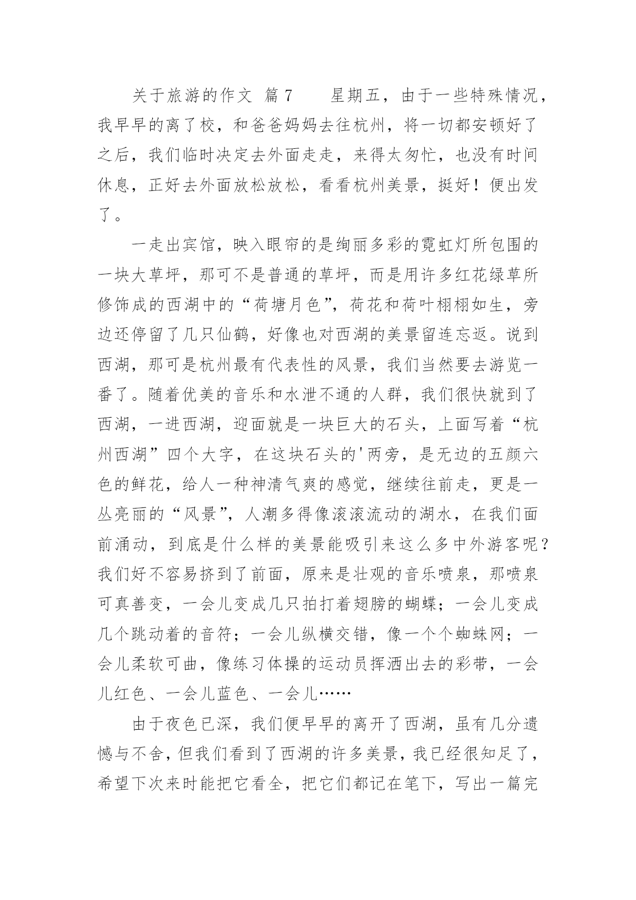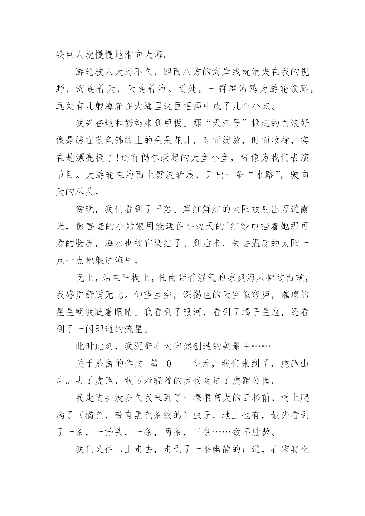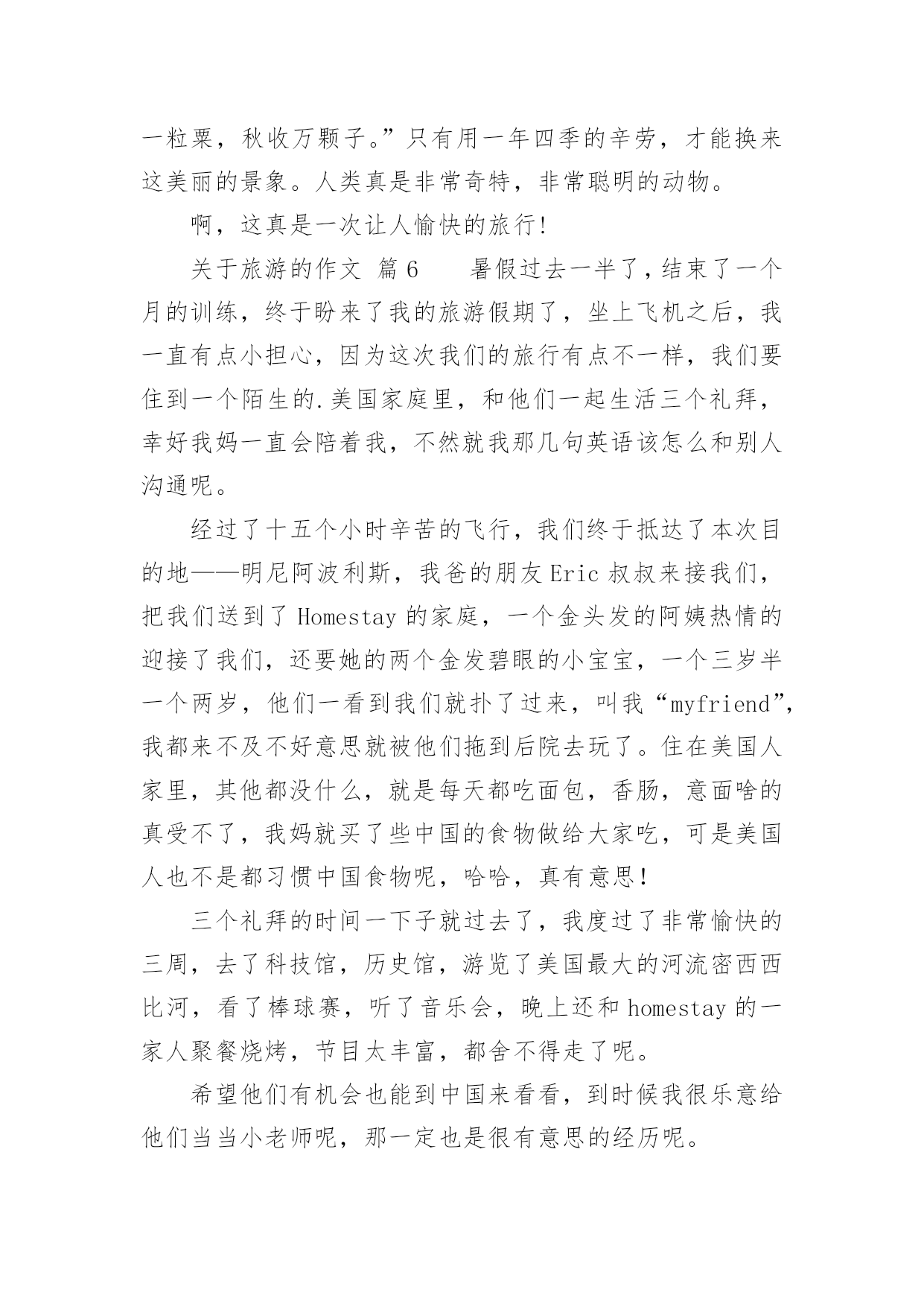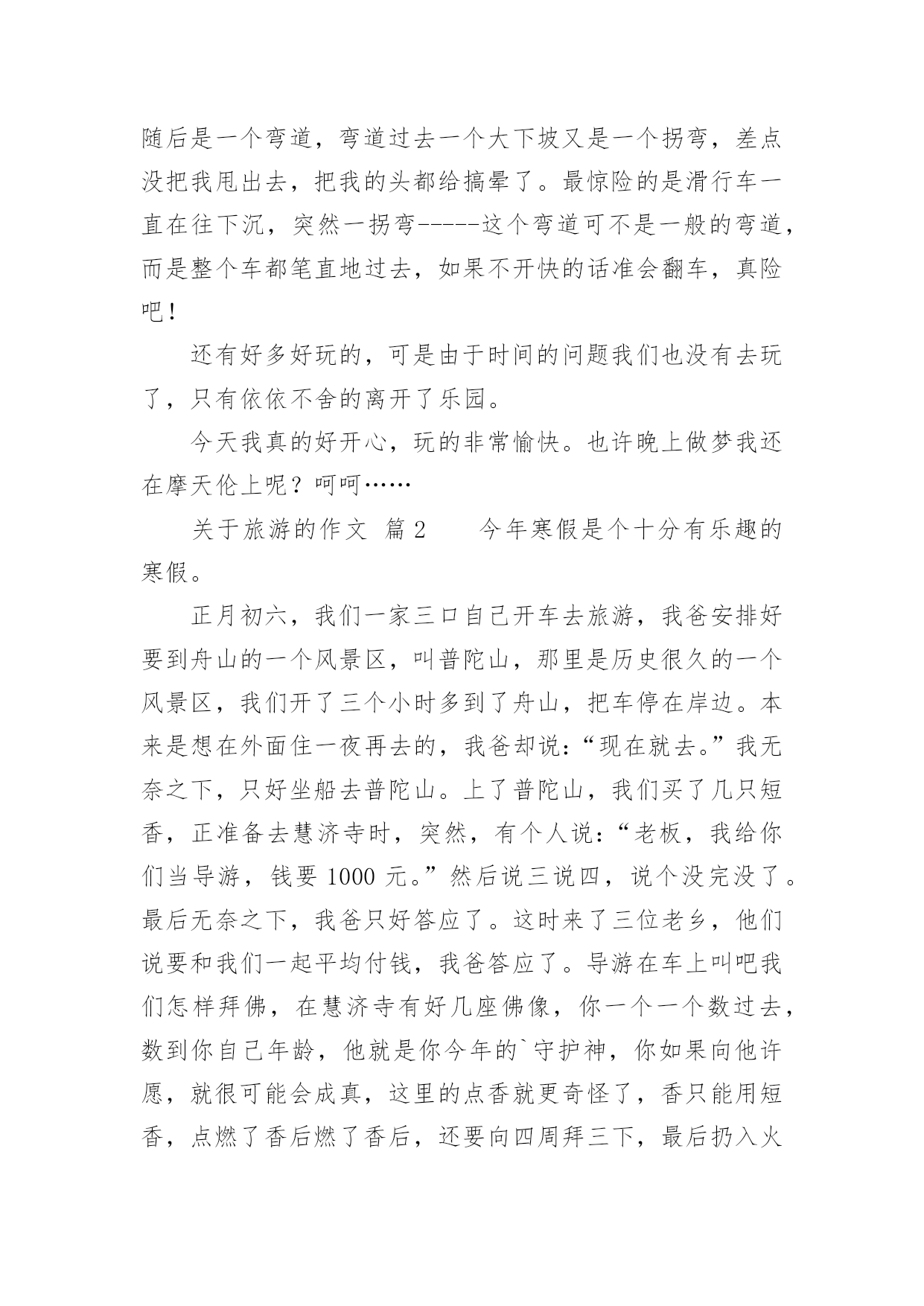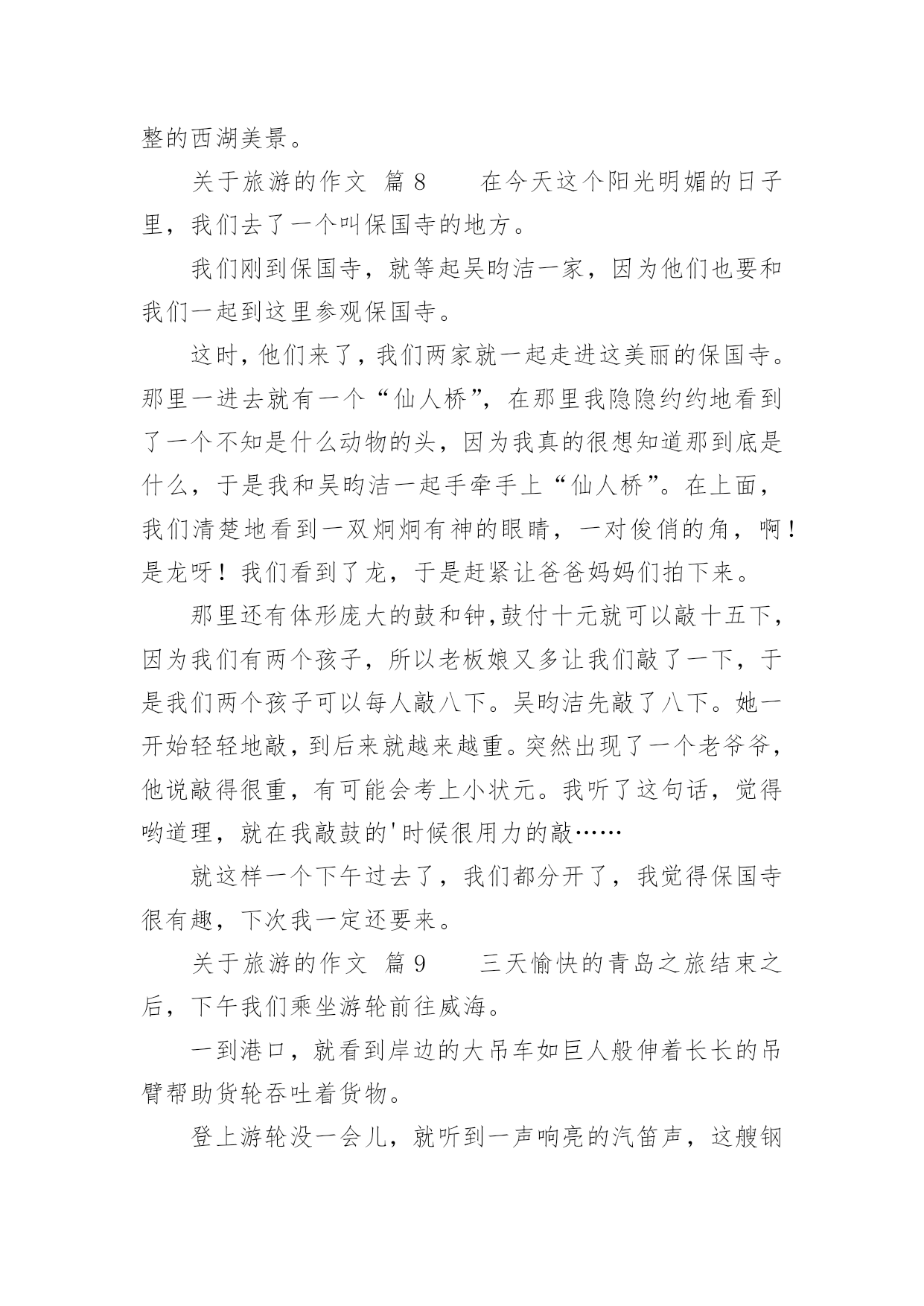 旅游的作文关于旅游的作文14篇(必备)在现实生活或工作学习中,大家都跟作文打过交道吧,作文一定要做到主题集中,围绕同一主题作深入阐述,切忌东拉西扯,主题涣散甚至无主题。那么问题来了,到底应如何写一篇优秀的作文呢?下面是小编收集整理的关于旅游的作文,仅供参考,大家一起来看看吧。关于旅游的作文篇1今天我随着老师同学们去滨海乐园了。来到滨海乐园,这里可真大啊!有碰碰车、激流、勇进、摩天轮、丛林飞鼠……摩天轮可是我最爱玩的项目,我迫不及待地让导游哥哥和汪汪姐姐带我们去玩,我和同学来到碰碰车入口,和几个人一起进了去,我选择了一头黄色的车子,把保护带绑好后,我真是既害怕又高兴,铃声一响我就猛踏加速板,“嗖”的一下车开始前进了,我看到别的人六神无主,把手打着方向盘转,我朝小明开去,一阵巨响声,我把小明碰的吓了一跳,他似已掌好了驾驶技术,向我撞来,我来了一个急转弯才避开了他的攻*,在碰碰车房里,大家撞来撞去,有些老师也认为好玩,也来玩了,似把教学的`疲倦丢了,开始玩起来。脸上也露出了开心的笑容。玩完碰碰车,我们又来到丛林飞鼠,光看滑行车轨道,就让人告别刺激,我们坐上车后,车就一辆接着一辆,我们坐在第一辆车,开始前进了,一开始是一个五六十度的上坡,随后是一个弯道,弯道过去一个大下坡又是一个拐弯,差点没把我甩出去,把我的头都给搞晕了。最惊险的是滑行车一直在往下沉,突然一拐弯-----这个弯道可不是一般的弯道,而是整个车都笔直地过去,如果不开快的话准会翻车,真险吧!还有好多好玩的,可是由于时间的问题我们也没有去玩了,只有依依不舍的离开了乐园。今天我真的好开心,玩的非常愉快。也许晚上做梦我还在摩天伦上呢?呵呵……关于旅游的作文篇2今年寒假是个十分有乐趣的寒假。正月初六,我们一家三口自己开车去旅游,我爸安排好要到舟山的一个风景区,叫普陀山,那里是历史很久的一个风景区,我们开了三个小时多到了舟山,把车停在岸边。本来是想在外面住一夜再去的,我爸却说:“现在就去。”我无奈之下,只好坐船去普陀山。上了普陀山,我们买了几只短香,正准备去慧济寺时,突然,有个人说:“老板,我给你们当导游,钱要1000元。”然后说三说四,说个没完没了。最后无奈之下,我爸只好答应了。这时来了三位老乡,他们说要和我们一起平均付钱,我爸答应了。导游在车上叫吧我们怎样拜佛,在慧济寺有好几座佛像,你一个一个数过去,数到你自己年龄,他就是你今年的`守护神,你如果向他许愿,就很可能会成真,这里的点香就更奇怪了,香只能用短香,点燃了香后燃了香后,还要向四周拜三下,最后扔入火炉。其他的法雨寺、普济寺。它们的点香都相同,但佛像不同。南海观影的神像十分大,高达几十米,重达数十吨。这就是普陀山,普陀山还有许多景点,希望你去细细游赏,经过这路行,我学会了普陀山的拜佛和点香。关于旅游的作文篇3这个月,爸爸和妈妈去了西藏,可是没有带我,但是我一点都没有觉得悲伤,因为们回来时带了许多照片。我看了发了许多感想……这些照片也让我领略了那里的风光。比如:纳木错;布达拉宫;巨柏;大昭寺。下面让我为大家介绍吧!听妈妈讲纳木错蒙语叫“腾格里海”,意为“天湖”。因为它是与天相交的地方。距县城61公里。湖面海拔高度4718米,面积1940平方公里,它是世界上海拔最高的咸水湖,也是我国仅次于青海湖的第二大咸水湖,湖中有三个岛屿。有石柱,石林,天生桥等自然景观。岛上有葛举派寺庙和众多洞穴古迹,湖滨水草丰美,湖水多变瑰丽。布达拉宫始建于公元七世纪松赞干布时期。十七世纪五世达*喇嘛时期重建后,成为历代达*喇嘛的住锡地和正教和一的中心。主体建筑分白宫和红宫,主楼13层,高115。703米,由寝宫;佛殿;灵塔殿;僧舍组成。宫内珍藏大量佛像;壁画;经典等文物,这一民族文化艺术瑰宝,被列入国家级文物保护单位和《世界文化遗产名录》还有西藏的巨柏是松赞干布和文成公主一起栽的。因为时间长了,所以树长的`的很大,要8个人才能抱住。好玩的事还多着呢?我就不说了!关于旅游的作文篇4坐缆车,当然要坐玻璃缆车喽!从笔陡而又拥挤的步道走上来,坐上缆车视线一下子就变得开阔起来,你能欣赏到平地上无法看到的美丽风景。现在来到泰山,正是一年中最美丽的季节。山上的树,嫩绿。路旁的花儿烂漫似彩霞,红如火,黄如金。清晨,坐缆车上山去,整座山像刚从睡梦中醒来,阳光柔和地照在统车上,玻璃窗上折射出明媚的阳光。它如一座吊在空中的玻璃房子,那玻璃房子在一条铁索上缓行驶。这玻璃缆车并不是全透明的,它的底部是彩色玻璃做的!坐在上面,让人胆战心惊的,我总是担心它会不会什么时候玻璃底碎了。虽然在脑袋里做着思想斗争,但是最终还是坐上去了。就在缆车离开平地的'那一那,缆车悬起来了,我的心也跟着悬起来了。地上的人们朝我招手,慢慢地,消失看不见了。缆车越升越高,脚下,漫起了云雾,薄薄的,却遮住了美