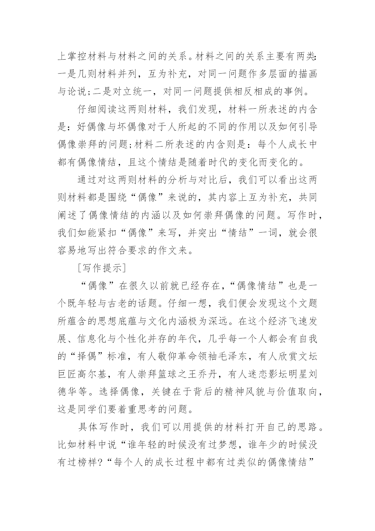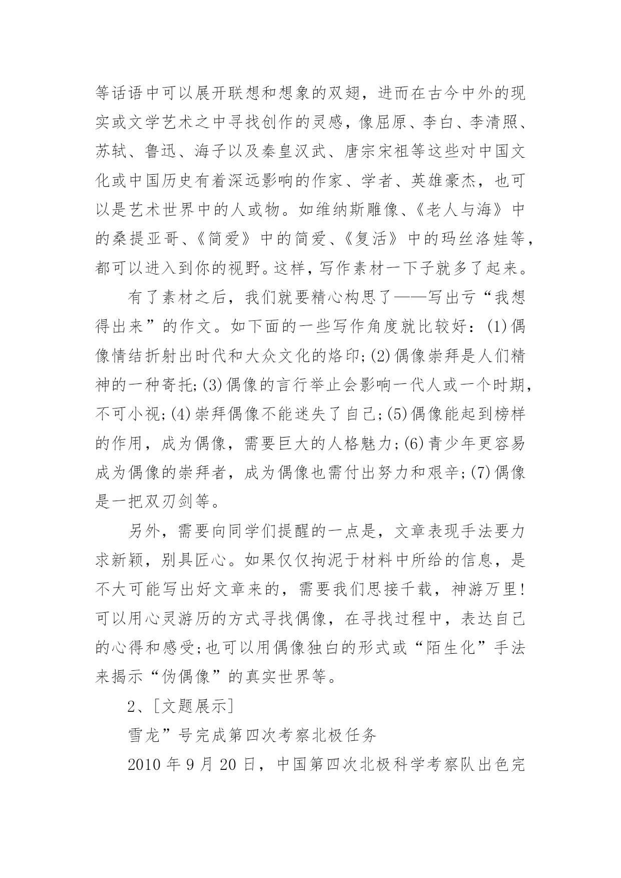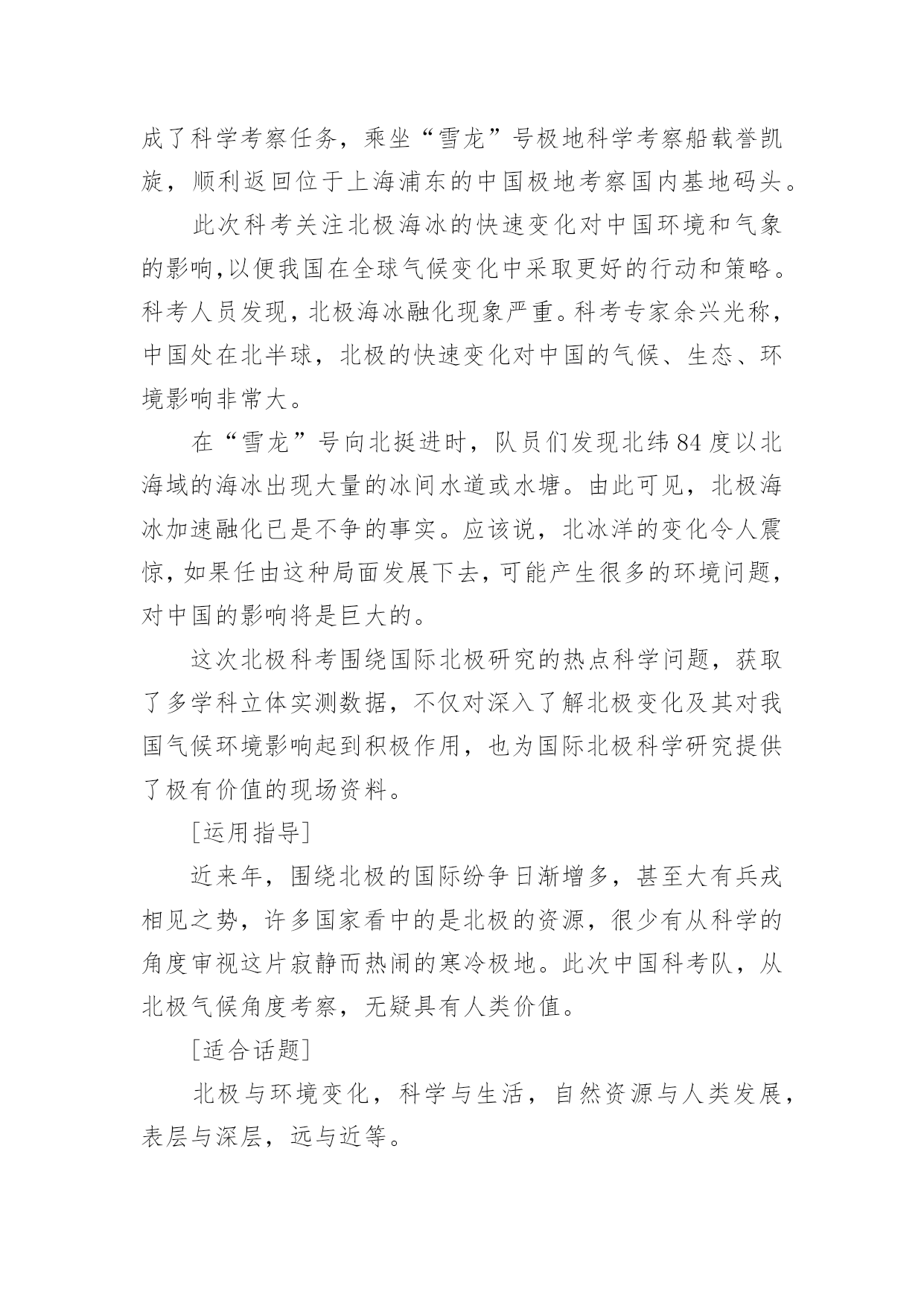 高考新材料作文素材高考新材料作文素材素材,指的是作者从现实生活中搜集到的、未经整理加工的、感性的、分散的原始材料。小编收集了高考新材料作文素材,欢迎阅读。1、阅读下面的文字,根据要求作文。材料一:谁年轻的时候没有过梦想,谁年少的时候没有过榜样?好的偶像能够成就一代人的志向、理想和美好的精神家园,而不好的偶像则会误人志向、毁人前程。在引导崇拜偶像时,我们要大力呼唤和推出“英雄偶像”,逐渐将那些“反面偶像”逐出舞台。材料二:影视歌明星,总是引领着一个时代的流行潮流。无论是昙花一现的辉煌还是常青藤般的经久不衰,他们带给人们的震撼与激情,是可以穿透岁月和记忆的。每个人的成长过程中都有过类似的偶像情结,只不过因所处的时代不同,意义与价值观也随之大相径庭。请根据你对以上材料的理解和体会,选准角度,写一篇作文。要求:自选文体,自拟标题,不少于800字。[审题指导]此作文题由两则材料构成,即我们平常所说的多材料作文。多材料作文一般由两则或两则以上的材料构成,比单则材料要复杂,不但需要弄清每则材料的大旨,还需要从整体上掌控材料与材料之间的关系。材料之间的关系主要有两类:一是几则材料并列,互为补充,对同一问题作多层面的描画与论说;二是对立统一,对同一问题提供相反相成的事例。仔细阅读这两则材料,我们发现,材料一所表述的内含是:好偶像与坏偶像对于人所起的不同的作用以及如何引导偶像崇拜的问题;材料二所表述的内含则是:每个人成长中都有偶像情结,且这个情结是随着时代的变化而变化的。通过对这两则材料的分析与对比后,我们可以看出这两则材料都是围绕“偶像”来说的,其内容上互为补充,共同阐述了偶像情结的内涵以及如何崇拜偶像的问题。写作时,我们如能紧扣“偶像”来写,并突出“情结”一词,就会很容易地写出符合要求的作文来。[写作提示]“偶像”在很久以前就已经存在,“偶像情结”也是一个既年轻与古老的话题。仔细一想,我们便会发现这个文题所蕴含的思想底蕴与文化内涵极为深远。在这个经济飞速发展、信息化与个性化并存的年代,几乎每一个人都会有自我的“择偶”标准,有人敬仰革命领袖毛泽东,有人欣赏文坛巨匠高尔基,有人崇拜篮球之王乔丹,有人迷恋影坛明星刘德华等。选择偶像,关键在于背后的精神风貌与价值取向,这是同学们要着重思考的问题。具体写作时,我们可以用提供的材料打开自己的思路。比如材料中说“谁年轻的时候没有过梦想,谁年少的时候没有过榜样?“每个人的成长过程中都有过类似的偶像情结”等话语中可以展开联想和想象的双翅,进而在古今中外的现实或文学艺术之中寻找创作的灵感,像屈原、李白、李清照、苏轼、鲁迅、海子以及秦皇汉武、唐宗宋祖等这些对中国文化或中国历史有着深远影响的作家、学者、英雄豪杰,也可以是艺术世界中的人或物。如维纳斯雕像、《老人与海》中的桑提亚哥、《简爱》中的简爱、《复活》中的玛丝洛娃等,都可以进入到你的视野。这样,写作素材一下子就多了起来。有了素材之后,我们就要精心构思了——写出亏“我想得出来”的作文。如下面的一些写作角度就比较好:(1)偶像情结折射出时代和大众文化的烙印;(2)偶像崇拜是人们精神的一种寄托;(3)偶像的言行举止会影响一代人或一个时期,不可小视;(4)崇拜偶像不能迷失了自己;(5)偶像能起到榜样的作用,成为偶像,需要巨大的人格魅力;(6)青少年更容易成为偶像的崇拜者,成为偶像也需付出努力和艰辛;(7)偶像是一把双刃剑等。另外,需要向同学们提醒的一点是,文章表现手法要力求新颖,别具匠心。如果仅仅拘泥于材料中所给的信息,是不大可能写出好文章来的,需要我们思接千载,神游万里!可以用心灵游历的方式寻找偶像,在寻找过程中,表达自己的心得和感受;也可以用偶像独白的形式或“陌生化”手法来揭示“伪偶像”的真实世界等。2、[文题展示]雪龙”号完成第四次考察北极任务2010年9月20日,中国第四次北极科学考察队出色完成了科学考察任务,乘坐“雪龙”号极地科学考察船载誉凯旋,顺利返回位于上海浦东的中国极地考察国内基地码头。此次科考关注北极海冰的快速变化对中国环境和气象的影响,以便我国在全球气候变化中采取更好的行动和策略。科考人员发现,北极海冰融化现象严重。科考专家余兴光称,中国处在北半球,北极的快速变化对中国的气候、生态、环境影响非常大。在“雪龙”号向北挺进时,队员们发现北纬84度以北海域的海冰出现大量的冰间水道或水塘。由此可见,北极海冰加速融化已是不争的事实。应该说,北冰洋的变化令人震惊,如果任由这种局面发展下去,可能产生很多的环境问题,对中国的影响将是巨大的。这次北极科考围绕国际北极研究的热点科学问题,获取了多学科立体实测数据,不仅对深入了解北极变化及其对我国气候环境影响起到积极作用,也为国际北极科学研究提供了极有价值的现场资料。[运用指导]近来年,围绕北极的国际纷争日渐增多,甚至大
