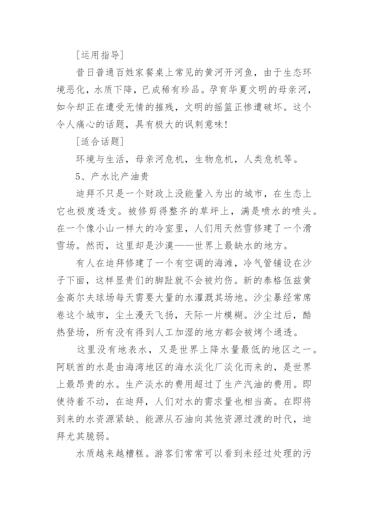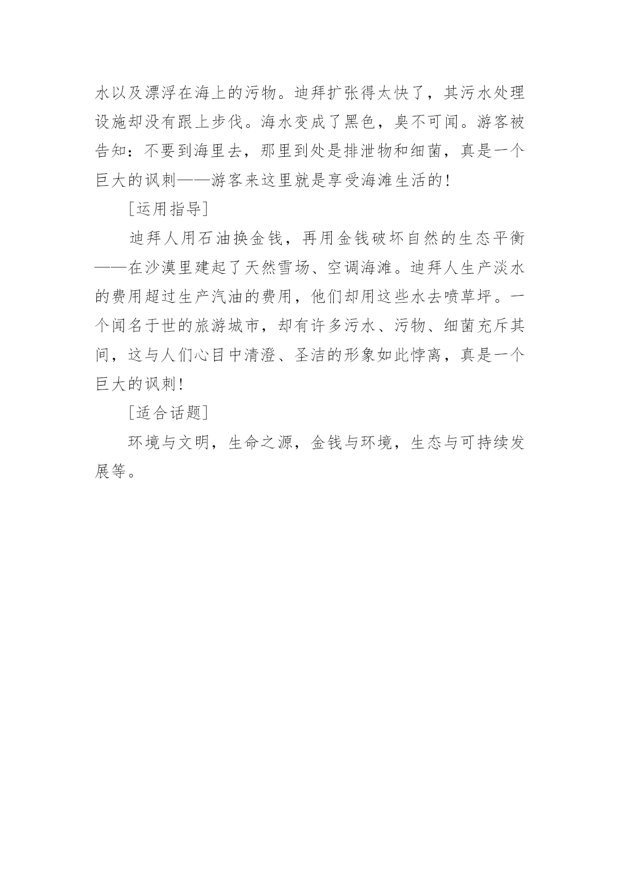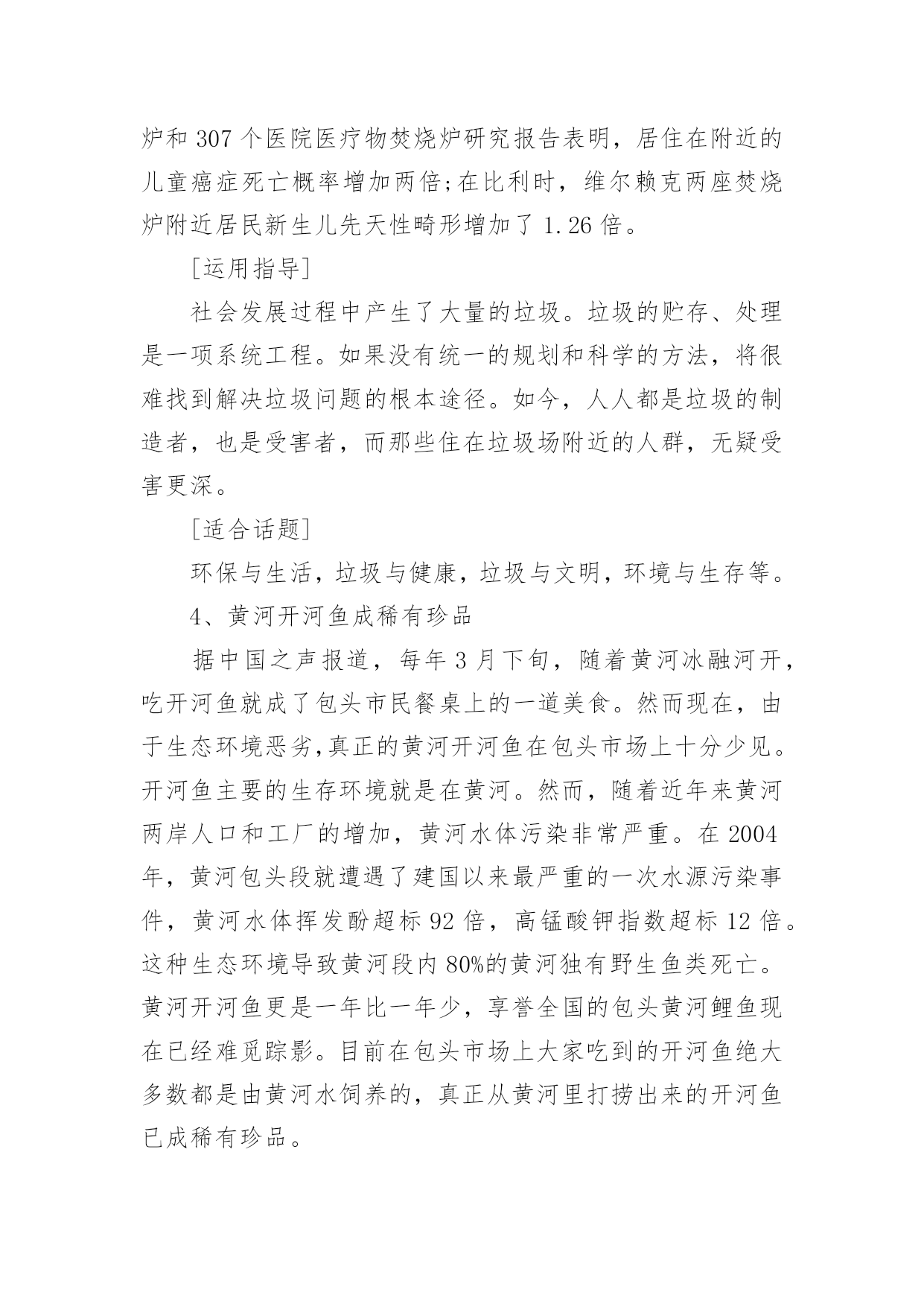 高考新材料作文素材高考新材料作文素材素材,指的是作者从现实生活中搜集到的、未经整理加工的、感性的、分散的原始材料。小编收集了高考新材料作文素材,欢迎阅读。1、阅读下面的文字,根据要求作文。材料一:谁年轻的时候没有过梦想,谁年少的时候没有过榜样?好的偶像能够成就一代人的志向、理想和美好的精神家园,而不好的偶像则会误人志向、毁人前程。在引导崇拜偶像时,我们要大力呼唤和推出“英雄偶像”,逐渐将那些“反面偶像”逐出舞台。材料二:影视歌明星,总是引领着一个时代的流行潮流。无论是昙花一现的辉煌还是常青藤般的经久不衰,他们带给人们的震撼与激情,是可以穿透岁月和记忆的。每个人的成长过程中都有过类似的偶像情结,只不过因所处的时代不同,意义与价值观也随之大相径庭。请根据你对以上材料的理解和体会,选准角度,写一篇作文。要求:自选文体,自拟标题,不少于800字。[审题指导]此作文题由两则材料构成,即我们平常所说的多材料作文。多材料作文一般由两则或两则以上的材料构成,比单则材料要复杂,不但需要弄清每则材料的大旨,还需要从整体上掌控材料与材料之间的关系。材料之间的关系主要有两类:一是几则材料并列,互为补充,对同一问题作多层面的描画与论说;二是对立统一,对同一问题提供相反相成的事例。仔细阅读这两则材料,我们发现,材料一所表述的内含是:好偶像与坏偶像对于人所起的不同的作用以及如何引导偶像崇拜的问题;材料二所表述的内含则是:每个人成长中都有偶像情结,且这个情结是随着时代的变化而变化的。通过对这两则材料的分析与对比后,我们可以看出这两则材料都是围绕“偶像”来说的,其内容上互为补充,共同阐述了偶像情结的内涵以及如何崇拜偶像的问题。写作时,我们如能紧扣“偶像”来写,并突出“情结”一词,就会很容易地写出符合要求的作文来。[写作提示]“偶像”在很久以前就已经存在,“偶像情结”也是一个既年轻与古老的话题。仔细一想,我们便会发现这个文题所蕴含的思想底蕴与文化内涵极为深远。在这个经济飞速发展、信息化与个性化并存的年代,几乎每一个人都会有自我的“择偶”标准,有人敬仰革命领袖毛泽东,有人欣赏文坛巨匠高尔基,有人崇拜篮球之王乔丹,有人迷恋影坛明星刘德华等。选择偶像,关键在于背后的精神风貌与价值取向,这是同学们要着重思考的问题。具体写作时,我们可以用提供的材料打开自己的思路。比如材料中说“谁年轻的时候没有过梦想,谁年少的时候没有过榜样?“每个人的成长过程中都有过类似的偶像情结”等话语中可以展开联想和想象的双翅,进而在古今中外的现实或文学艺术之中寻找创作的灵感,像屈原、李白、李清照、苏轼、鲁迅、海子以及秦皇汉武、唐宗宋祖等这些对中国文化或中国历史有着深远影响的作家、学者、英雄豪杰,也可以是艺术世界中的人或物。如维纳斯雕像、《老人与海》中的桑提亚哥、《简爱》中的简爱、《复活》中的玛丝洛娃等,都可以进入到你的视野。这样,写作素材一下子就多了起来。有了素材之后,我们就要精心构思了——写出亏“我想得出来”的作文。如下面的一些写作角度就比较好:(1)偶像情结折射出时代和大众文化的烙印;(2)偶像崇拜是人们精神的一种寄托;(3)偶像的言行举止会影响一代人或一个时期,不可小视;(4)崇拜偶像不能迷失了自己;(5)偶像能起到榜样的作用,成为偶像,需要巨大的人格魅力;(6)青少年更容易成为偶像的崇拜者,成为偶像也需付出努力和艰辛;(7)偶像是一把双刃剑等。另外,需要向同学们提醒的一点是,文章表现手法要力求新颖,别具匠心。如果仅仅拘泥于材料中所给的信息,是不大可能写出好文章来的,需要我们思接千载,神游万里!可以用心灵游历的方式寻找偶像,在寻找过程中,表达自己的心得和感受;也可以用偶像独白的形式或“陌生化”手法来揭示“伪偶像”的真实世界等。2、[文题展示]雪龙”号完成第四次考察北极任务2010年9月20日,中国第四次北极科学考察队出色完成了科学考察任务,乘坐“雪龙”号极地科学考察船载誉凯旋,顺利返回位于上海浦东的中国极地考察国内基地码头。此次科考关注北极海冰的快速变化对中国环境和气象的影响,以便我国在全球气候变化中采取更好的行动和策略。科考人员发现,北极海冰融化现象严重。科考专家余兴光称,中国处在北半球,北极的快速变化对中国的气候、生态、环境影响非常大。在“雪龙”号向北挺进时,队员们发现北纬84度以北海域的海冰出现大量的冰间水道或水塘。由此可见,北极海冰加速融化已是不争的事实。应该说,北冰洋的变化令人震惊,如果任由这种局面发展下去,可能产生很多的环境问题,对中国的影响将是巨大的。这次北极科考围绕国际北极研究的热点科学问题,获取了多学科立体实测数据,不仅对深入了解北极变化及其对我国气候环境影响起到积极作用,也为国际北极科学研究提供了极有价值的现场资料。[运用指导]近来年,围绕北极的国际纷争日渐增多,甚至大
