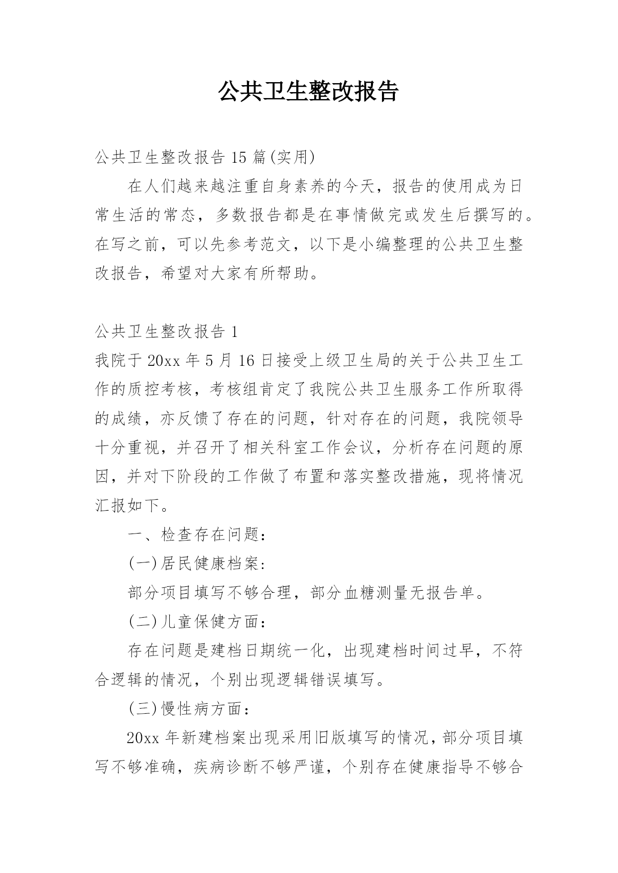 公共卫生整改报告公共卫生整改报告15篇(实用)在人们越来越注重自身素养的今天,报告的使用成为日常生活的常态,多数报告都是在事情做完或发生后撰写的。在写之前,可以先参考范文,以下是小编整理的公共卫生整改报告,希望对大家有所帮助。公共卫生整改报告1我院于20xx年5月16日接受上级卫生局的关于公共卫生工作的质控考核,考核组肯定了我院公共卫生服务工作所取得的成绩,亦反馈了存在的问题,针对存在的问题,我院领导十分重视,并召开了相关科室工作会议,分析存在问题的原因,并对下阶段的工作做了布置和落实整改措施,现将情况汇报如下。一、检查存在问题:(一)居民健康档案:部分项目填写不够合理,部分血糖测量无报告单。(二)儿童保健方面:存在问题是建档日期统一化,出现建档时间过早,不符合逻辑的情况,个别出现逻辑错误填写。(三)慢性病方面:20xx年新建档案出现采用旧版填写的情况,部分项目填写不够准确,疾病诊断不够严谨,个别存在健康指导不够合理的情况。(四)重型精神病方面:对新标准理解不够透彻,部分缺线索调查问题清单,部分档案纸质档案无填写编号。(五)预防接种工作:暂未深化开展儿童接种系统信息化工作。(六)孕产妇保健方面:个别档案出现“/”的填写;个别rh填写错误;无身份证号码和出生年月的.情况。(七)健康教育:印刷资料的发放详细信息不够,如种类、资料的名称、数量等应该详细注明。(八)老年人保健:存在健康评价不够完善,评估表出现漏项,字迹潦草的现象。二、整改措施:一、组织相关人员继续深入学习《20xx版国家基本公共卫生项目服务规范》,把握每一项的填写要求,弄清楚其中的填写逻辑和规范,按照规范的要求填写。二、完善各项工作的规章制度,明确责任分工,继续组织和开展门诊及时印刷新的表格,争取在6月份开始全部转用新表格,符合要医生和乡医的配合工作,加大对慢性病人、老年人的规范管理,每月继续进行监督和考核制度。三、加强和协调好各科室的沟通工作,及时发现问题,解决问题,每月定期召开工作会议,分管院长和各科室组长分析存在问题和进行工作反馈。实行每季度由分管院长和卫生科组长一起进行内部质控考核。四、对档案进行规范化管理,争取对重点人群加大开展辅助检查体检,及时张贴检验单。五、加大培训,对公共卫生科人员,乡医,门诊医生等,定期开展公共卫生工作的培训,让个人明确工作职责和工作规范,较好的开展工作。六、加大下乡、上门体检,建档的工作,积极把握第一手资料,如身份证,电话号码等。最后,我们一定会认真开展整改措施,按照上级指示和结合本院实际,继续认真做好我院公共卫生工作,力争把公共卫生工作提升到一个更高的水平。公共卫生整改报告2上一年度,我院在县卫计局的正确领导下,乡、村两级公卫人员严格按照国家基本公共卫生服务规范及上级相关文件精神要求,各项工作任务得到了有序开展。岁末年初,经过乡对村、县对乡先后两次绩效考核,我院各项工作较往年有了很大提高,同时也发现了一些问题。对此,我院及时召开乡、村两级公卫工作总结会议,总结上一年度公卫工作经验,对工作中发现的问题,进行了深刻分析,并提出整改意见。现将我院基本公共卫生服务项目工作整改报告汇报如下:一、存在的问题经考核,我院居民健康档案的填写录入工作中有部分空项,前后逻辑错误及联系方式未能及时更新,电子档案录入不及时等;健康教育工作资料整理、归档不够完整、规范;部分卫生室预防接种卡证不符,有部分漏种及接种不及时等;新产妇及新生儿信息掌握不够及时,导致首次随访工作相对滞后,部分检查项目未能开展;慢病患者随访记录不够完整规范,体检记录有空项,录入电子档案不及时等;卫生监督协管部分工作记录不完整;中医药服务业务知识水平亟待提高等问题。二、整改措施(一)、加强组织领导,落实工作责任进一步明确卫生院各项目负责人岗位职责,根据年初制定的的`本年度公卫工作计划,利用村医工作例会及季度考核督促、指导。各项目负责人本年度分期开展业务知识培训,特别是中医药相关知识培训,以提高村级公卫人员业务知识水平,今年2月份,我院已组织乡村两级所有公卫人员开展了一次公共卫生服务知识考试学习。进一步深化严肃绩效考核制度,施行末位淘汰制,明确规定在年底考核中,如得分在80分以下,且排名倒数第一、第二的村医,将按照退出机制,予以清退并报县局备案。(二)、加大宣传力度,提高居民公卫服务知晓率利用健康教育服务网络,大力宣传国家基本公共卫生服务项目,今年我院专门整理出一份基本公共卫生服务项目概述的宣传单页,做为本年度健康教育宣传资料的第一期,由卫生院和下辖13个村卫生所宣传发放,城区内设置65处公卫服务监督牌,村医发放服务名片,今年讨论施行统一服务人员着装,如此种种,力争使每位居民都能了解到基本公共卫生服务的服务内容、服务目的和意义,使每位居民都能主动参与进来。(三)、进一步细化健康档案的