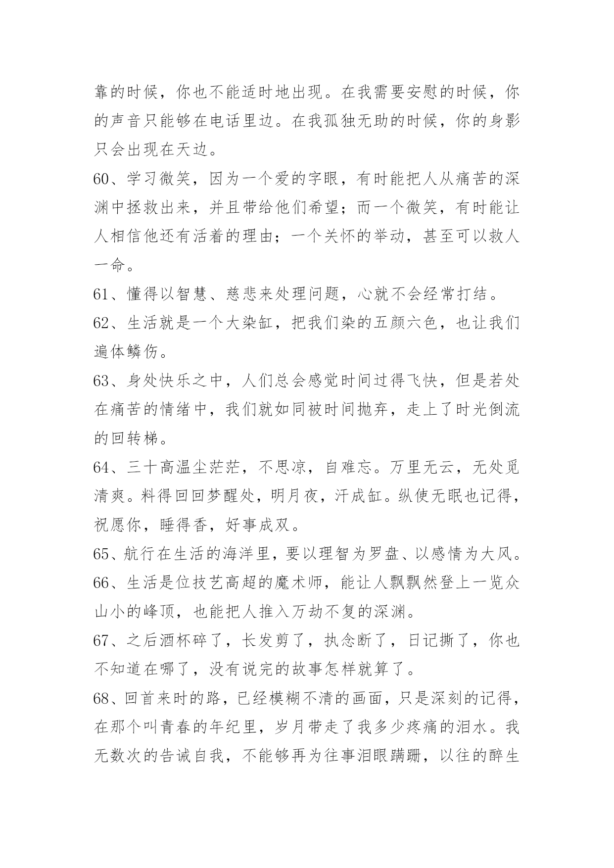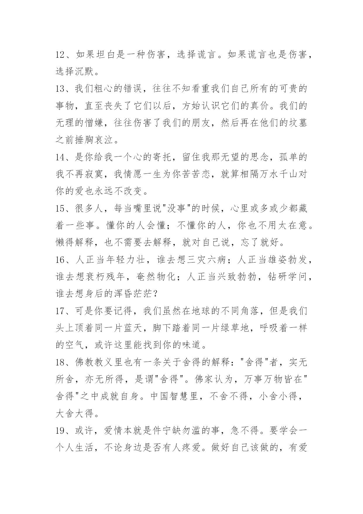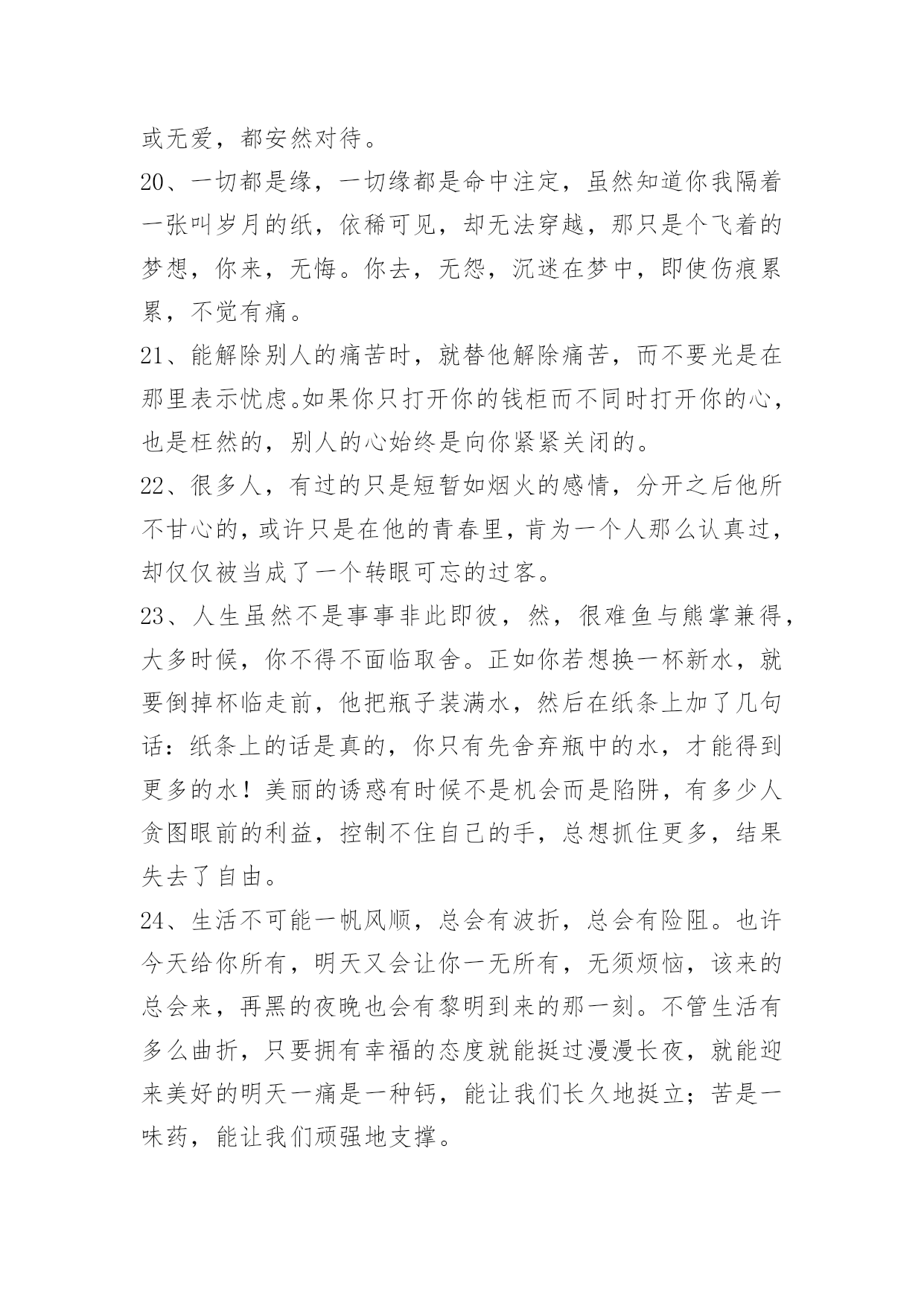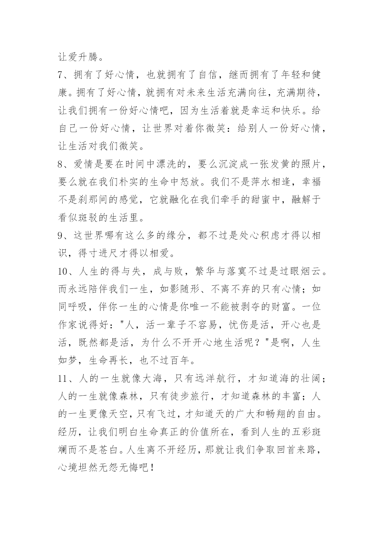 经典生活个性说说语录经典生活个性说说语录200句精选生活可以是一杯清茶,生活可以是一曲幽歌,生活也可以是一张白纸,白样生活,白样人生,体验生活中的炫丽色彩,品味生活的点点滴滴,大事小事,生活可以平平淡淡,也可以亮丽多彩。而快乐就是生活中的调味品,增加剂。以下是小编特意为各位读者收集的生活个性说说语录,欢迎阅读借鉴。1、这周你担心的事情,会有奇迹般的转机。2、只有幻想,而不付出艰辛的努力是不会有任何造诣的。3、当我们历经千难万险,终于实现了自己的人生梦想,我们的奋斗历程就永远铭刻在了心中,回想起这些奋斗的日子,常常能让我们队未来充满勇气与信心。4、有段时间你会特别孤独,一个人上班一个人下班一个人吃饭一个人睡觉,甚至跨年都是一个人在高速公路上。这时候不需要找人倾诉不需要找精神寄托,就一个人撑过去。很快我们都会学会沉淀自己,找到属于自己的生活方式,这是成长的一方面。我们都要去体会孤独,未来不见得更好,但会更从容。5、你注视的总是很遥远,是我始终够不到的地点。6、爱情,不是甜言蜜语,海誓山盟,更不是花天酒地,浑浑噩噩,而是默默的付出,在不经意间,发现了情的脉动,让爱升腾。7、拥有了好心情,也就拥有了自信,继而拥有了年轻和健康。拥有了好心情,就拥有对未来生活充满向往,充满期待,让我们拥有一份好心情吧,因为生活着就是幸运和快乐。给自己一份好心情,让世界对着你微笑:给别人一份好心情,让生活对我们微笑。8、爱情是要在时间中漂洗的,要么沉淀成一张发黄的照片,要么就在我们朴实的生命中怒放。我们不是萍水相逢,幸福不是刹那间的感觉,它就融化在我们牵手的甜蜜中,融解于看似斑驳的生活里。9、这世界哪有这么多的缘分,都不过是处心积虑才得以相识,得寸进尺才得以相爱。10、人生的得与失,成与败,繁华与落寞不过是过眼烟云。而永远陪伴我们一生,如影随形、不离不弃的只有心情;如同呼吸,伴你一生的心情是你唯一不能被剥夺的财富。一位作家说得好:"人,活一辈子不容易,忧伤是活,开心也是活,既然都是活,为什么不开开心地生活呢?"是啊,人生如梦,生命再长,也不过百年。11、人的一生就像大海,只有远洋航行,才知道海的壮阔;人的一生就像森林,只有徒步旅行,才知道森林的丰富;人的一生更像天空,只有飞过,才知道天的广大和畅翔的自由。经历,让我们明白生命真正的价值所在,看到人生的五彩斑斓而不是苍白。人生离不开经历,那就让我们争取回首来路,心境坦然无怨无悔吧!12、如果坦白是一种伤害,选择谎言。如果谎言也是伤害,选择沉默。13、我们粗心的错误,往往不知看重我们自己所有的可贵的事物,直至丧失了它们以后,方始认识它们的真价。我们的无理的憎嫌,往往伤害了我们的朋友,然后再在他们的坟墓之前捶胸哀泣。14、是你给我一个心的寄托,留住我那无望的思念,孤单的我不再寂寞,我情愿一生为你苦苦恋,就算相隔万水千山对你的爱也永远不改变。15、很多人,每当嘴里说"没事"的时候,心里或多或少都藏着一些事。懂你的人会懂;不懂你的人,你也不用太在意。懒得解释,也不需要去解释,就对自己说,忘了就好。16、人正当年轻力壮,谁去想三灾六病;人正当雄姿勃发,谁去想衰朽残年,奄然物化;人正当兴致勃勃,钻研学问,谁去想身后的浑昏茫茫?17、可是你要记得,我们虽然在地球的不同角落,但是我们头上顶着同一片蓝天,脚下踏着同一片绿草地,呼吸着一样的空气,或许这里能找到你的味道。18、佛教教义里也有一条关于舍得的解释:"舍得"者,实无所舍,亦无所得,是谓"舍得"。佛家认为,万事万物皆在"舍得"之中成就自身。中国智慧里,不舍不得,小舍小得,大舍大得。19、或许,爱情本就是件宁缺勿滥的事,急不得。要学会一个人生活,不论身边是否有人疼爱。做好自己该做的,有爱或无爱,都安然对待。20、一切都是缘,一切缘都是命中注定,虽然知道你我隔着一张叫岁月的纸,依稀可见,却无法穿越,那只是个飞着的梦想,你来,无悔。你去,无怨,沉迷在梦中,即使伤痕累累,不觉有痛。21、能解除别人的痛苦时,就替他解除痛苦,而不要光是在那里表示忧虑。如果你只打开你的钱柜而不同时打开你的心,也是枉然的,别人的心始终是向你紧紧关闭的。22、很多人,有过的只是短暂如烟火的感情,分开之后他所不甘心的,或许只是在他的青春里,肯为一个人那么认真过,却仅仅被当成了一个转眼可忘的过客。23、人生虽然不是事事非此即彼,然,很难鱼与熊掌兼得,大多时候,你不得不面临取舍。正如你若想换一杯新水,就要倒掉杯临走前,他把瓶子装满水,然后在纸条上加了几句话:纸条上的话是真的,你只有先舍弃瓶中的水,才能得到更多的水!美丽的诱惑有时候不是机会而是陷阱,有多少人贪图眼前的利益,控制不住自己的手,总想抓住更多,结果失去了自由。24、生活不可能一帆风顺,总会有波折,总会有险阻。也许今天给你所有,明天又会让你一无所有,