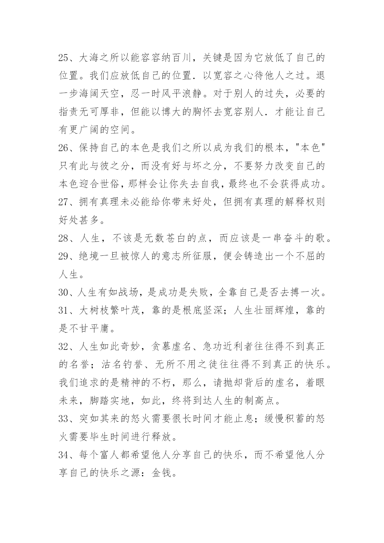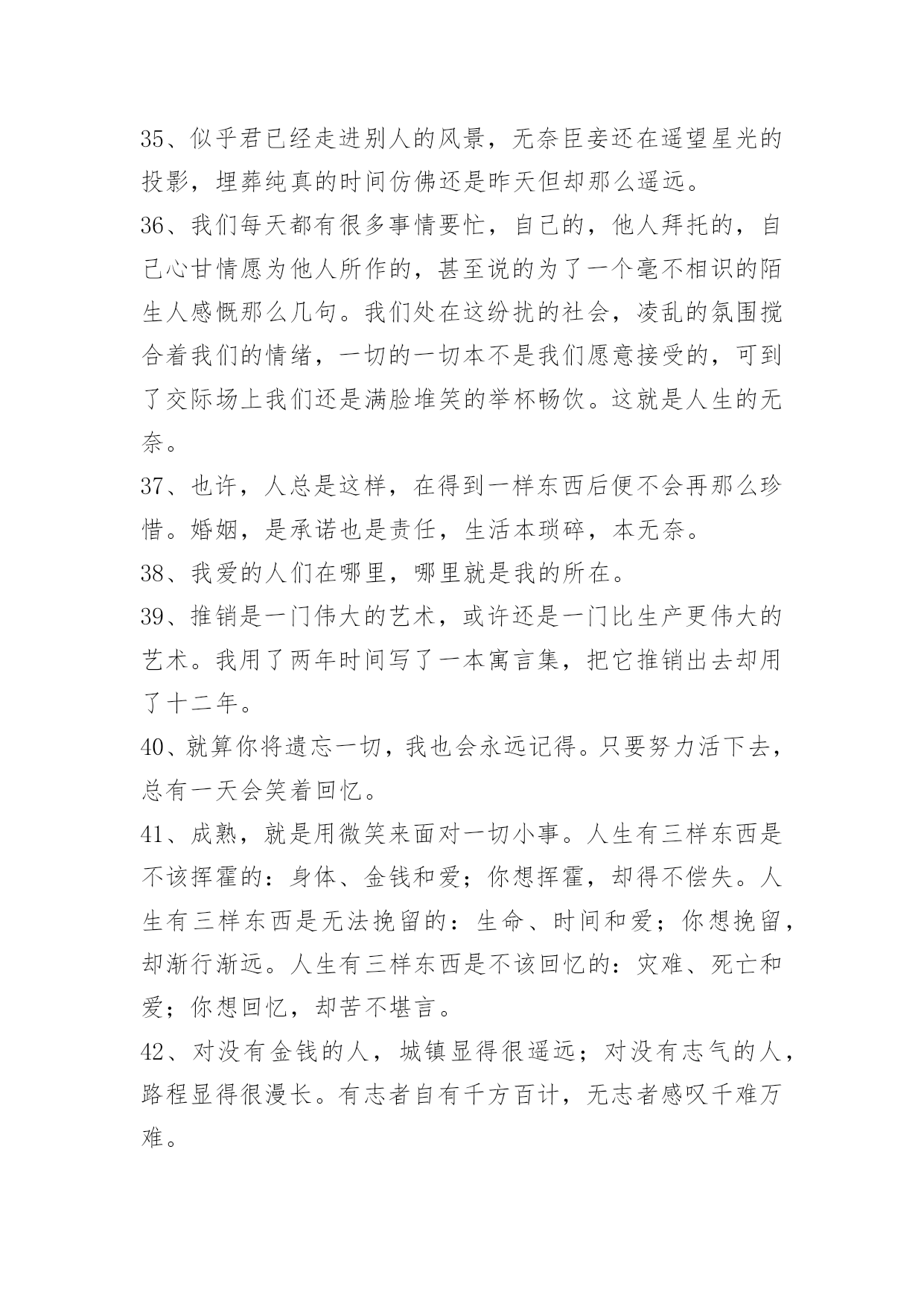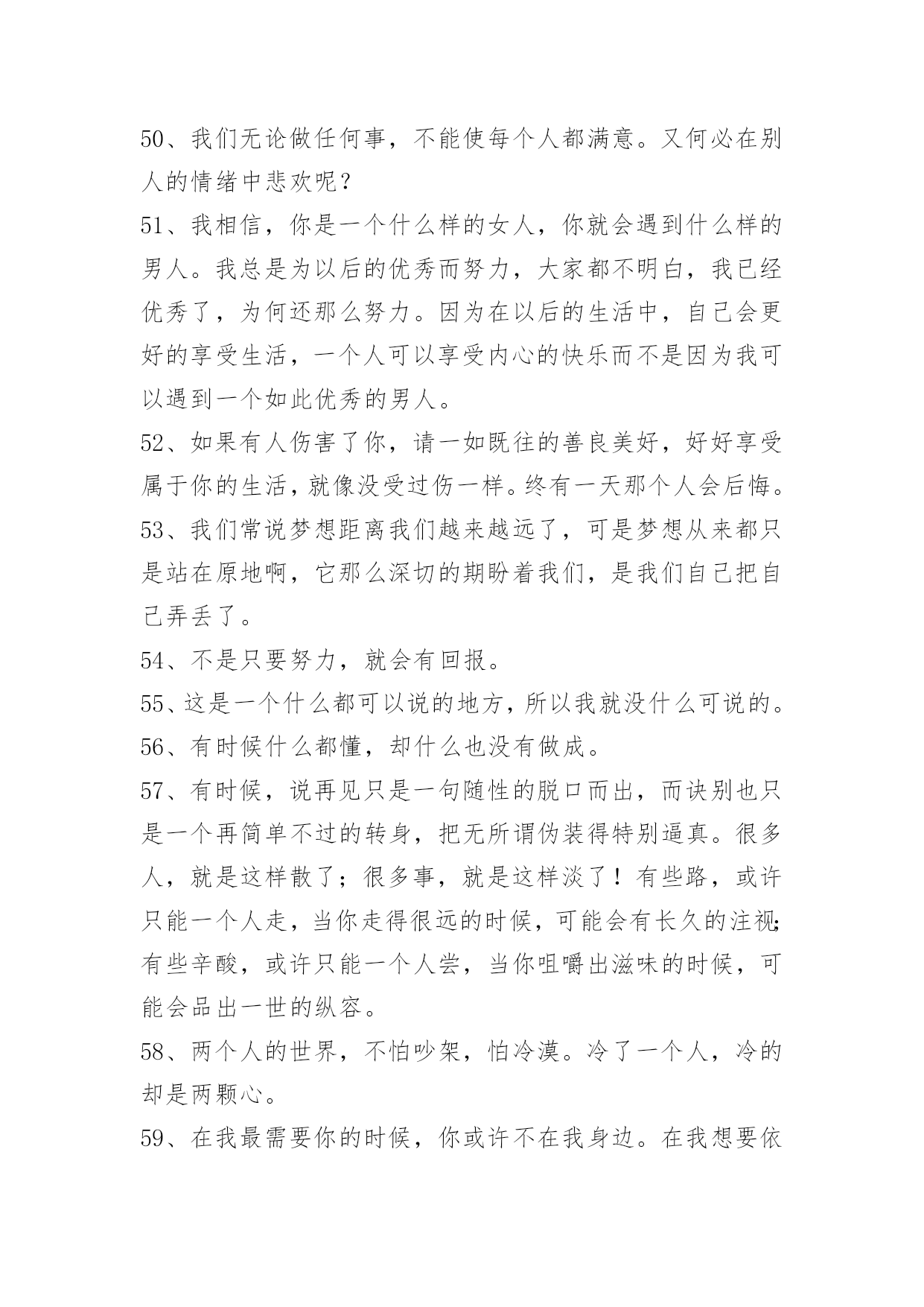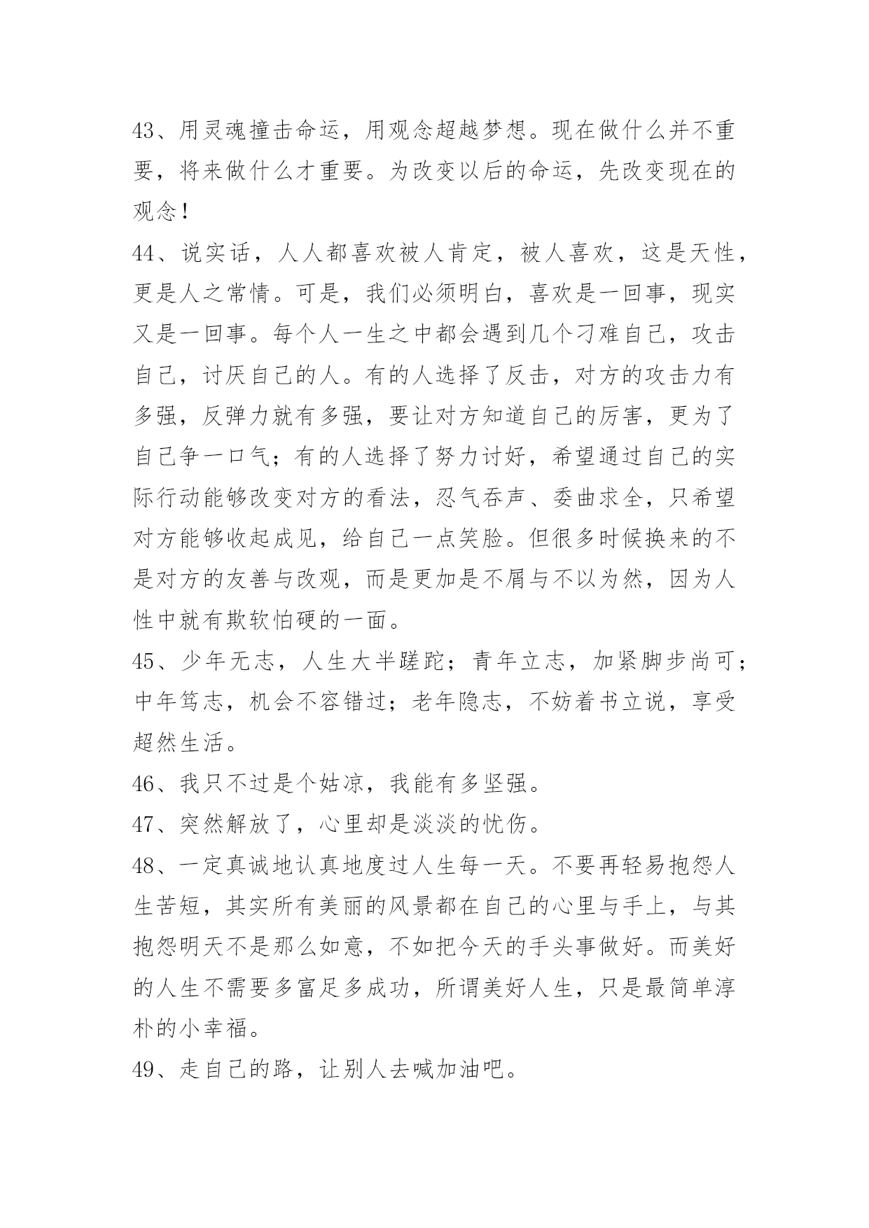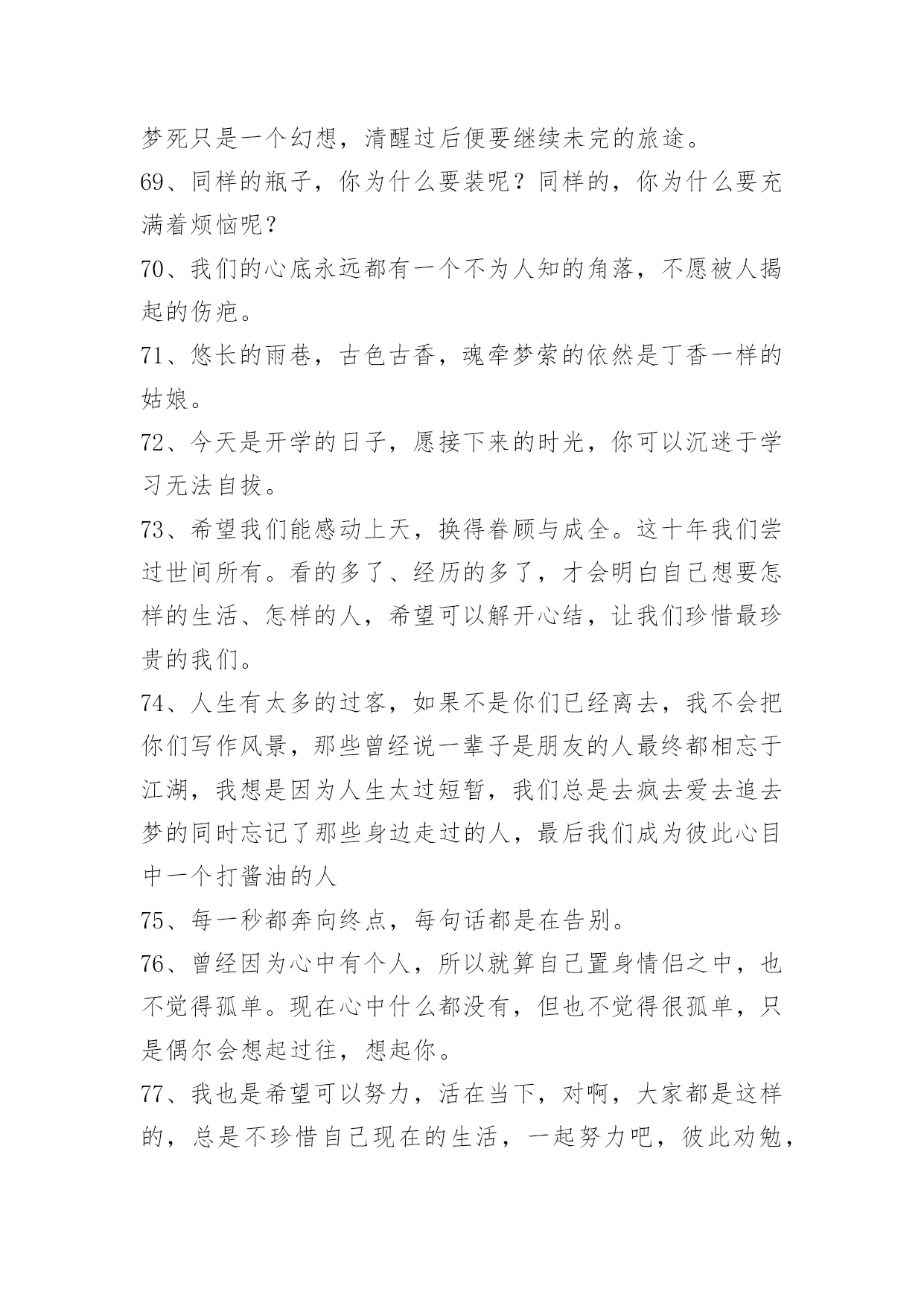 经典生活个性说说语录经典生活个性说说语录200句精选生活可以是一杯清茶,生活可以是一曲幽歌,生活也可以是一张白纸,白样生活,白样人生,体验生活中的炫丽色彩,品味生活的点点滴滴,大事小事,生活可以平平淡淡,也可以亮丽多彩。而快乐就是生活中的调味品,增加剂。以下是小编特意为各位读者收集的生活个性说说语录,欢迎阅读借鉴。1、这周你担心的事情,会有奇迹般的转机。2、只有幻想,而不付出艰辛的努力是不会有任何造诣的。3、当我们历经千难万险,终于实现了自己的人生梦想,我们的奋斗历程就永远铭刻在了心中,回想起这些奋斗的日子,常常能让我们队未来充满勇气与信心。4、有段时间你会特别孤独,一个人上班一个人下班一个人吃饭一个人睡觉,甚至跨年都是一个人在高速公路上。这时候不需要找人倾诉不需要找精神寄托,就一个人撑过去。很快我们都会学会沉淀自己,找到属于自己的生活方式,这是成长的一方面。我们都要去体会孤独,未来不见得更好,但会更从容。5、你注视的总是很遥远,是我始终够不到的地点。6、爱情,不是甜言蜜语,海誓山盟,更不是花天酒地,浑浑噩噩,而是默默的付出,在不经意间,发现了情的脉动,让爱升腾。7、拥有了好心情,也就拥有了自信,继而拥有了年轻和健康。拥有了好心情,就拥有对未来生活充满向往,充满期待,让我们拥有一份好心情吧,因为生活着就是幸运和快乐。给自己一份好心情,让世界对着你微笑:给别人一份好心情,让生活对我们微笑。8、爱情是要在时间中漂洗的,要么沉淀成一张发黄的照片,要么就在我们朴实的生命中怒放。我们不是萍水相逢,幸福不是刹那间的感觉,它就融化在我们牵手的甜蜜中,融解于看似斑驳的生活里。9、这世界哪有这么多的缘分,都不过是处心积虑才得以相识,得寸进尺才得以相爱。10、人生的得与失,成与败,繁华与落寞不过是过眼烟云。而永远陪伴我们一生,如影随形、不离不弃的只有心情;如同呼吸,伴你一生的心情是你唯一不能被剥夺的财富。一位作家说得好:"人,活一辈子不容易,忧伤是活,开心也是活,既然都是活,为什么不开开心地生活呢?"是啊,人生如梦,生命再长,也不过百年。11、人的一生就像大海,只有远洋航行,才知道海的壮阔;人的一生就像森林,只有徒步旅行,才知道森林的丰富;人的一生更像天空,只有飞过,才知道天的广大和畅翔的自由。经历,让我们明白生命真正的价值所在,看到人生的五彩斑斓而不是苍白。人生离不开经历,那就让我们争取回首来路,心境坦然无怨无悔吧!12、如果坦白是一种伤害,选择谎言。如果谎言也是伤害,选择沉默。13、我们粗心的错误,往往不知看重我们自己所有的可贵的事物,直至丧失了它们以后,方始认识它们的真价。我们的无理的憎嫌,往往伤害了我们的朋友,然后再在他们的坟墓之前捶胸哀泣。14、是你给我一个心的寄托,留住我那无望的思念,孤单的我不再寂寞,我情愿一生为你苦苦恋,就算相隔万水千山对你的爱也永远不改变。15、很多人,每当嘴里说"没事"的时候,心里或多或少都藏着一些事。懂你的人会懂;不懂你的人,你也不用太在意。懒得解释,也不需要去解释,就对自己说,忘了就好。16、人正当年轻力壮,谁去想三灾六病;人正当雄姿勃发,谁去想衰朽残年,奄然物化;人正当兴致勃勃,钻研学问,谁去想身后的浑昏茫茫?17、可是你要记得,我们虽然在地球的不同角落,但是我们头上顶着同一片蓝天,脚下踏着同一片绿草地,呼吸着一样的空气,或许这里能找到你的味道。18、佛教教义里也有一条关于舍得的解释:"舍得"者,实无所舍,亦无所得,是谓"舍得"。佛家认为,万事万物皆在"舍得"之中成就自身。中国智慧里,不舍不得,小舍小得,大舍大得。19、或许,爱情本就是件宁缺勿滥的事,急不得。要学会一个人生活,不论身边是否有人疼爱。做好自己该做的,有爱或无爱,都安然对待。20、一切都是缘,一切缘都是命中注定,虽然知道你我隔着一张叫岁月的纸,依稀可见,却无法穿越,那只是个飞着的梦想,你来,无悔。你去,无怨,沉迷在梦中,即使伤痕累累,不觉有痛。21、能解除别人的痛苦时,就替他解除痛苦,而不要光是在那里表示忧虑。如果你只打开你的钱柜而不同时打开你的心,也是枉然的,别人的心始终是向你紧紧关闭的。22、很多人,有过的只是短暂如烟火的感情,分开之后他所不甘心的,或许只是在他的青春里,肯为一个人那么认真过,却仅仅被当成了一个转眼可忘的过客。23、人生虽然不是事事非此即彼,然,很难鱼与熊掌兼得,大多时候,你不得不面临取舍。正如你若想换一杯新水,就要倒掉杯临走前,他把瓶子装满水,然后在纸条上加了几句话:纸条上的话是真的,你只有先舍弃瓶中的水,才能得到更多的水!美丽的诱惑有时候不是机会而是陷阱,有多少人贪图眼前的利益,控制不住自己的手,总想抓住更多,结果失去了自由。24、生活不可能一帆风顺,总会有波折,总会有险阻。也许今天给你所有,明天又会让你一无所有,