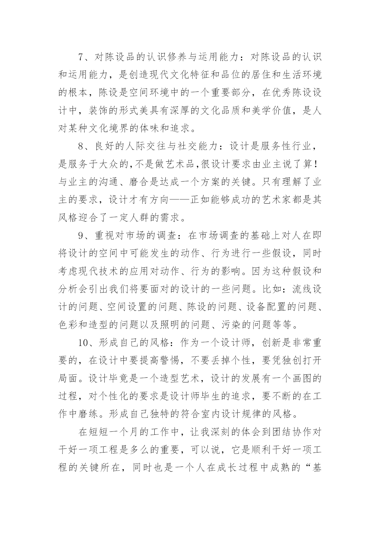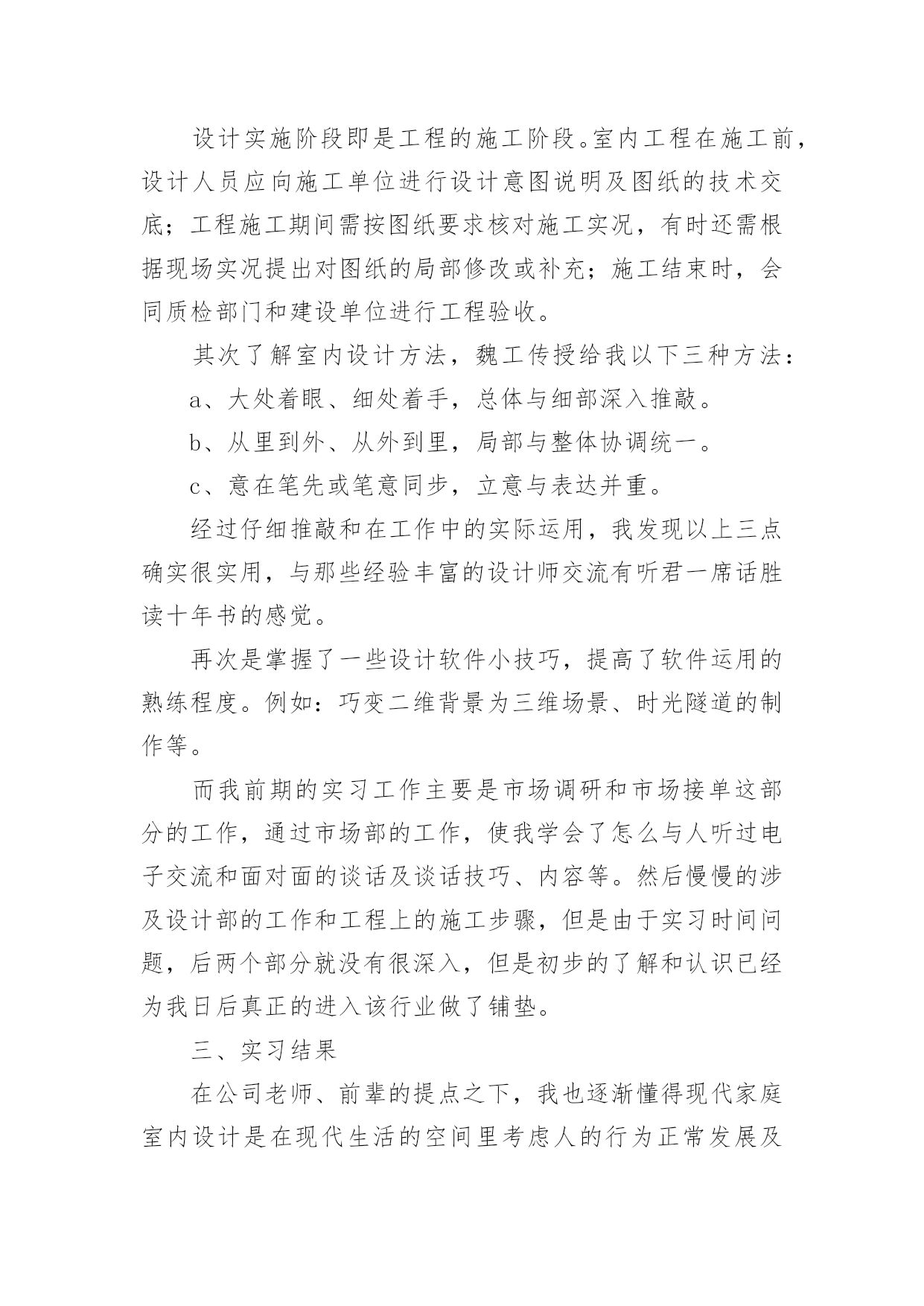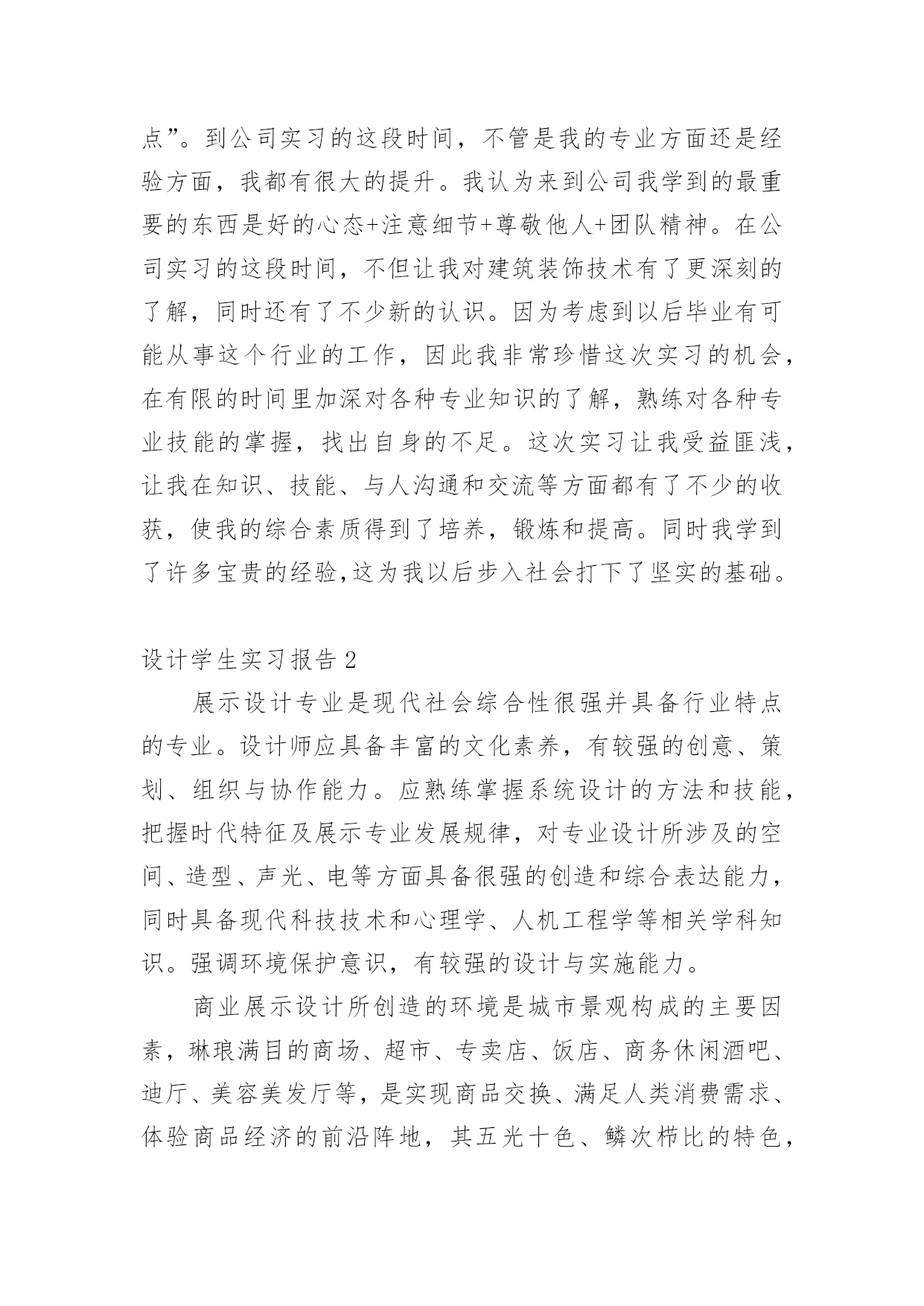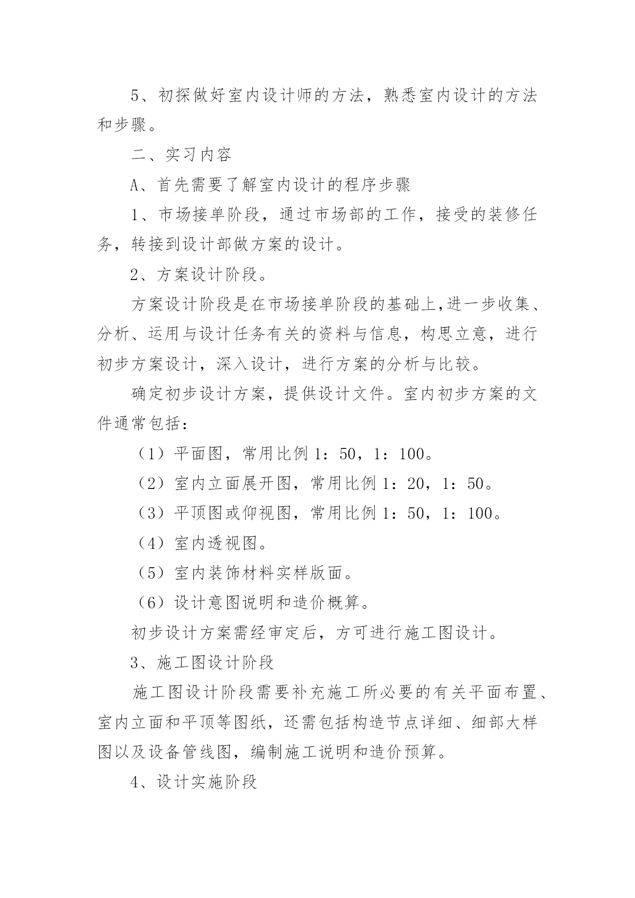 设计学生实习报告在不断进步的时代,报告使用的次数愈发增长,不同种类的报告具有不同的用途。你还在对写报告感到一筹莫展吗?以下是小编整理的设计学生实习报告,供大家参考借鉴,希望可以帮助到有需要的朋友。设计学生实习报告1随着毕业季的来临,迎来了我大学最后一次实习——20xx年x月x日至20xx年x月x6日在xxx公司的毕业实习,毕业实习是一个重要的实践环节,也是毕业设计的有机组成部分,其目的是巩固、验证和强化我们所学过的知识,培养理论联系实际综合运用所学知识解决实际问题的能力,为我们即将开始的毕业设计和将来工作奠定良好的基础。我们的目标是成为一名真正的设计师,在设计与管理找到最好的平衡点。一、实习目的1、了解室内装潢设计在x州的市场现状及前景。2、培养人际交往与社交能力,为日后相关技术工作做准备。3、进一步掌握计算机设计软件的运用,如3dmax、cad、ps等。4、尝试将自己的软件技术与美学设计功底相融合运用到实习过程中。5、初探做好室内设计师的方法,熟悉室内设计的方法和步骤。二、实习内容A、首先需要了解室内设计的程序步骤1、市场接单阶段,通过市场部的工作,接受的装修任务,转接到设计部做方案的设计。2、方案设计阶段。方案设计阶段是在市场接单阶段的基础上,进一步收集、分析、运用与设计任务有关的资料与信息,构思立意,进行初步方案设计,深入设计,进行方案的分析与比较。确定初步设计方案,提供设计文件。室内初步方案的文件通常包括:(1)平面图,常用比例1:50,1:100。(2)室内立面展开图,常用比例1:20,1:50。(3)平顶图或仰视图,常用比例1:50,1:100。(4)室内透视图。(5)室内装饰材料实样版面。(6)设计意图说明和造价概算。初步设计方案需经审定后,方可进行施工图设计。3、施工图设计阶段施工图设计阶段需要补充施工所必要的有关平面布置、室内立面和平顶等图纸,还需包括构造节点详细、细部大样图以及设备管线图,编制施工说明和造价预算。4、设计实施阶段设计实施阶段即是工程的施工阶段。室内工程在施工前,设计人员应向施工单位进行设计意图说明及图纸的技术交底;工程施工期间需按图纸要求核对施工实况,有时还需根据现场实况提出对图纸的局部修改或补充;施工结束时,会同质检部门和建设单位进行工程验收。其次了解室内设计方法,魏工传授给我以下三种方法:a、大处着眼、细处着手,总体与细部深入推敲。b、从里到外、从外到里,局部与整体协调统一。c、意在笔先或笔意同步,立意与表达并重。经过仔细推敲和在工作中的实际运用,我发现以上三点确实很实用,与那些经验丰富的设计师交流有听君一席话胜读十年书的感觉。再次是掌握了一些设计软件小技巧,提高了软件运用的熟练程度。例如:巧变二维背景为三维场景、时光隧道的制作等。而我前期的实习工作主要是市场调研和市场接单这部分的工作,通过市场部的工作,使我学会了怎么与人听过电子交流和面对面的谈话及谈话技巧、内容等。然后慢慢的涉及设计部的工作和工程上的施工步骤,但是由于实习时间问题,后两个部分就没有很深入,但是初步的了解和认识已经为我日后真正的进入该行业做了铺垫。三、实习结果在公司老师、前辈的提点之下,我也逐渐懂得现代家庭室内设计是在现代生活的空间里考虑人的行为正常发展及其相互关系的和谐。由于设备、陈设、家具等高度成就而大大改观了室内设计的本质,使之不再满足人们对室内视觉上的美化装饰要求,而是综合运用技术手段、艺术手段创造出符合现代生活要求,满足人的生理和心理需要的室内环境。现代家庭室内设计必须满足人在视觉、听觉、体感、触觉、嗅觉等多方面的要求。从家具造型到陈设挂件,从采光到照明,从室内到室外,来重视整体布置,创造一个共享空间满足不同经济条件和文化层次的人生活与精神的需要。所以在室内设计中,无论是家庭还是公共场所,都必须考虑与室内设计有关的基本要素来进行室内设什与装饰。这些基本因素主要有功能(包括使用功能和精神功能)、空间、色彩、线条、质感、采光与照明,家具与陈设,绿化等。1、功能:在考虑功能中首先要明确使用对象和空间的特定用途。在家庭室内设计中,首先应对居住者作较为细致的了解。诸如:家庭成员构成;生活方式;家庭成员的业余爱好和情趣;来客情况;电器安装的要求;家庭用餐;色彩要求;家具的材料、式样、色调;室内纺织品的选择;地面、墙面、天棚的材料;采光、照明。精神功能则要根据居住者的身份、爱好、信仰等来考虑。2、空间:居室空间作为家庭室内设计的起点,在这个空间里人们要进行起居、睡眠、休息、娱乐、会客、团聚、家务、洗浴等众多的活动。因此,室内设计的任务就是在居室空间里,要为现代生活的秩序创造一个良好的条件。空间形象有着自己的规律性和内涵的几何原则。空间尺度给人的直感形态是第一性的。人们喜欢有规则、有序列的几何形体。室内的空间进行合理的划分