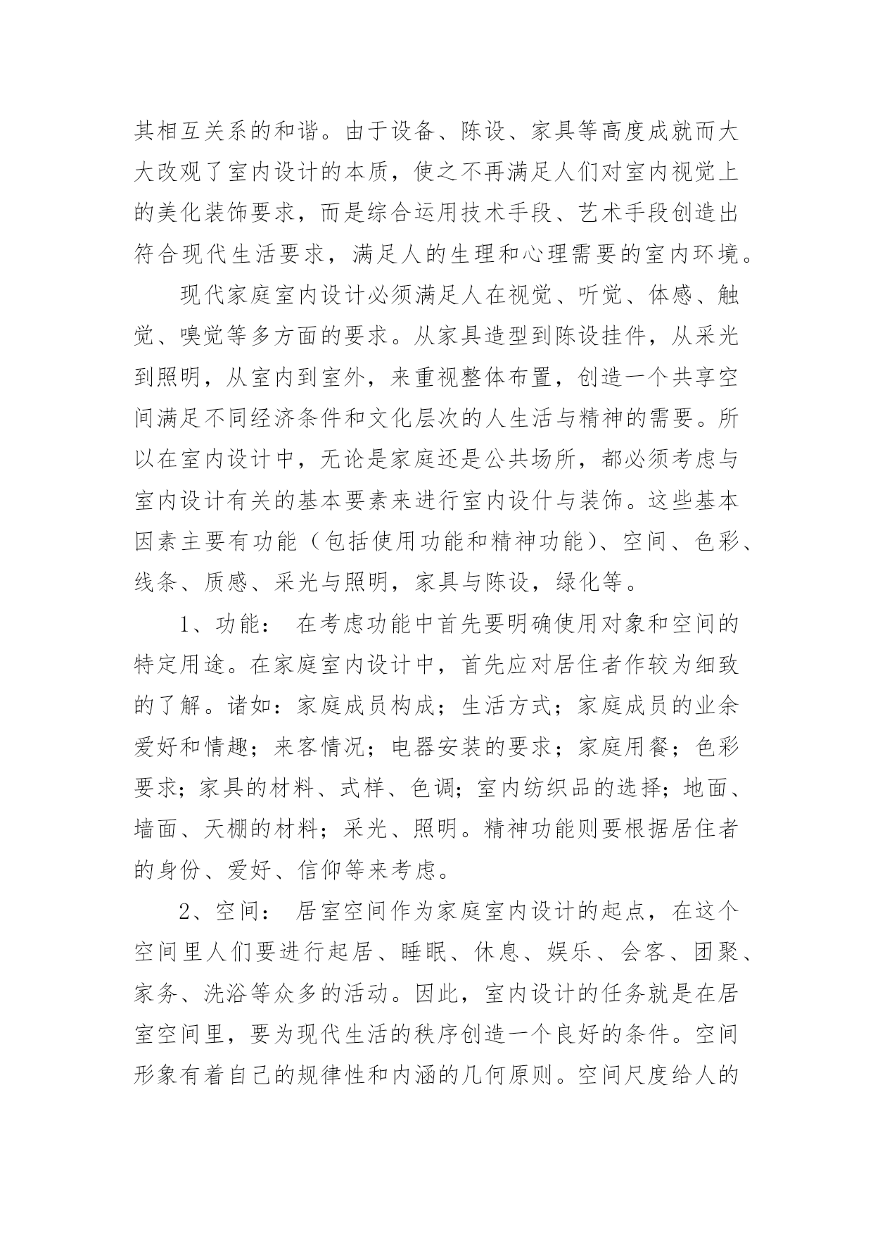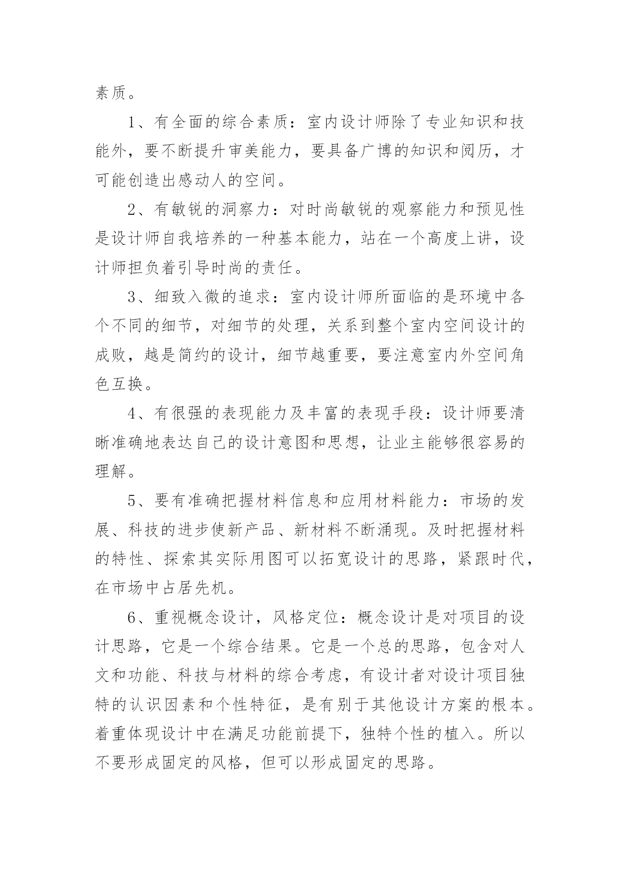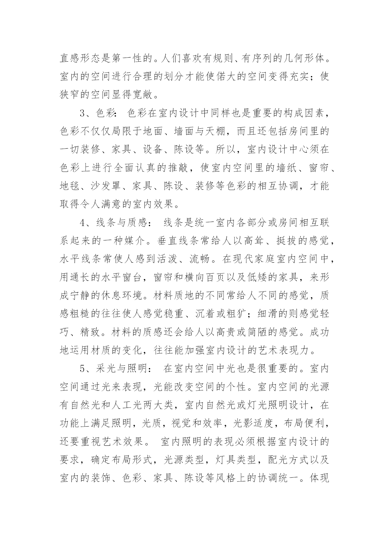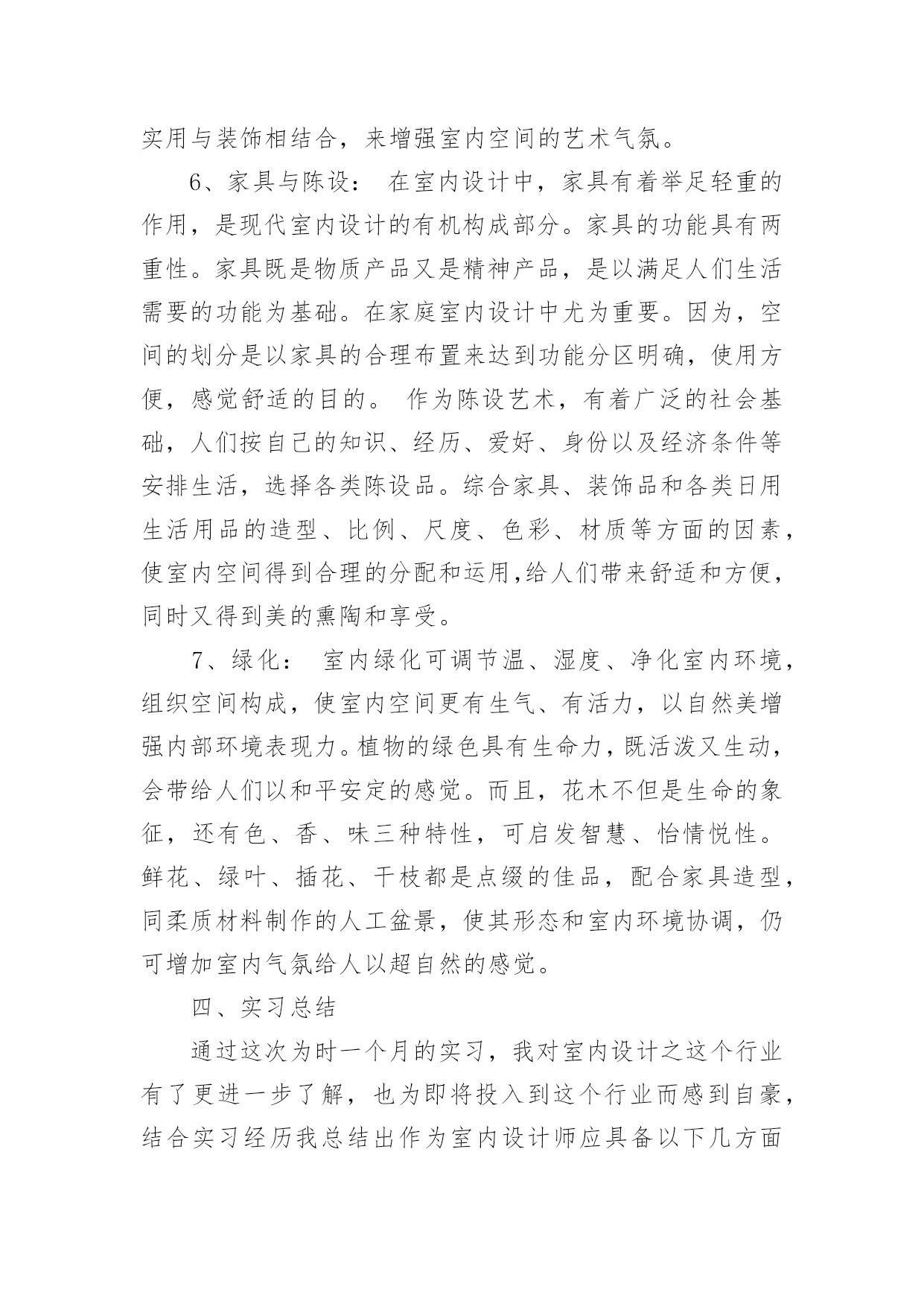 设计学生实习报告在不断进步的时代,报告使用的次数愈发增长,不同种类的报告具有不同的用途。你还在对写报告感到一筹莫展吗?以下是小编整理的设计学生实习报告,供大家参考借鉴,希望可以帮助到有需要的朋友。设计学生实习报告1随着毕业季的来临,迎来了我大学最后一次实习——20xx年x月x日至20xx年x月x6日在xxx公司的毕业实习,毕业实习是一个重要的实践环节,也是毕业设计的有机组成部分,其目的是巩固、验证和强化我们所学过的知识,培养理论联系实际综合运用所学知识解决实际问题的能力,为我们即将开始的毕业设计和将来工作奠定良好的基础。我们的目标是成为一名真正的设计师,在设计与管理找到最好的平衡点。一、实习目的1、了解室内装潢设计在x州的市场现状及前景。2、培养人际交往与社交能力,为日后相关技术工作做准备。3、进一步掌握计算机设计软件的运用,如3dmax、cad、ps等。4、尝试将自己的软件技术与美学设计功底相融合运用到实习过程中。5、初探做好室内设计师的方法,熟悉室内设计的方法和步骤。二、实习内容A、首先需要了解室内设计的程序步骤1、市场接单阶段,通过市场部的工作,接受的装修任务,转接到设计部做方案的设计。2、方案设计阶段。方案设计阶段是在市场接单阶段的基础上,进一步收集、分析、运用与设计任务有关的资料与信息,构思立意,进行初步方案设计,深入设计,进行方案的分析与比较。确定初步设计方案,提供设计文件。室内初步方案的文件通常包括:(1)平面图,常用比例1:50,1:100。(2)室内立面展开图,常用比例1:20,1:50。(3)平顶图或仰视图,常用比例1:50,1:100。(4)室内透视图。(5)室内装饰材料实样版面。(6)设计意图说明和造价概算。初步设计方案需经审定后,方可进行施工图设计。3、施工图设计阶段施工图设计阶段需要补充施工所必要的有关平面布置、室内立面和平顶等图纸,还需包括构造节点详细、细部大样图以及设备管线图,编制施工说明和造价预算。4、设计实施阶段设计实施阶段即是工程的施工阶段。室内工程在施工前,设计人员应向施工单位进行设计意图说明及图纸的技术交底;工程施工期间需按图纸要求核对施工实况,有时还需根据现场实况提出对图纸的局部修改或补充;施工结束时,会同质检部门和建设单位进行工程验收。其次了解室内设计方法,魏工传授给我以下三种方法:a、大处着眼、细处着手,总体与细部深入推敲。b、从里到外、从外到里,局部与整体协调统一。c、意在笔先或笔意同步,立意与表达并重。经过仔细推敲和在工作中的实际运用,我发现以上三点确实很实用,与那些经验丰富的设计师交流有听君一席话胜读十年书的感觉。再次是掌握了一些设计软件小技巧,提高了软件运用的熟练程度。例如:巧变二维背景为三维场景、时光隧道的制作等。而我前期的实习工作主要是市场调研和市场接单这部分的工作,通过市场部的工作,使我学会了怎么与人听过电子交流和面对面的谈话及谈话技巧、内容等。然后慢慢的涉及设计部的工作和工程上的施工步骤,但是由于实习时间问题,后两个部分就没有很深入,但是初步的了解和认识已经为我日后真正的进入该行业做了铺垫。三、实习结果在公司老师、前辈的提点之下,我也逐渐懂得现代家庭室内设计是在现代生活的空间里考虑人的行为正常发展及其相互关系的和谐。由于设备、陈设、家具等高度成就而大大改观了室内设计的本质,使之不再满足人们对室内视觉上的美化装饰要求,而是综合运用技术手段、艺术手段创造出符合现代生活要求,满足人的生理和心理需要的室内环境。现代家庭室内设计必须满足人在视觉、听觉、体感、触觉、嗅觉等多方面的要求。从家具造型到陈设挂件,从采光到照明,从室内到室外,来重视整体布置,创造一个共享空间满足不同经济条件和文化层次的人生活与精神的需要。所以在室内设计中,无论是家庭还是公共场所,都必须考虑与室内设计有关的基本要素来进行室内设什与装饰。这些基本因素主要有功能(包括使用功能和精神功能)、空间、色彩、线条、质感、采光与照明,家具与陈设,绿化等。1、功能:在考虑功能中首先要明确使用对象和空间的特定用途。在家庭室内设计中,首先应对居住者作较为细致的了解。诸如:家庭成员构成;生活方式;家庭成员的业余爱好和情趣;来客情况;电器安装的要求;家庭用餐;色彩要求;家具的材料、式样、色调;室内纺织品的选择;地面、墙面、天棚的材料;采光、照明。精神功能则要根据居住者的身份、爱好、信仰等来考虑。2、空间:居室空间作为家庭室内设计的起点,在这个空间里人们要进行起居、睡眠、休息、娱乐、会客、团聚、家务、洗浴等众多的活动。因此,室内设计的任务就是在居室空间里,要为现代生活的秩序创造一个良好的条件。空间形象有着自己的规律性和内涵的几何原则。空间尺度给人的直感形态是第一性的。人们喜欢有规则、有序列的几何形体。室内的空间进行合理的划分