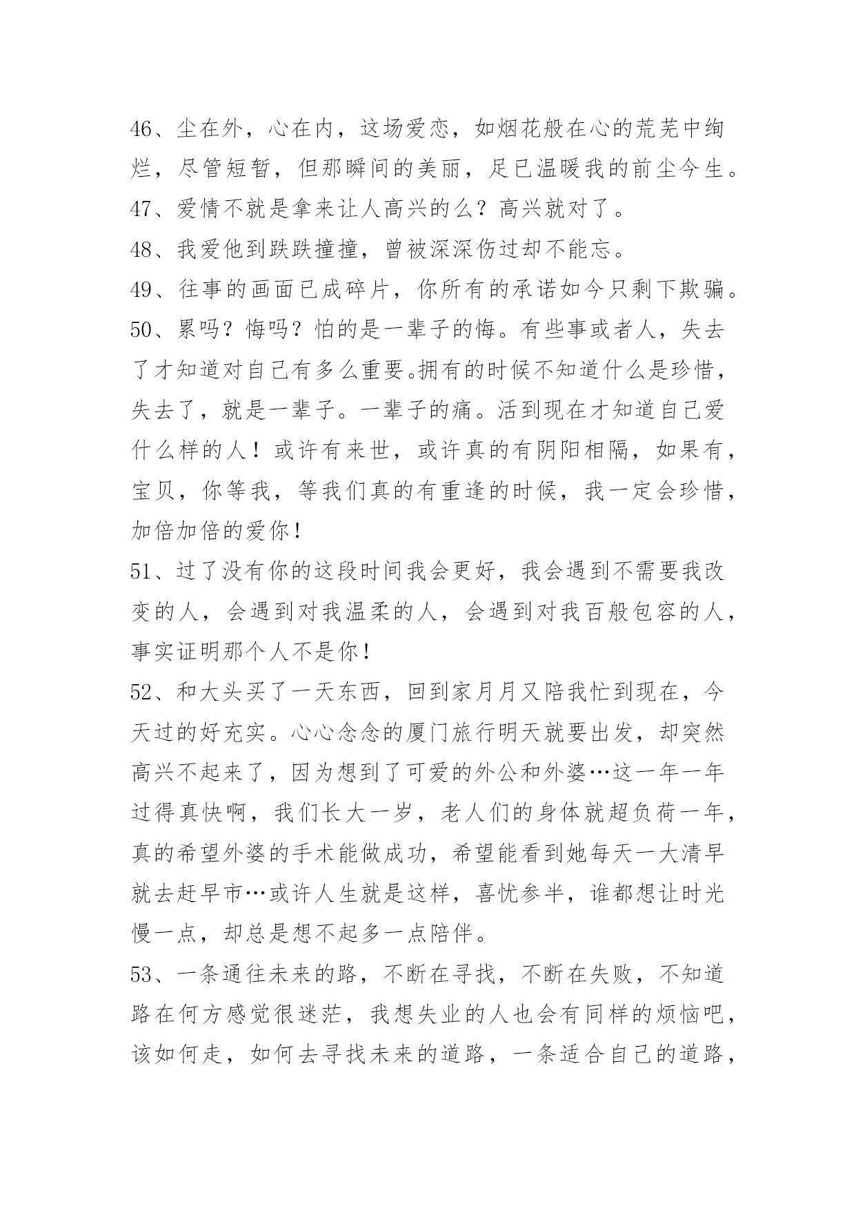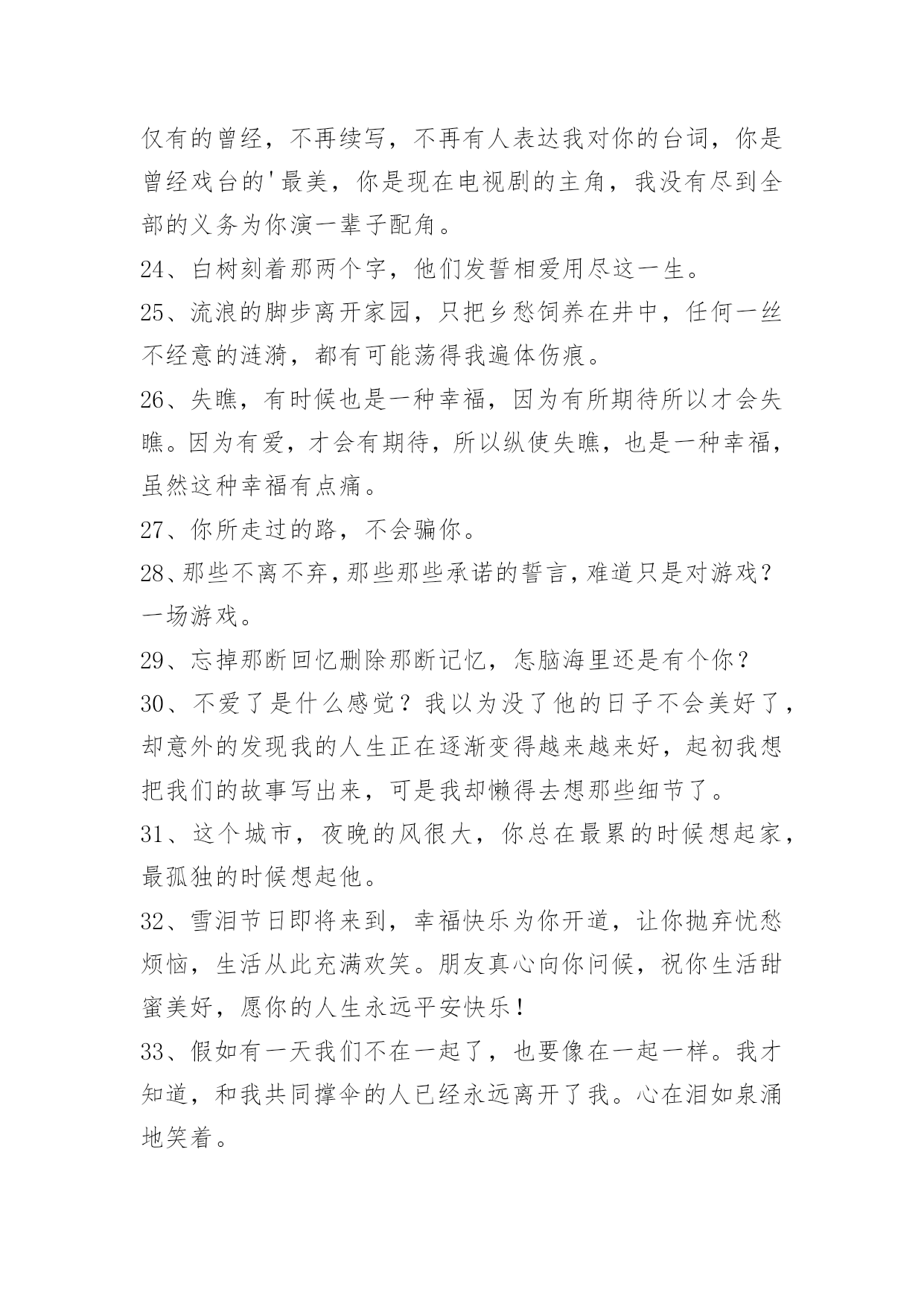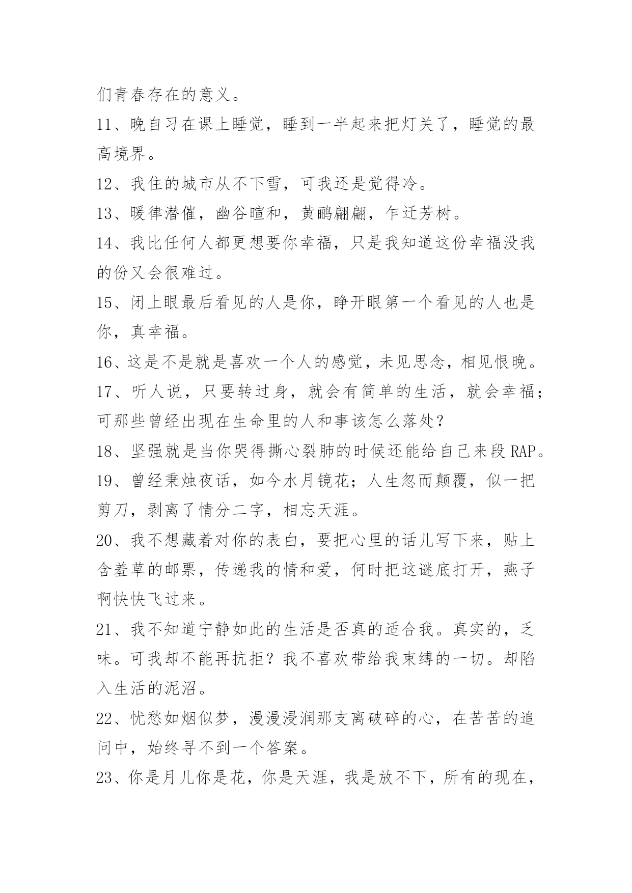 生活伤感句子精选生活伤感句子锦集65句人是无法掌握爱情的。仅有幸福可以自己决定。下面是关于生活伤感句子65句,供各位参考。1、世上无十全十美的事,一个人千辛万苦地去找找一件物事,等得到手也不过如此而已,本来拿在手里的东西却反而抛掉了。2、季节更迭,花开花落,时光流散,流年未尽。人生的浪,潮起潮落,风景便在这起起伏伏中若隐若现,静静的积蓄一份力量,默默的等待一份机遇,方能守得云开见月明,方能拨开迷雾见朝阳!3、无论再尽情的投入再美丽的舞姿…终究是只孤芳自赏的蝴蝶,下场…凄凉。4、最痛的痛是我们永远都提及不起的伤口。5、不想只是看着你的背影,不想只是让自己在爱情里心碎。6、忍着眼泪,许你没有我的未来。7、有些人还没离开你身边,只是因为念旧。8、再心痛的事情也会随着时间的流去而慢慢淡忘记忆,会痛一阵子但是不会痛一辈子。9、其实,越长大越孤单,越长大越对自己失望透顶。10、正如故乡是用来怀念的,青春就是用来追忆的,当你怀揣著它时,它一文不值,只有将它耗尽后,再回过头看,一切才有了意义——爱过我们的人和伤害过我们的人,都是我们青春存在的意义。11、晚自习在课上睡觉,睡到一半起来把灯关了,睡觉的最高境界。12、我住的城市从不下雪,可我还是觉得冷。13、暖律潜催,幽谷暄和,黄鹂翩翩,乍迁芳树。14、我比任何人都更想要你幸福,只是我知道这份幸福没我的份又会很难过。15、闭上眼最后看见的人是你,睁开眼第一个看见的人也是你,真幸福。16、这是不是就是喜欢一个人的感觉,未见思念,相见恨晚。17、听人说,只要转过身,就会有简单的生活,就会幸福;可那些曾经出现在生命里的人和事该怎么落处?18、坚强就是当你哭得撕心裂肺的时候还能给自己来段RAP。19、曾经秉烛夜话,如今水月镜花;人生忽而颠覆,似一把剪刀,剥离了情分二字,相忘天涯。20、我不想藏着对你的表白,要把心里的话儿写下来,贴上含羞草的邮票,传递我的情和爱,何时把这谜底打开,燕子啊快快飞过来。21、我不知道宁静如此的生活是否真的适合我。真实的,乏味。可我却不能再抗拒?我不喜欢带给我束缚的一切。却陷入生活的泥沼。22、忧愁如烟似梦,漫漫浸润那支离破碎的心,在苦苦的追问中,始终寻不到一个答案。23、你是月儿你是花,你是天涯,我是放不下,所有的现在,仅有的曾经,不再续写,不再有人表达我对你的台词,你是曾经戏台的'最美,你是现在电视剧的主角,我没有尽到全部的义务为你演一辈子配角。24、白树刻着那两个字,他们发誓相爱用尽这一生。25、流浪的脚步离开家园,只把乡愁饲养在井中,任何一丝不经意的涟漪,都有可能荡得我遍体伤痕。26、失瞧,有时候也是一种幸福,因为有所期待所以才会失瞧。因为有爱,才会有期待,所以纵使失瞧,也是一种幸福,虽然这种幸福有点痛。27、你所走过的路,不会骗你。28、那些不离不弃,那些那些承诺的誓言,难道只是对游戏?一场游戏。29、忘掉那断回忆删除那断记忆,怎脑海里还是有个你?30、不爱了是什么感觉?我以为没了他的日子不会美好了,却意外的发现我的人生正在逐渐变得越来越来好,起初我想把我们的故事写出来,可是我却懒得去想那些细节了。31、这个城市,夜晚的风很大,你总在最累的时候想起家,最孤独的时候想起他。32、雪泪节日即将来到,幸福快乐为你开道,让你抛弃忧愁烦恼,生活从此充满欢笑。朋友真心向你问候,祝你生活甜蜜美好,愿你的人生永远平安快乐!33、假如有一天我们不在一起了,也要像在一起一样。我才知道,和我共同撑伞的人已经永远离开了我。心在泪如泉涌地笑着。34、我一直都知道是我一直在自作多情,在你心里没有我的一席之地。35、过了许久,我才感觉是因为他们,那些与我擦肩而过又熟悉的面孔。不是因为什么特殊的原因让我对那些"陌生人"产生怀念,而是因为那微小的美让我难以释怀。36、缘起缘灭,缘浓缘淡,不是我们可能把持的。我们能做到的,是在因缘际会的时侯好好的珍惜那短暂的时间。37、我们的爱,现走进跑调的阶段。38、对不爱自己的人,最需要的是理解、放弃、祝福。39、能冲刷一切的除了眼泪,就是时间。40、千年的等待,却只换来一句:我的爱早已不在。41、我们经常忽略那些疼爱我们的人,却疼爱着那些忽略我们的人。42、也许你不会了解,日复一日地把自己镶进时间的缝隙里是一种怎样的生活,当我开始忙碌,开始将要忘记,却又会停止思考,不停不停地想起你,我从来不愿相信,会有这样莫名其妙的事情。当我淹没在这喧嚣的地方,我才发现,一个人的路,很长很长,我还是我,一个近乎透明的我。43、秋风秋叶秋夜秋意赐秋,冬梅冬雪冬日冬灵逼冬。伤彼伤此伤思伤绪满伤,泪绽泪流泪尽泪水溢泪。44、当捷径人满为患的时候,不如饶点弯路,那样更容易到达目的地。45、有一种无奈叫做,你明明是只候鸟,却喜欢上只能给你冬天的人。46、尘在外,心在内,这场爱恋,如烟花